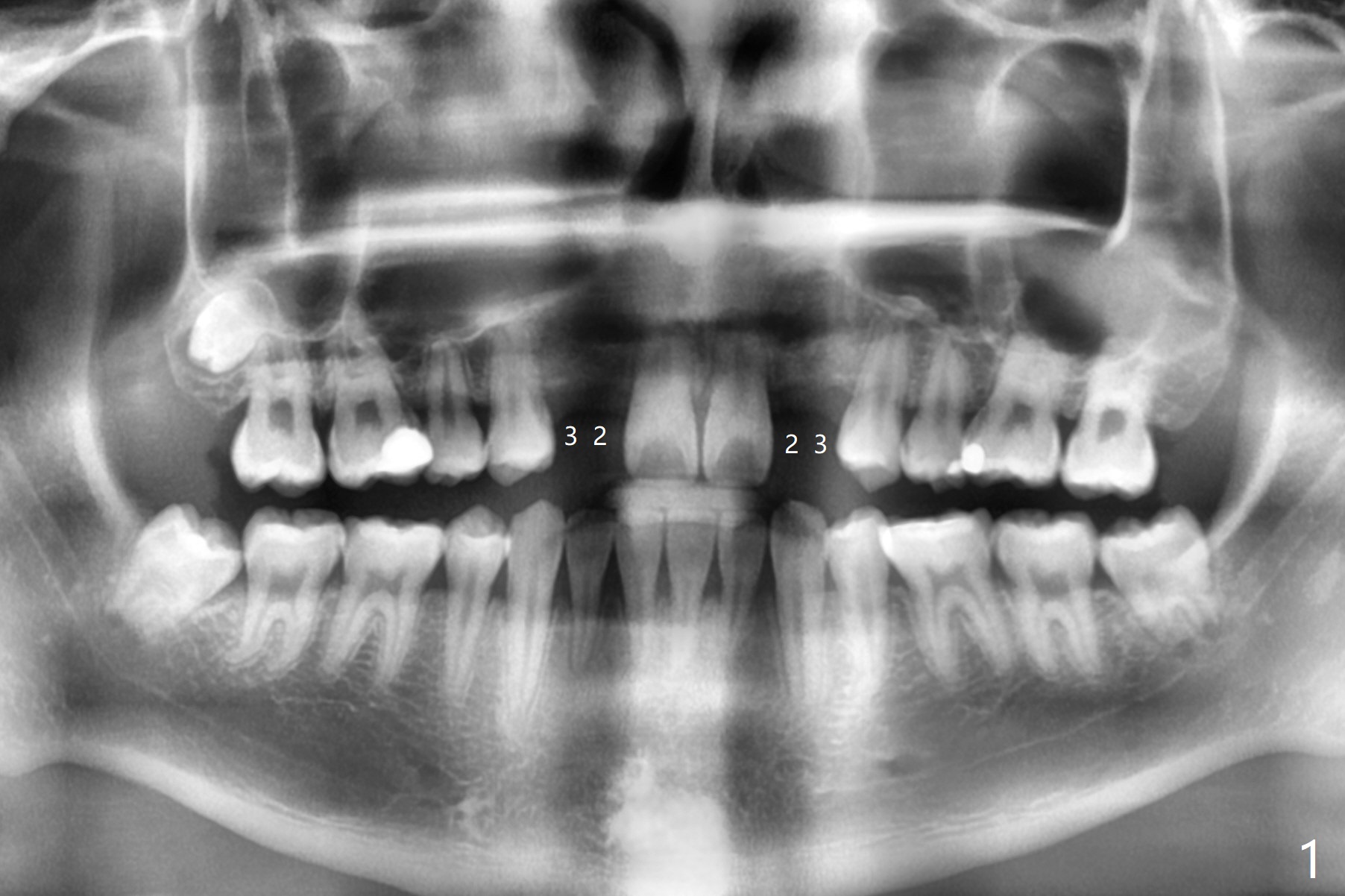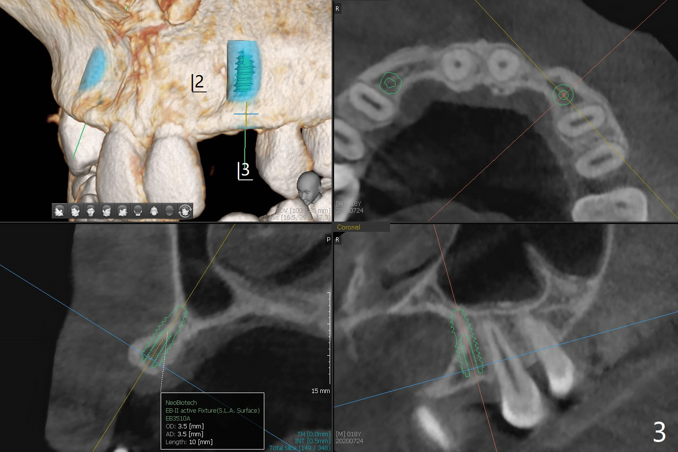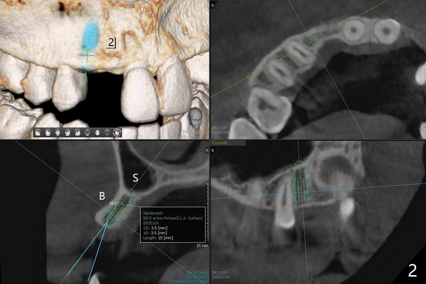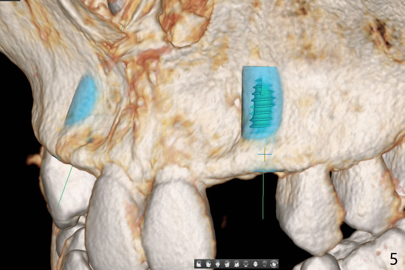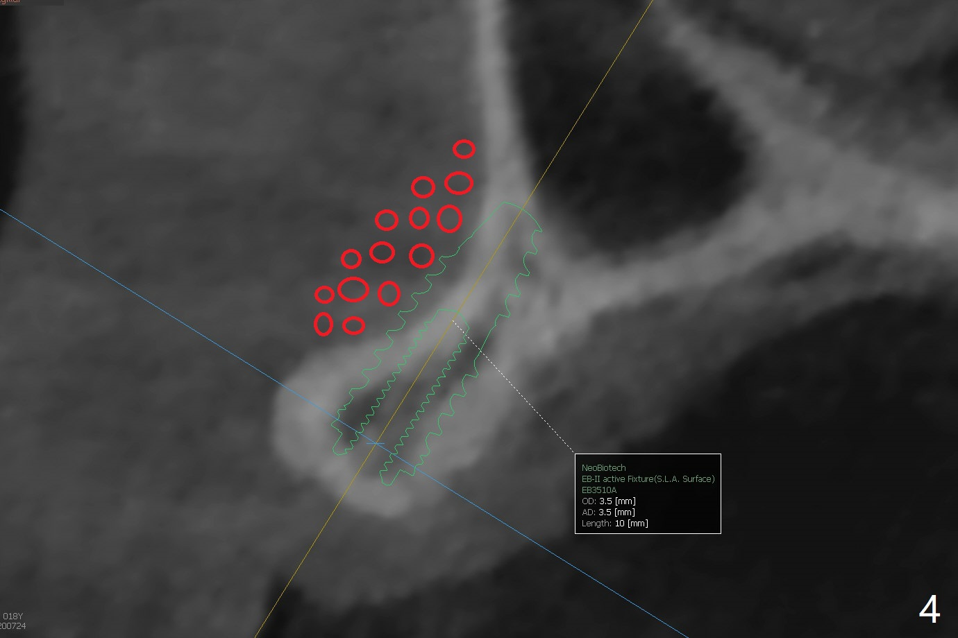 18岁男先天缺失上颌2,3(图一:双侧),2严重颊侧骨壁凹陷(图二,三:2),准备在两侧3种植(图二,三:绿色),做悬臂桥,右上植体3.5乘10毫米,但是必须用带有角度基台修复。而左上3用同样大小植体,颊侧螺纹暴露(图三 B),你会怎么处理?一个月病人到外州上学,而且治疗必须在十九岁前完成,保险可多付钱。为了能在颊侧植骨(图四红圆圈),在左上1近中做一个垂直切口(图五,六红实线),潜行分离骨膜直到4近中(红虚线),并且放置骨块,让骨膜离开颊侧骨板,钻洞时不损伤骨膜。植体放入后,检查颊侧骨块是否足够,最后放置PRF膜,缝合。