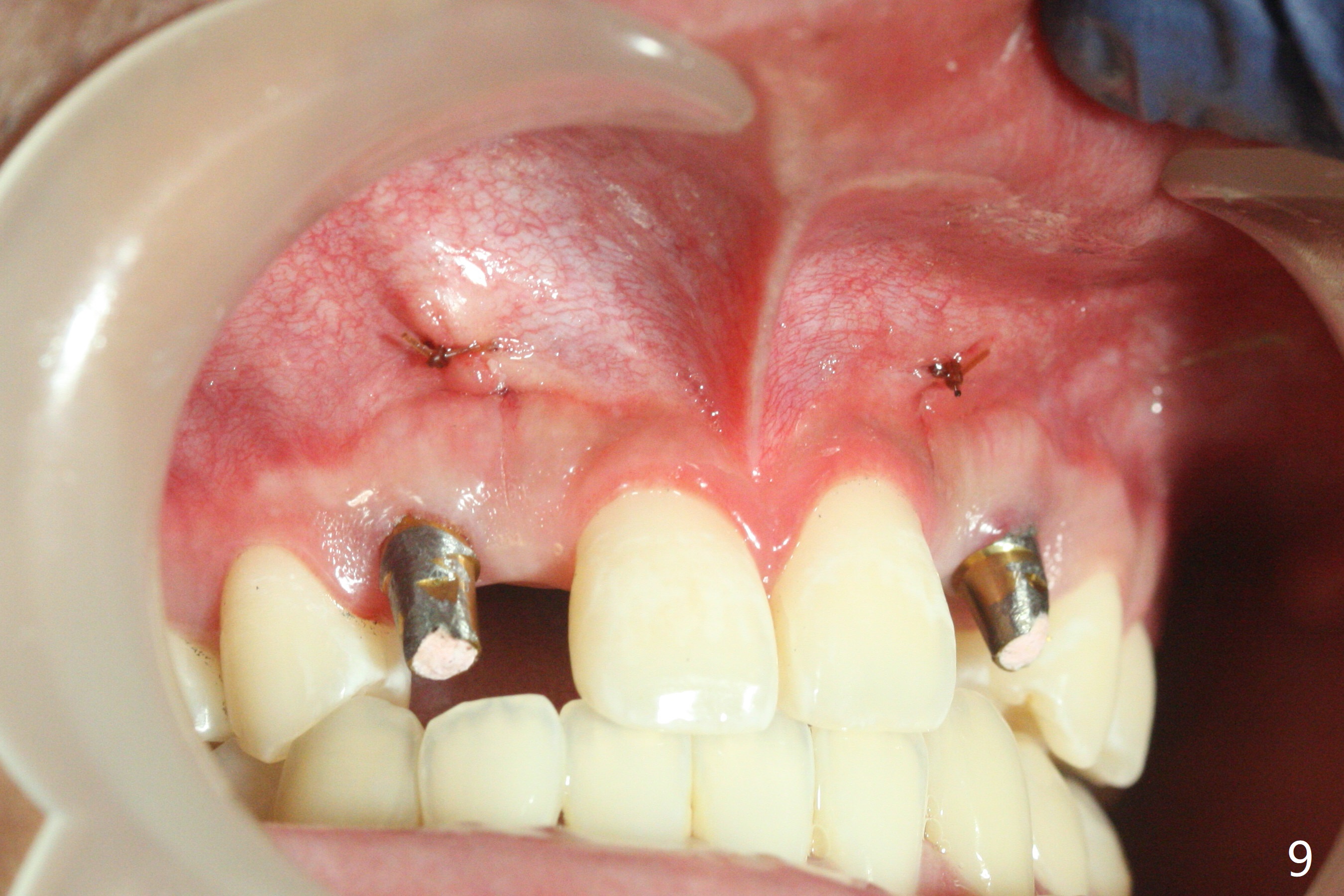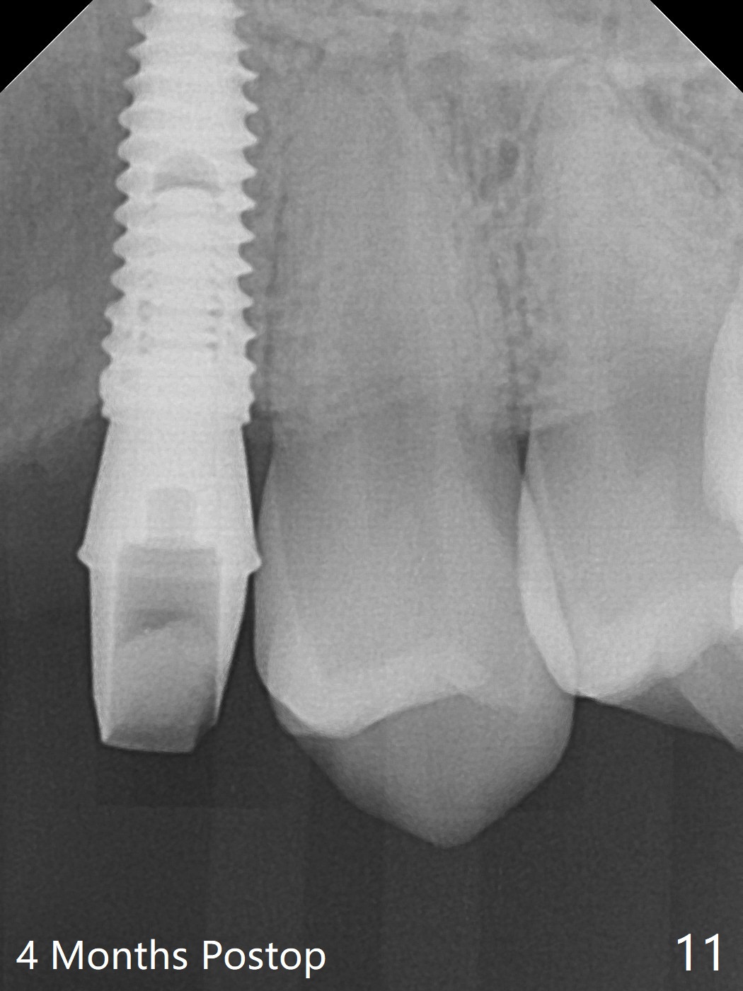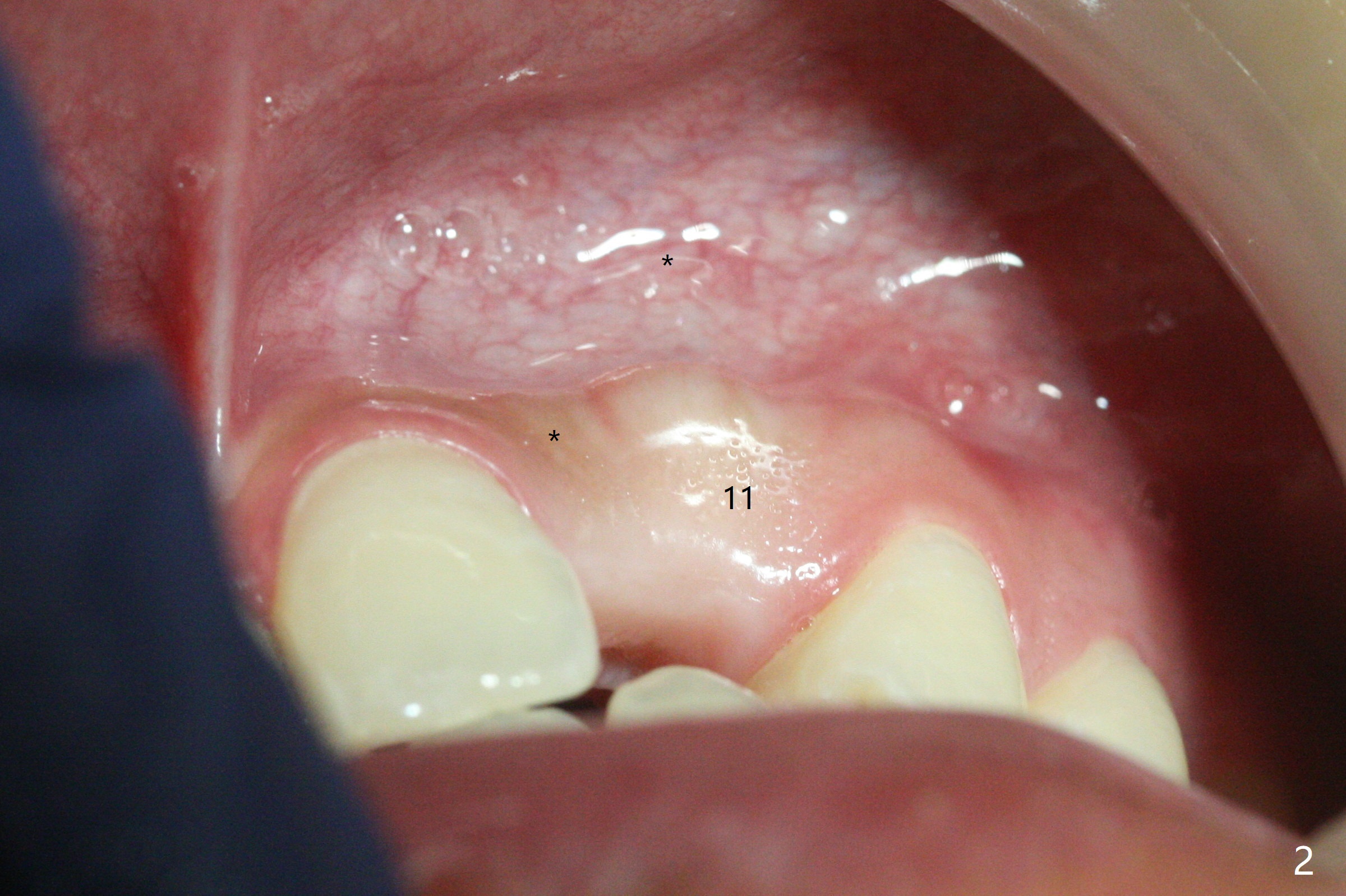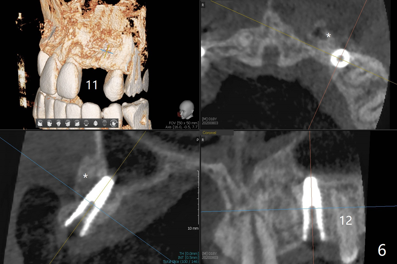 18岁男,本月底到外州上大学,急于十九岁前完成治疗,保险可以多付些。术前检查显示双侧尖牙(图一,二 6,11)根尖,侧切牙牙槽嵴萎缩(*),尖牙、侧切牙之间颊侧做垂直切口,骨膜下潜行分离,在尖牙根尖隧道植骨,然后使用导板,植入窄植体(图四至六),接近或者穿过上颌窦底板(图三,四箭头),骨粉(粘性骨块做的不成功,图五,六 *)好像覆盖暴露的螺纹。再次补充隧道骨粉后,放置修复基台(图七,八),调整后(图九),取模做临时悬臂桥,临床上有些困难分配尖牙,侧切牙比例。术后4个月左侧植体愈合正常(图十,十一),而右侧感染。