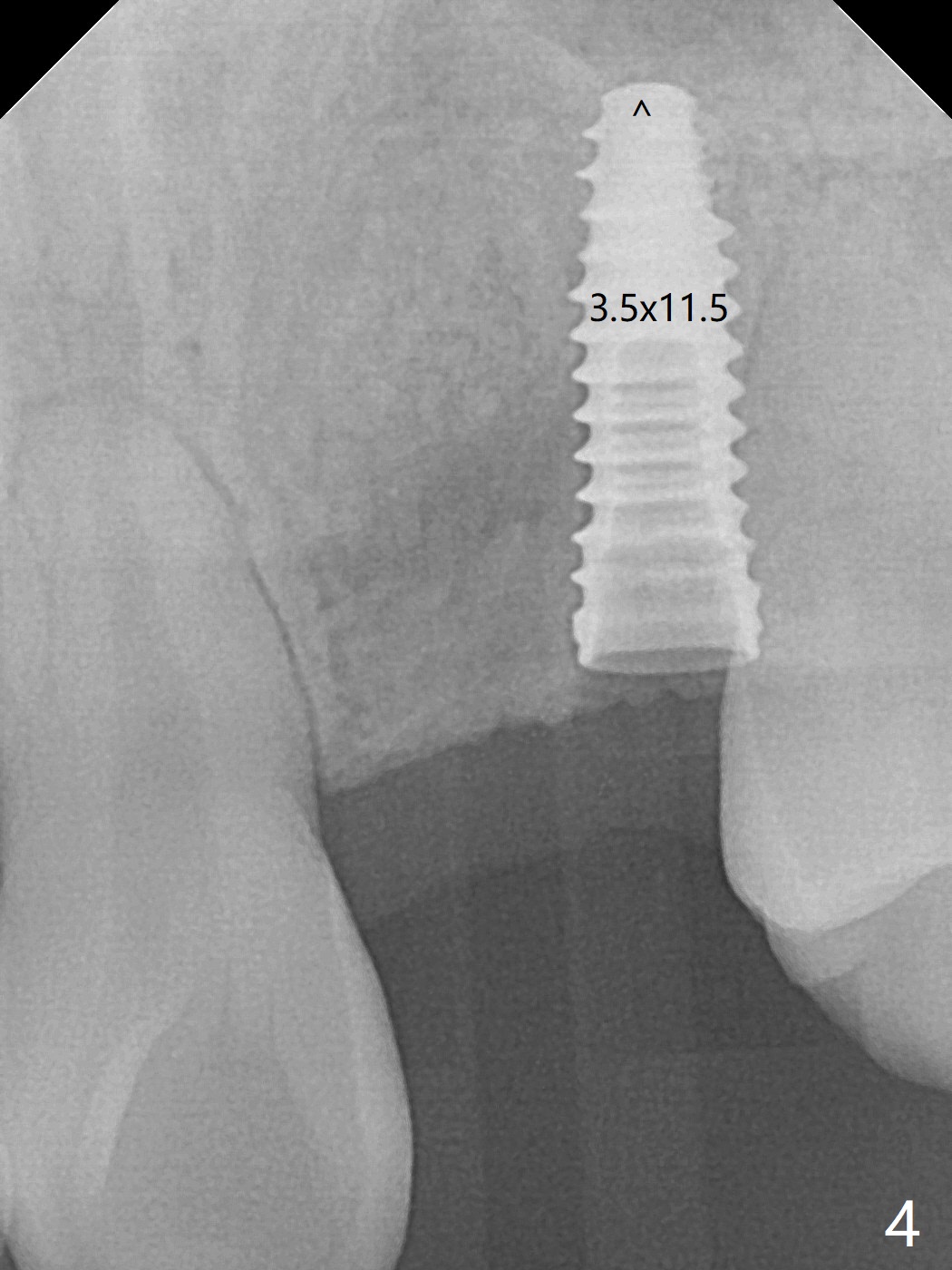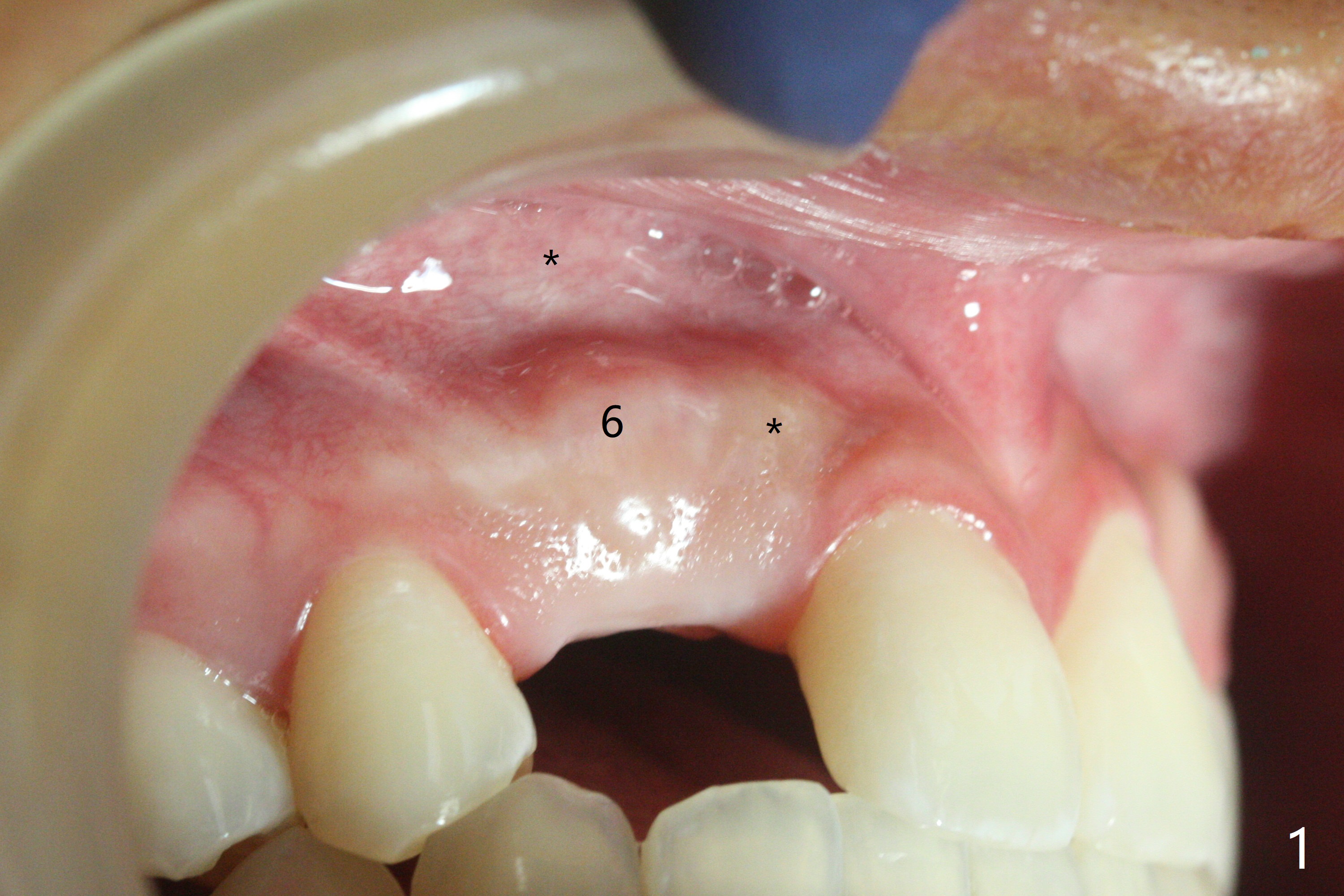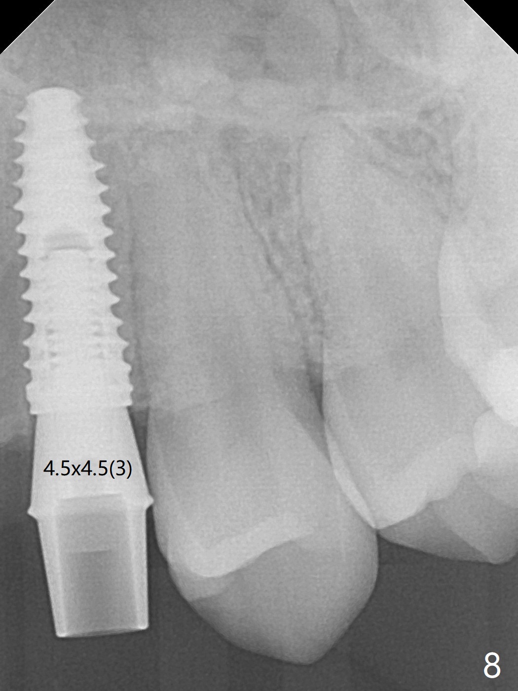 18岁男,本月底到外州上大学,急于十九岁前完成治疗,保险可以多付些。术前检查显示双侧尖牙(图一,二 6,11)根尖,侧切牙牙槽嵴萎缩(*),尖牙、侧切牙之间颊侧做垂直切口,骨膜下潜行分离,在尖牙根尖隧道植骨,然后使用导板,植入窄植体(图四至六),接近或者穿过上颌窦底板(图三,四箭头),骨粉(粘性骨块做的不成功,图五,六 *)好像覆盖暴露的螺纹。再次补充隧道骨粉后,放置修复基台(图七,八),调整后(图九),取模做临时悬臂桥,临床上有些困难分配尖牙,侧切牙比例。术后4个月左侧植体愈合正常(图十,十一),而右侧感染。