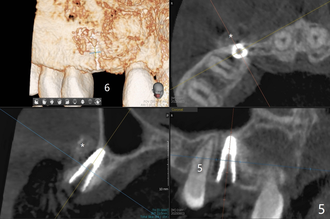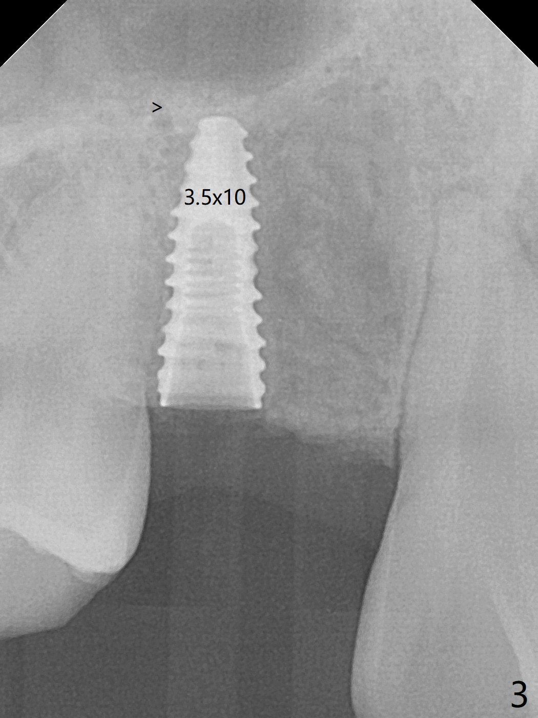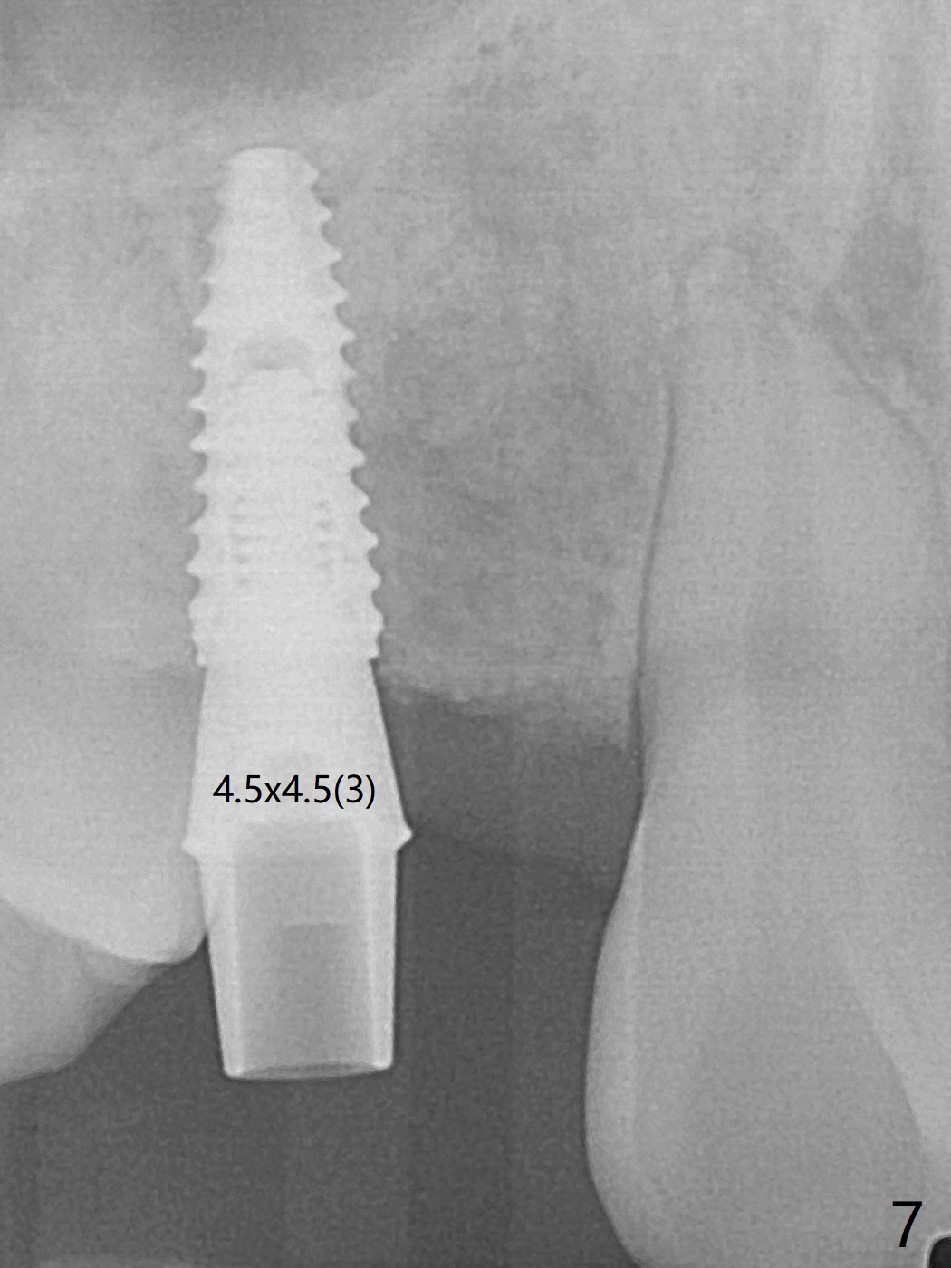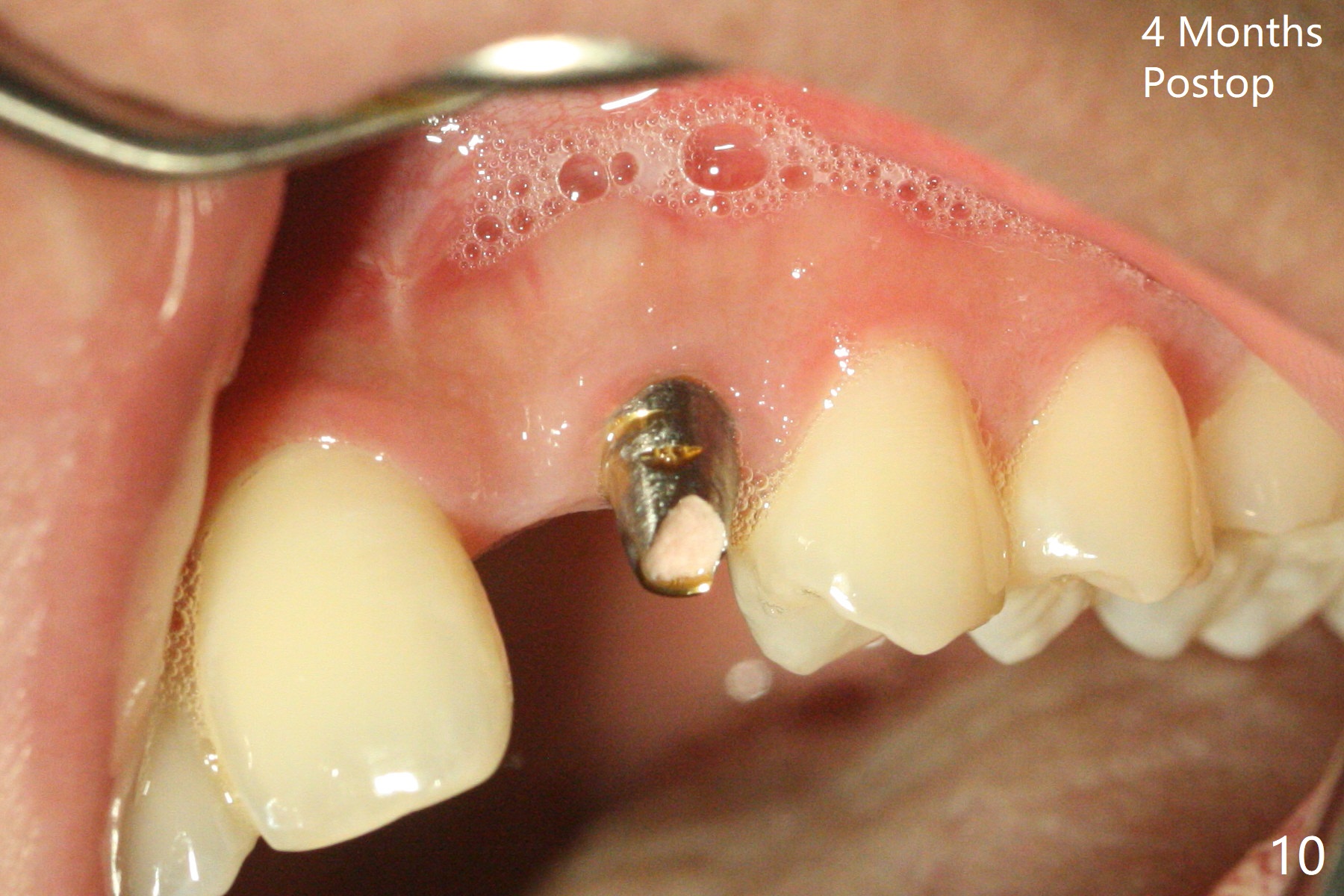 18岁男,本月底到外州上大学,急于十九岁前完成治疗,保险可以多付些。术前检查显示双侧尖牙(图一,二 6,11)根尖,侧切牙牙槽嵴萎缩(*),尖牙、侧切牙之间颊侧做垂直切口,骨膜下潜行分离,在尖牙根尖隧道植骨,然后使用导板,植入窄植体(图四至六),接近或者穿过上颌窦底板(图三,四箭头),骨粉(粘性骨块做的不成功,图五,六 *)好像覆盖暴露的螺纹。再次补充隧道骨粉后,放置修复基台(图七,八),调整后(图九),取模做临时悬臂桥,临床上有些困难分配尖牙,侧切牙比例。术后4个月左侧植体愈合正常(图十,十一),而右侧感染。