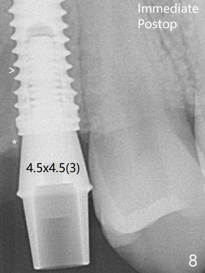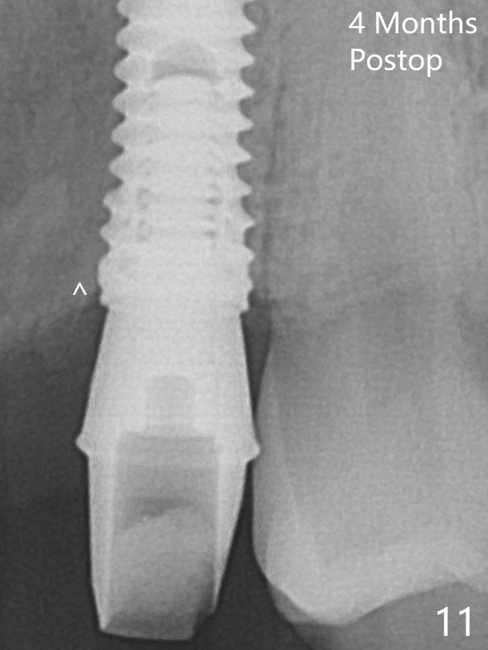 术后4个月牙槽嵴(图八:*)吸收(图十一:^),刚植入时的间隙(图八:>)四个月后仿佛消失。