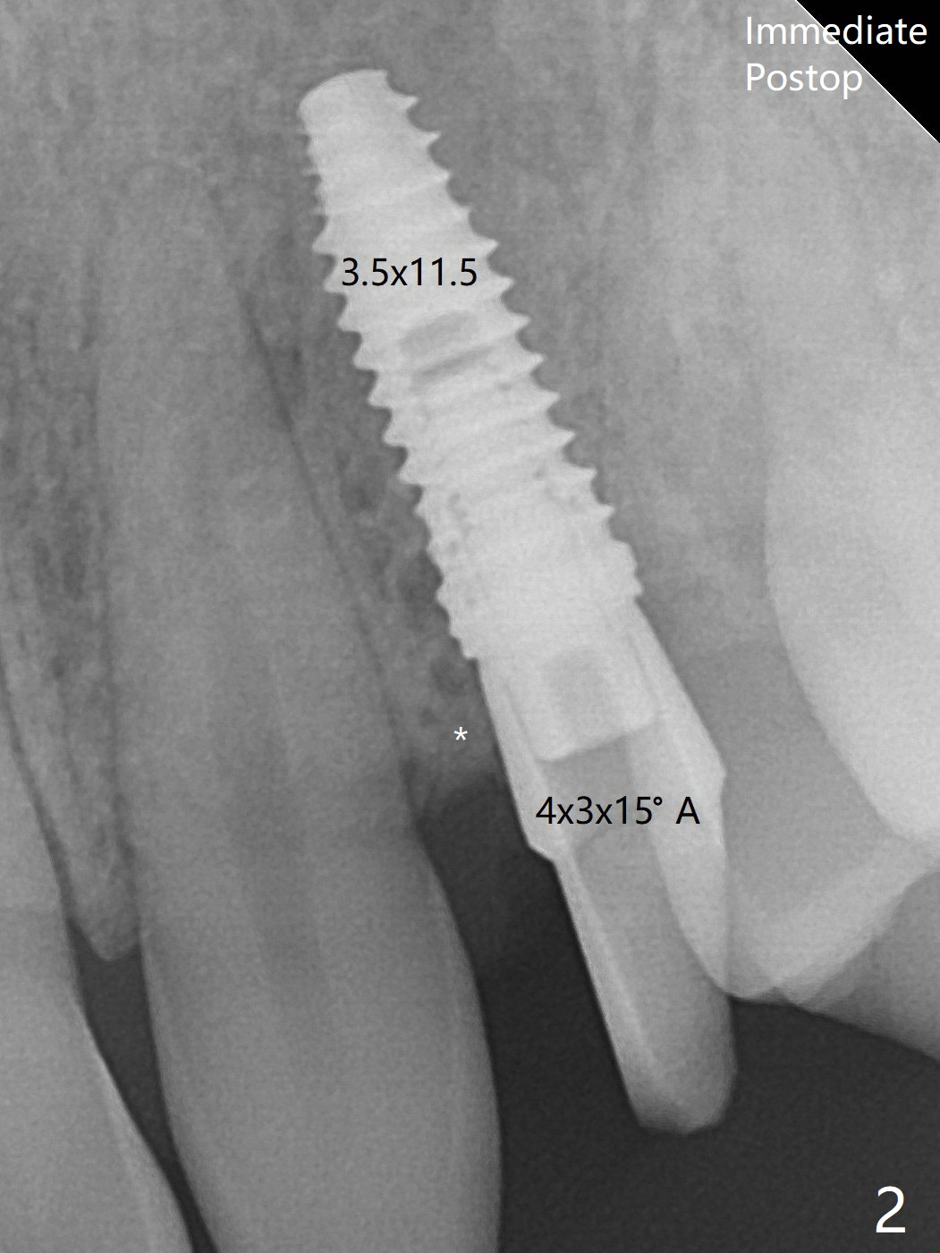 There is mesial crestal bone loss 4 months postop (Fig.4, as compared to immediate postop in Fig.2 (*)).