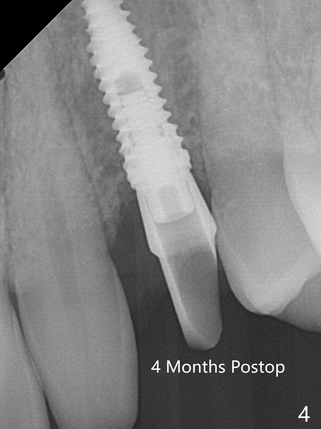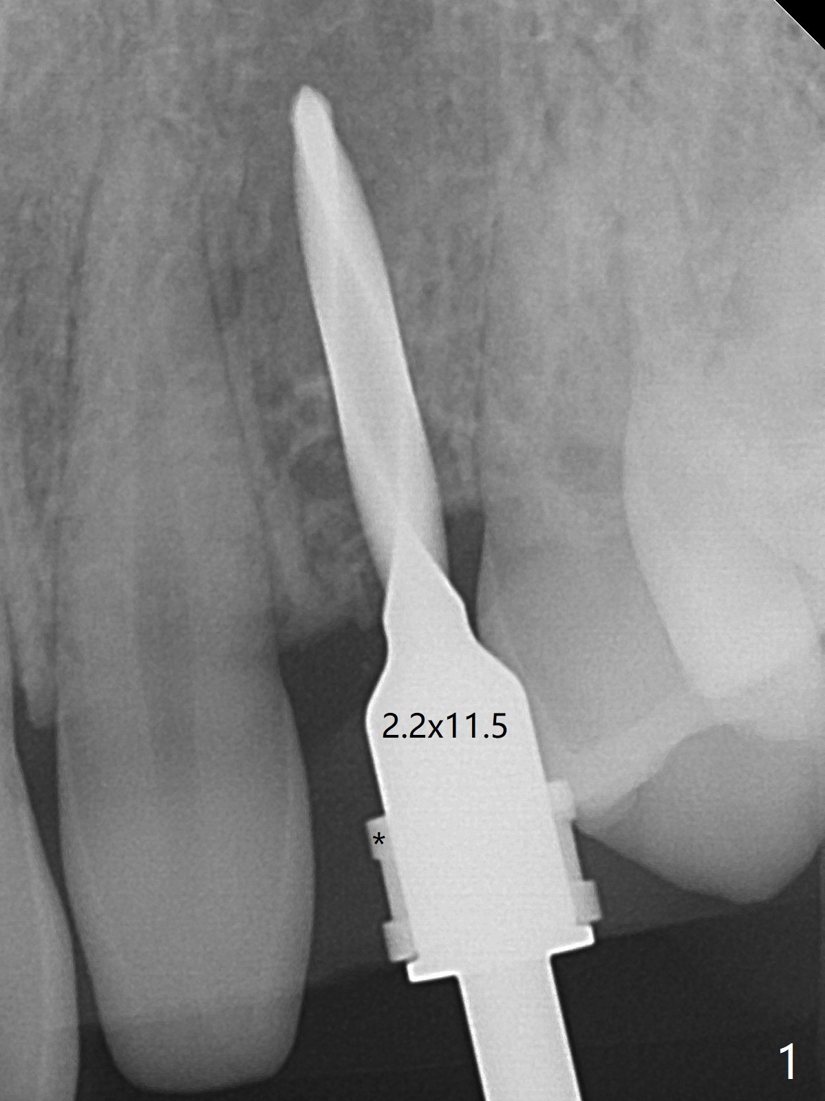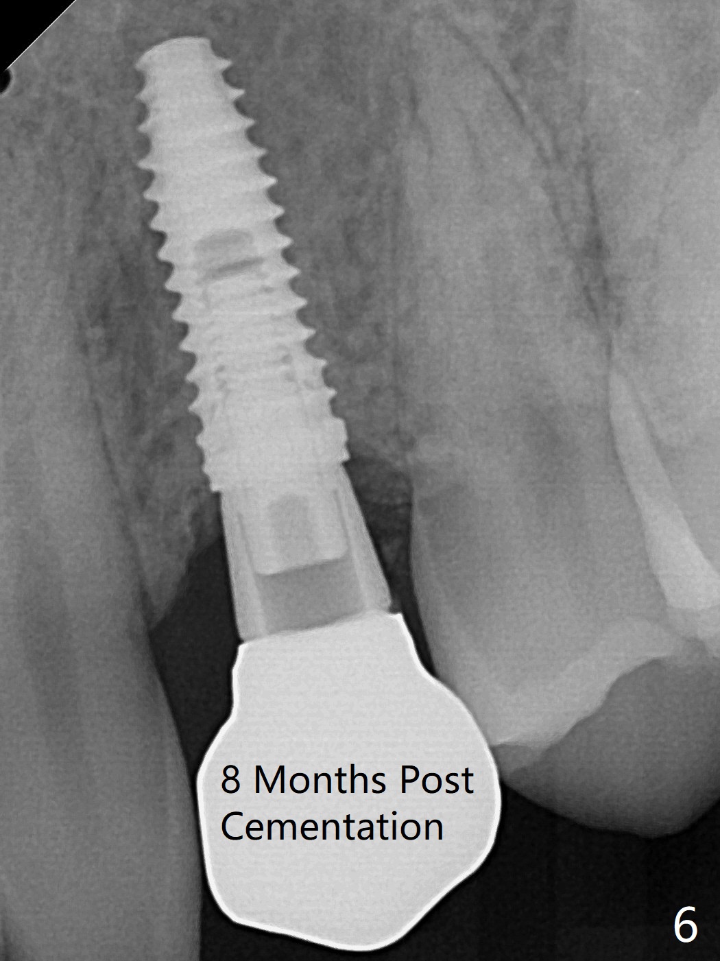When the guide with 10.5 mm offset is seated at #11 after extraction, it looks buccal. Pointed drill creates an entry point in the mesial portion of the socket. PA, taken following 2.2x11.5 mm drill, shows acceptable mesiodistal trajectory (Fig.1). When a 3.5x11.5 mm implant is placed, it is difficult to withdraw the driver from the metal tube (Fig.1 *). There is no buccal gap with plenty of the lingual gap. A 4x3 mm x15 degree A-type angled abutment is placed (Fig.2). It appears that the dense palatal plate deviates the osteotomy and implant placement (as compared to the design, Fig.3). In fact osteotomy should have been prepared until 4 mm in diameter before increase in depth with 2.2 and 3 mm drills to eliminate buccal deviation. The ideal drill sequence would be point drill, 2.2x8.5 mm drill, 3x8.5, 3.5x8.5, 2.2x10, 2.2x11.5, PA to confirm trajectory, 3x10, 3x11.5 and 3x13. Torque associated with implant placement is pure, not derived from friction between the driver and the metal tube. There is mesial crestal bone loss 4 months postop (Fig.4, as compared to immediate postop in Fig.2 (*)). Crestal bone loss does not get worse between 4 and 6.5 months postop (Fig.4,5). The bone density increases 8 months post cementation (Fig.6).