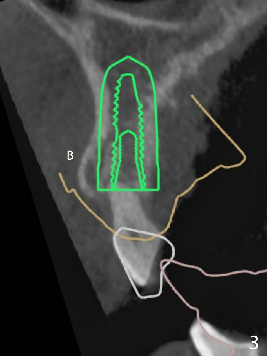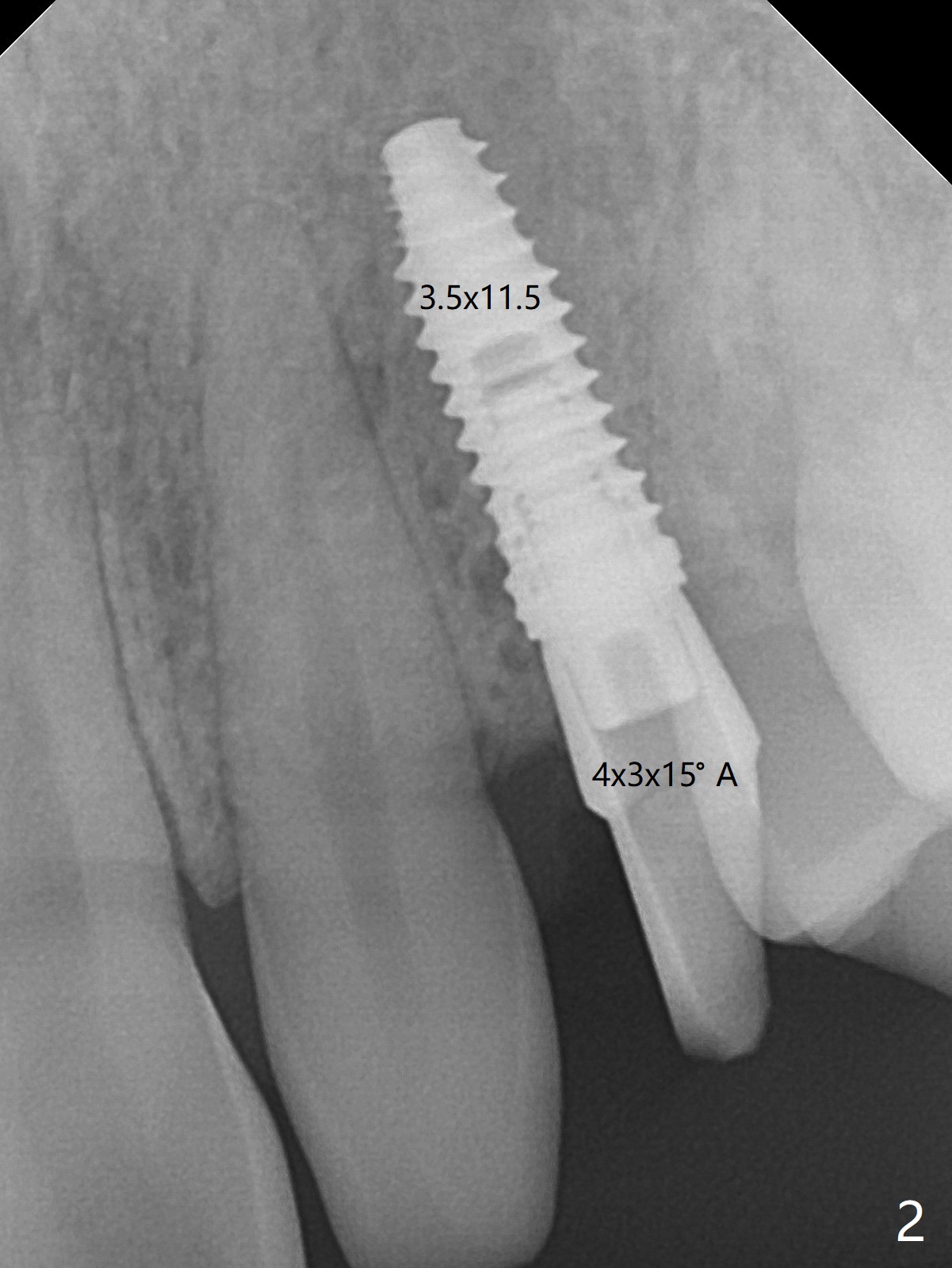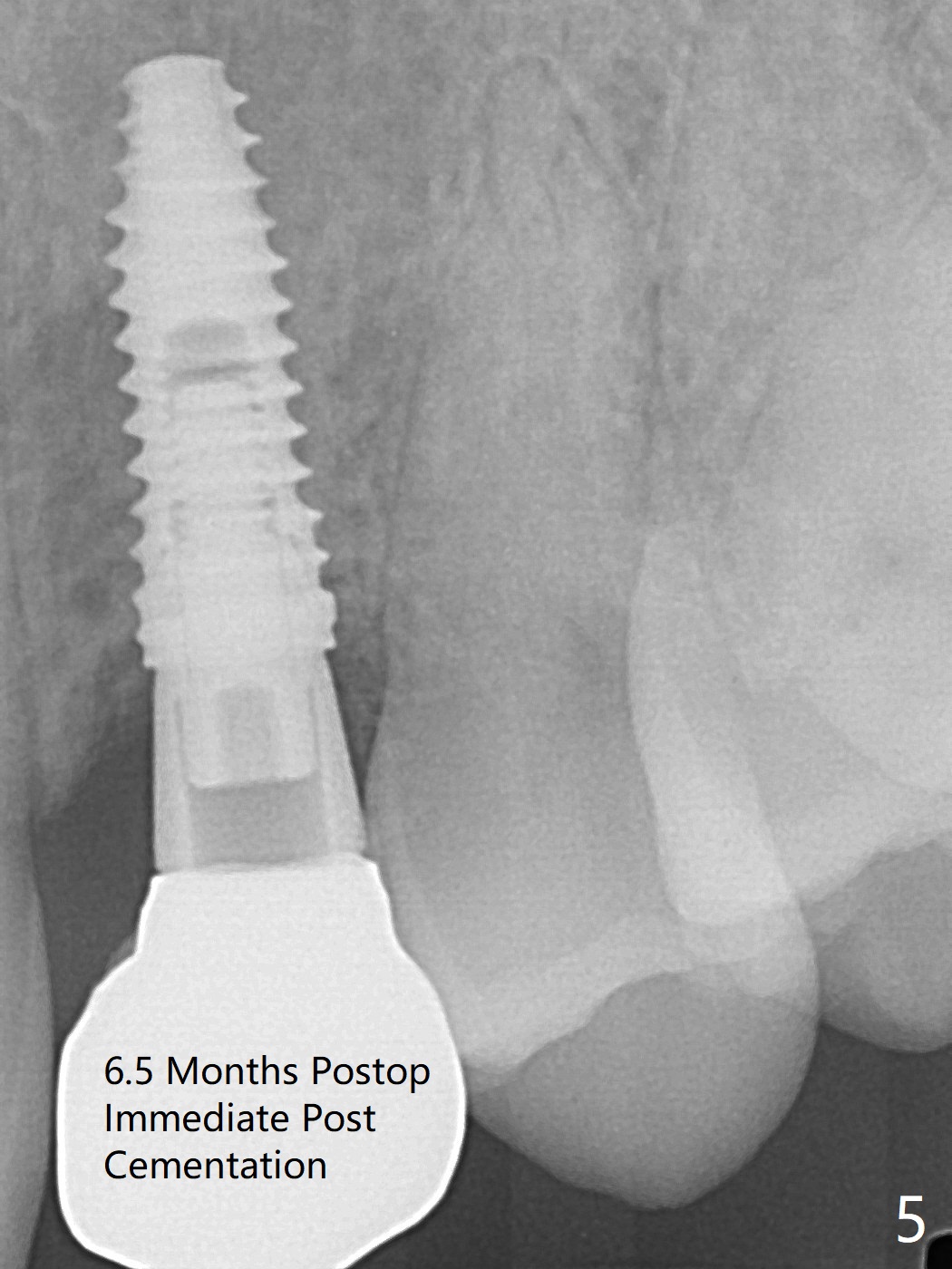 When the guide with 10.5 mm offset is seated at #11 after extraction, it looks buccal. Pointed drill creates an entry point in the mesial portion of the socket. PA, taken following 2.2x11.5 mm drill, shows acceptable mesiodistal trajectory (Fig.1). When a 3.5x11.5 mm implant is placed, it is difficult to withdraw the driver from the metal tube (Fig.1 *). There is no buccal gap with plenty of the lingual gap. A 4x3 mm x15 degree A-type angled abutment is placed (Fig.2). It appears that the dense palatal plate deviates the osteotomy and implant placement (as compared to the design, Fig.3). In fact osteotomy should have been prepared until 4 mm in diameter before increase in depth with 2.2 and 3 mm drills to eliminate buccal deviation. The ideal drill sequence would be point drill, 2.2x8.5 mm drill, 3x8.5, 3.5x8.5, 2.2x10, 2.2x11.5, PA to confirm trajectory, 3x10, 3x11.5 and 3x13. Torque associated with implant placement is pure, not derived from friction between the driver and the metal tube. There is mesial crestal bone loss 4 months postop (Fig.4, as compared to immediate postop in Fig.2 (*)). Crestal bone loss does not get worse between 4 and 6.5 months postop (Fig.4,5). The bone density increases 8 months post cementation (Fig.6).