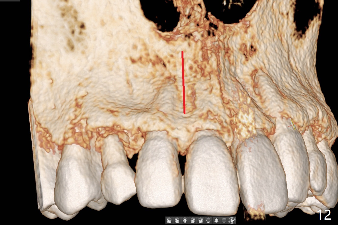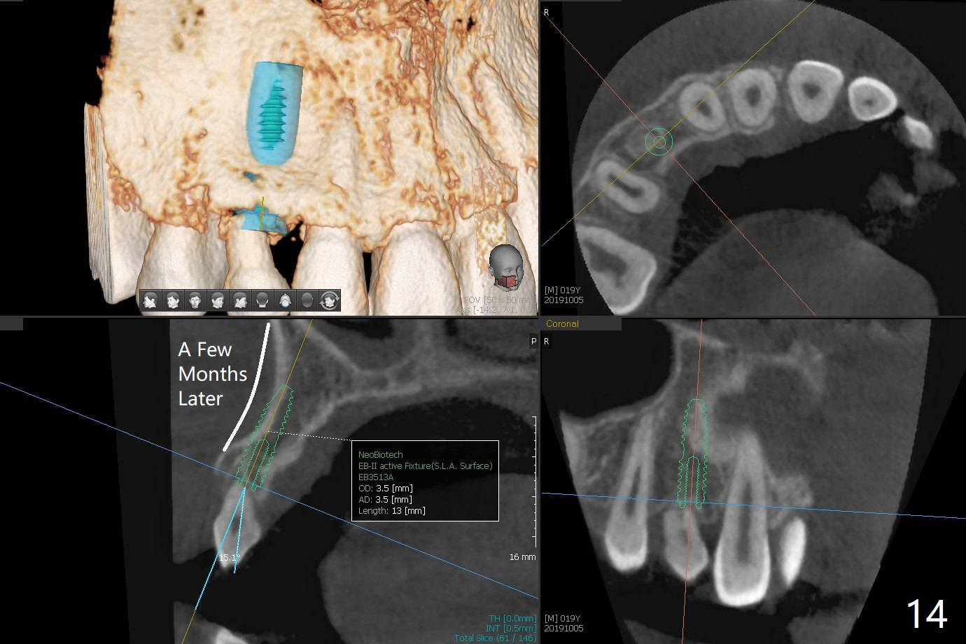 The 2nd revision (Fig.6-8). After #11 implant placement (Fig.9,10), turn to the buccal concavity at #C (Fig.11). Make a mesial remote vertical incision (Fig.12 red line). Use Molt's curette or sinus lift instruments for dissection (Fig.13 blue dashed line) and a round diamond bur connected to a surgical handpiece for bleeding surface (green) before bone graft. Take 5x5 cm CT. A few months later, the regenerated buccal plate (Fig.14 white curved line) allows placement of a 3.5x13 mm implant with reduced chance of buccal perforation.