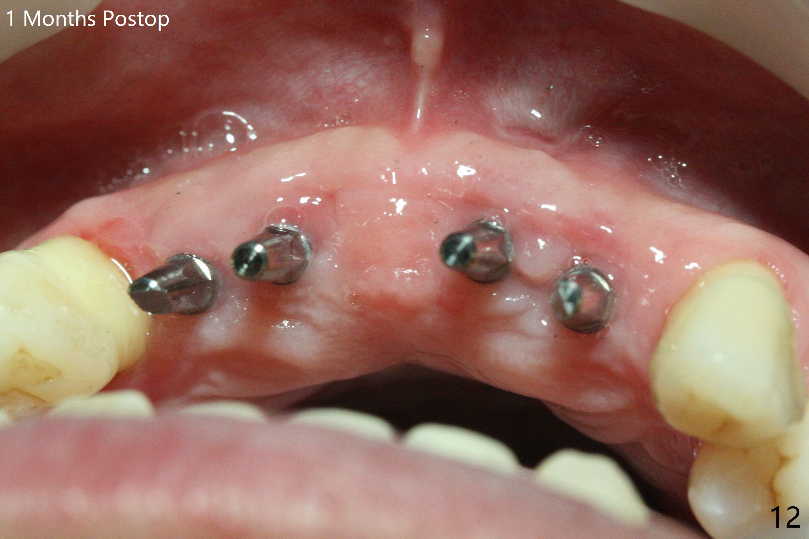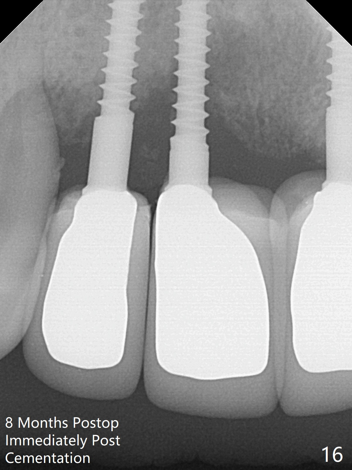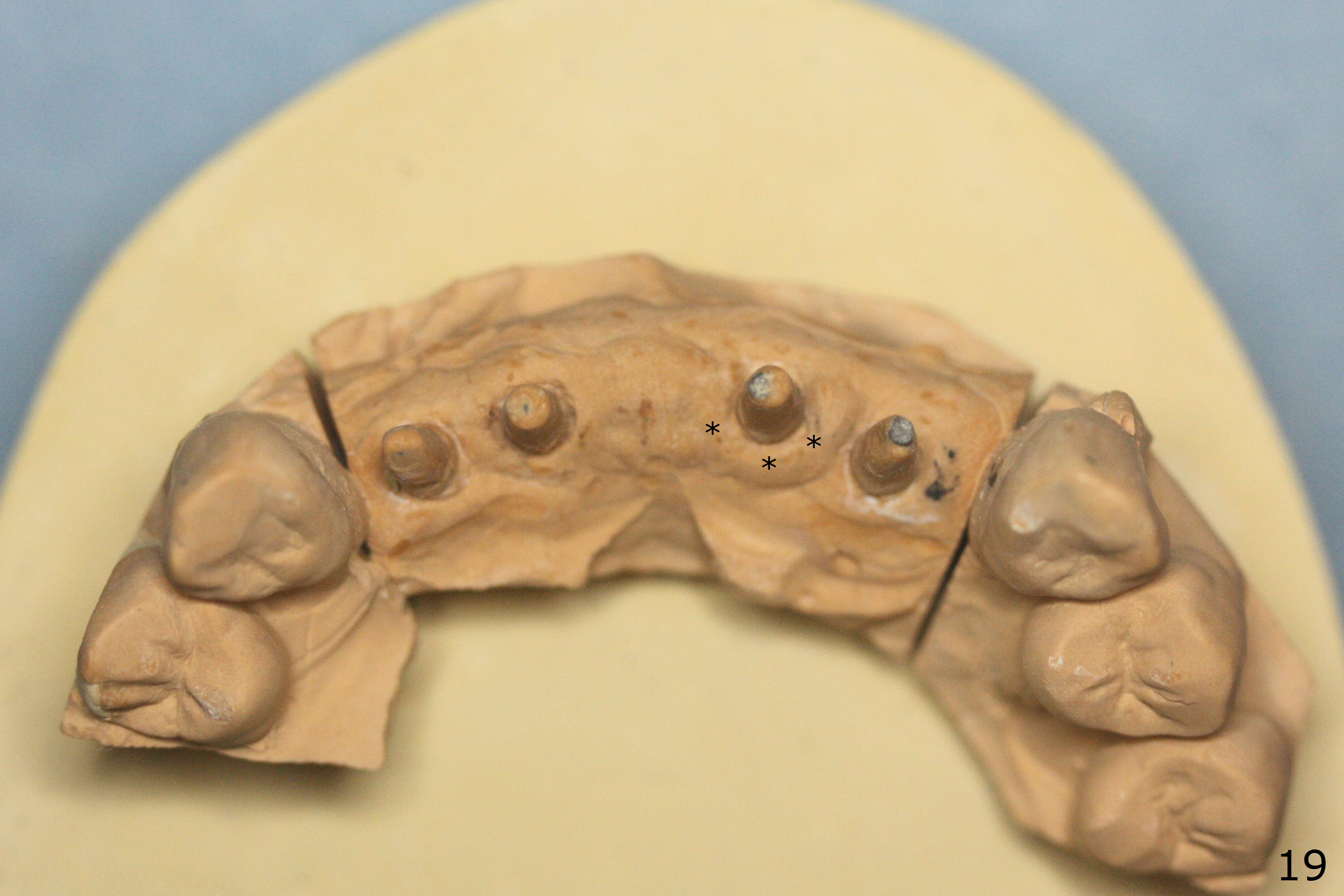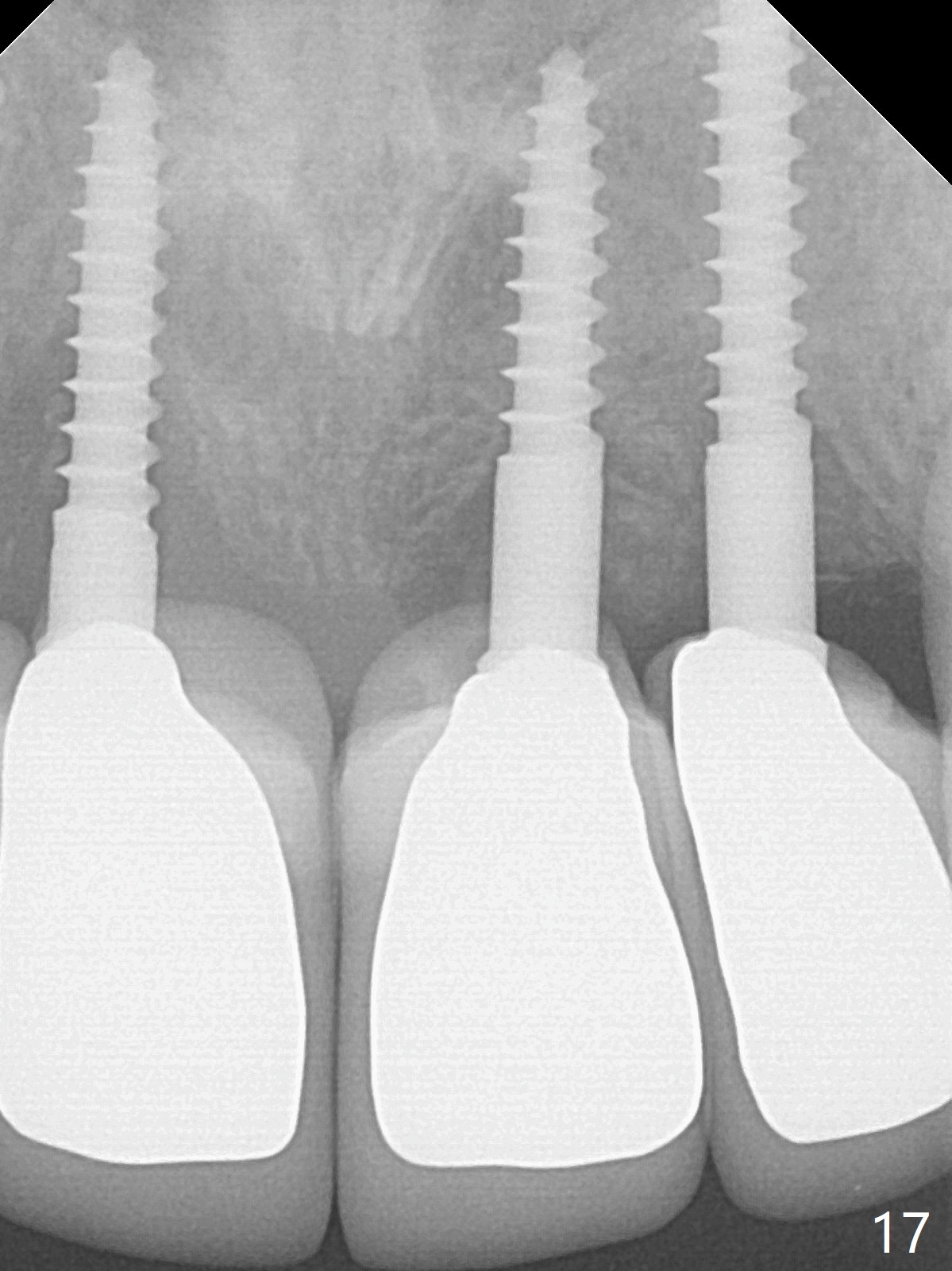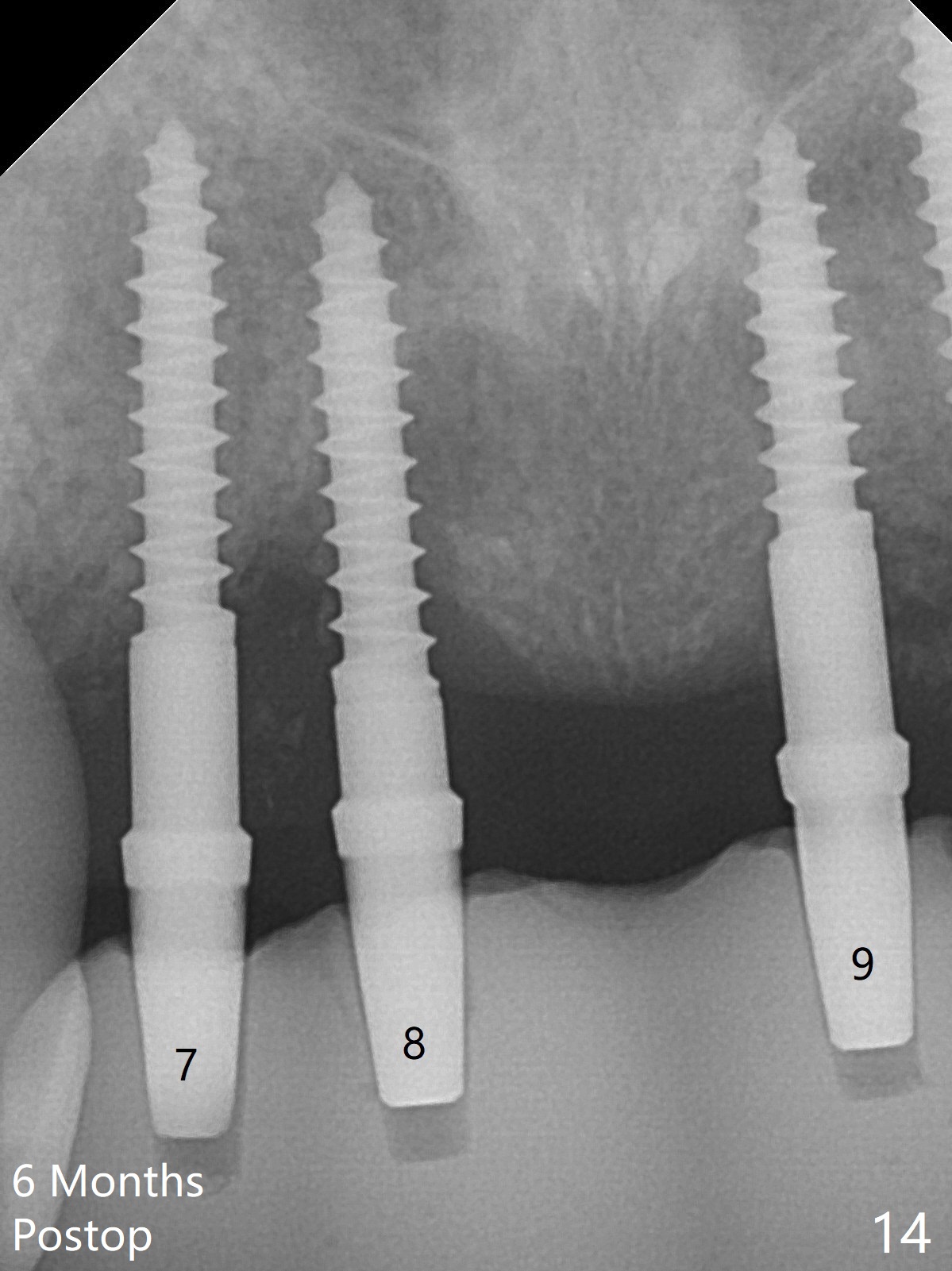 Although the ridge of the maxillary anterior ridge looks moderate in width (Fig.1), the bone is ~4 mm buccopalatally. Suction down surgical stent (Fig.2') made from the lab-fabricated provisional (Fig.2) will be used to check the position and trajectory of osteotomies. PAs taken after initial osteotomies (1.2 mm drill) show those at the central incisors tend to be mesial (close to the Incisive Canal *), while those at the lateral incisor sites distal (Fig.3,4). After adjustment, the position and trajectory of the osteotomies are acceptable (Fig.5,6). To reduce the chance of perforating the Incisive Canal (Fig.3,4 *), 2.5 mm 1-piece implants are inserted with >40 Ncm (Fig.7,8). After deep placement of the implants, Vanilla graft is placed at the crest (Fig.9,10 *). An immediate splinted provisional is fabricated from the suction down stent. The gingiva is healthy around the provisional (Fig.11) and the implants (Fig.12,13) 1 month postop. The provisional is adjusted monthly so that the interdental papillae can be elongated. No bone resorption is observed 6 months postop (Fig.14,15). Crowns are cemented 8 months postop (Fig.16-18). The keratinized gingiva appears to have formed the abutments 8 months postop immediately pre-cementation (Fig.19).