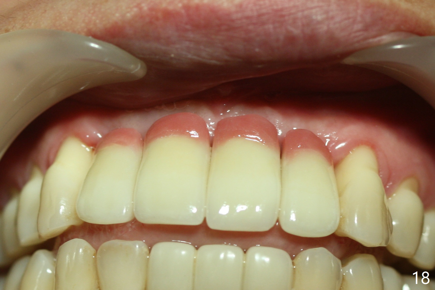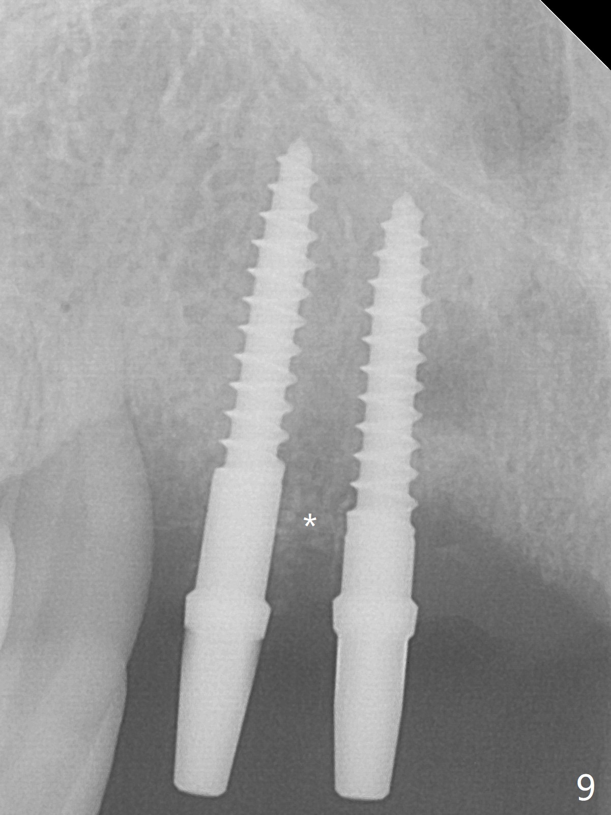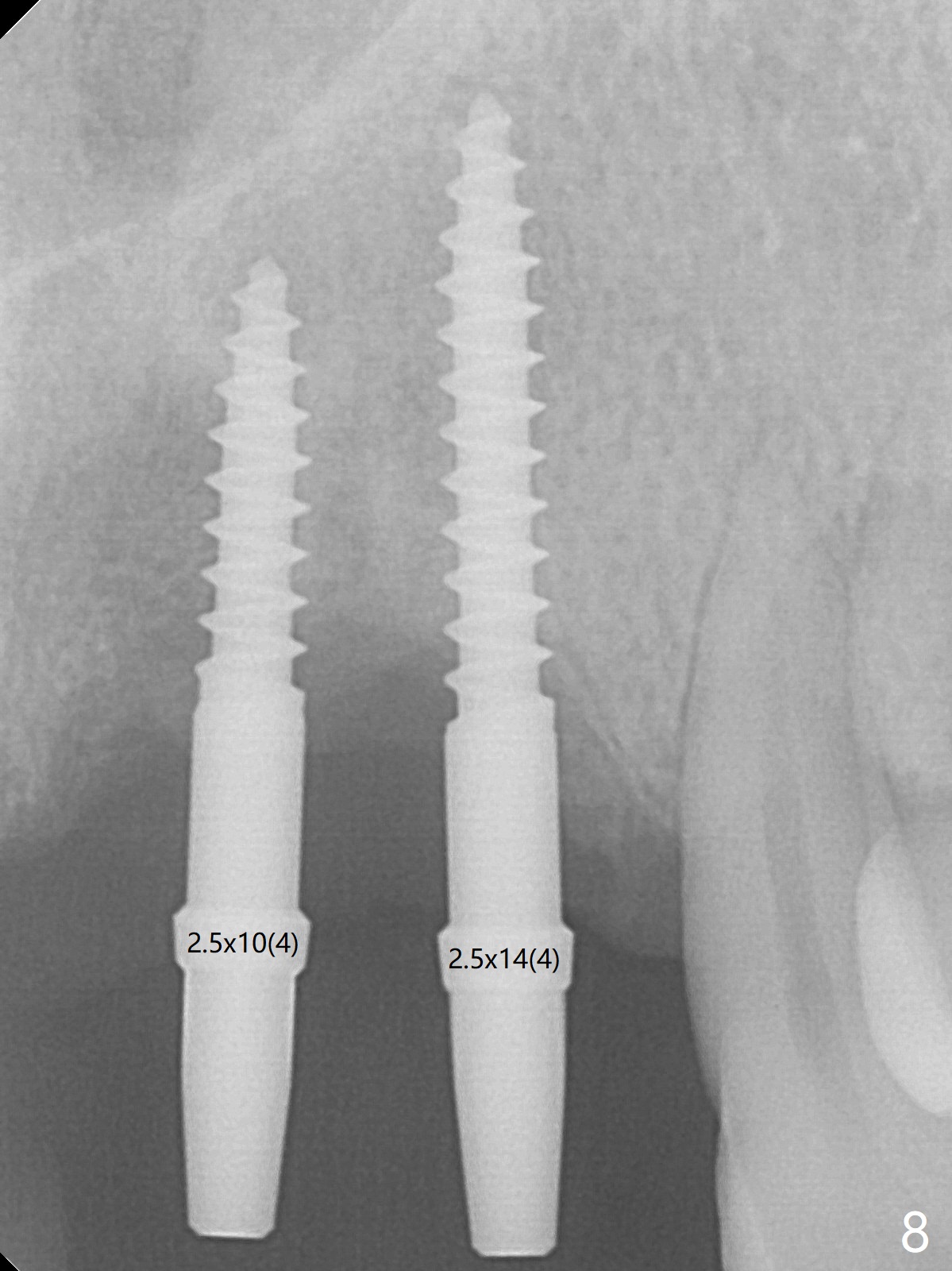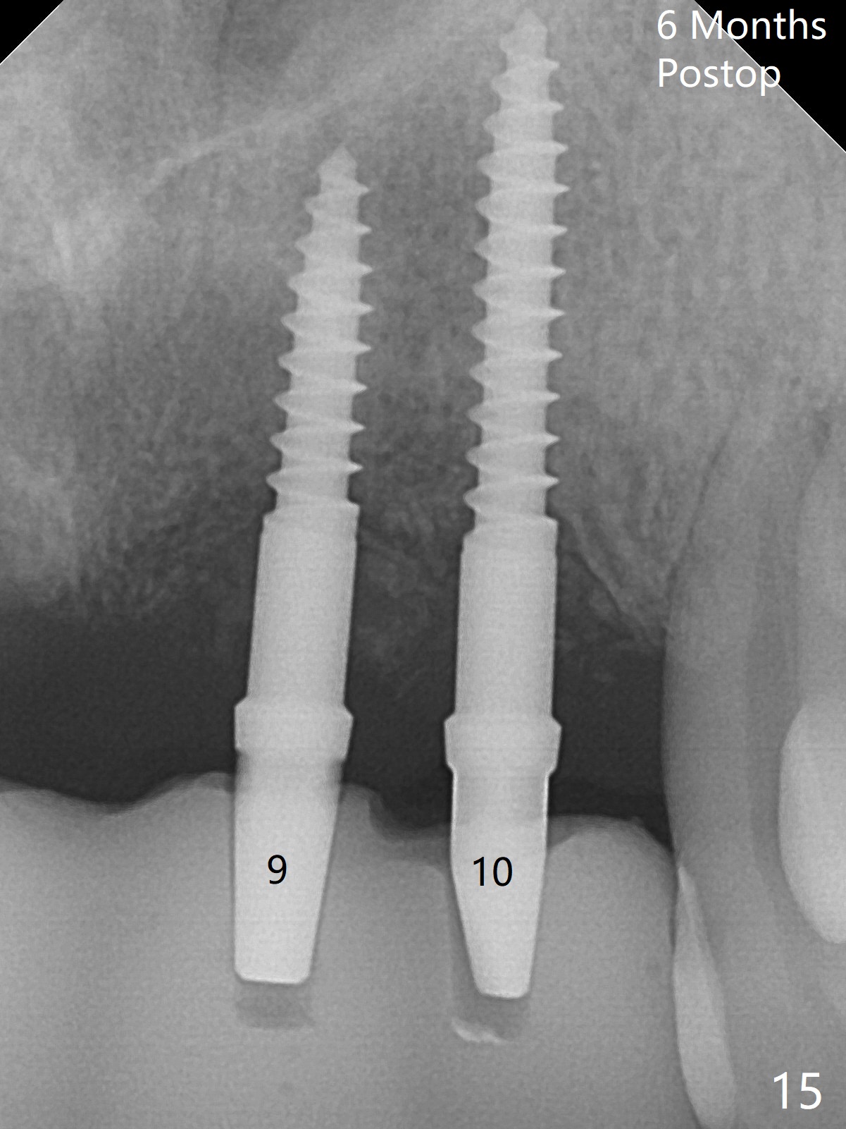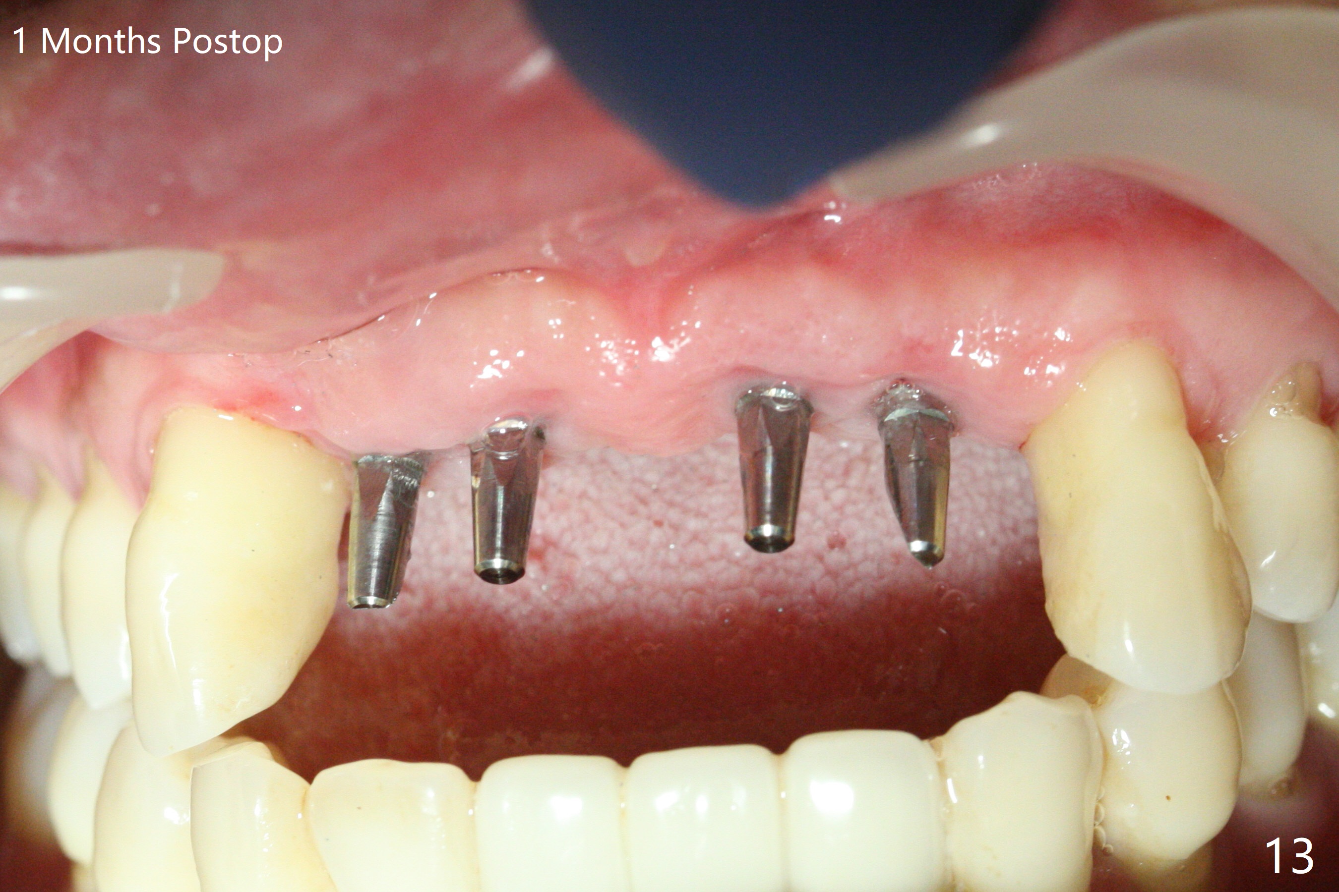 Although the ridge of the maxillary anterior ridge looks moderate in width (Fig.1), the bone is ~4 mm buccopalatally. Suction down surgical stent (Fig.2') made from the lab-fabricated provisional (Fig.2) will be used to check the position and trajectory of osteotomies. PAs taken after initial osteotomies (1.2 mm drill) show those at the central incisors tend to be mesial (close to the Incisive Canal *), while those at the lateral incisor sites distal (Fig.3,4). After adjustment, the position and trajectory of the osteotomies are acceptable (Fig.5,6). To reduce the chance of perforating the Incisive Canal (Fig.3,4 *), 2.5 mm 1-piece implants are inserted with >40 Ncm (Fig.7,8). After deep placement of the implants, Vanilla graft is placed at the crest (Fig.9,10 *). An immediate splinted provisional is fabricated from the suction down stent. The gingiva is healthy around the provisional (Fig.11) and the implants (Fig.12,13) 1 month postop. The provisional is adjusted monthly so that the interdental papillae can be elongated. No bone resorption is observed 6 months postop (Fig.14,15). Crowns are cemented 8 months postop (Fig.16-18). The keratinized gingiva appears to have formed the abutments 8 months postop immediately pre-cementation (Fig.19).
