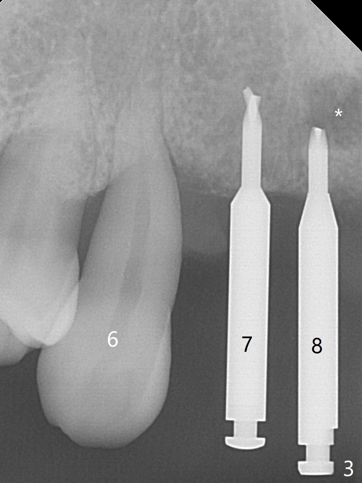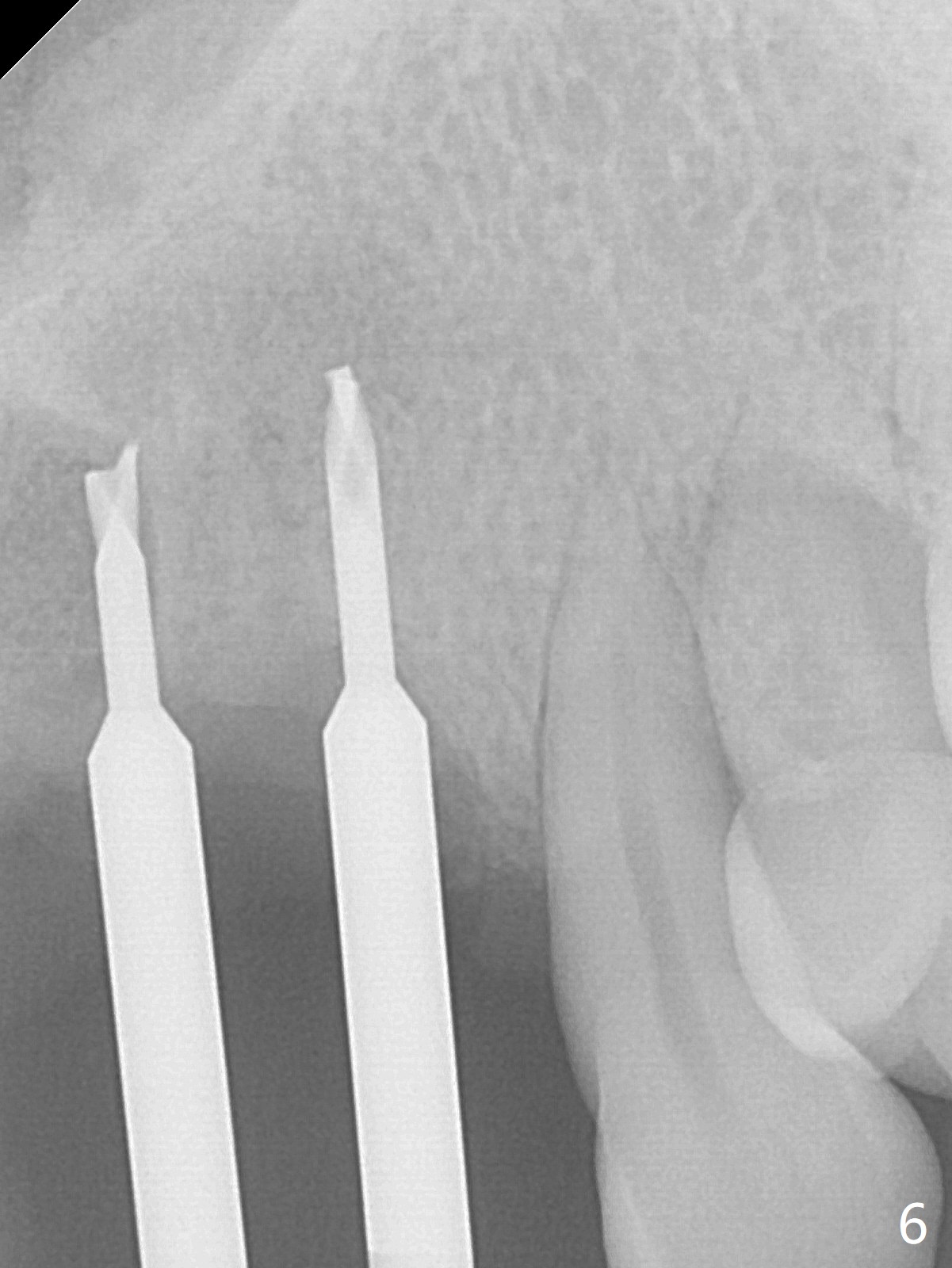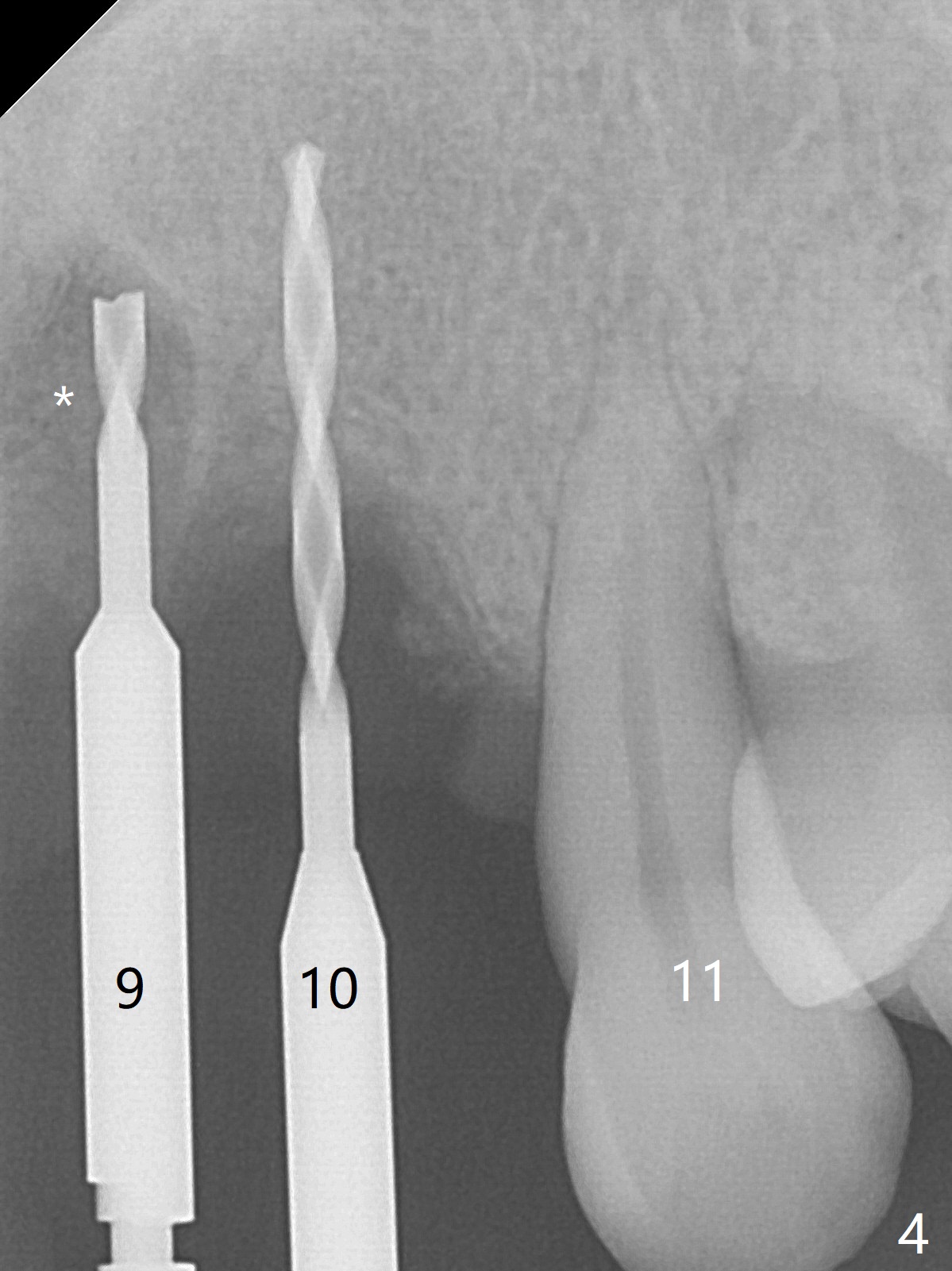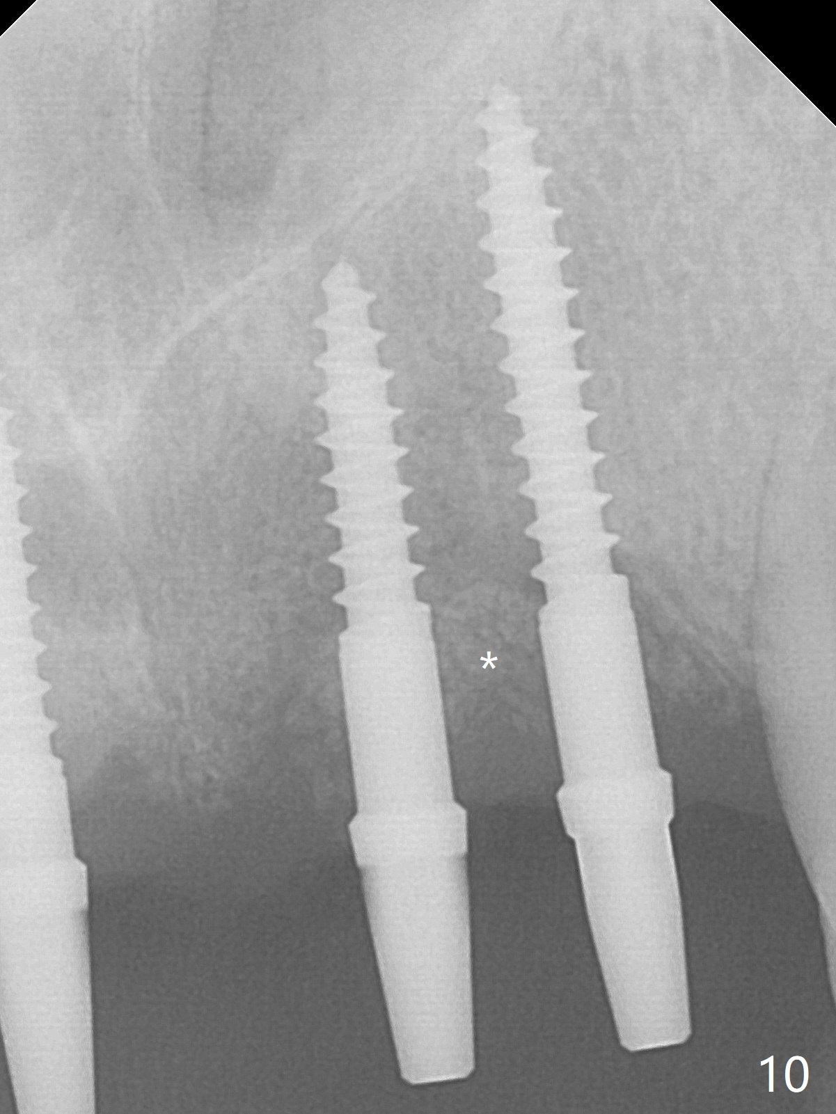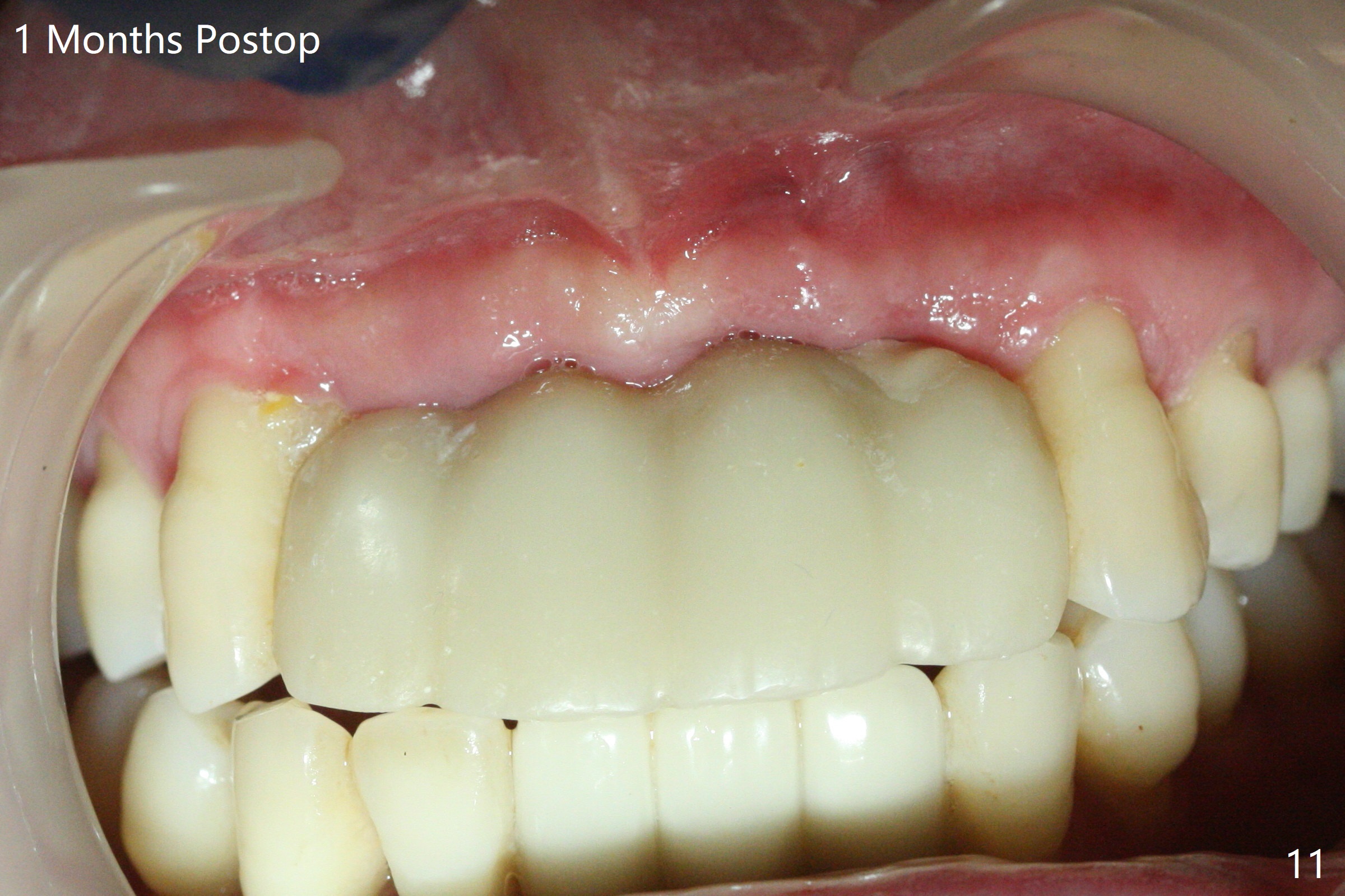 Although the ridge of the maxillary anterior ridge looks moderate in width (Fig.1), the bone is ~4 mm buccopalatally. Suction down surgical stent (Fig.2') made from the lab-fabricated provisional (Fig.2) will be used to check the position and trajectory of osteotomies. PAs taken after initial osteotomies (1.2 mm drill) show those at the central incisors tend to be mesial (close to the Incisive Canal *), while those at the lateral incisor sites distal (Fig.3,4). After adjustment, the position and trajectory of the osteotomies are acceptable (Fig.5,6). To reduce the chance of perforating the Incisive Canal (Fig.3,4 *), 2.5 mm 1-piece implants are inserted with >40 Ncm (Fig.7,8). After deep placement of the implants, Vanilla graft is placed at the crest (Fig.9,10 *). An immediate splinted provisional is fabricated from the suction down stent. The gingiva is healthy around the provisional (Fig.11) and the implants (Fig.12,13) 1 month postop. The provisional is adjusted monthly so that the interdental papillae can be elongated. No bone resorption is observed 6 months postop (Fig.14,15). Crowns are cemented 8 months postop (Fig.16-18). The keratinized gingiva appears to have formed the abutments 8 months postop immediately pre-cementation (Fig.19).