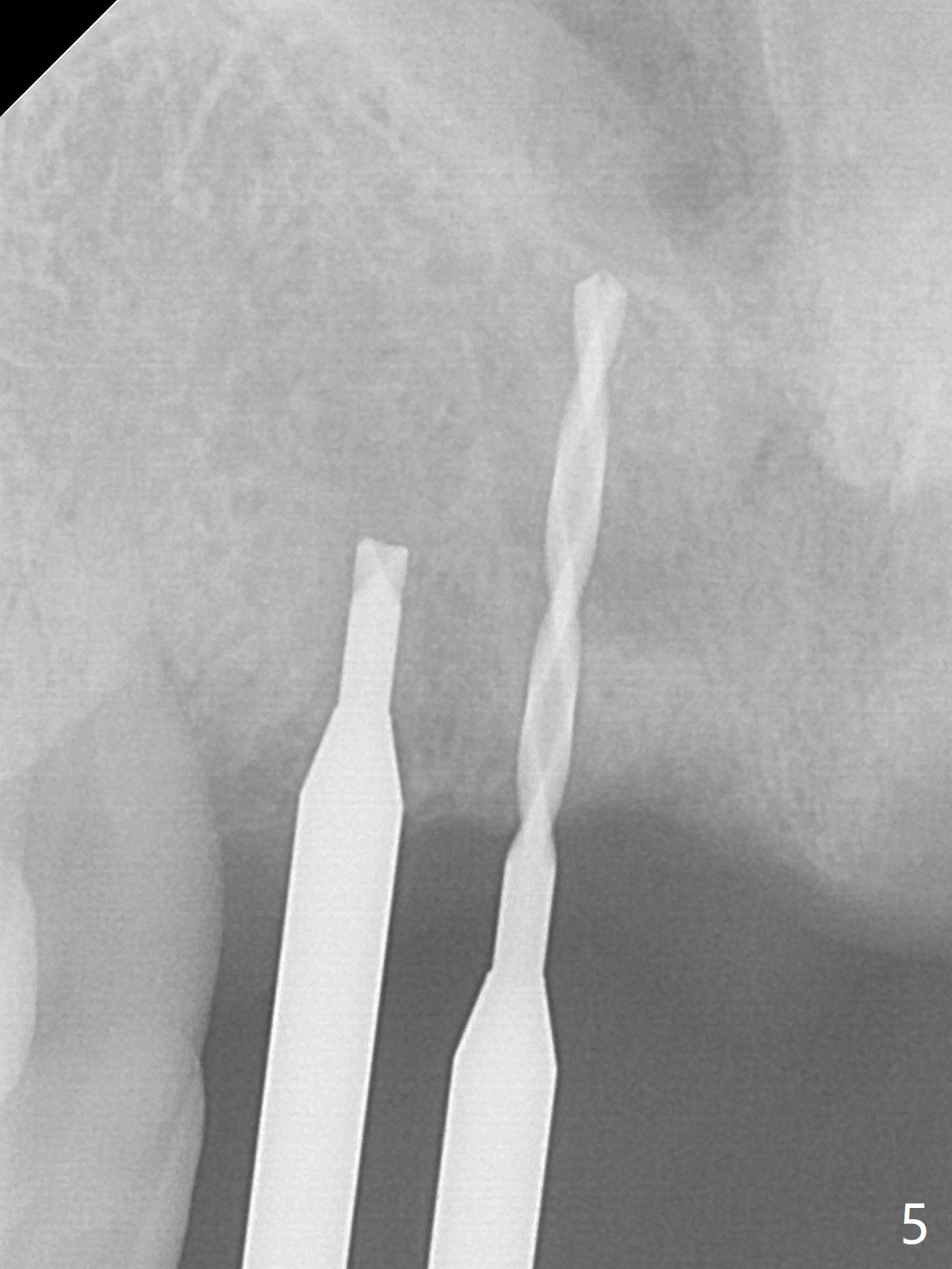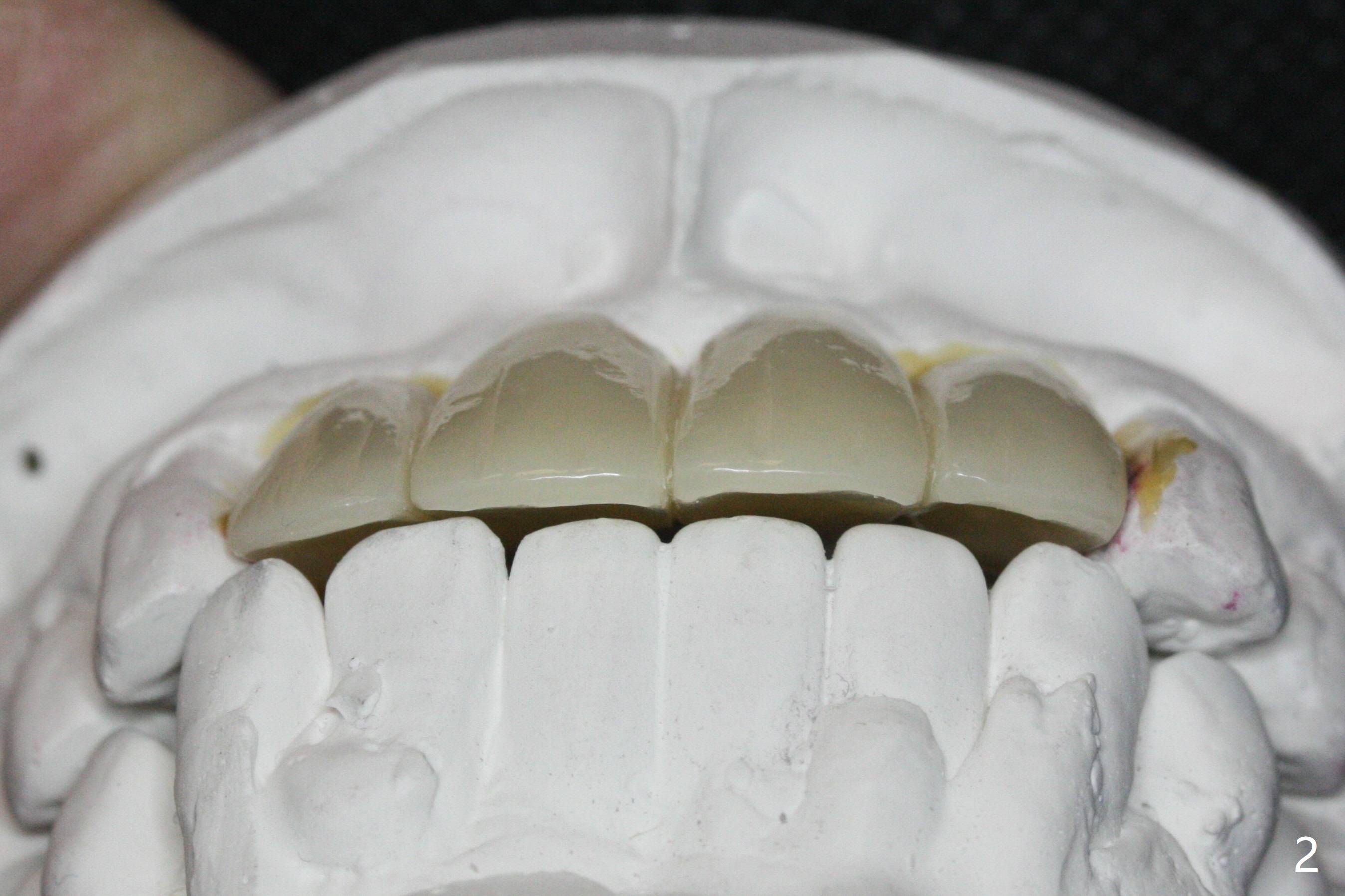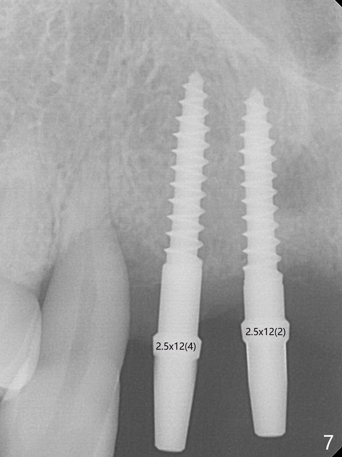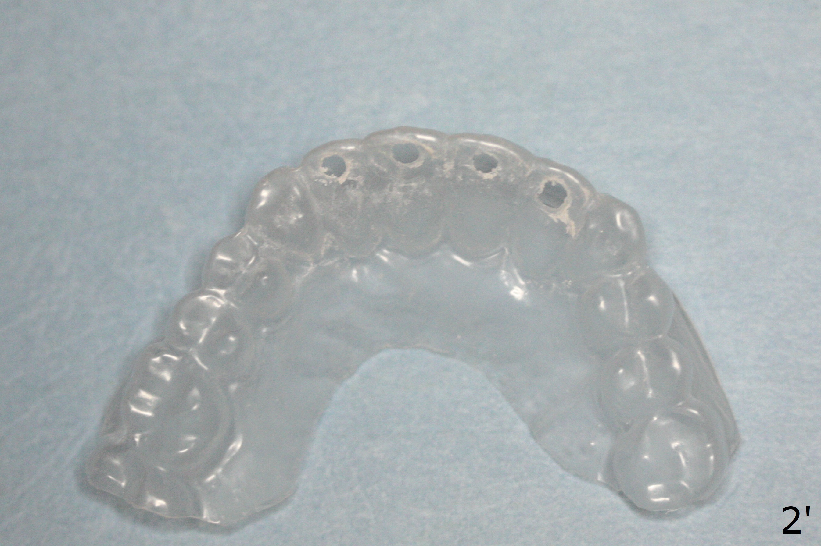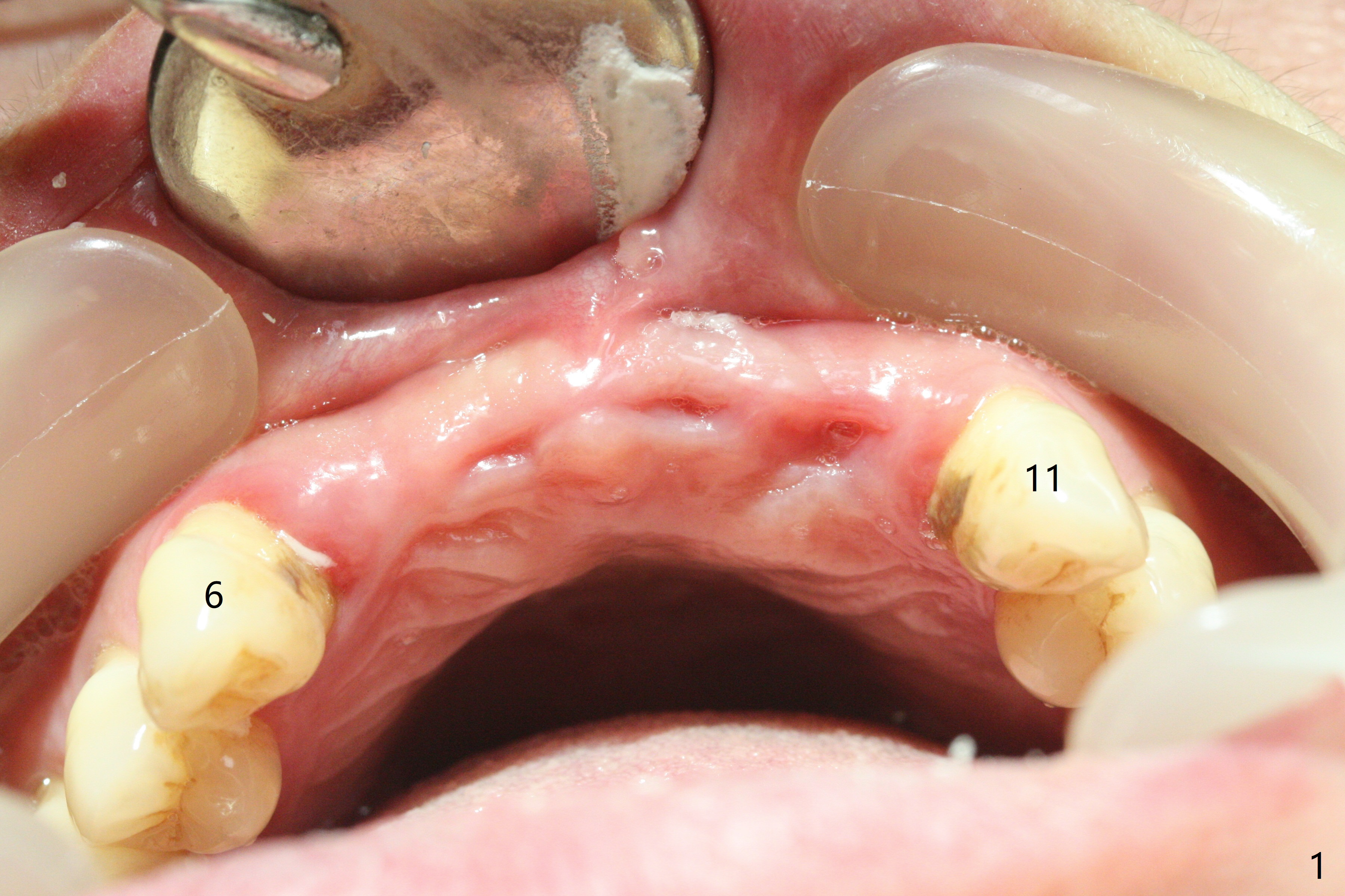 Although the ridge of the maxillary anterior ridge looks moderate in width (Fig.1), the bone is ~4 mm buccopalatally. Suction down surgical stent (Fig.2') made from the lab-fabricated provisional (Fig.2) will be used to check the position and trajectory of osteotomies. PAs taken after initial osteotomies (1.2 mm drill) show those at the central incisors tend to be mesial (close to the Incisive Canal *), while those at the lateral incisor sites distal (Fig.3,4). After adjustment, the position and trajectory of the osteotomies are acceptable (Fig.5,6). To reduce the chance of perforating the Incisive Canal (Fig.3,4 *), 2.5 mm 1-piece implants are inserted with >40 Ncm (Fig.7,8). After deep placement of the implants, Vanilla graft is placed at the crest (Fig.9,10 *). An immediate splinted provisional is fabricated from the suction down stent. The gingiva is healthy around the provisional (Fig.11) and the implants (Fig.12,13) 1 month postop. The provisional is adjusted monthly so that the interdental papillae can be elongated. No bone resorption is observed 6 months postop (Fig.14,15). Crowns are cemented 8 months postop (Fig.16-18). The keratinized gingiva appears to have formed the abutments 8 months postop immediately pre-cementation (Fig.19).