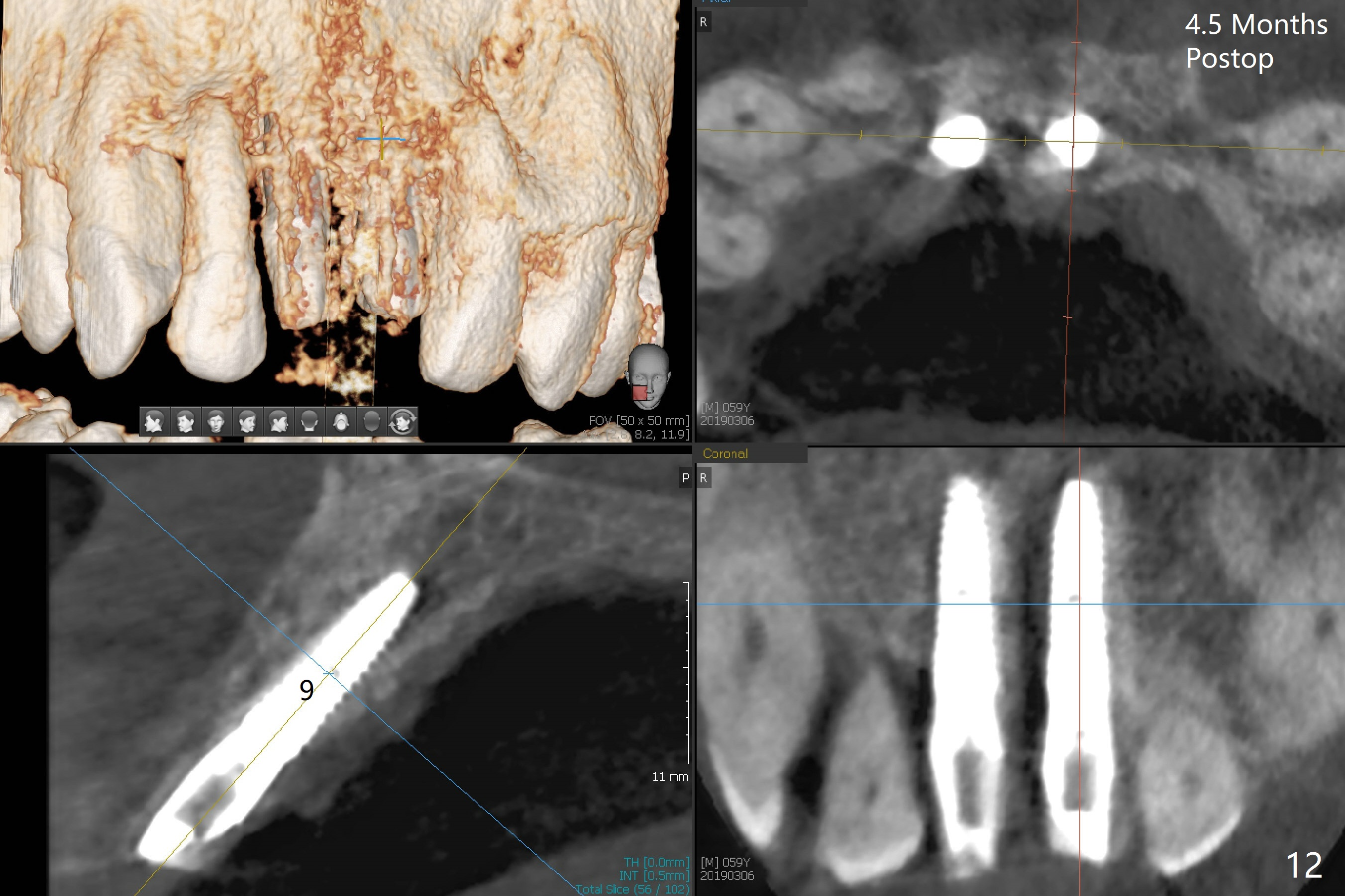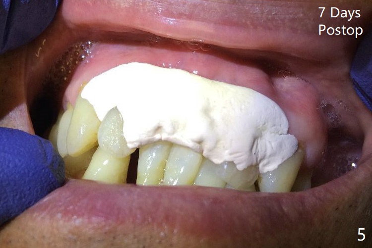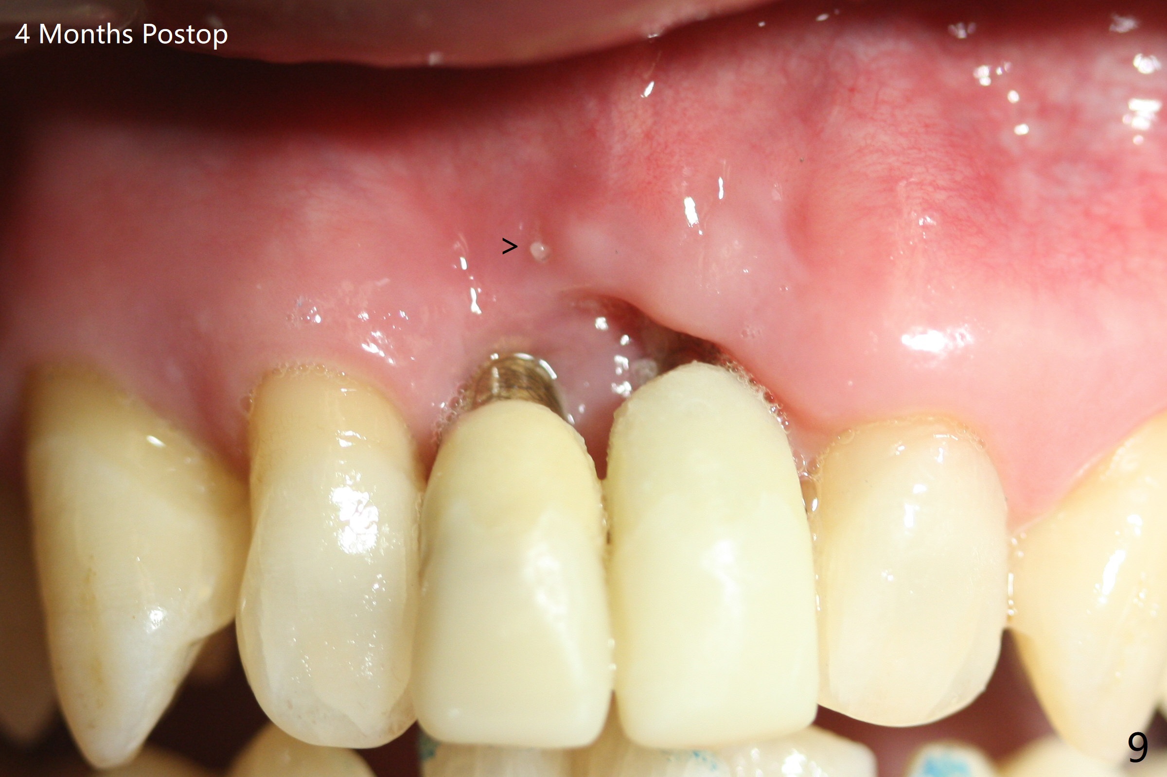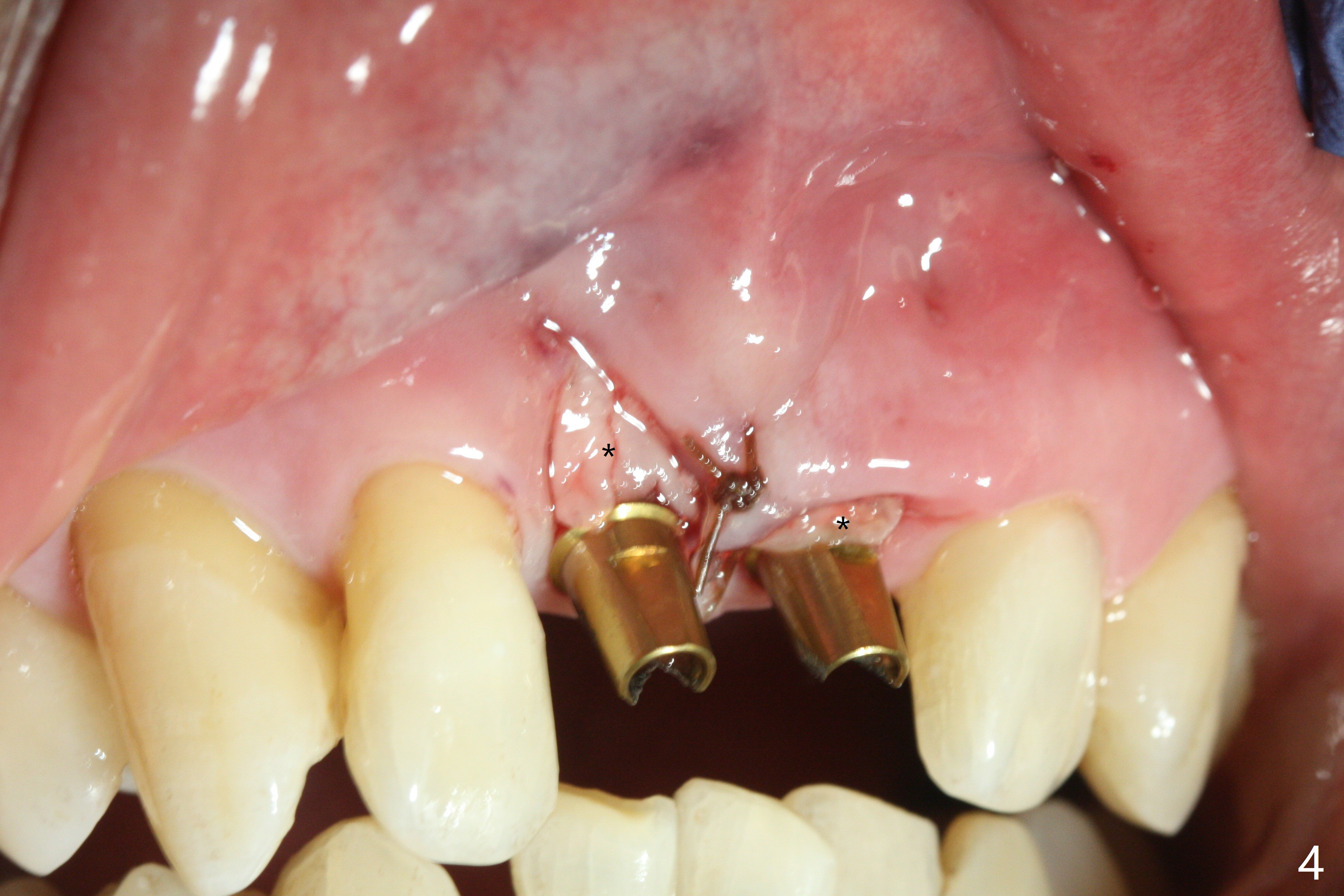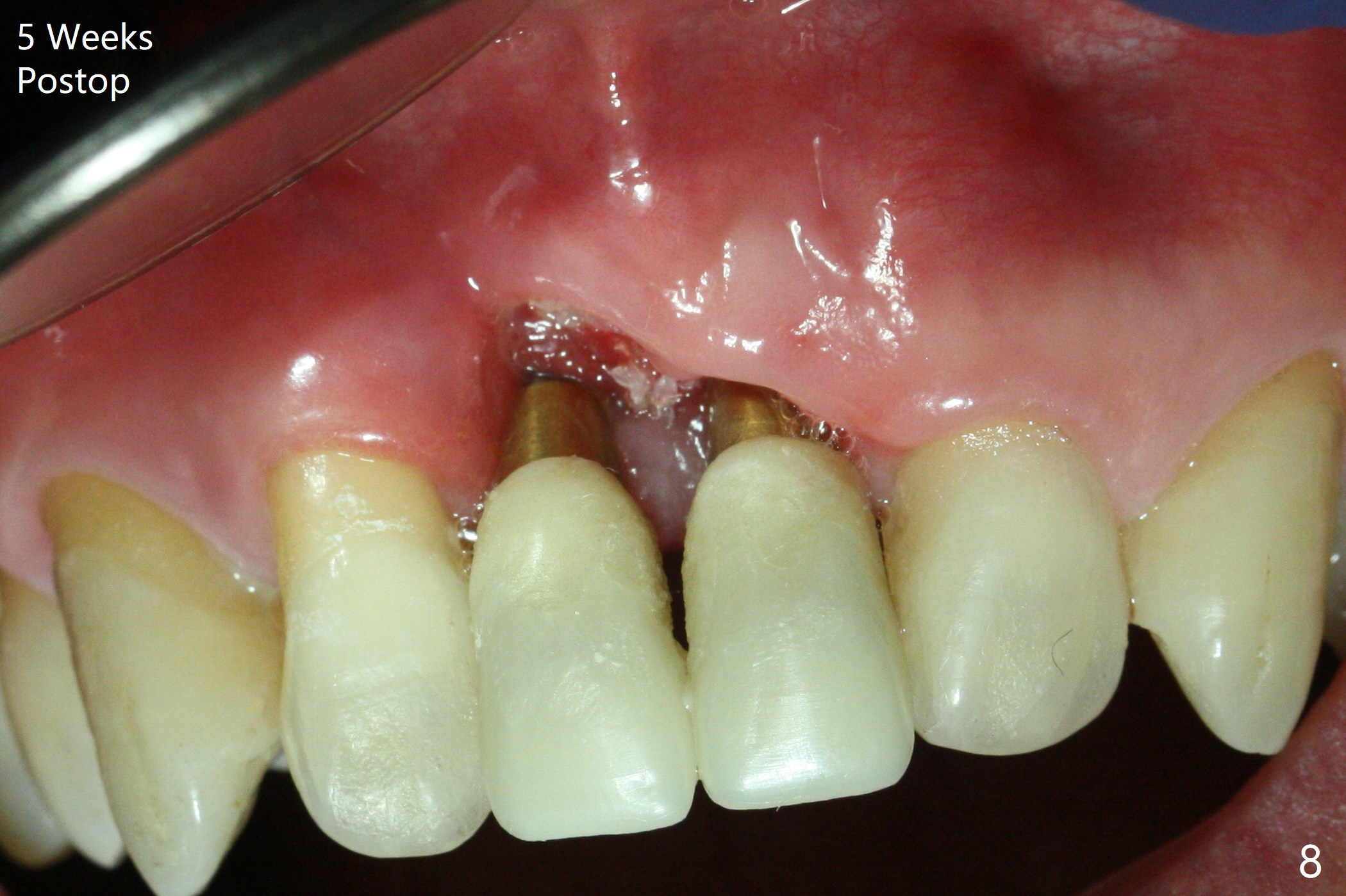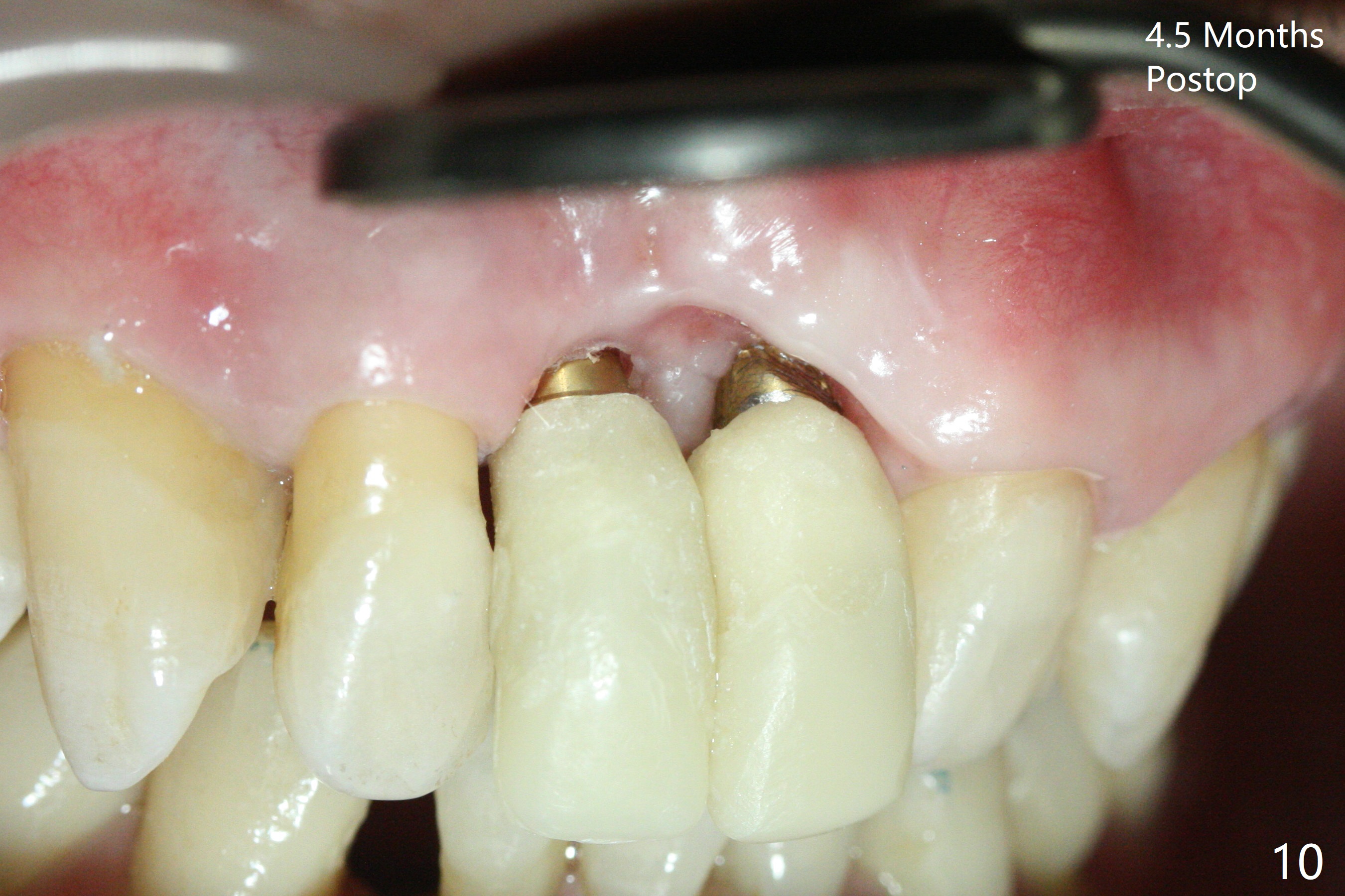 There is no buccal plate at #8 or 9 when the teeth are extracted as well as severe soft tissue defect at #8. Osteotomy is initiated as palatal as possible (Fig.1). When 3.5x13 mm implants are placed initially, the one at #8 is supracrestal (Fig.2 ^). To reduce the chance of peri-implantitis, the implant is placed deeper (Fig.3 (~2 mm implant threads exposed buccally)) with placement of sticky bone around the implants and 4.5x5.5(4) mm abutments (Fig.3 *). The buccal soft tissue defect #8 is repaired with a piece of PRF membrane (Fig.4 *), followed by periodontal dressing. Smaller 2-piece implants (3 mm, IBS) with smaller abutments (4 mm) may further reduce chance of periimplantitis and easy buccopalatal reduction of the abutments for restoration. The periodontal dressing remains stable 7 days postop (Fig.5) because it wraps around the abutments (Fig.6 A). By the time the periodontal dressing gets loose, #8 buccal soft tissue defect should be healing. When breaking-down periodontal dressing is removed 17 days postop, the coronal abutments and bone graft are exposed; after fabrication of provisional crowns (Fig.7), periodontal dressing is re-applied buccally. When the second dressing dislodges 5 weeks postop, the buccal soft tissue appears to reduce (Fig.8). Raising flaps may be less traumatic. A piece of bone graft is being extruded 4 months postop (Fig.9 >). After the abutments change from 4.5x5.5(4) to 4.5x7(3) mm, new temporary crowns are fabricated (Fig.10 (4.5 months postop)). CT shows apparent buccal bone at #8 and 9 (Fig.11,12). How to improve cosmetic?