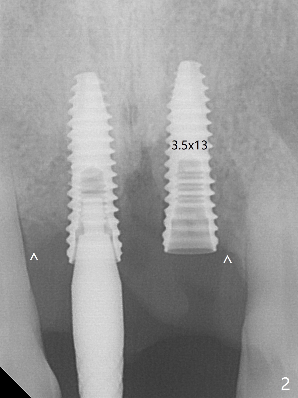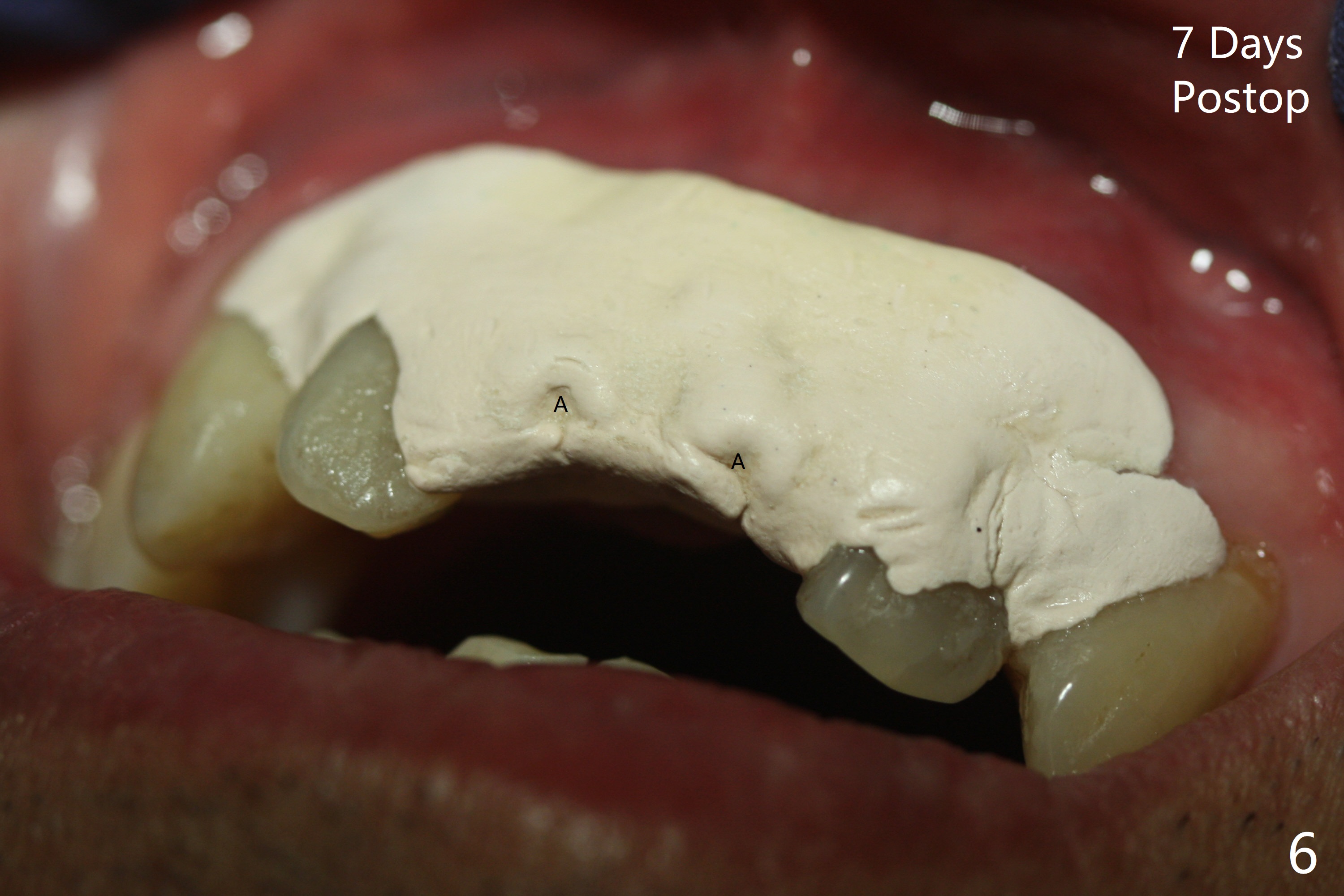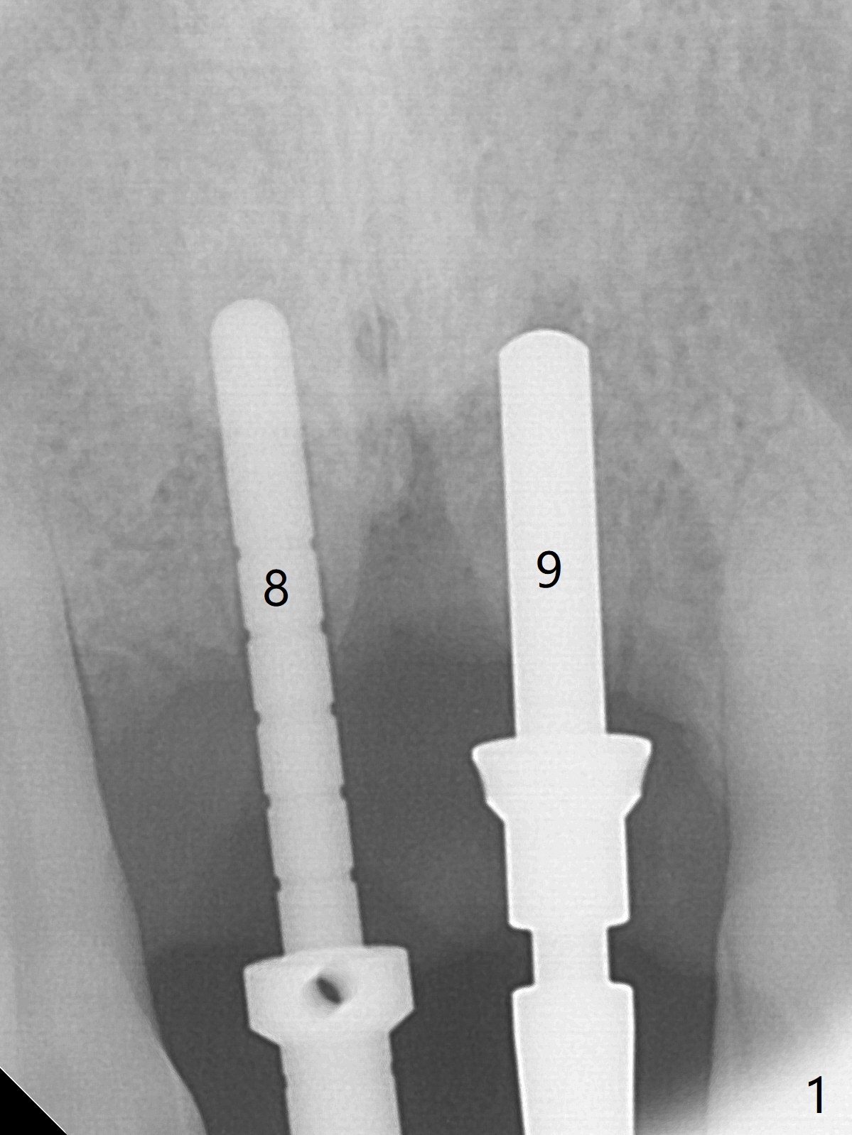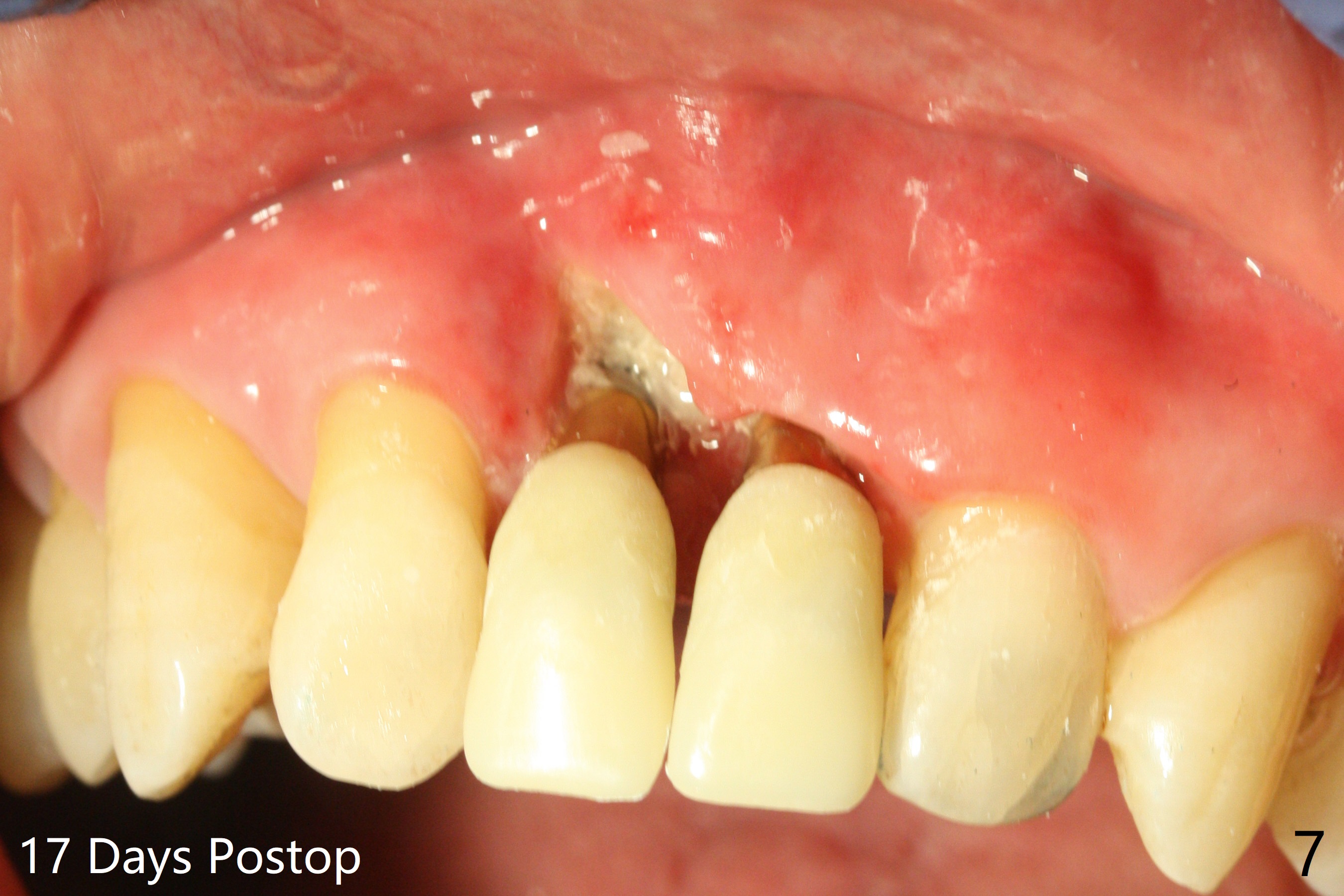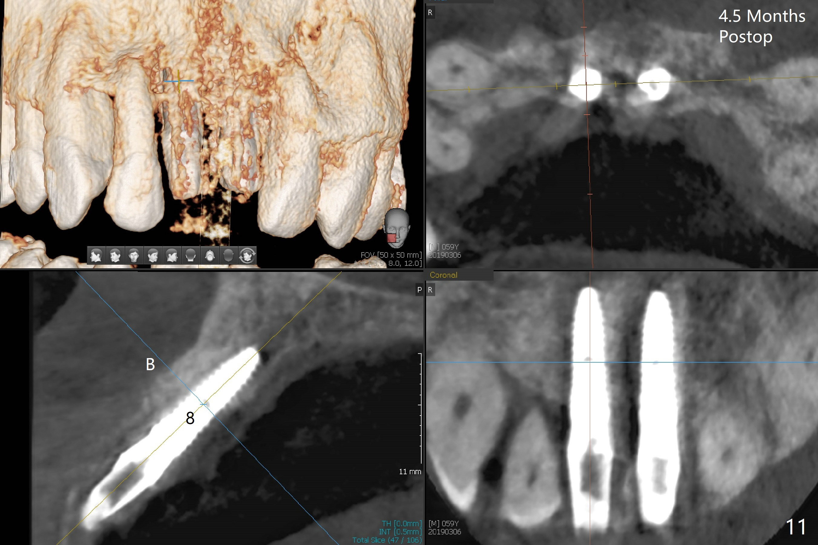 There is no buccal plate at #8 or 9 when the teeth are extracted as well as severe soft tissue defect at #8. Osteotomy is initiated as palatal as possible (Fig.1). When 3.5x13 mm implants are placed initially, the one at #8 is supracrestal (Fig.2 ^). To reduce the chance of peri-implantitis, the implant is placed deeper (Fig.3 (~2 mm implant threads exposed buccally)) with placement of sticky bone around the implants and 4.5x5.5(4) mm abutments (Fig.3 *). The buccal soft tissue defect #8 is repaired with a piece of PRF membrane (Fig.4 *), followed by periodontal dressing. Smaller 2-piece implants (3 mm, IBS) with smaller abutments (4 mm) may further reduce chance of periimplantitis and easy buccopalatal reduction of the abutments for restoration. The periodontal dressing remains stable 7 days postop (Fig.5) because it wraps around the abutments (Fig.6 A). By the time the periodontal dressing gets loose, #8 buccal soft tissue defect should be healing. When breaking-down periodontal dressing is removed 17 days postop, the coronal abutments and bone graft are exposed; after fabrication of provisional crowns (Fig.7), periodontal dressing is re-applied buccally. When the second dressing dislodges 5 weeks postop, the buccal soft tissue appears to reduce (Fig.8). Raising flaps may be less traumatic. A piece of bone graft is being extruded 4 months postop (Fig.9 >). After the abutments change from 4.5x5.5(4) to 4.5x7(3) mm, new temporary crowns are fabricated (Fig.10 (4.5 months postop)). CT shows apparent buccal bone at #8 and 9 (Fig.11,12). How to improve cosmetic?