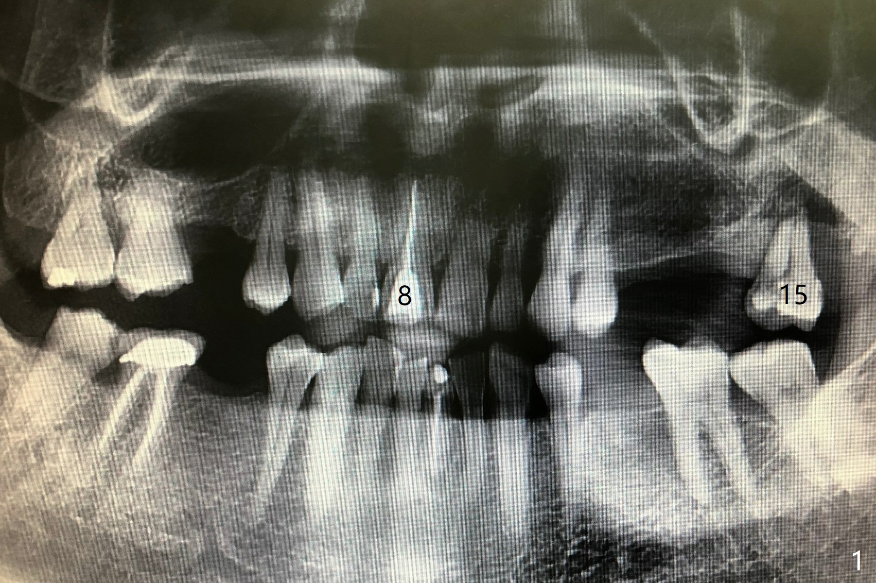 A 55-year-old man have several missing teeth with #8 crown subgingival fracture and #15 mobility (Fig.1,2). It suggests heavy occlusion. A long implant is expected. If osteotomy remains palatal, place an IBS implant (3.5 or 4.0x13 mm). Also prepare UF for cosmetics and longer implant. The bone at #15 should be low, a good indication for IBS implant at the later stage.