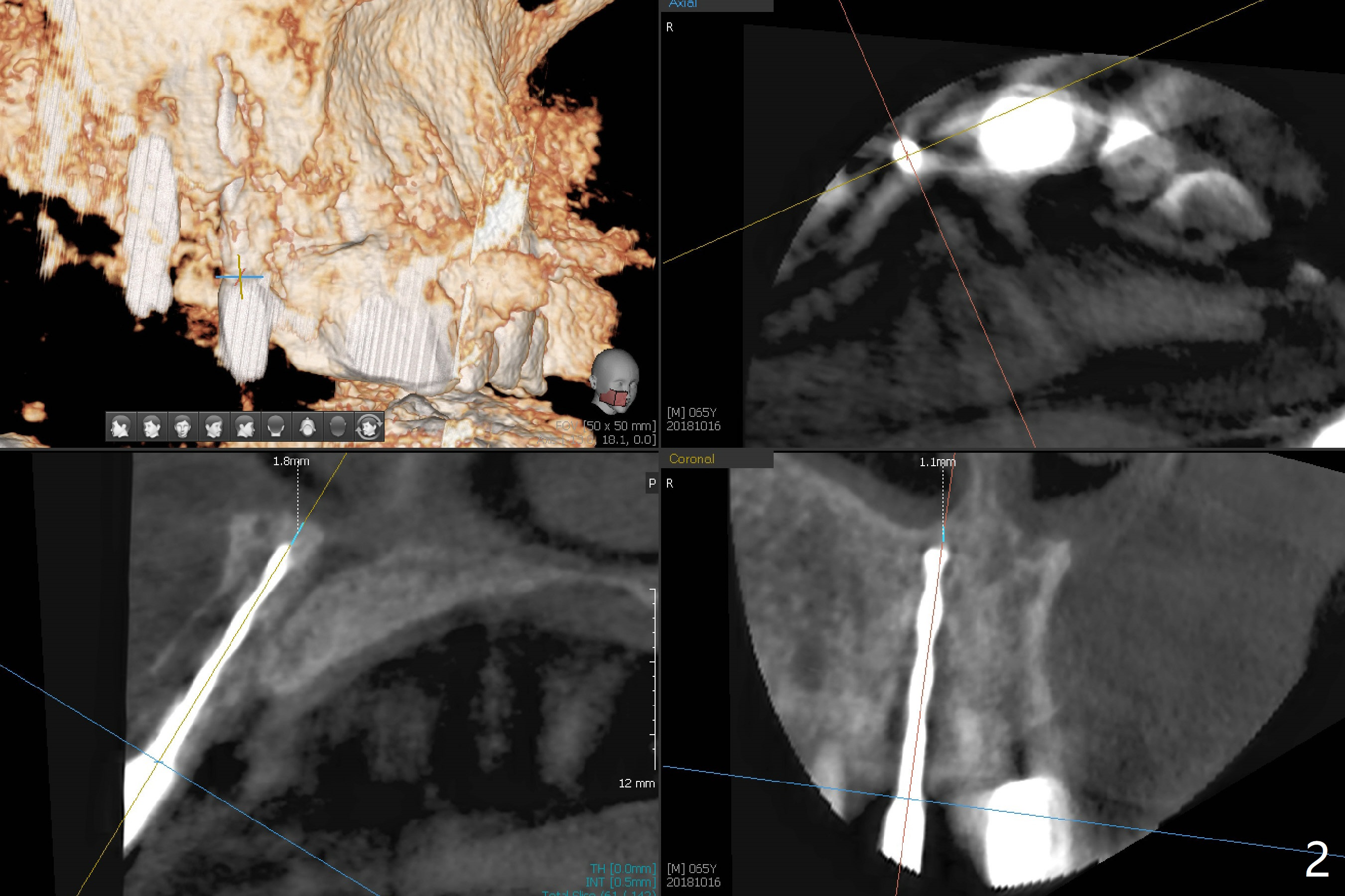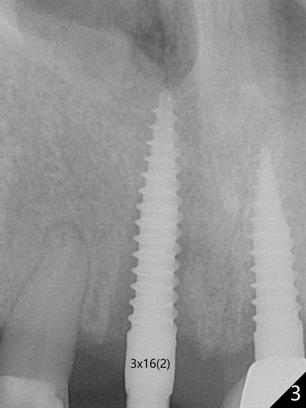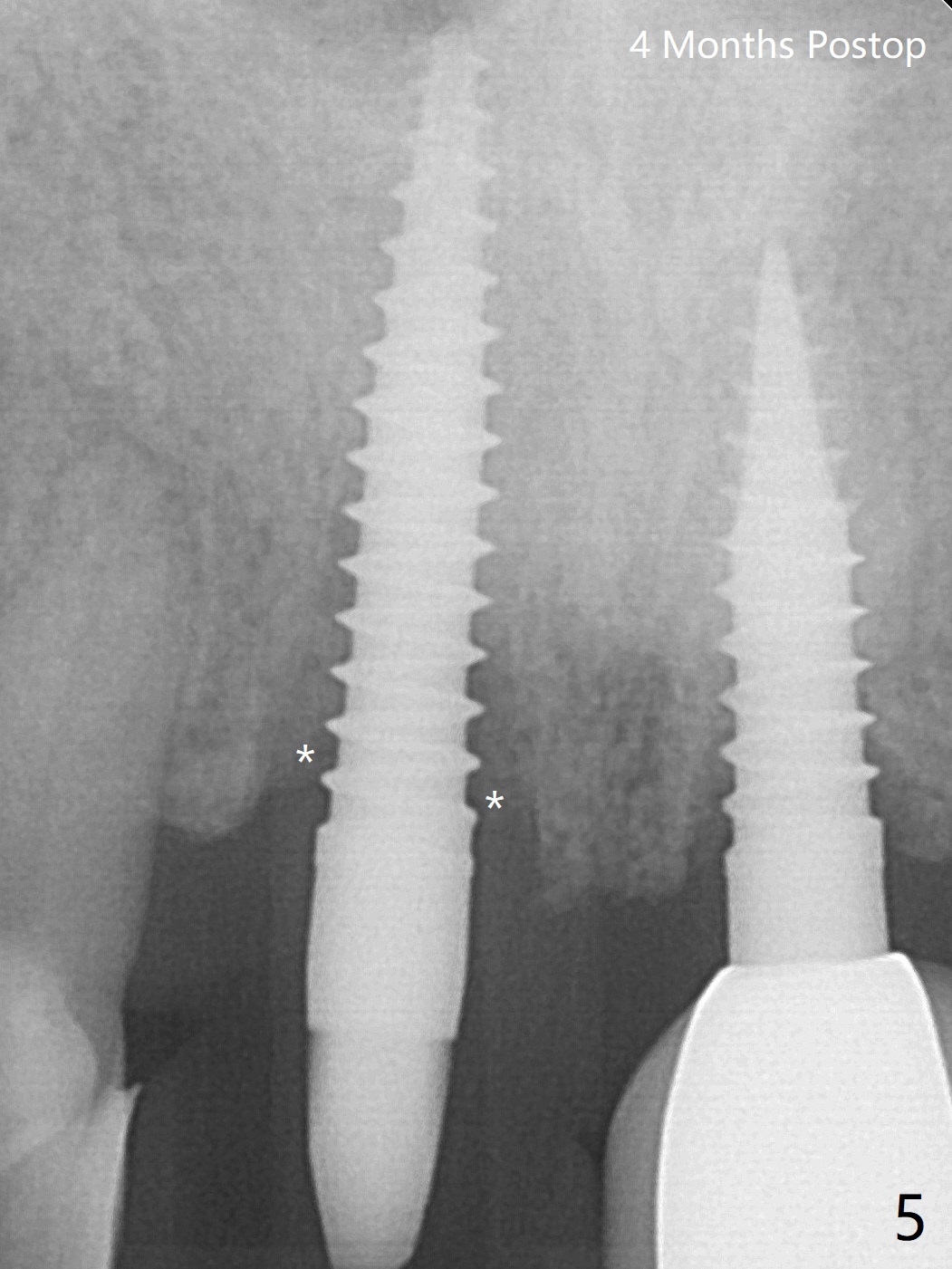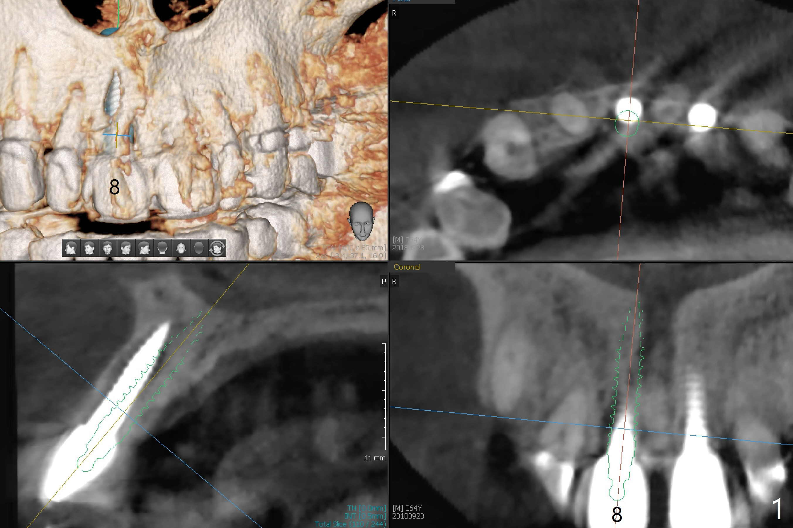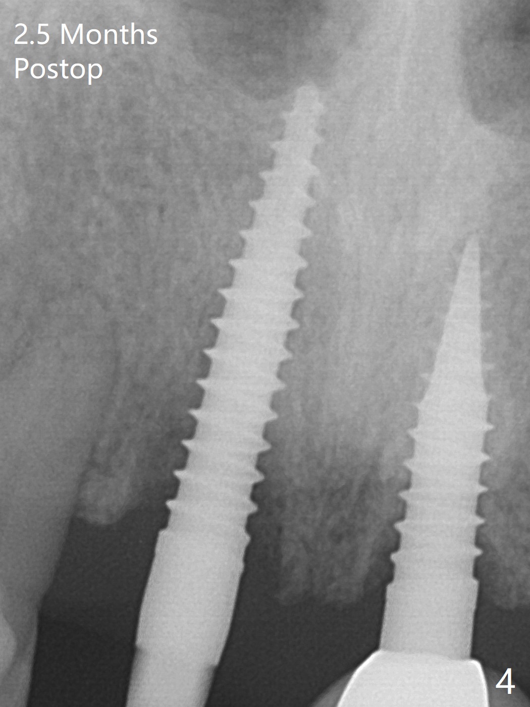 Reanalysis of preop CBCT shows a longer implant (3x16mm, green) to be placed palatal should be able to solve buccal plate bone loss associated with the previous 3x14 mm one at #8 (Fig.1). After crown/implant removal (with ease), a new palatal osteotomy is initiated flapless with 1.2 mm drill for 16 mm (palatal gingival margin, Fig.2). Following 1.5 mm drill for ~ 17 mm, a 3x16(2) mm 1-piece implant is placed >40 Ncm (Fig.3). After bone graft through limited access and abutment preparation, an immediate provisional is fabricated with clearance. The provisional dislodges repeatedly, mainly due to palatal perforation. It gets lost while the patient travels to his home country. Although there seems to be bone loss around the implant 2.5 months postop (Fig.4), the gingiva looks healthy. A new provisional is fabricated without impression. Because of short vertical height and small abutment diameter as well as bruxism, the provisional easily dislodges. The patient will return for impression 4 months 10 days postop. The bone loss remains 4 months postop when impression is taken (Fig.5).