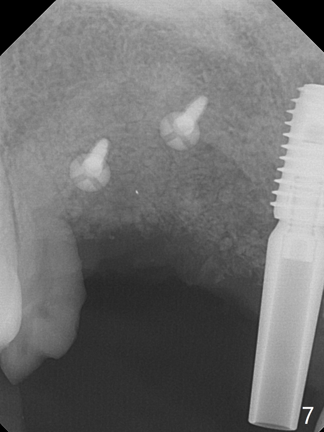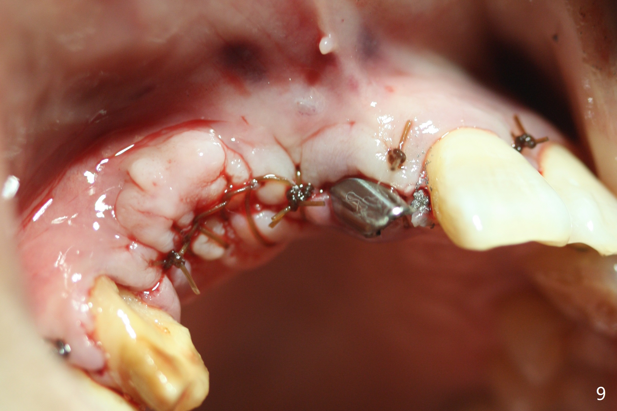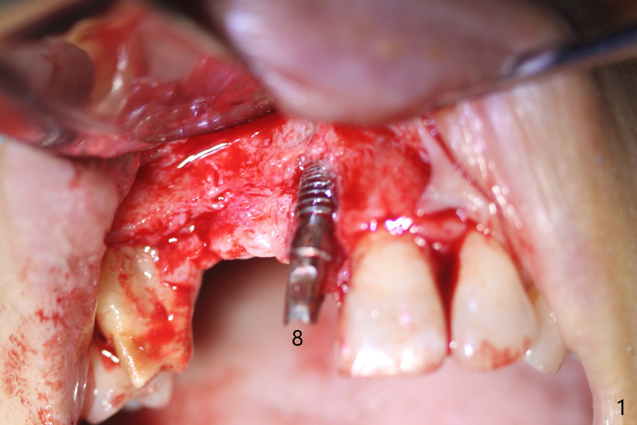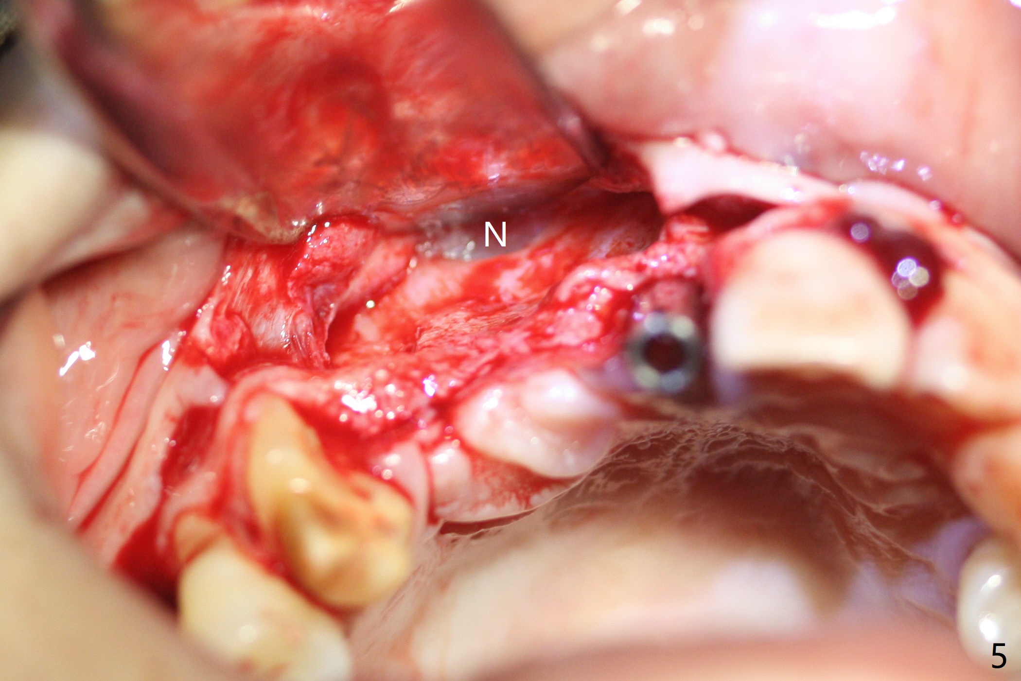 Eleven months post immediate implantation, the implant at #8 (4.5x16 mm, better smaller) is found to have thread exposure buccally (Fig.1) and distally (Fig.2). Immediately post implant removal, a 5x10 mm one is placed equi- or subcrestally distobuccally (Fig.3,4 (to prevent periimplantitis)). It is turned 4 more times later to make sure slightly supracrestally palatally, since the palatal crest is the lowest. After placement of sticky bone palatally, a 4.5(2) mm mill abutment is placed (17 mm long, Fig.5,6). The buccal flap is raised until the anterior nasal (Fig.5 N) foramen. After severing the periosteum and placement of 2 of 8 mm tenting screws (Fig.7), sticky bone (Vanilla allograft/Osteogen; block graft denies) is applied at #6 and 7 sites (Fig.8). Following palatal flap separation, the wound is closed in an apparent tension free manner (Fig.9). Periodontal dressing is applied. After wound healing, lab-fabricated provisional is delivered.