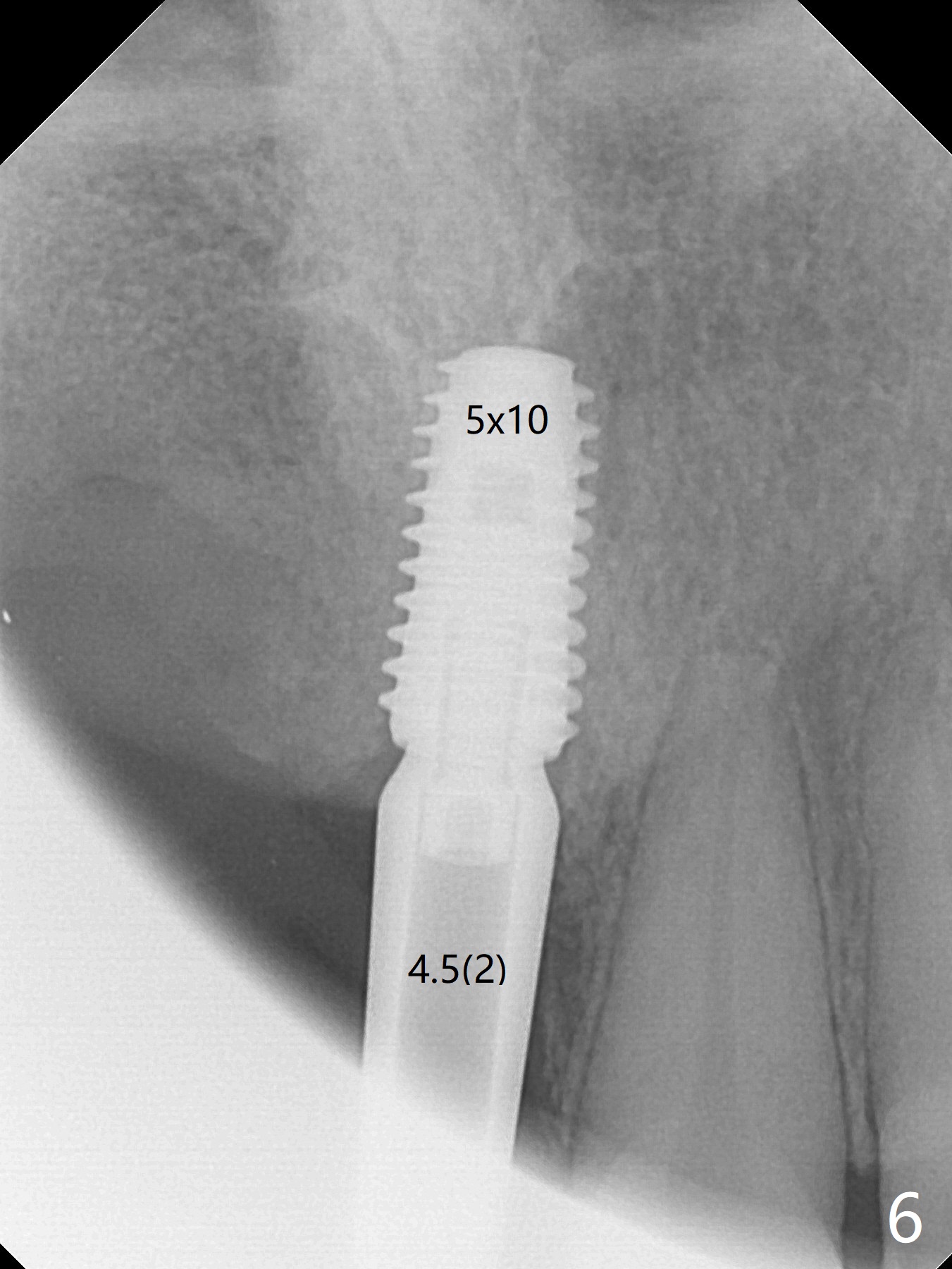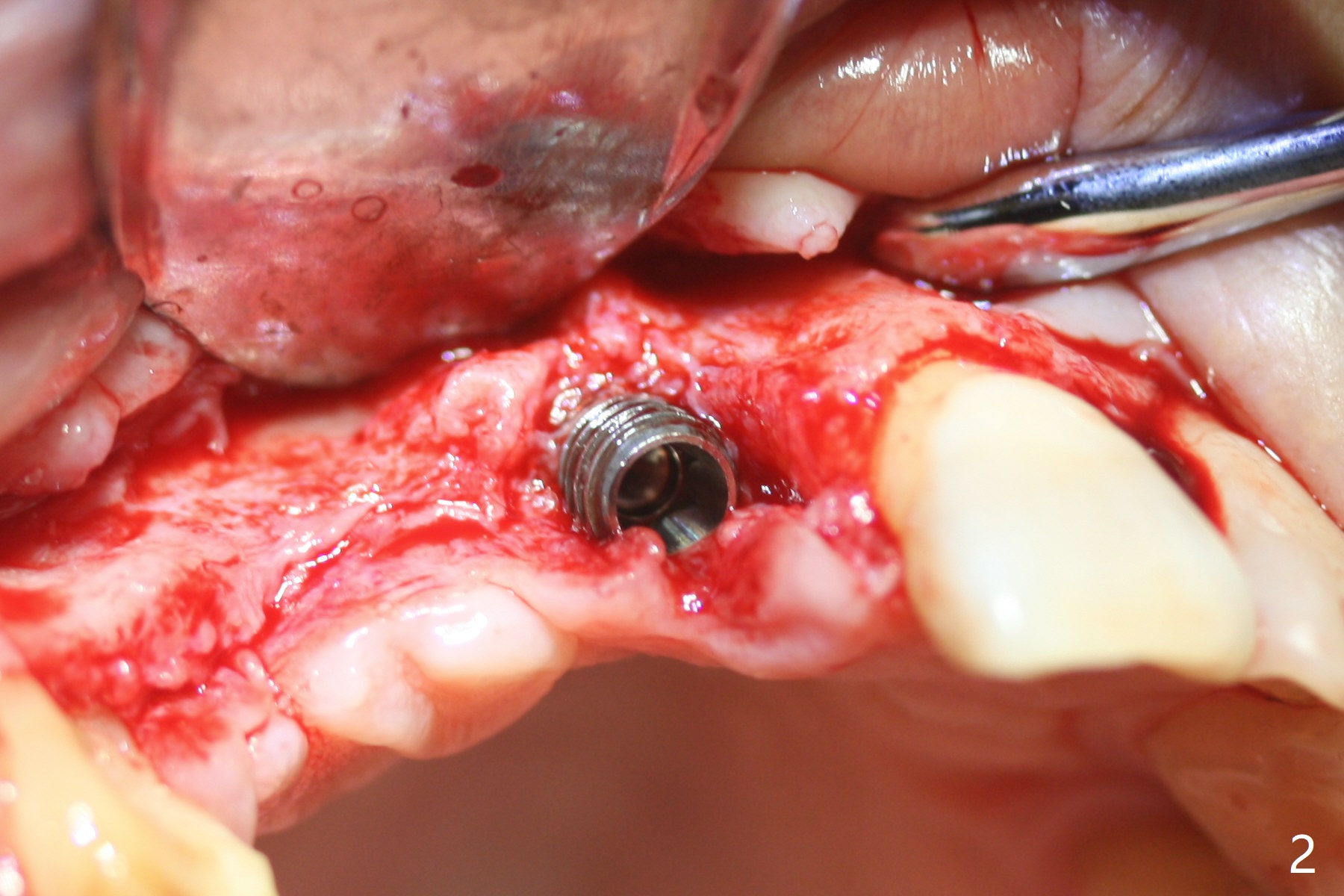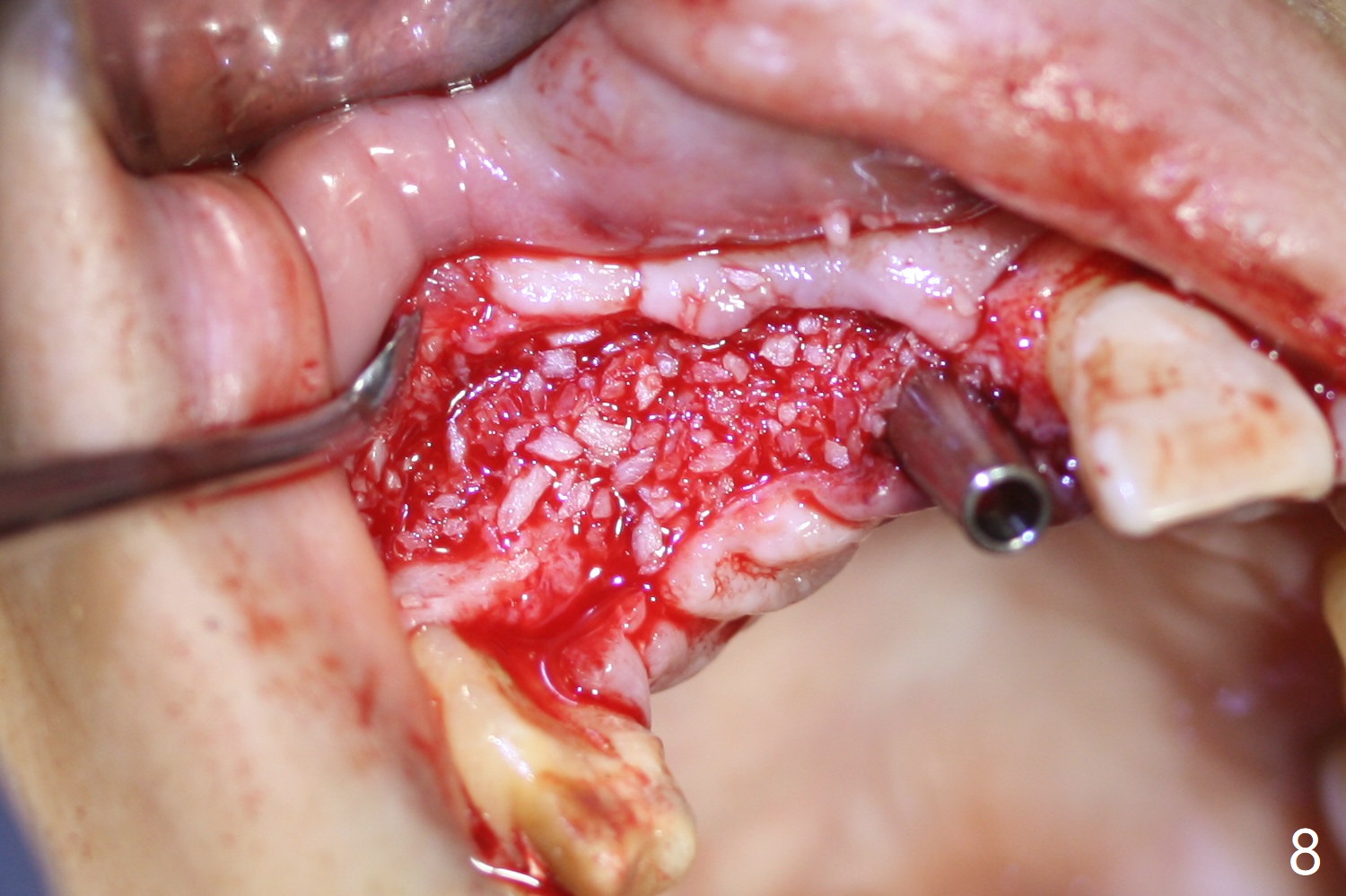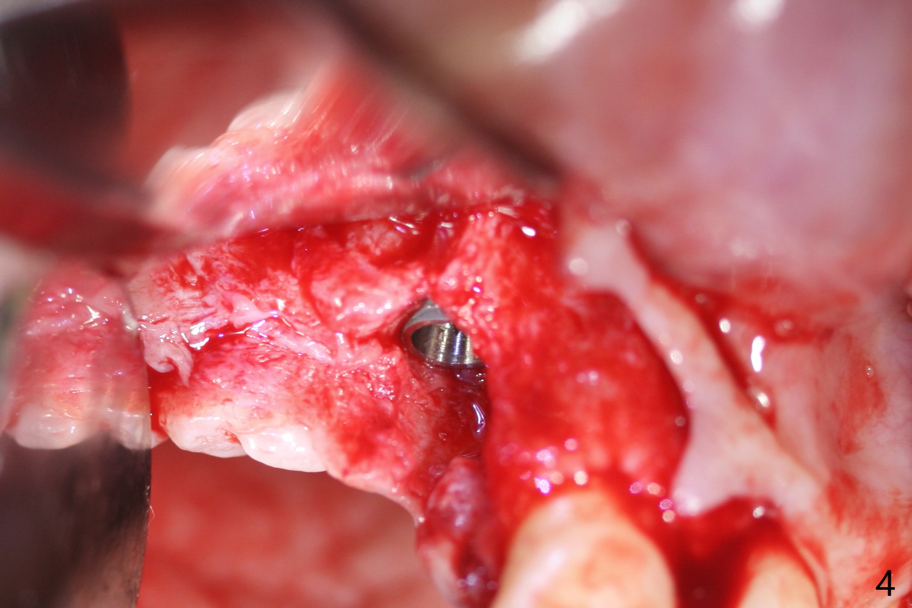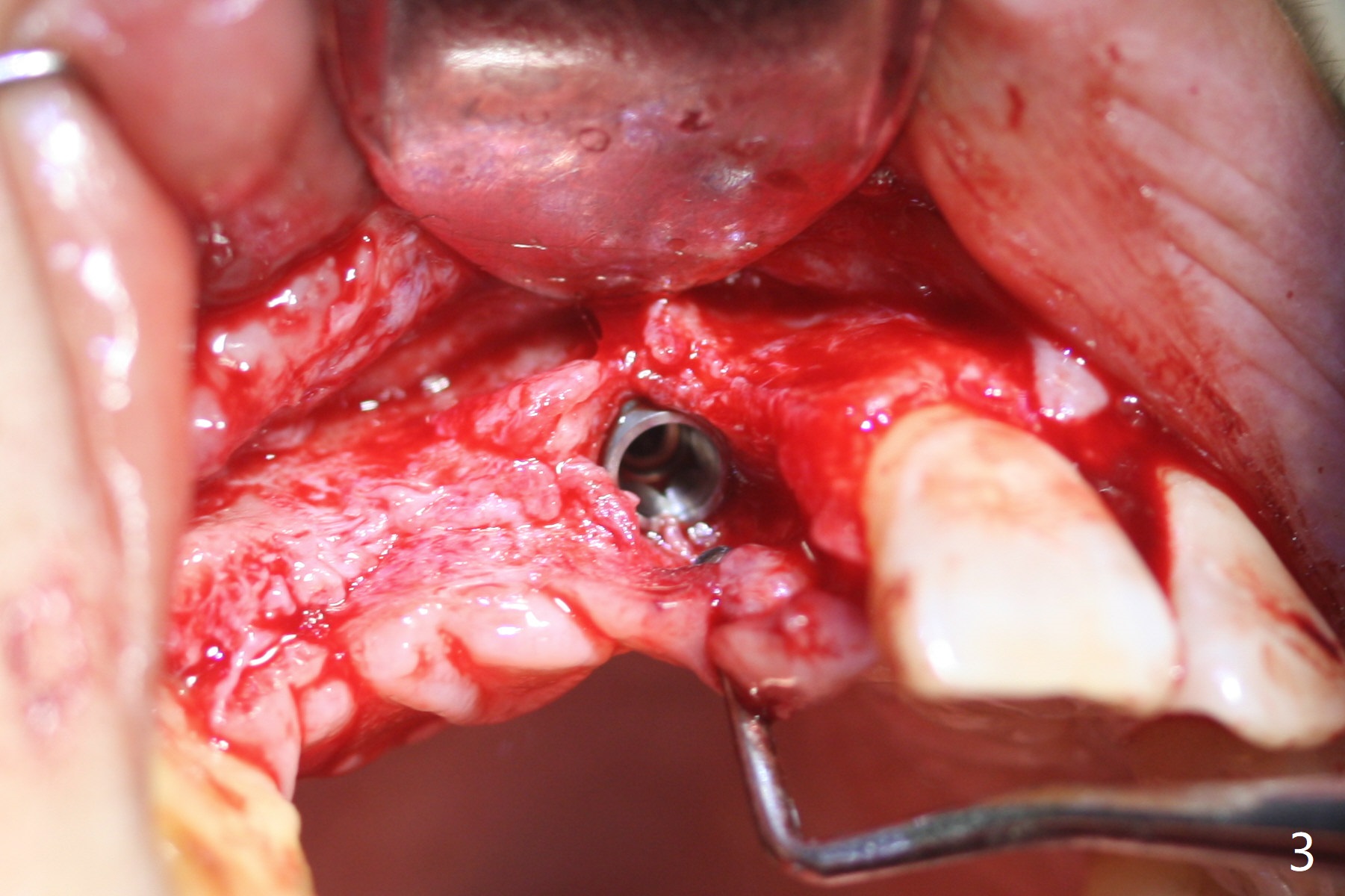 Eleven months post immediate implantation, the implant at #8 (4.5x16 mm, better smaller) is found to have thread exposure buccally (Fig.1) and distally (Fig.2). Immediately post implant removal, a 5x10 mm one is placed equi- or subcrestally distobuccally (Fig.3,4 (to prevent periimplantitis)). It is turned 4 more times later to make sure slightly supracrestally palatally, since the palatal crest is the lowest. After placement of sticky bone palatally, a 4.5(2) mm mill abutment is placed (17 mm long, Fig.5,6). The buccal flap is raised until the anterior nasal (Fig.5 N) foramen. After severing the periosteum and placement of 2 of 8 mm tenting screws (Fig.7), sticky bone (Vanilla allograft/Osteogen; block graft denies) is applied at #6 and 7 sites (Fig.8). Following palatal flap separation, the wound is closed in an apparent tension free manner (Fig.9). Periodontal dressing is applied. After wound healing, lab-fabricated provisional is delivered.
