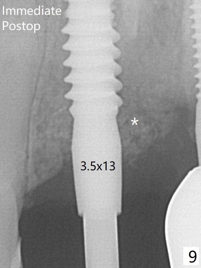 Allograft placed around the implant (Fig.9 *) appears to be able to prevent implant thread exposure 4 months postop (Fig.12).