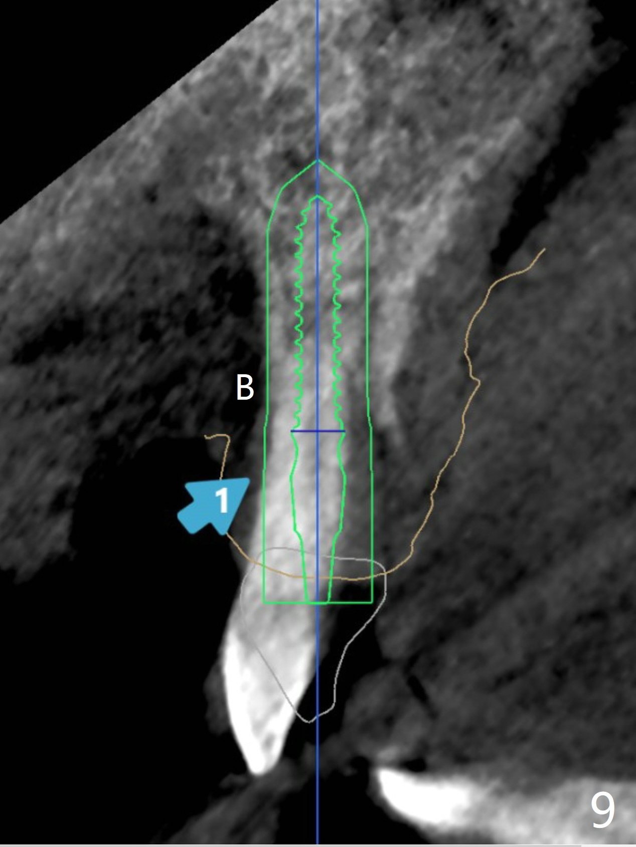 植体不侵犯颊侧骨壁(导板,细植体何等重要),患牙(颊侧移位)不再挤压牙龈,牙龈会长长(恢复正常长度),可能在貌似牙龈退缩大多数情况下,不必植龈,即种就可以了。基台面向切缘,可以长些,临时和永久牙冠不容易脱落。