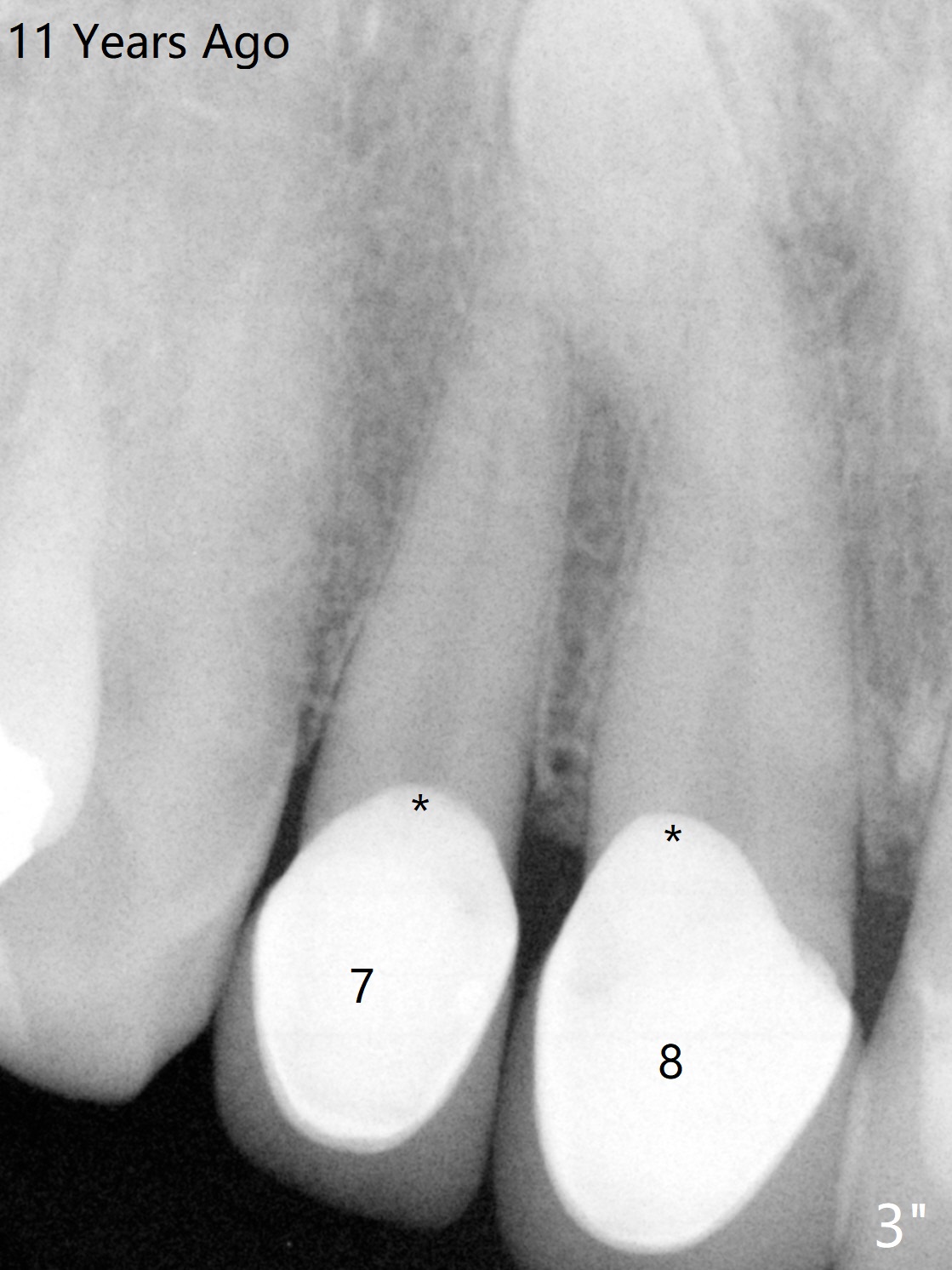 A 58-year-old man fractures the tooth #9 equigingival and fiber post (Fig.3 *, as compared to Fig.3" and 3'). * in Fig.3" overextended buccal margin of the crowns, as related to gingival inflammation. > in Fig.3': lack of ferrule effect.