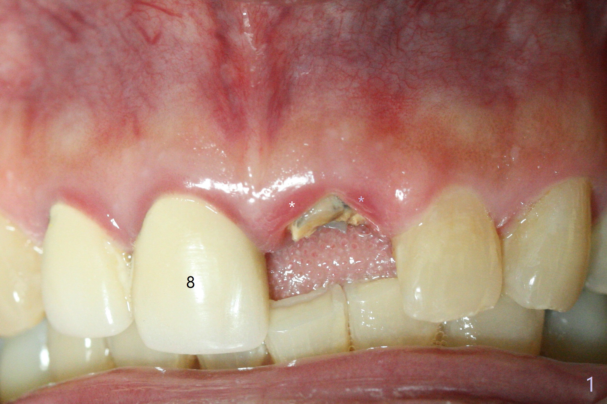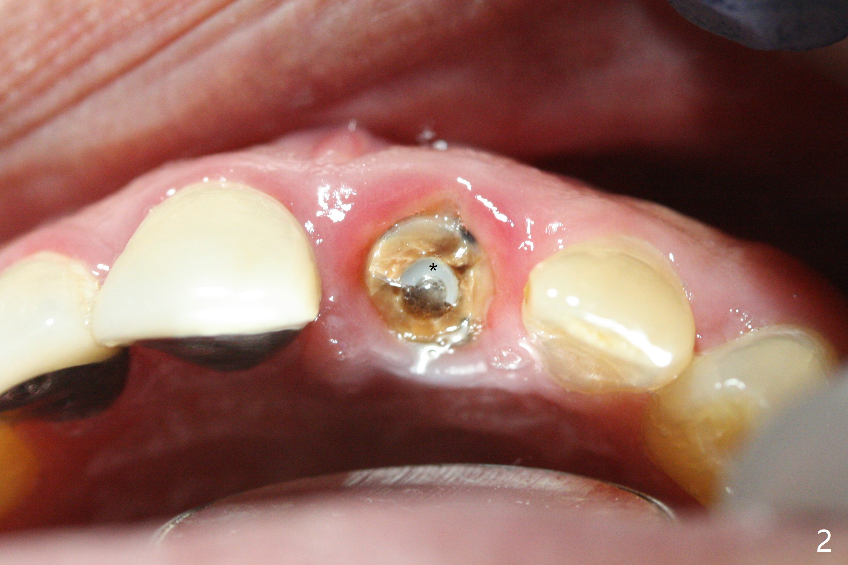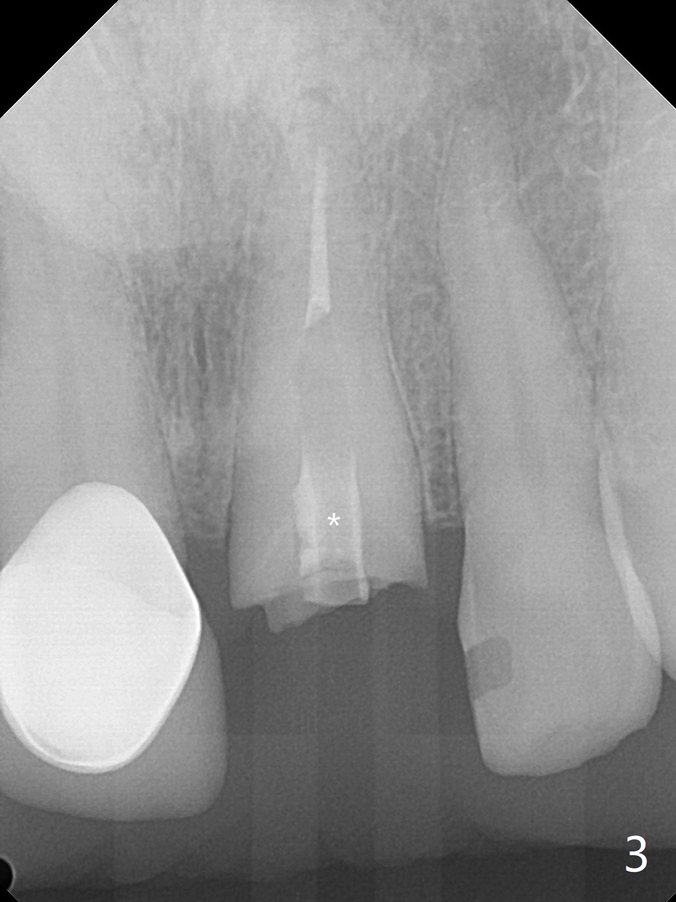 A 58-year-old man fractures the tooth #9 equigingival (Fig.1) and fiber post (Fig.2,3 *). The marginal gingiva is erythematous and edematous (Fig.1 *), suggesting biologic width violation. Redo crown would aggravate the issue. In addition, the mesiobuccal root of the tooth #14 has vertical fracture (Fig.4,5), evidence of heavy mastication. In fact the tooth #13 was also fractured apparently due to heavy occlusion before extraction. It is the best to extract the tooth #9 for implant (Fig.6), or tissue-level (3.5x14 or 17 mm).