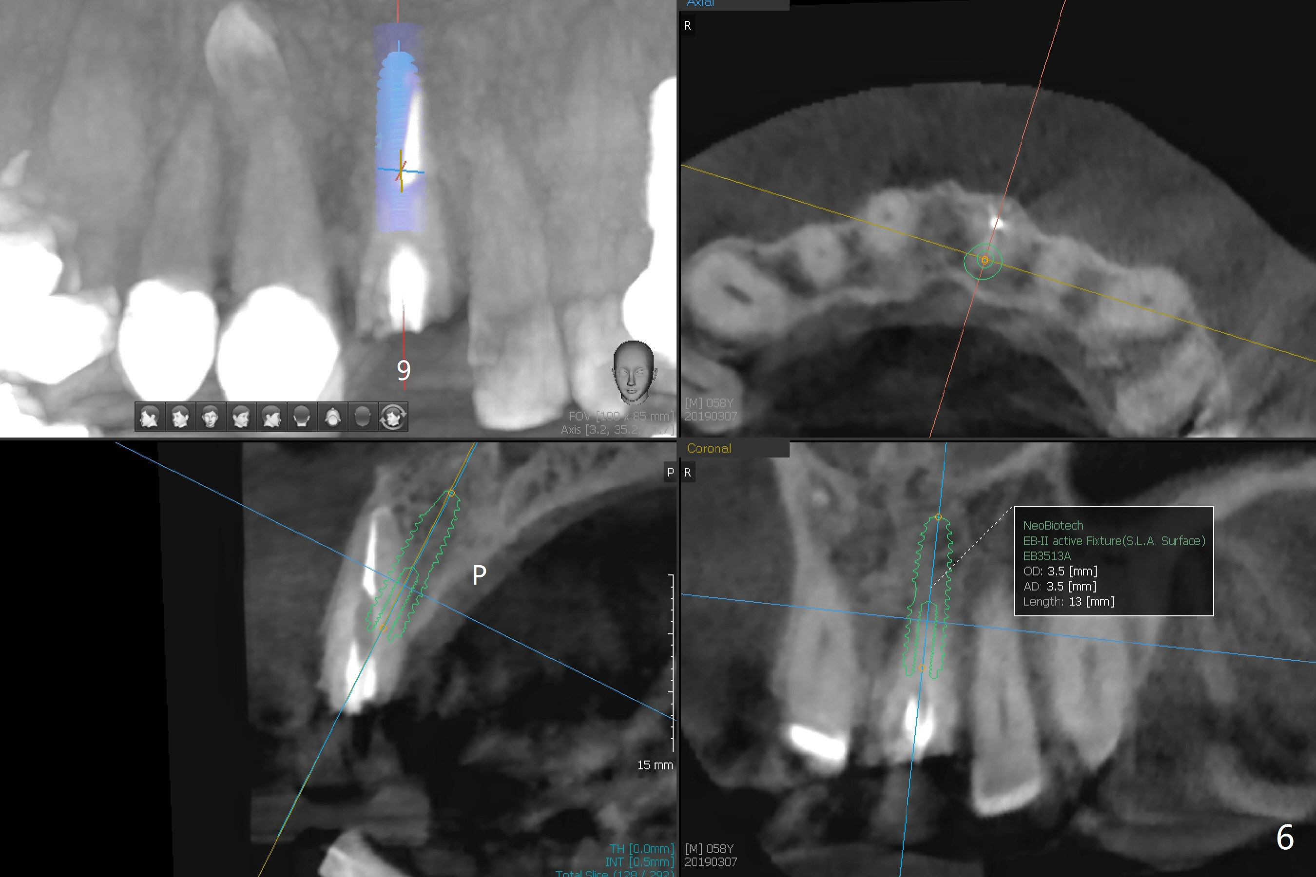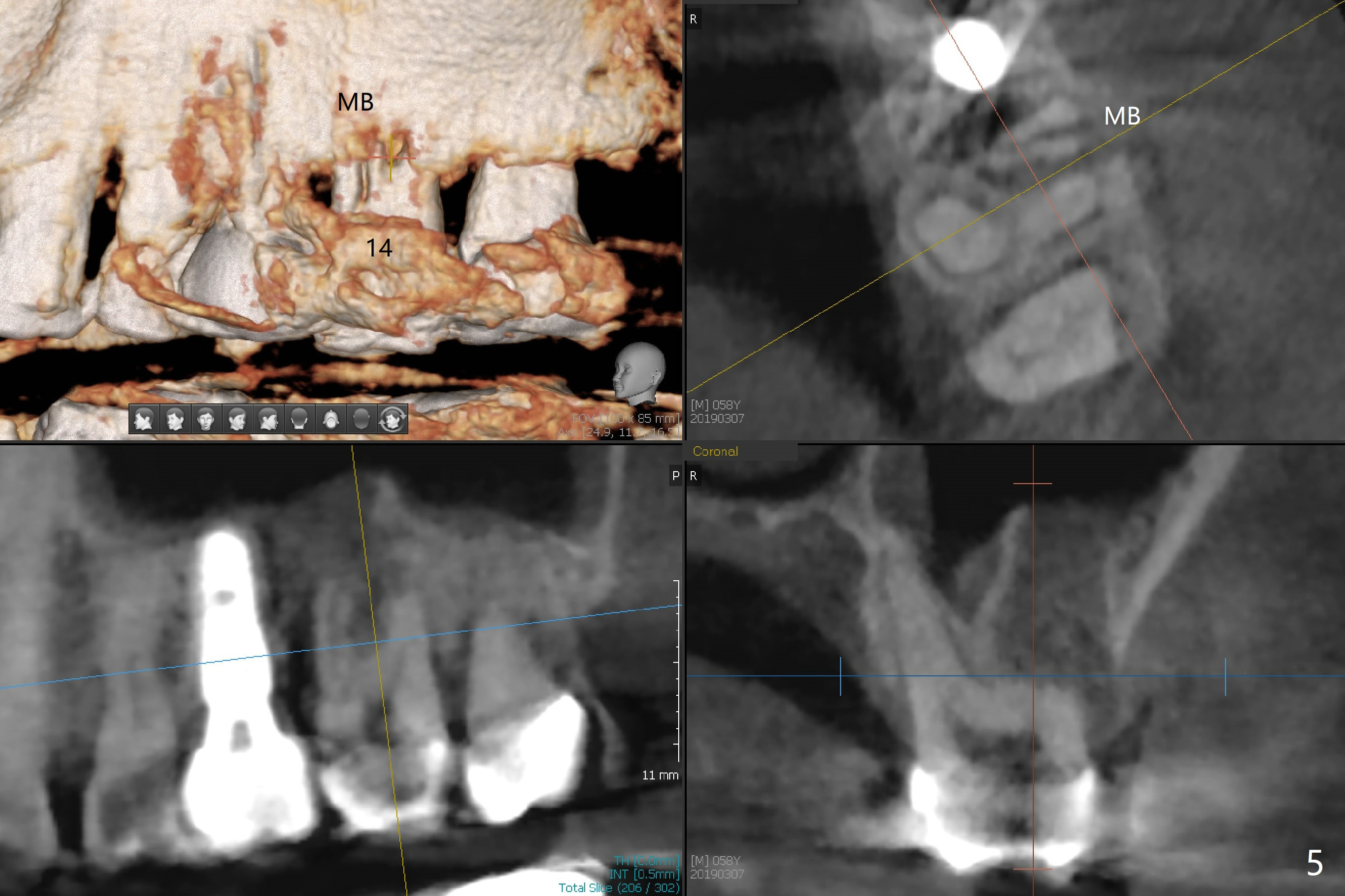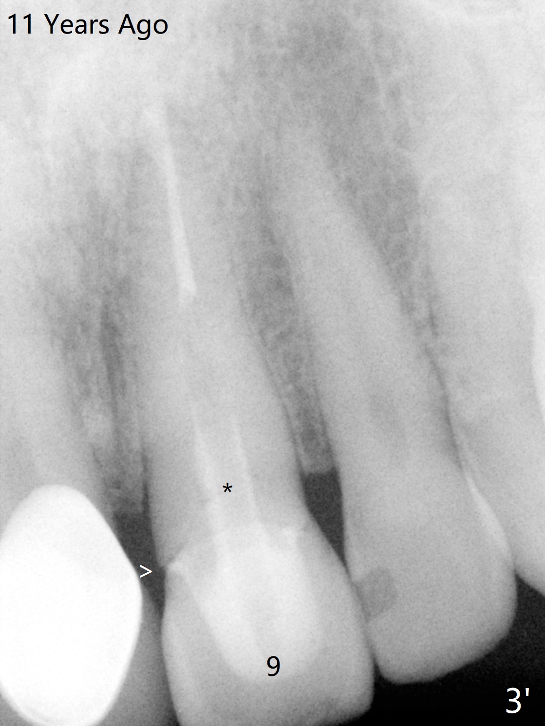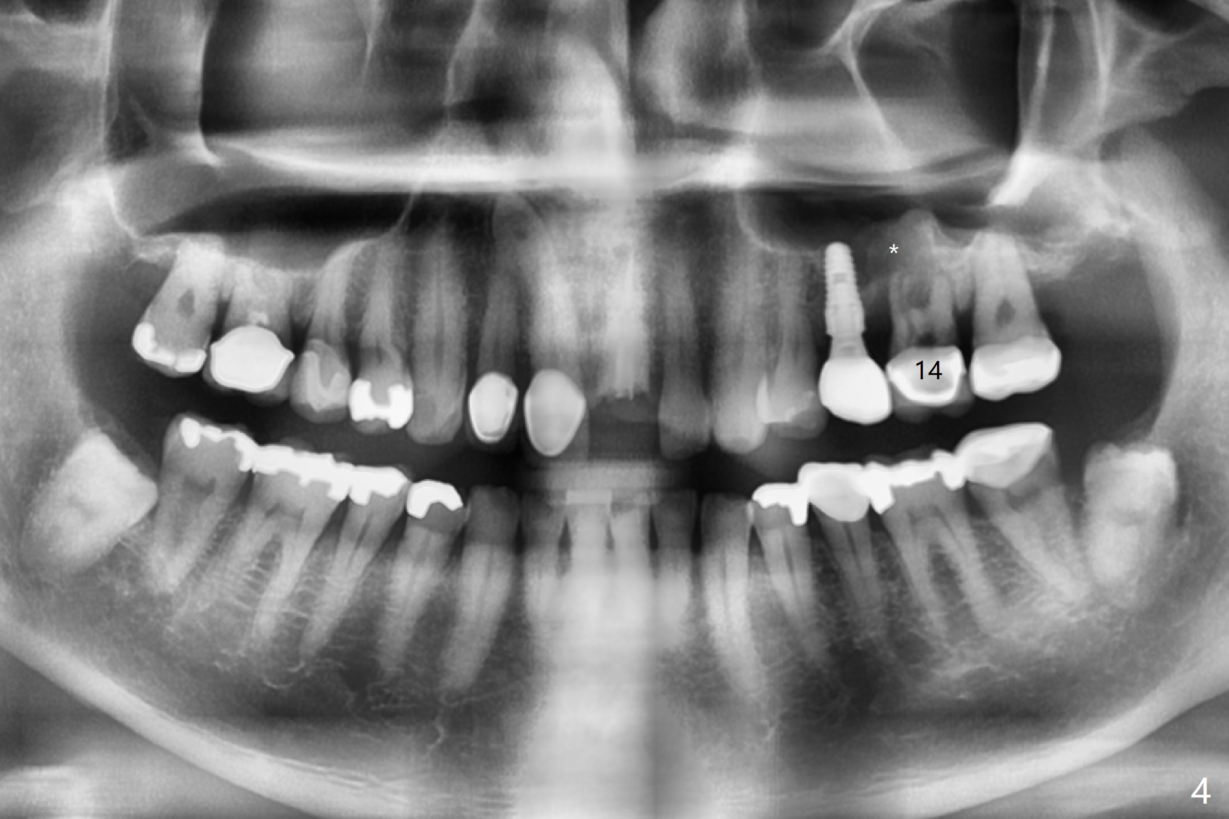 A 58-year-old man fractures the tooth #9 equigingival (Fig.1) and fiber post (Fig.2,3 *). The marginal gingiva is erythematous and edematous (Fig.1 *), suggesting biologic width violation. Redo crown would aggravate the issue. In addition, the mesiobuccal root of the tooth #14 has vertical fracture (Fig.4,5), evidence of heavy mastication. In fact the tooth #13 was also fractured apparently due to heavy occlusion before extraction. It is the best to extract the tooth #9 for implant (Fig.6), or tissue-level (3.5x14 or 17 mm).