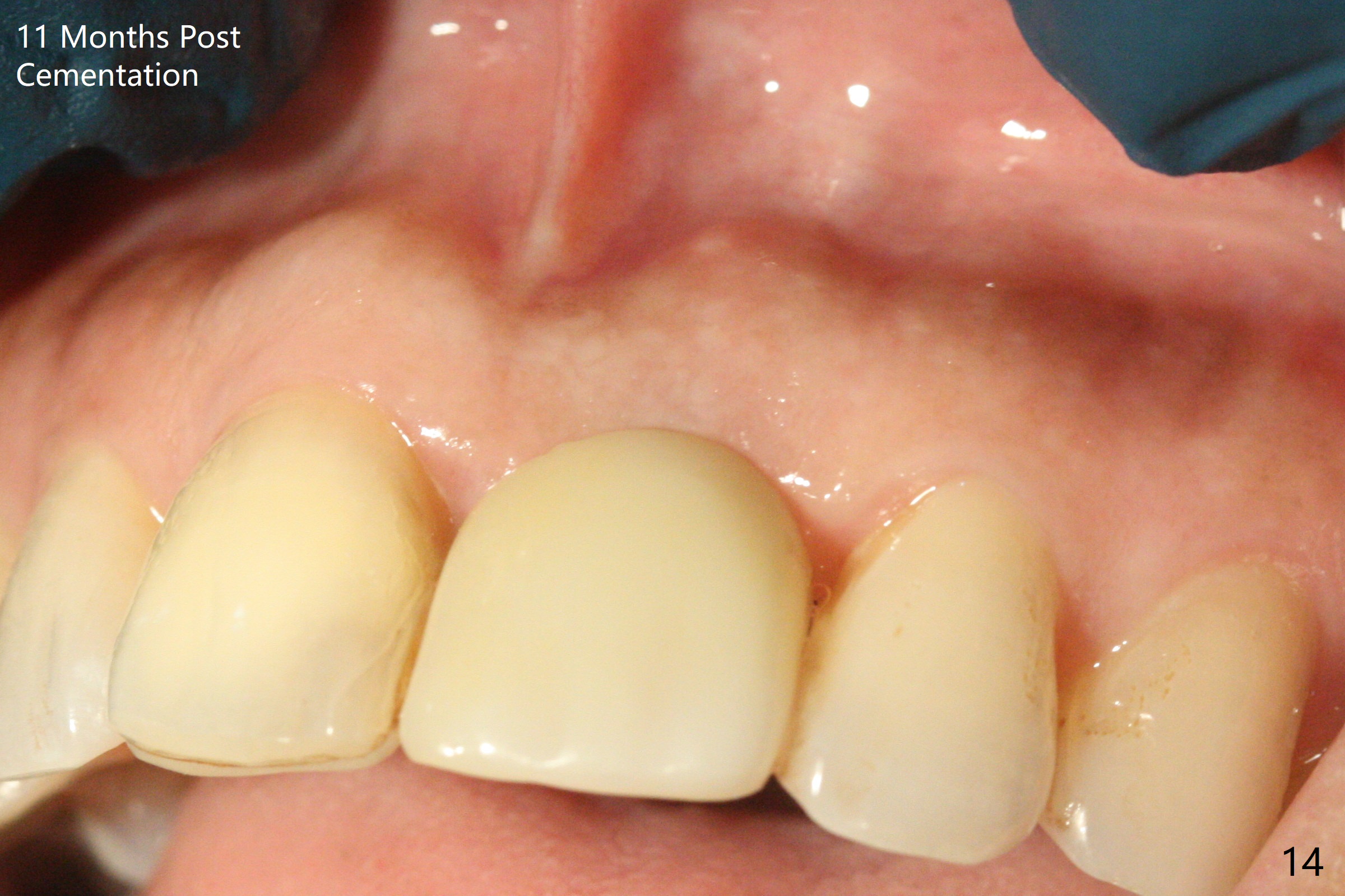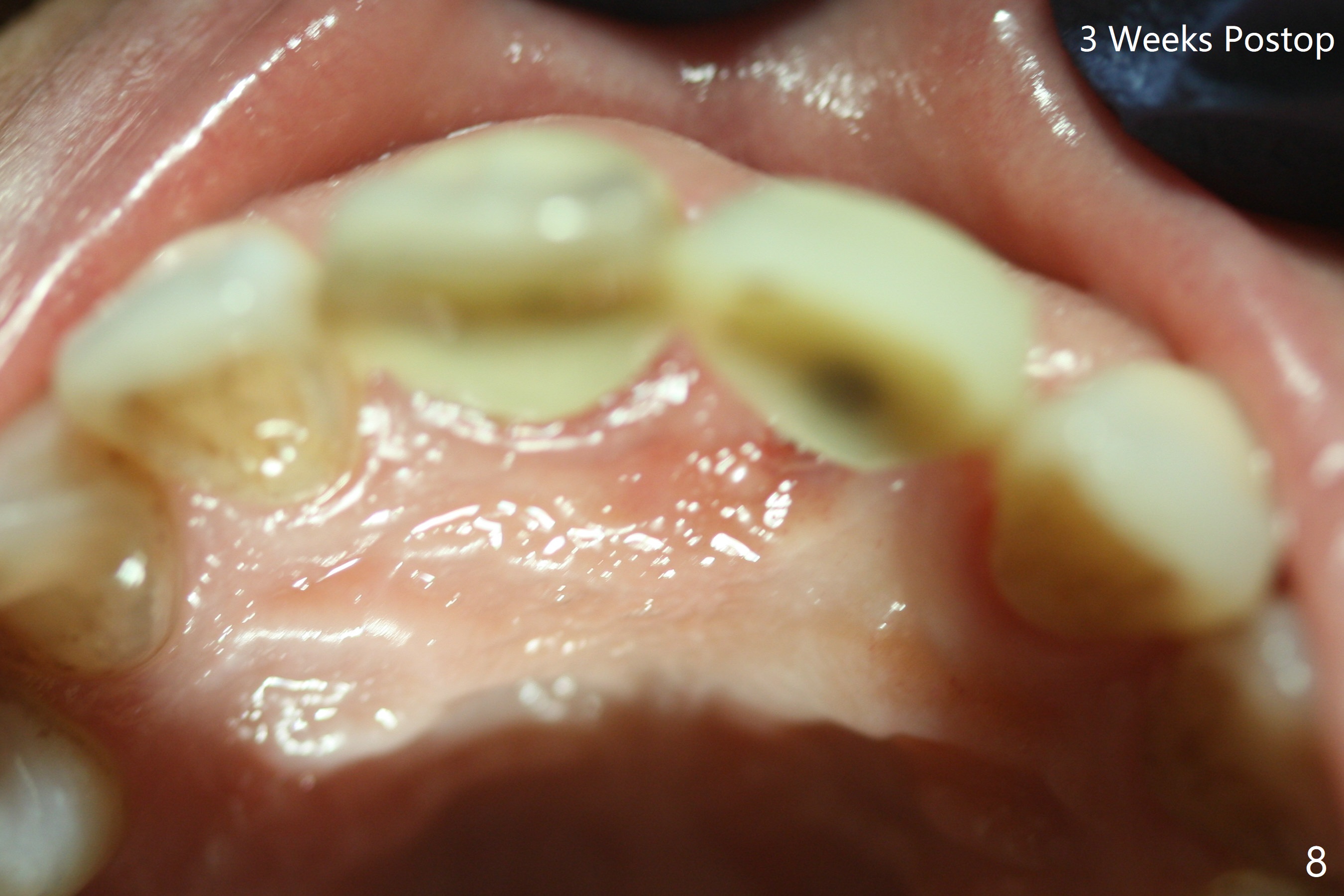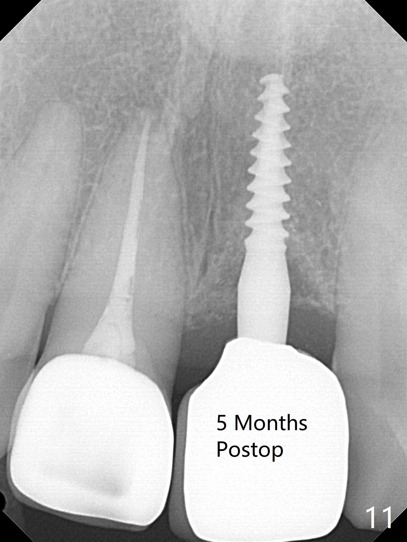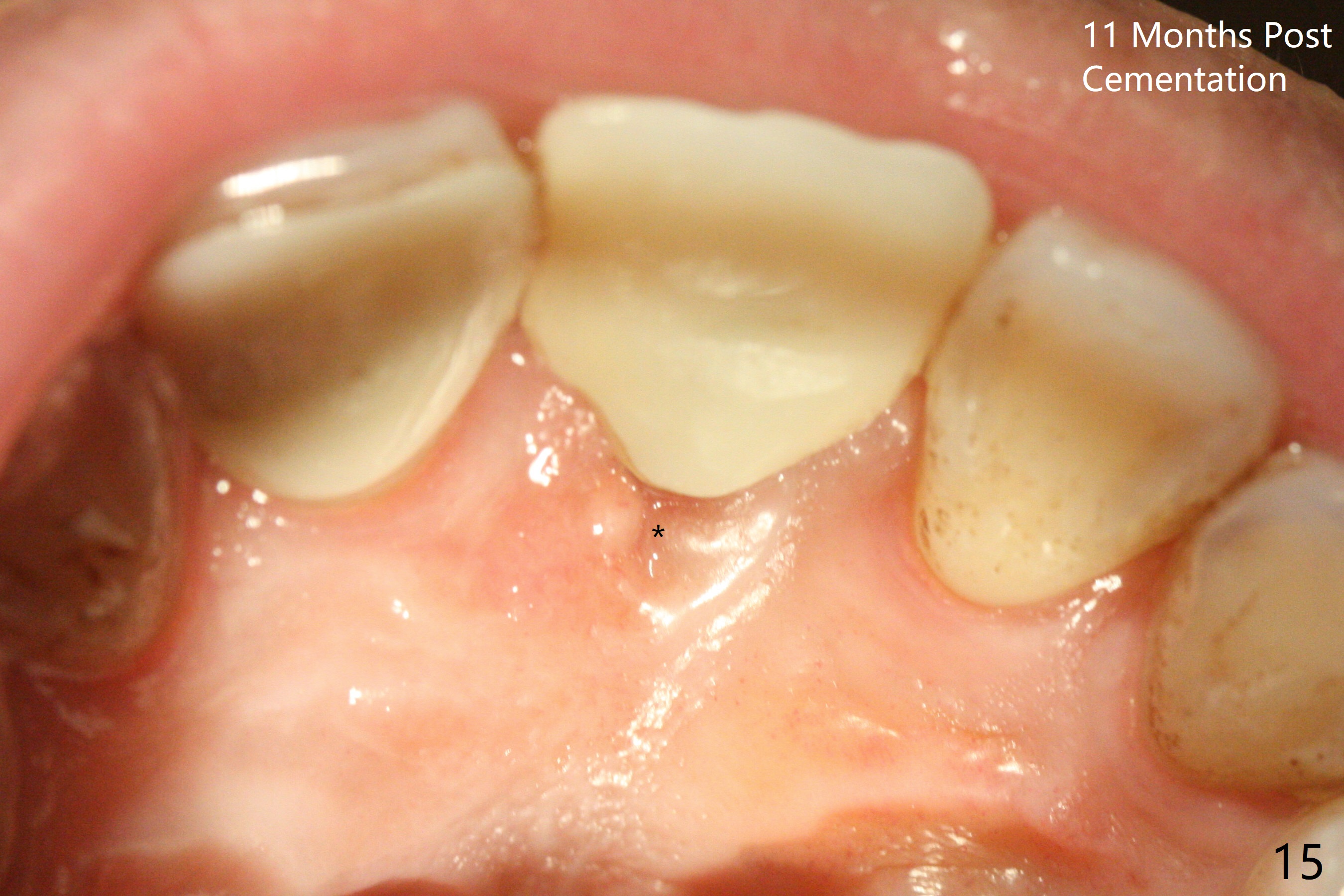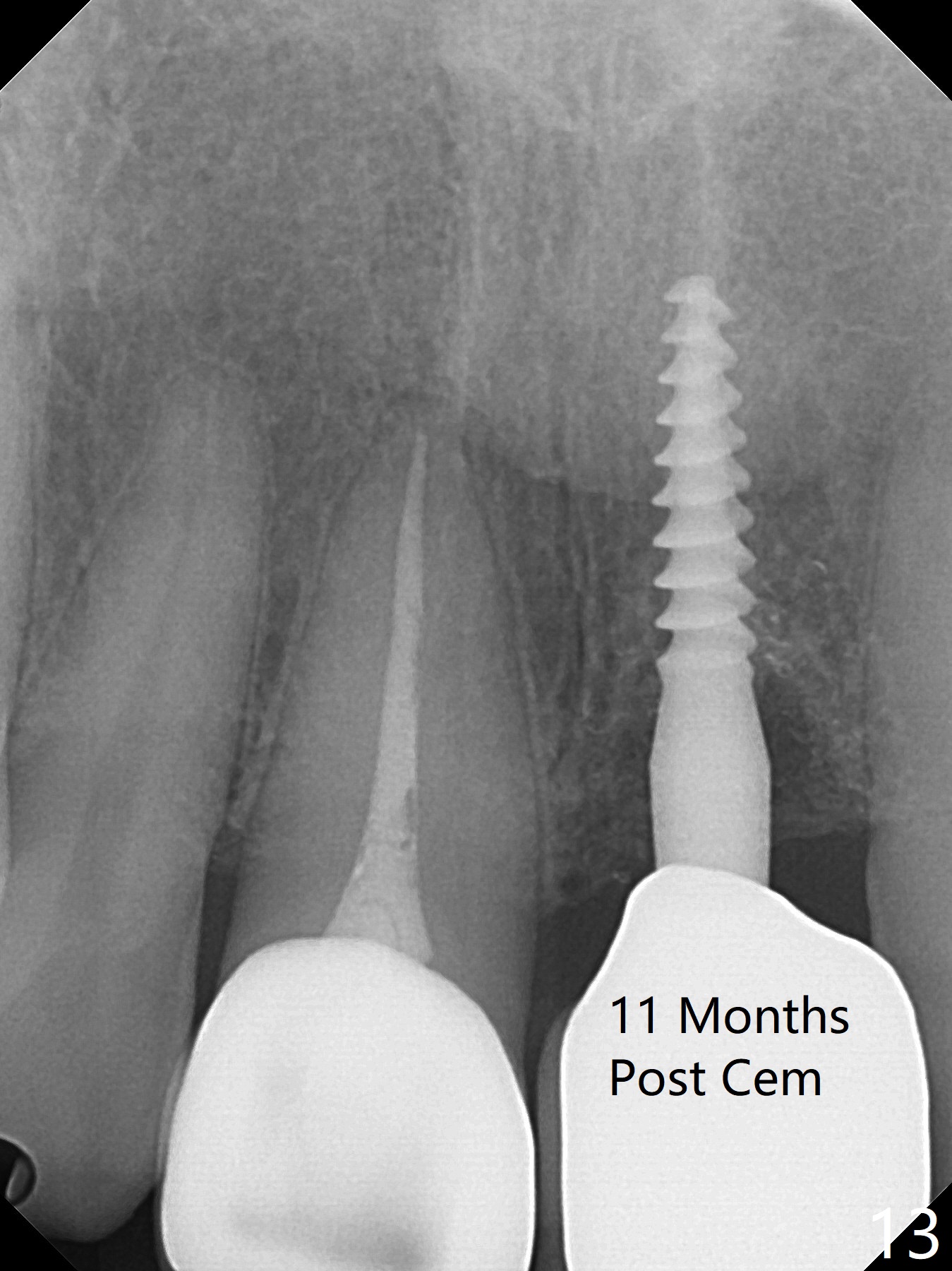Except the depth, a 2.5x10 mm mini implant is placed with precision (in trajectory) at #9 (Fig.1-5). Confidence using surgical guide for the narrow ridge is enhanced due to placement of two digits against the buccal and palatal plates for tactile sensation. The depth issue is related to overprep with 2.2 mm drills. The torque is <15 Ncm. The immediate provisional is bonded to the neighboring teeth for retention. It appears that smaller drills should be made for guided surgery (such as 1.5 and 2.0 mm). The immediate provisional looks acceptable buccal and occlusal 3 weeks postop (Fig.6,7), although the palatal gingiva is erythematous (Fig.8, which is common after use of drill for access (tissue laceration), OHI offered). Three months postop (Fig.9), the palatal gingiva looks healthy (data not shown), while there is no bone loss around the implant (Fig.10). It remains the same 5 months postop (immediately post cementation, Fig.11) and 3,11 months post cementation (Fig.12,13). The labial gingiva is healthy (Fig.14), while the palatal one is less erythematous and edematous (Fig.15) than earlier (Fig.8).