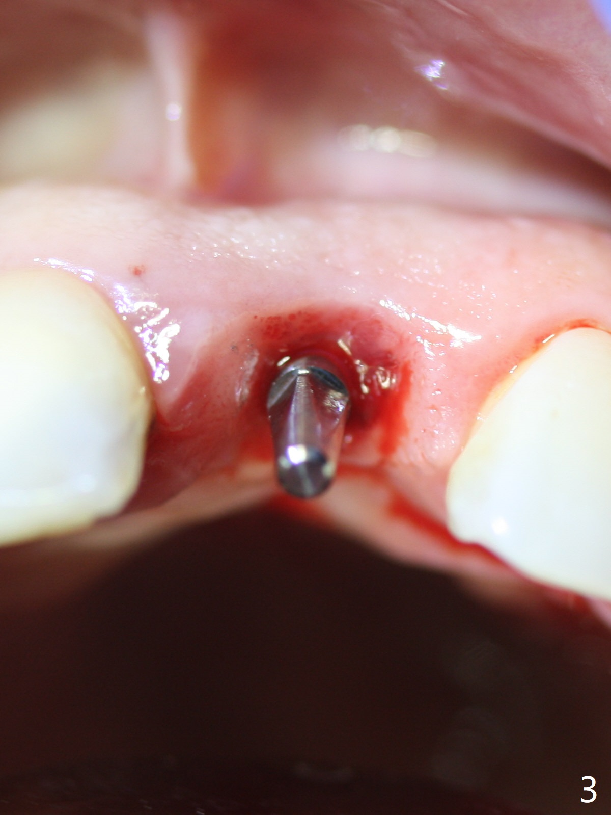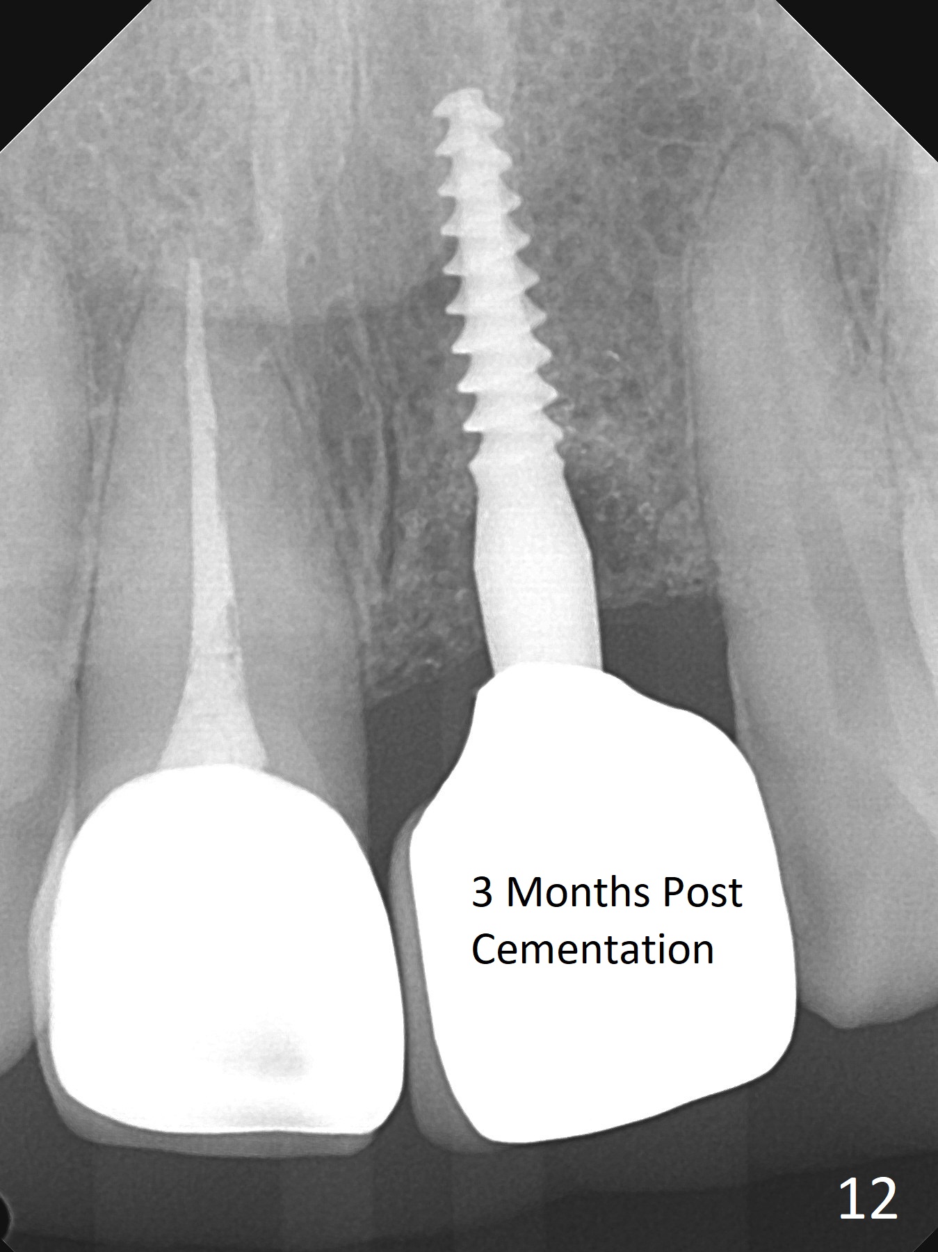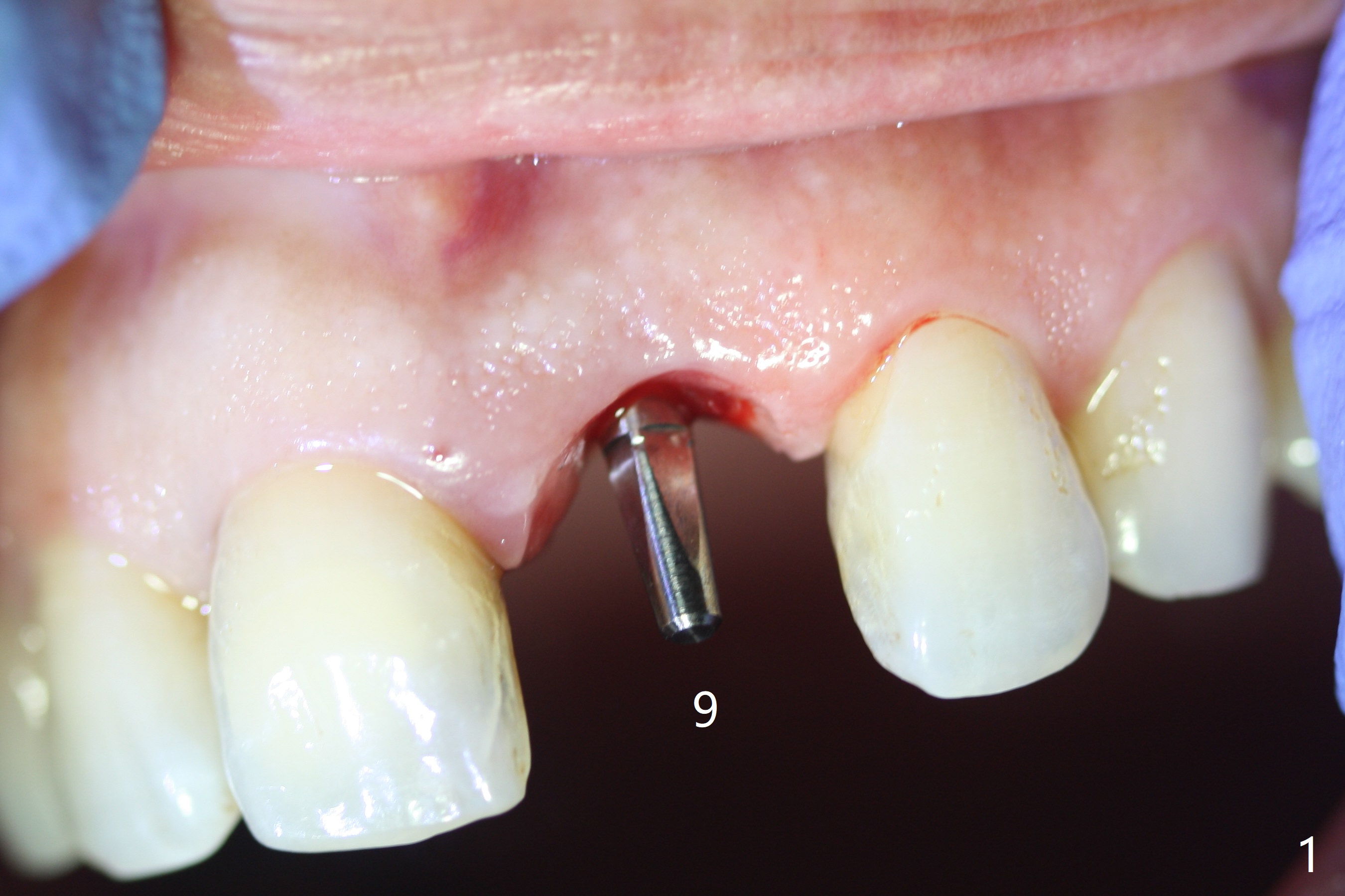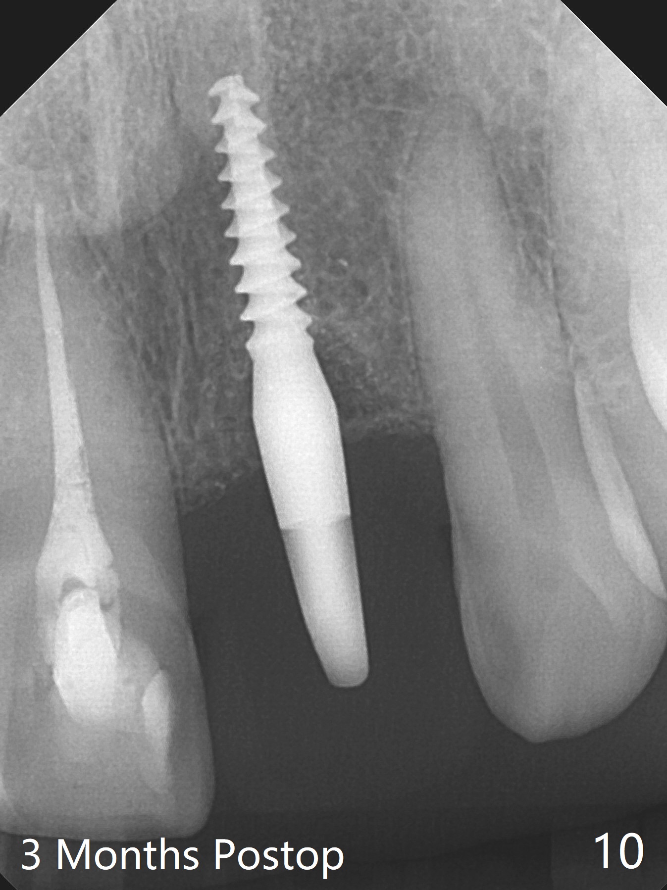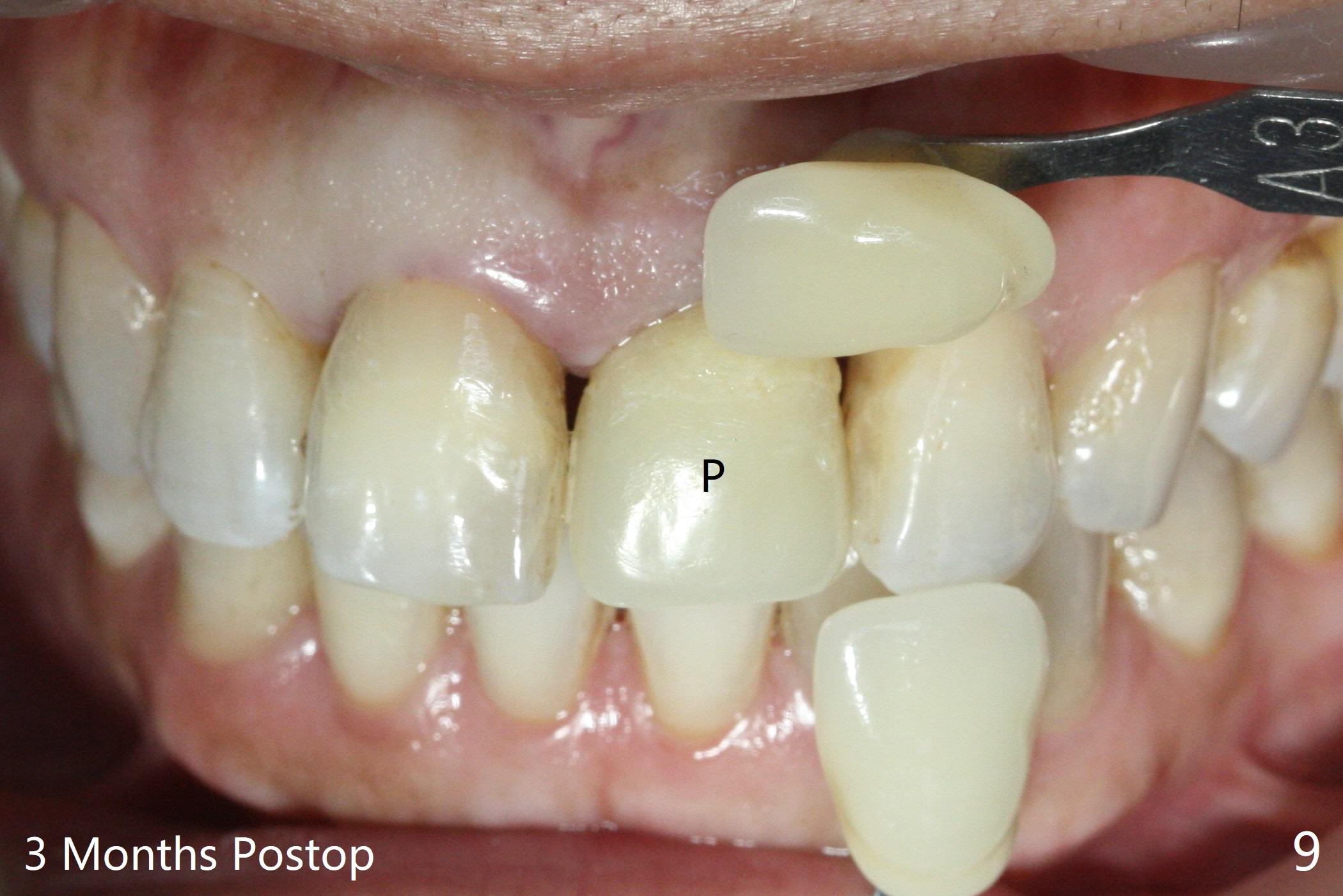 Except the depth, a 2.5x10 mm mini implant is placed with precision (in trajectory) at #9 (Fig.1-5). Confidence using surgical guide for the narrow ridge is enhanced due to placement of two digits against the buccal and palatal plates for tactile sensation. The depth issue is related to overprep with 2.2 mm drills. The torque is <15 Ncm. The immediate provisional is bonded to the neighboring teeth for retention. It appears that smaller drills should be made for guided surgery (such as 1.5 and 2.0 mm). The immediate provisional looks acceptable buccal and occlusal 3 weeks postop (Fig.6,7), although the palatal gingiva is erythematous (Fig.8, which is common after use of drill for access (tissue laceration), OHI offered). Three months postop (Fig.9), the palatal gingiva looks healthy (data not shown), while there is no bone loss around the implant (Fig.10). It remains the same 5 months postop (immediately post cementation, Fig.11) and 3,11 months post cementation (Fig.12,13). The labial gingiva is healthy (Fig.14), while the palatal one is less erythematous and edematous (Fig.15) than earlier (Fig.8).