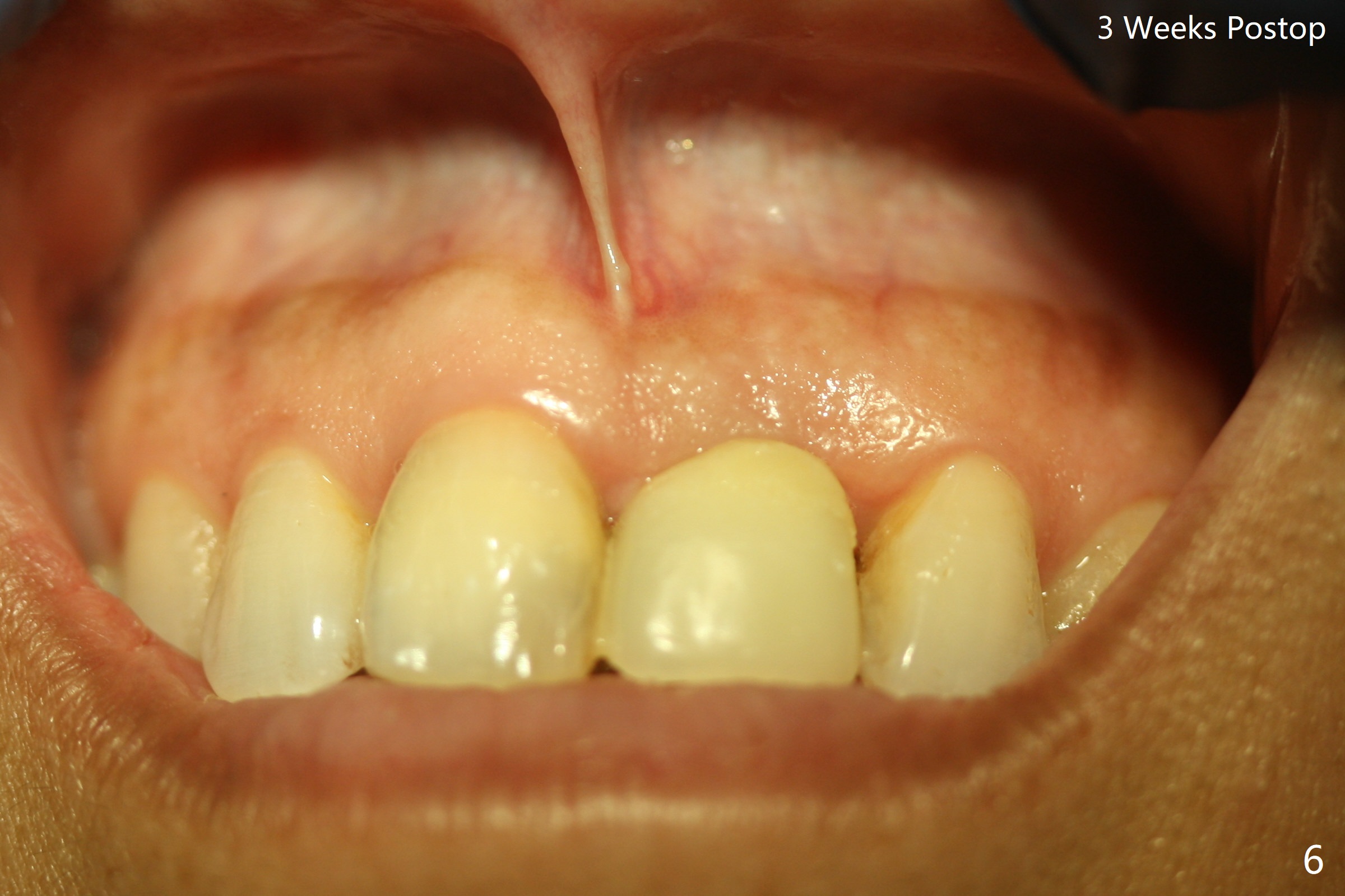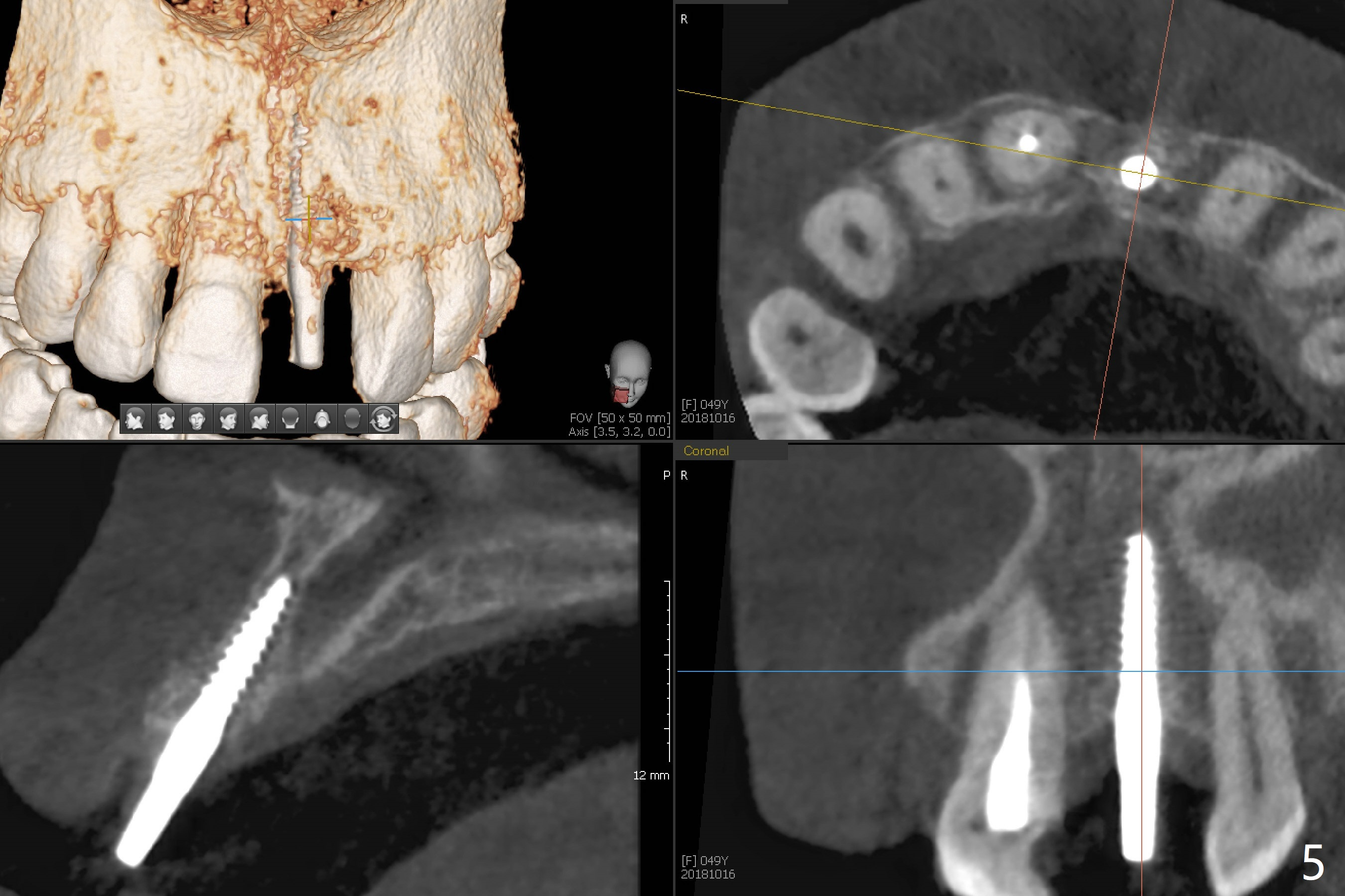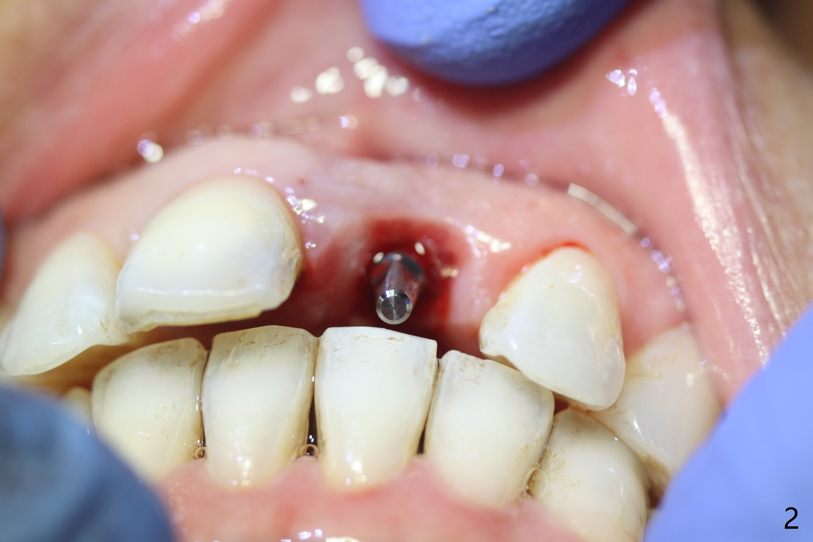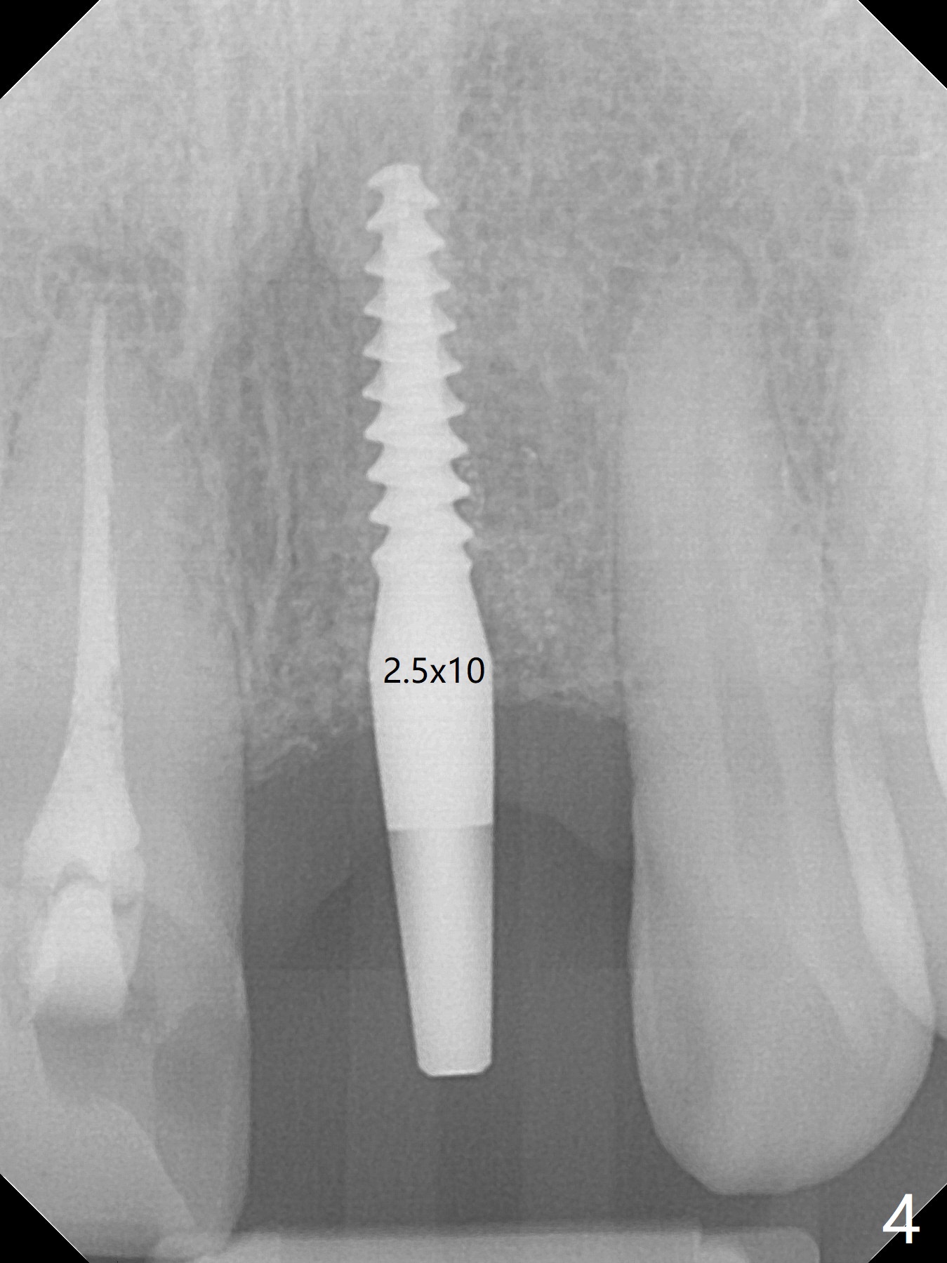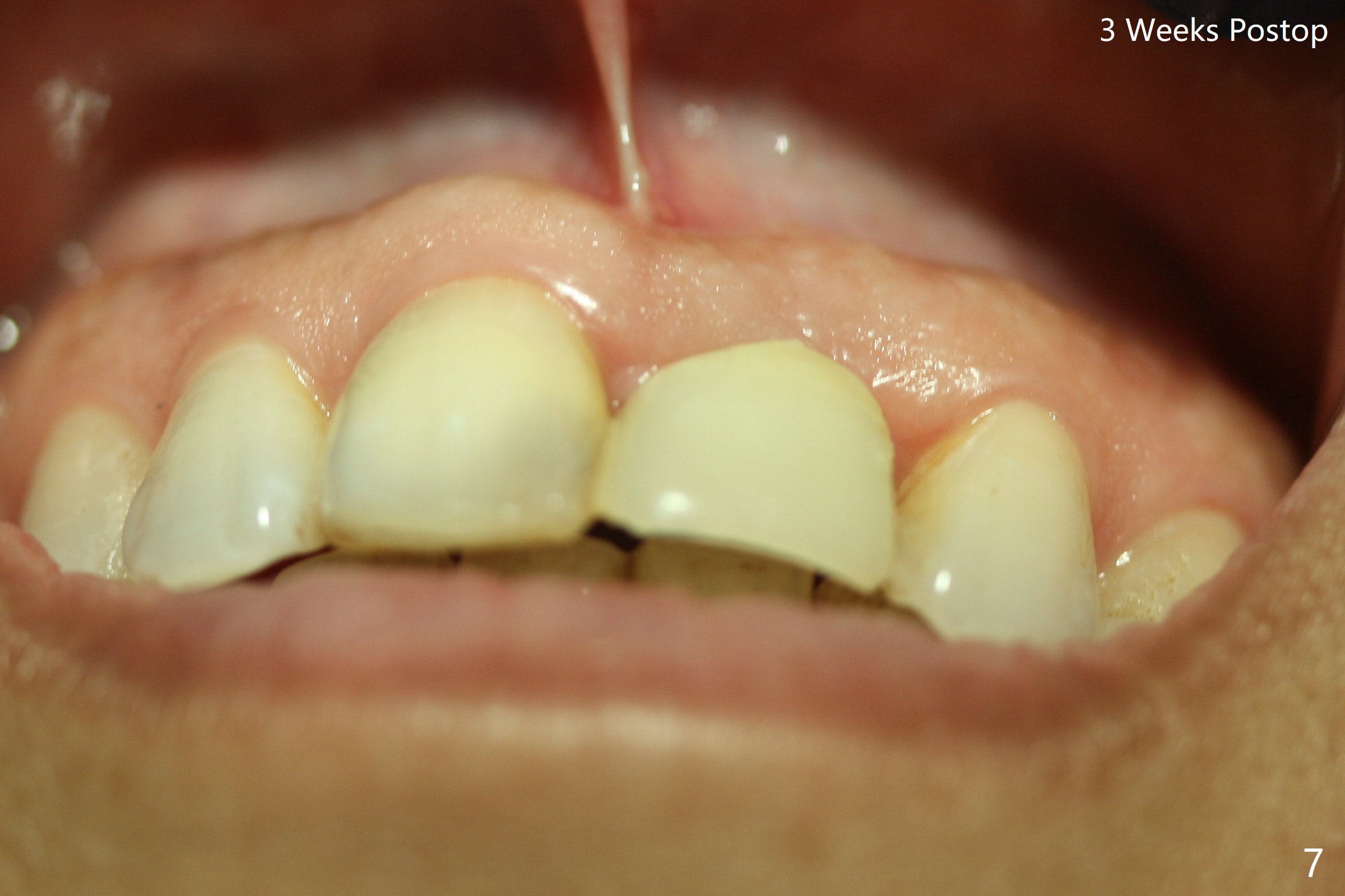 Except the depth, a 2.5x10 mm mini implant is placed with precision (in trajectory) at #9 (Fig.1-5). Confidence using surgical guide for the narrow ridge is enhanced due to placement of two digits against the buccal and palatal plates for tactile sensation. The depth issue is related to overprep with 2.2 mm drills. The torque is <15 Ncm. The immediate provisional is bonded to the neighboring teeth for retention. It appears that smaller drills should be made for guided surgery (such as 1.5 and 2.0 mm). The immediate provisional looks acceptable buccal and occlusal 3 weeks postop (Fig.6,7), although the palatal gingiva is erythematous (Fig.8, which is common after use of drill for access (tissue laceration), OHI offered). Three months postop (Fig.9), the palatal gingiva looks healthy (data not shown), while there is no bone loss around the implant (Fig.10). It remains the same 5 months postop (immediately post cementation, Fig.11) and 3,11 months post cementation (Fig.12,13). The labial gingiva is healthy (Fig.14), while the palatal one is less erythematous and edematous (Fig.15) than earlier (Fig.8).
