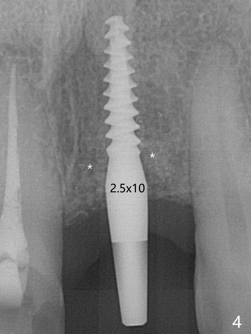 Except the depth, a 2.5x10 mm mini implant is placed with precision (in trajectory) at #9 (Fig.4 *(bone graft palatal)).