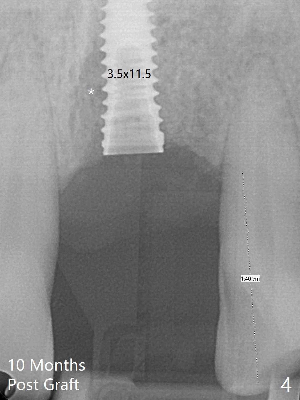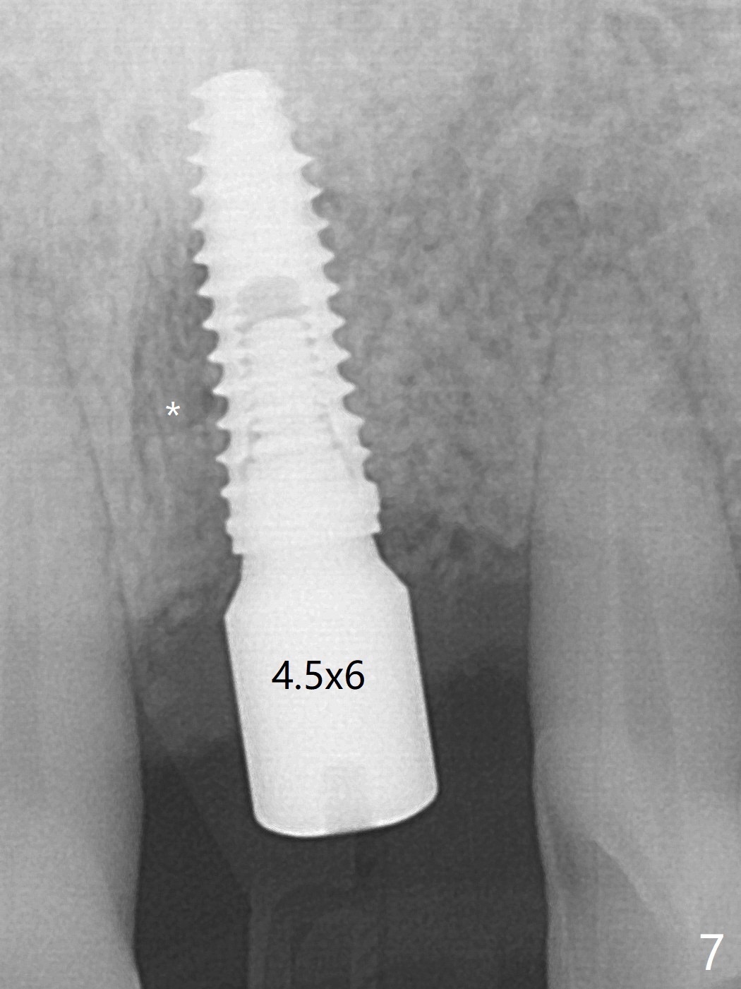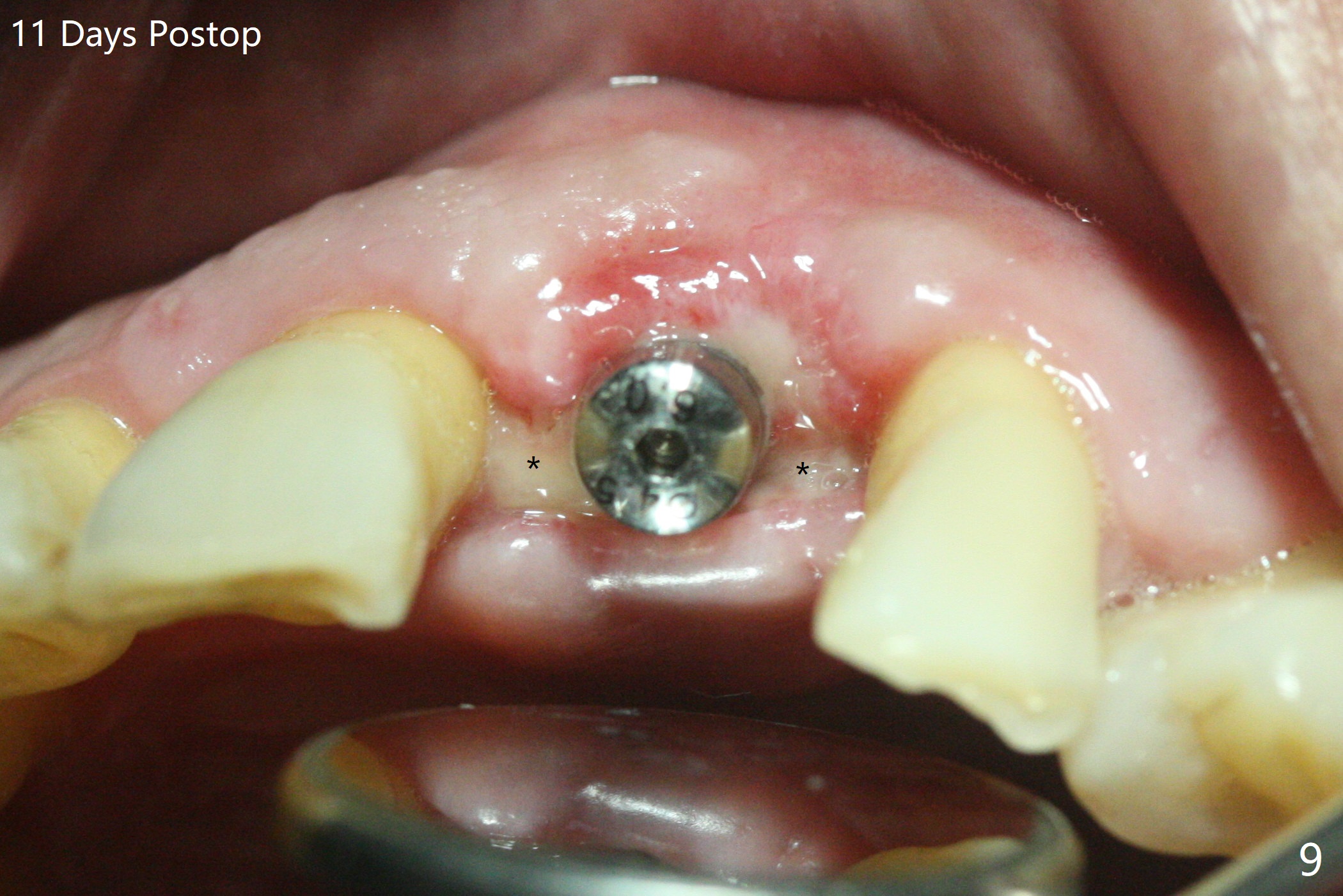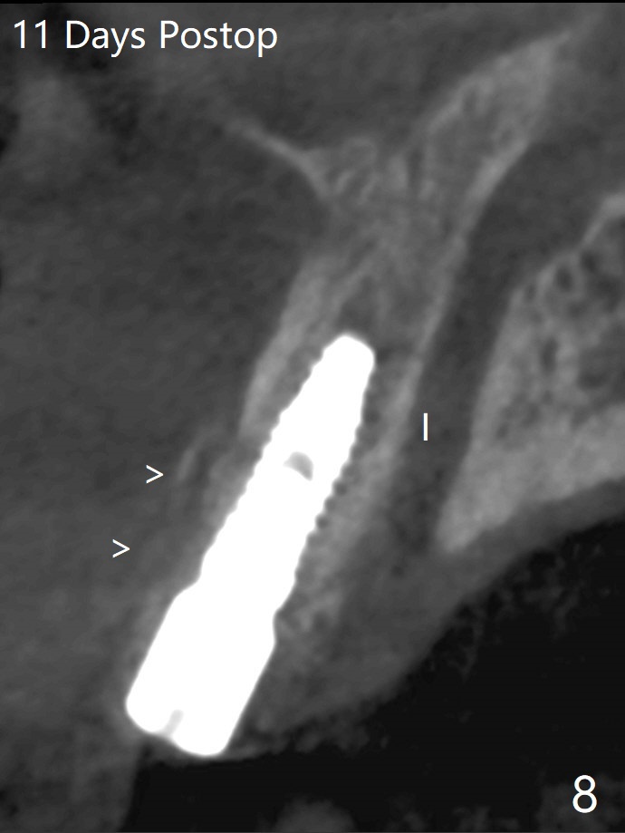 左上1(图一)拔除,植骨,使用带钛架不可吸收膜(图二)后十个月准备植牙(图三),在没有术中根尖片指导下(导板习惯),在牙槽嵴正中开始钻洞,第一个钻头最后一两个毫米觉得有突破感,但是颊侧舌侧没有穿孔,然后植入3.5x11.5毫米植体(图五,扭力>35 Ncm),术后射线表明植体接近切牙管(图四:*)。考虑到病人要离城,颊侧第一螺纹暴露(图六),舌侧骨板薄(图五),植骨,放置愈合基台(图七)。 术后十一天CT显示植体没有侵犯切牙管(图八:I);植体颊侧骨粉(箭头)似乎可以解释颊侧饱满(图九)。第二原因是减张缝合,胶原膜暴露(*),而下面骨粉没有暴露,以后伤口应该是二期愈合。