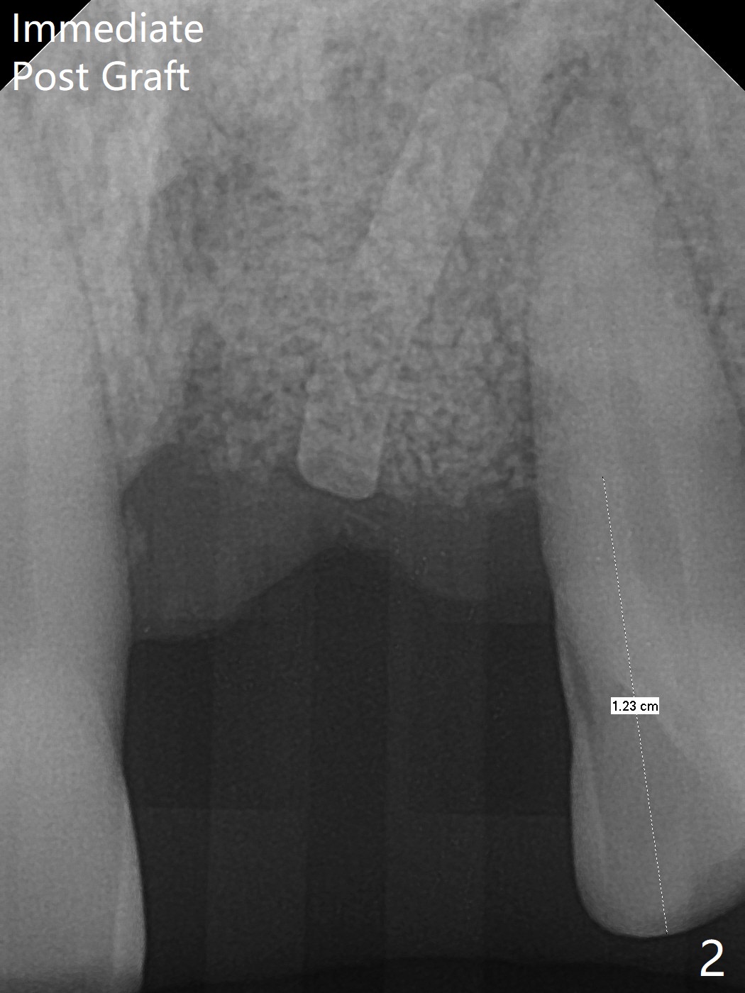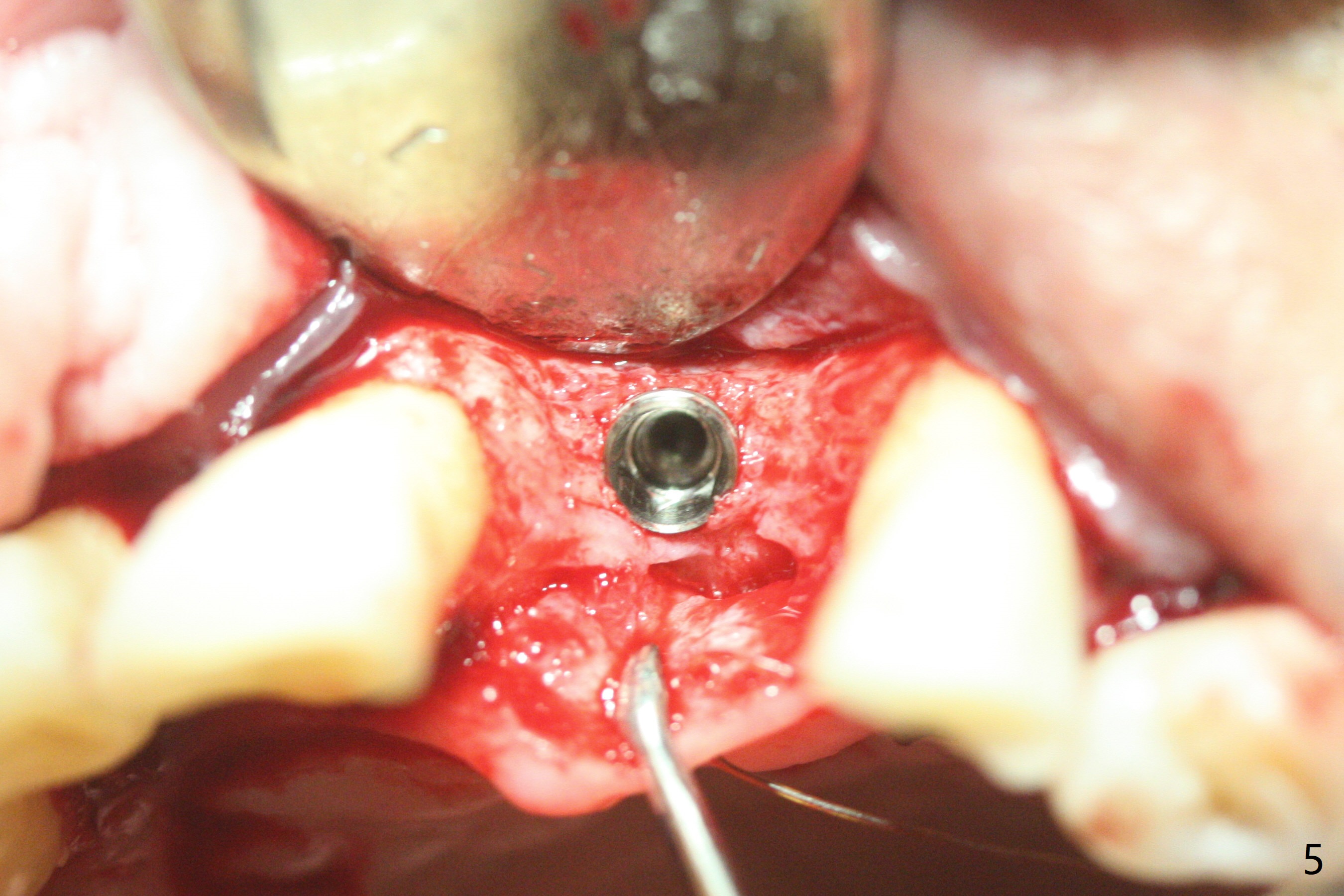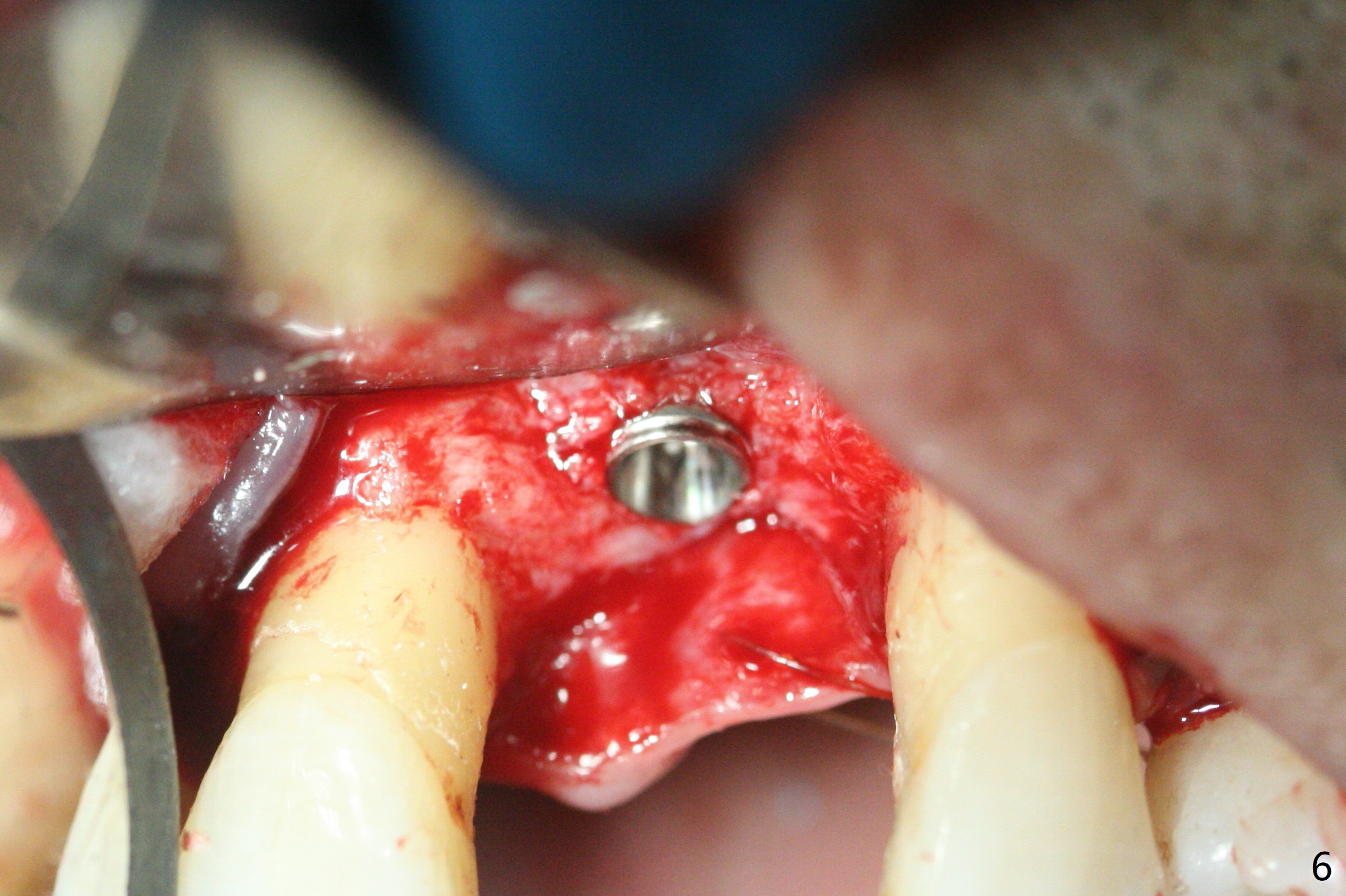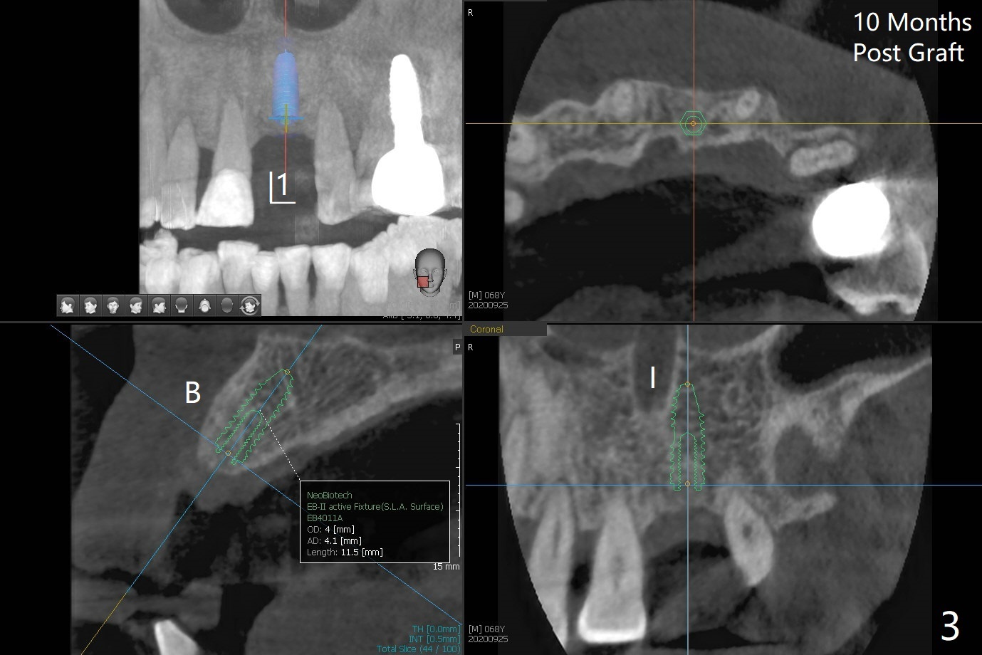 左上1(图一)拔除,植骨,使用带钛架不可吸收膜(图二)后十个月准备植牙(图三),在没有术中根尖片指导下(导板习惯),在牙槽嵴正中开始钻洞,第一个钻头最后一两个毫米觉得有突破感,但是颊侧舌侧没有穿孔,然后植入3.5x11.5毫米植体(图五,扭力>35 Ncm),术后射线表明植体接近切牙管(图四:*)。考虑到病人要离城,颊侧第一螺纹暴露(图六),舌侧骨板薄(图五),植骨,放置愈合基台(图七)。 术后十一天CT显示植体没有侵犯切牙管(图八:I);植体颊侧骨粉(箭头)似乎可以解释颊侧饱满(图九)。第二原因是减张缝合,胶原膜暴露(*),而下面骨粉没有暴露,以后伤口应该是二期愈合。