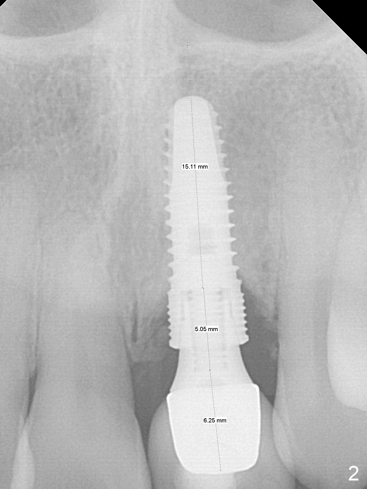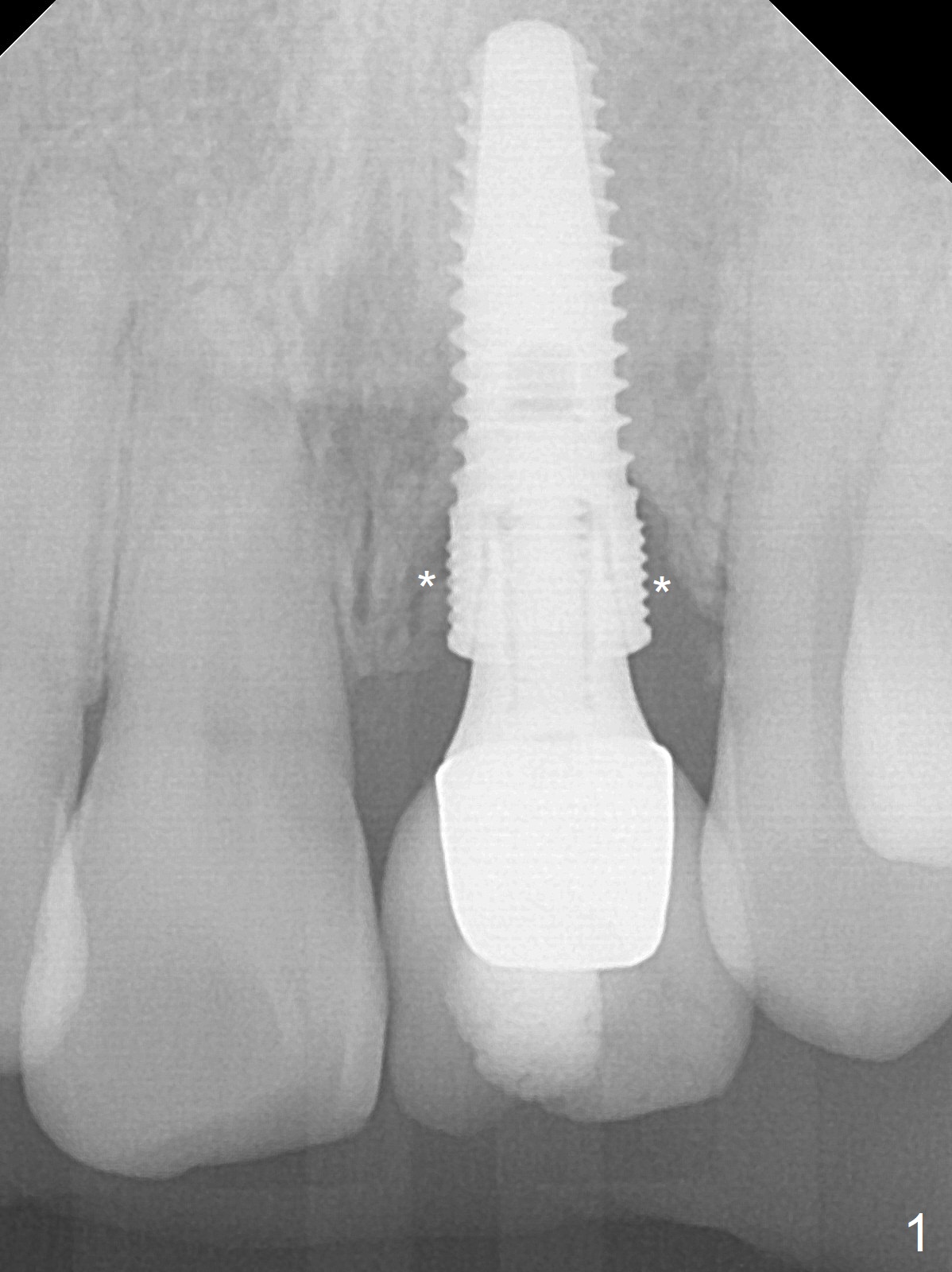 A 56-year-old woman finally agrees to redo the implant (4.5x14 mm) with repeated screw loosening and periimplantitis (chief complaint "gum bleeding while using Water Pik", Fig.1). To reduce the 1st complication, a 1-piece implant will be chosen. To decrease the 2nd one (i.e., to place the implant deep), an abutment with 4 mm cuff will be used. To achieve primary stability, initiate osteotomy in the apical bone ~ 3 mm. Autoclave 2 endo stoppers and use the longest 1.5 mm drill or one from 1-piece kit with a drill extension. After implant removal (Metronidazole), measure the osteotomy depth using drill stopper and probably the soft tissue landmark and drill for 3 mm. If the total depth is 20 mm, a 3x16(4) mm 1-piece implant will be used. Also prepare UF kit (Fig.2) in case primary stability cannot be achieved with the 1-pience one. Place a piece of Osteogen tape against the buccal wall, pack Vanilla graft around the implant and use a piece of collagen plug to seal the osteotomy (socket). Use 4-0 Chromic gut suture to close the opening so that there will be no escape of the bone graft. Periodontal dressing will be applied. However, use an anterior metal tray to take Alginate preop in case of implant placement failure. Also take preop photos to show the erythematous buccal gingiva. Take 5x5 CT postop if needed. In addition to using curette to remove fibrotic granulation tissue from the osteotomy after implant removal, use 15% EDTA gauze (x3 times) to kill remaining bacteria remaining in the osteotomy. Draw blood for PRF if blood vessels are not too thin.