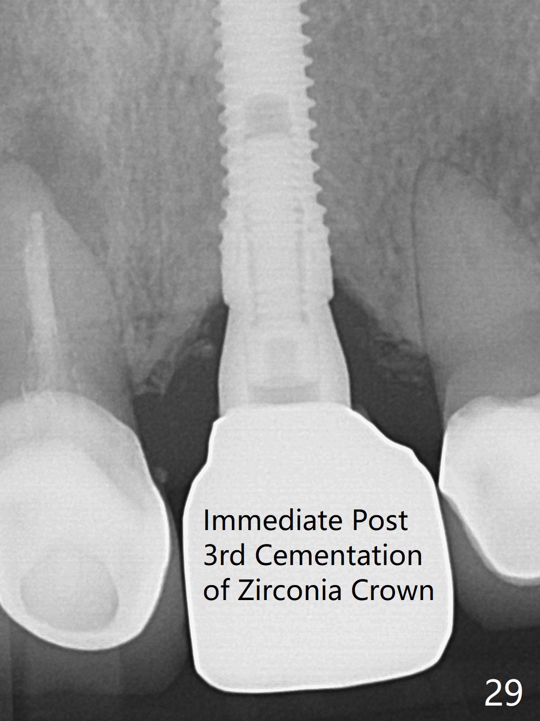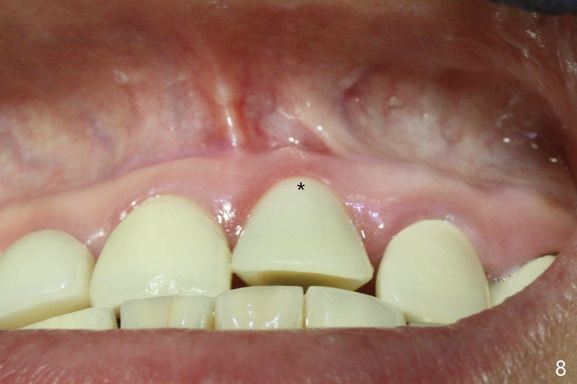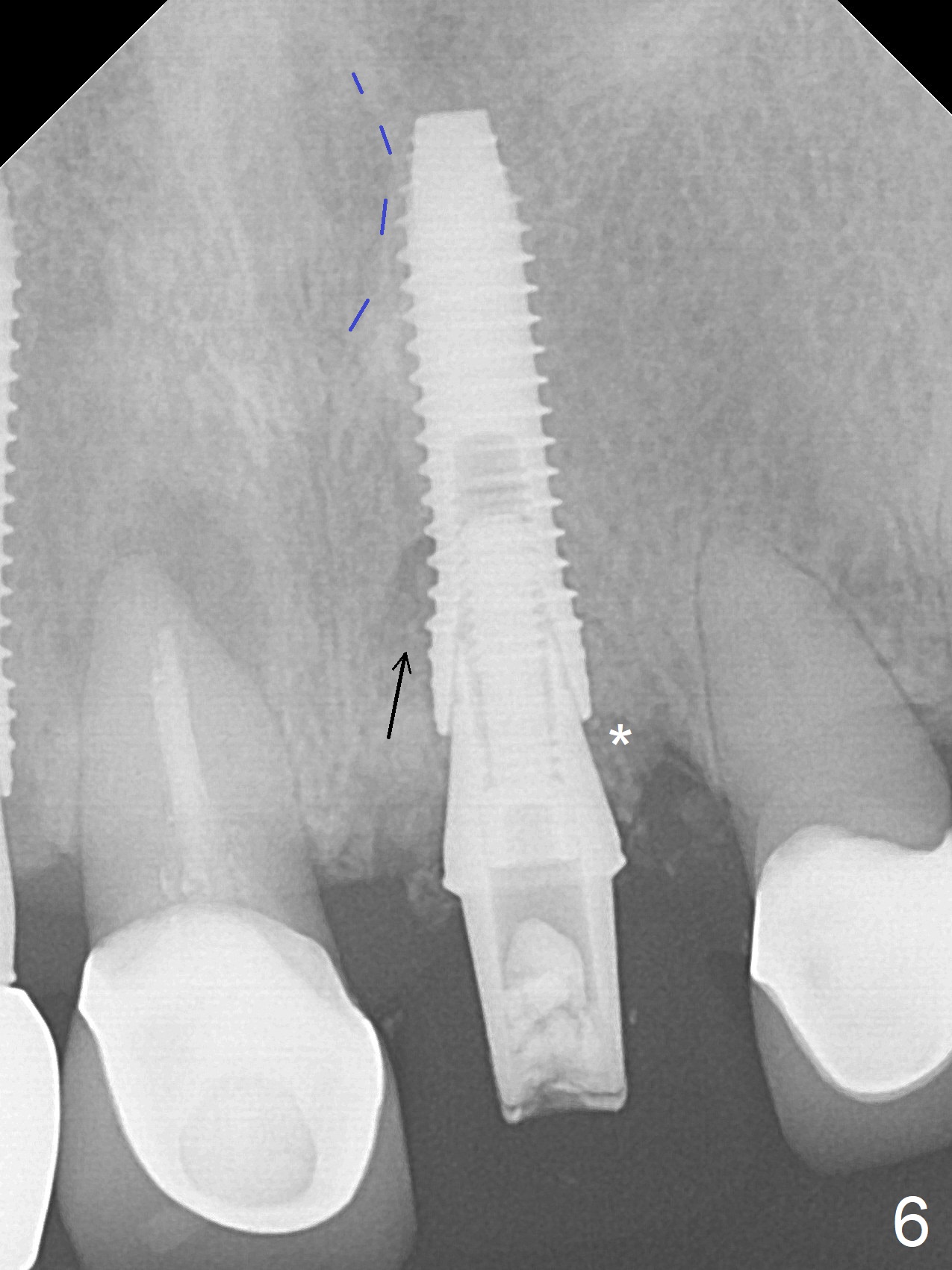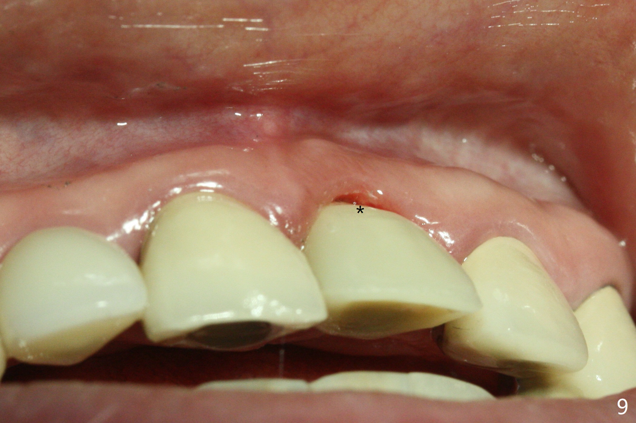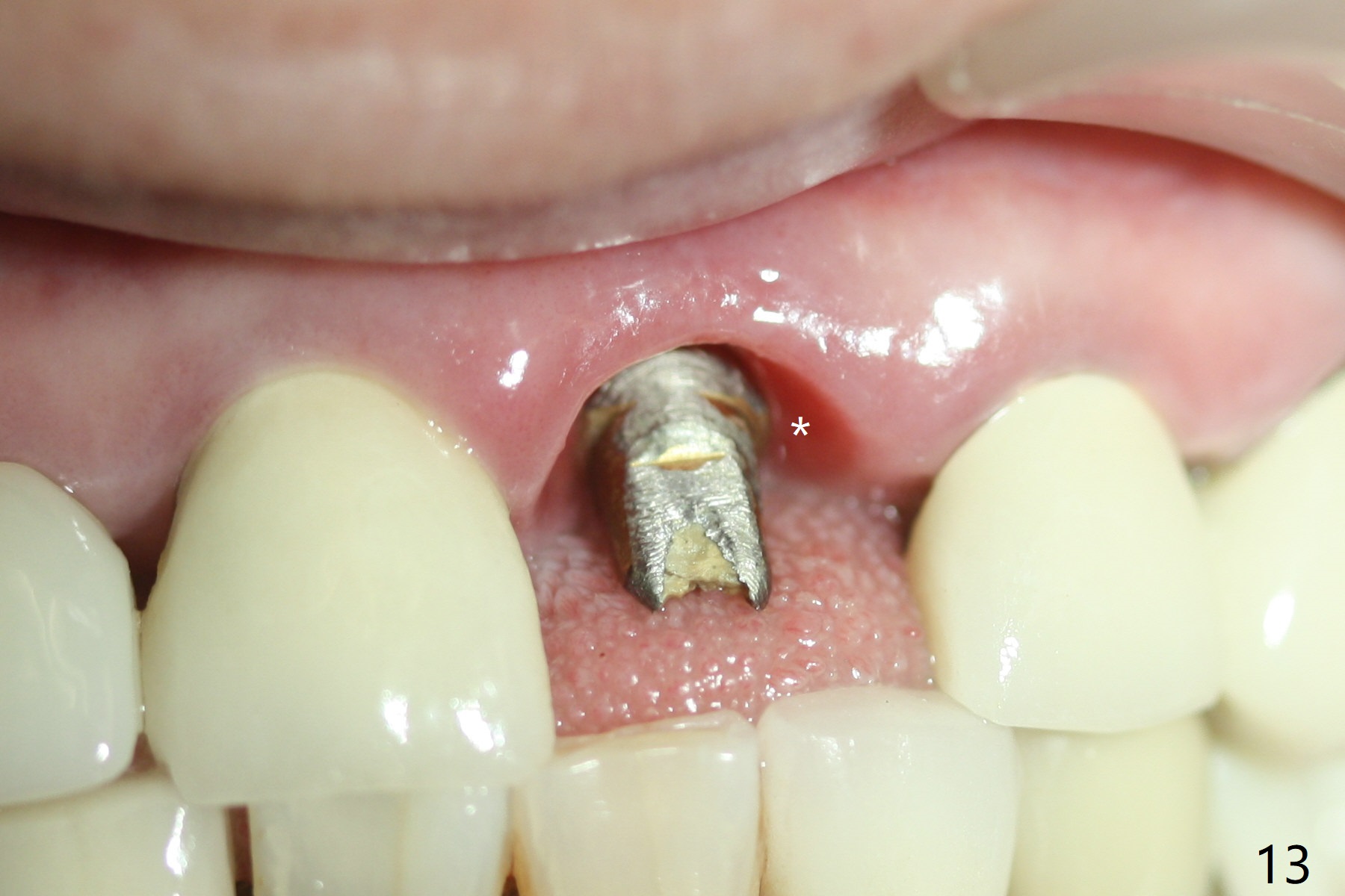 The buccal contour at #9 seems to be slightly concave preop (Fig.1,2 (*)). In fact the buccal plate is found to be lost when the tooth is extracted. Osteotomy is initiated as palatal as possible apical, but the occlusion dictates the coronal end of the osteotomy should be buccal, leaving the buccal gap ~ 2 mm for bone graft. The initial osteotomy (18 mm deep) appears to be close to the Incisive Foramen (Fig.3 blue dashed line). The nasal floor appears to be intact when the drill is removed. Subsequent osteotomy is adjusted so that the apical end of the osteotomy moves distal; when a 3.8x15 mm dummy implant is partially placed, there is clearance (Fig.4). It remains so when a definitive implant is seated (Fig.5); Vanilla graft is placed (Fig.5 *) before placement of a 4.5x5.5(3) mm abutment. More allograft is placed when an immediate provisional is fabricated (Fig.6 arrow and *). The gingiva remains to be recessive 1 month postop (Fig.7). It seems to be related to the bulky gingival margin of the provisional (Fig.8 *). After trimming the latter (Fig.9 *), the gingival margin immediately returns close to normal (Fig.10). The gingival margin is even between #8 and 9 two months postop, but the bone graft is exposed apically (Fig.11 ^). It may heals by itself. Otherwise debridement, regraft, PRF and suture are pending. The coronal portion of the socket heals 4 months postop (Fig.12). The gingival cuff forms by the immediate provisional (which is removed for impression) 4 months postop (Fig.13 *). While the full Zirconia crown at #7 remains intact (Fig.14), the PFM at #9 has porcelain chip (Fig.15). It is partially due to the occlusion; while the crown at #7 has clearance with the opposing dentition (Fig.16 *), the one at #9 has no. The access hole at #9 (Fig.17 *) seems to weaken the crown structure. There is no access hole at #7. No solid posterior support is another contributing factor for chip (Fig.18). The buccal plate has mild atrophy at #7 and 9 (Fig.19 *). A piece of bone graft is being expelled apically at #9 (Fig.20 >) and is removed subsequently (Fig.21). Before impression for repacking porcelain, the opposing incisal edge has been shortened (Fig.22 arrows, as compared to Fig.16). Since the ideal access hole is at the incisal edge (Fig.25 black circle), buccal to the existing one (Fig.24 A), the abutment is torqued before the repaired crown is recemented (Fig.23). Finally the crown has occlusal clearance (Fig.26). Porcelain chips again around the access hole of PFM 1.5 years post 2nd cementation. The dense bone at the crest (*) cannot explain why the abutment is not loose, since it remains incompletely seated (>). As it was trimmed short, an angled abutment is used (Fig.28). The coronal end is lingual, while #9/24 is edge to edge. The lingual aspect of the coronal end of the abutment is heavily trimmed to reduce bulkiness. To prevent chip, Zirconium crown will be fabricated in spite of the fact that it does not match the PFM of #8 (potential shade discrepancy). The patient is pleased with the new Zirconia crown (Fig.29).