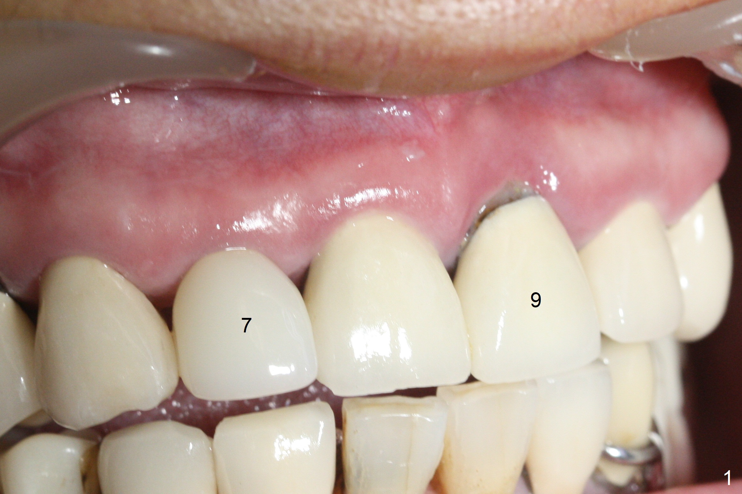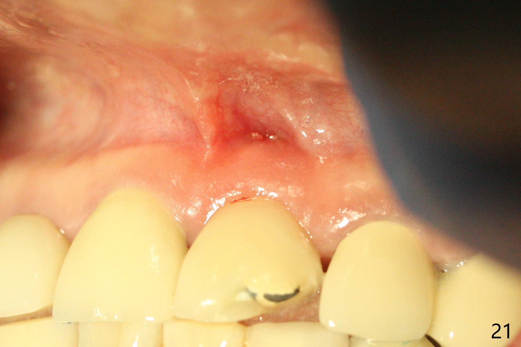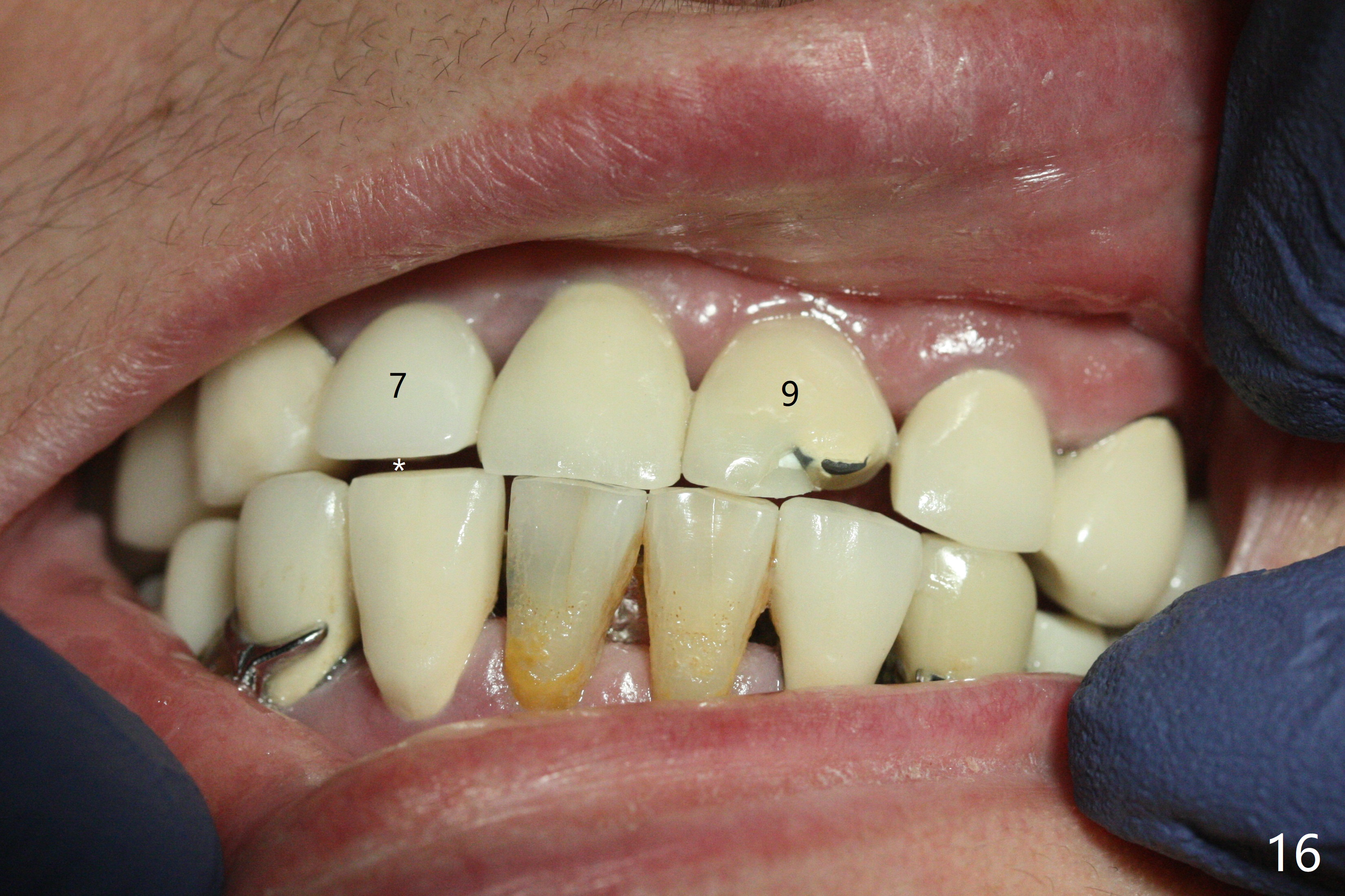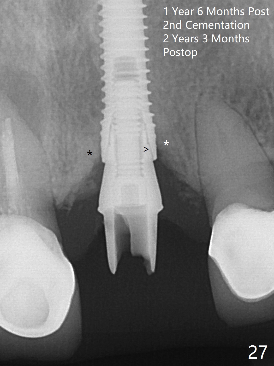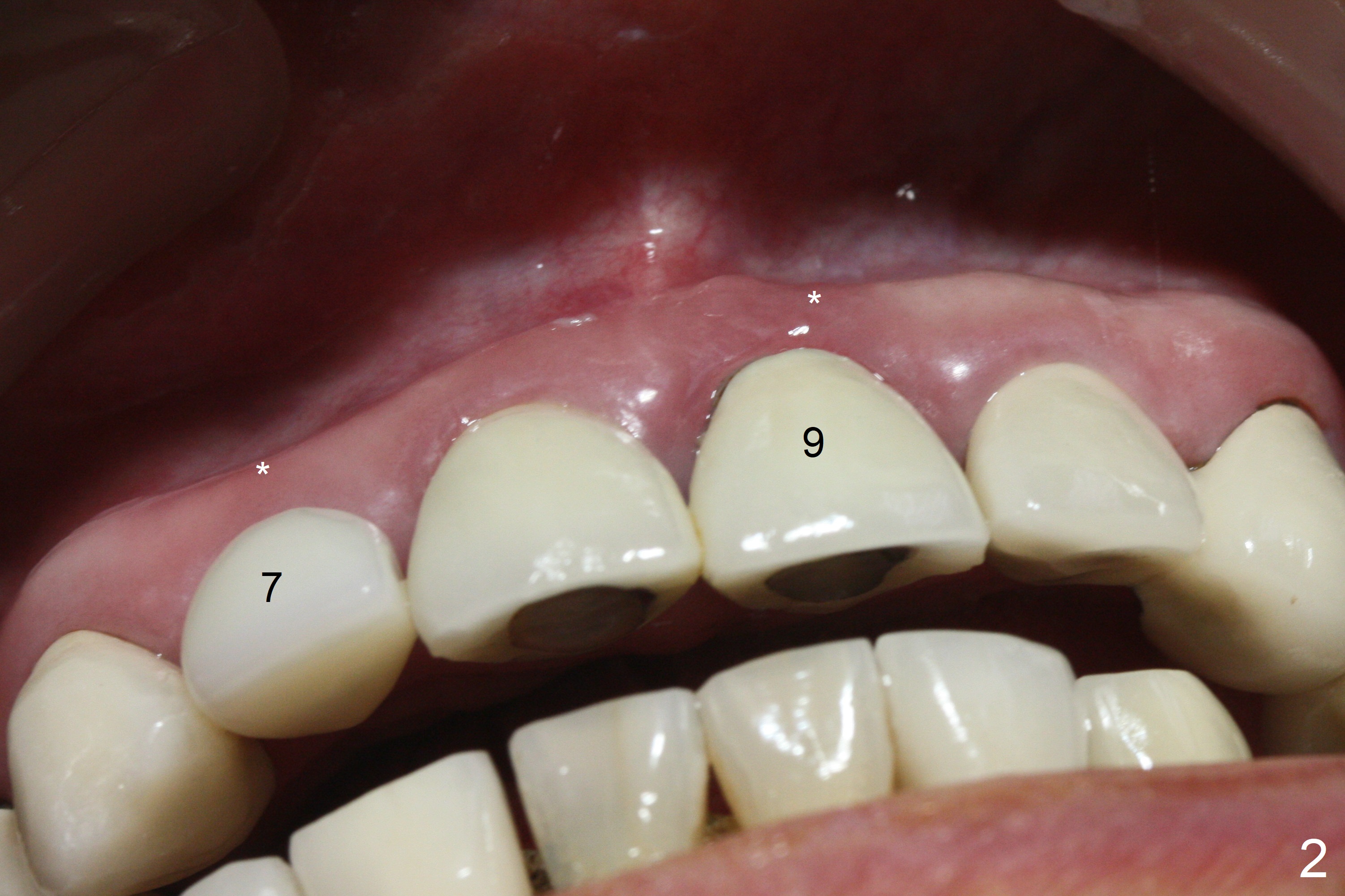 The buccal contour at #9 seems to be slightly concave preop (Fig.1,2 (*)). In fact the buccal plate is found to be lost when the tooth is extracted. Osteotomy is initiated as palatal as possible apical, but the occlusion dictates the coronal end of the osteotomy should be buccal, leaving the buccal gap ~ 2 mm for bone graft. The initial osteotomy (18 mm deep) appears to be close to the Incisive Foramen (Fig.3 blue dashed line). The nasal floor appears to be intact when the drill is removed. Subsequent osteotomy is adjusted so that the apical end of the osteotomy moves distal; when a 3.8x15 mm dummy implant is partially placed, there is clearance (Fig.4). It remains so when a definitive implant is seated (Fig.5); Vanilla graft is placed (Fig.5 *) before placement of a 4.5x5.5(3) mm abutment. More allograft is placed when an immediate provisional is fabricated (Fig.6 arrow and *). The gingiva remains to be recessive 1 month postop (Fig.7). It seems to be related to the bulky gingival margin of the provisional (Fig.8 *). After trimming the latter (Fig.9 *), the gingival margin immediately returns close to normal (Fig.10). The gingival margin is even between #8 and 9 two months postop, but the bone graft is exposed apically (Fig.11 ^). It may heals by itself. Otherwise debridement, regraft, PRF and suture are pending. The coronal portion of the socket heals 4 months postop (Fig.12). The gingival cuff forms by the immediate provisional (which is removed for impression) 4 months postop (Fig.13 *). While the full Zirconia crown at #7 remains intact (Fig.14), the PFM at #9 has porcelain chip (Fig.15). It is partially due to the occlusion; while the crown at #7 has clearance with the opposing dentition (Fig.16 *), the one at #9 has no. The access hole at #9 (Fig.17 *) seems to weaken the crown structure. There is no access hole at #7. No solid posterior support is another contributing factor for chip (Fig.18). The buccal plate has mild atrophy at #7 and 9 (Fig.19 *). A piece of bone graft is being expelled apically at #9 (Fig.20 >) and is removed subsequently (Fig.21). Before impression for repacking porcelain, the opposing incisal edge has been shortened (Fig.22 arrows, as compared to Fig.16). Since the ideal access hole is at the incisal edge (Fig.25 black circle), buccal to the existing one (Fig.24 A), the abutment is torqued before the repaired crown is recemented (Fig.23). Finally the crown has occlusal clearance (Fig.26). Porcelain chips again around the access hole of PFM 1.5 years post 2nd cementation. The dense bone at the crest (*) cannot explain why the abutment is not loose, since it remains incompletely seated (>). As it was trimmed short, an angled abutment is used (Fig.28). The coronal end is lingual, while #9/24 is edge to edge. The lingual aspect of the coronal end of the abutment is heavily trimmed to reduce bulkiness. To prevent chip, Zirconium crown will be fabricated in spite of the fact that it does not match the PFM of #8 (potential shade discrepancy). The patient is pleased with the new Zirconia crown (Fig.29).