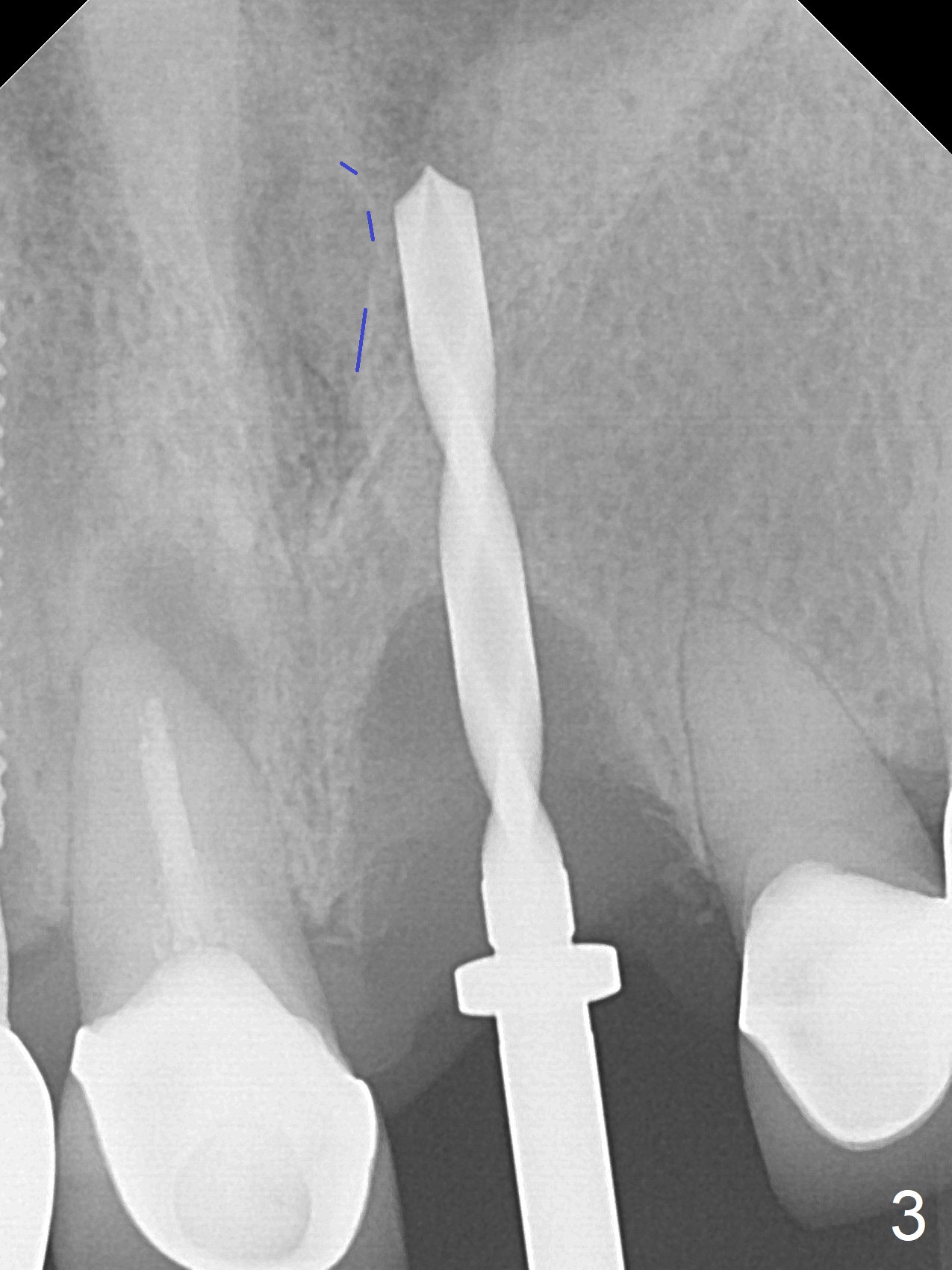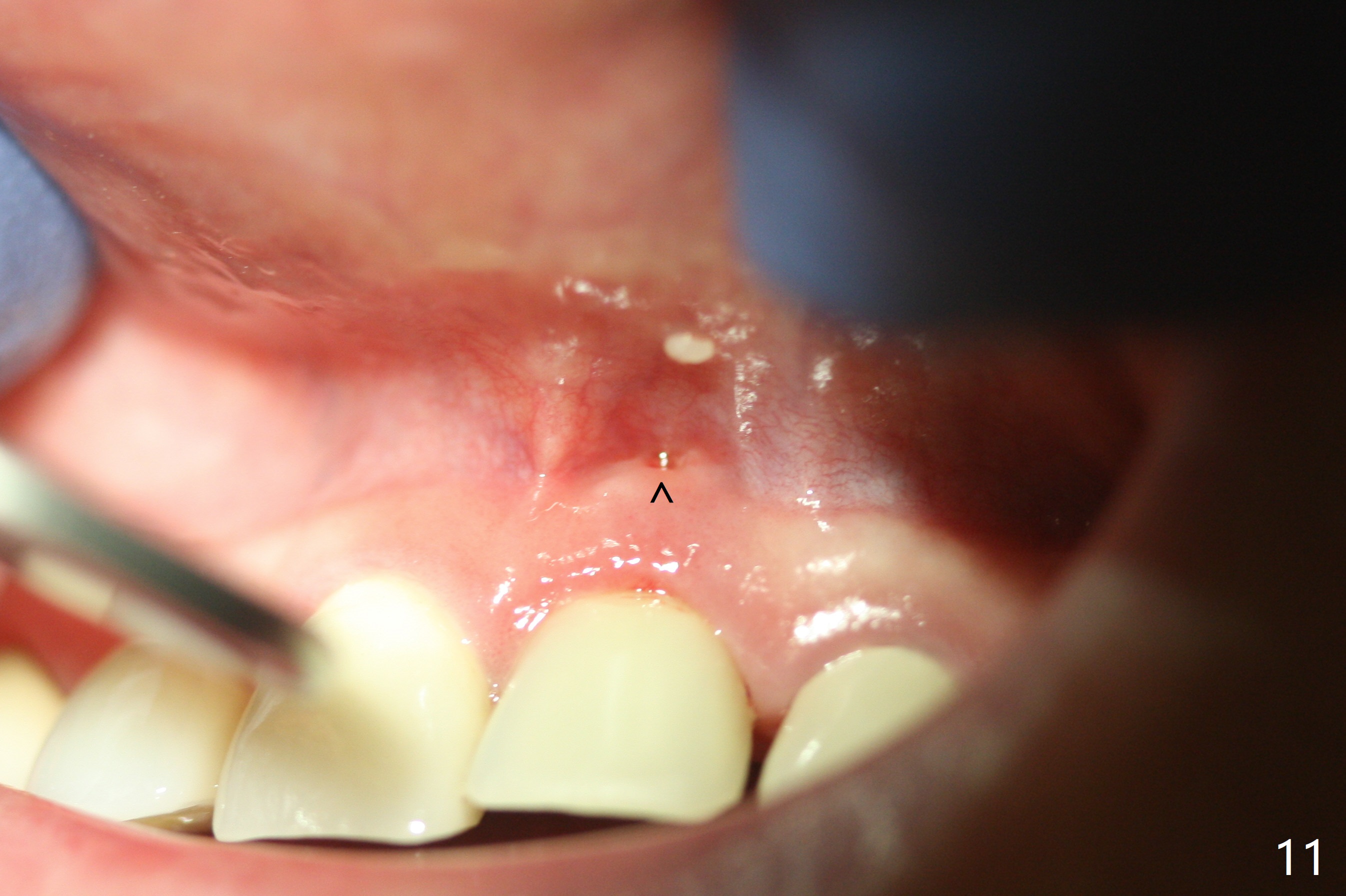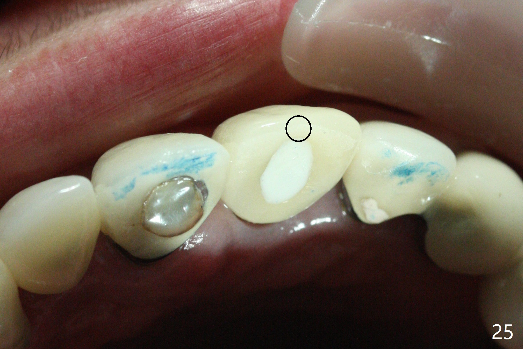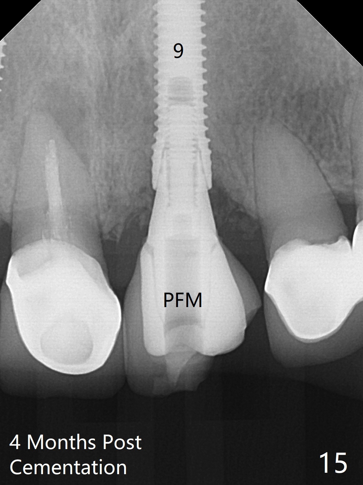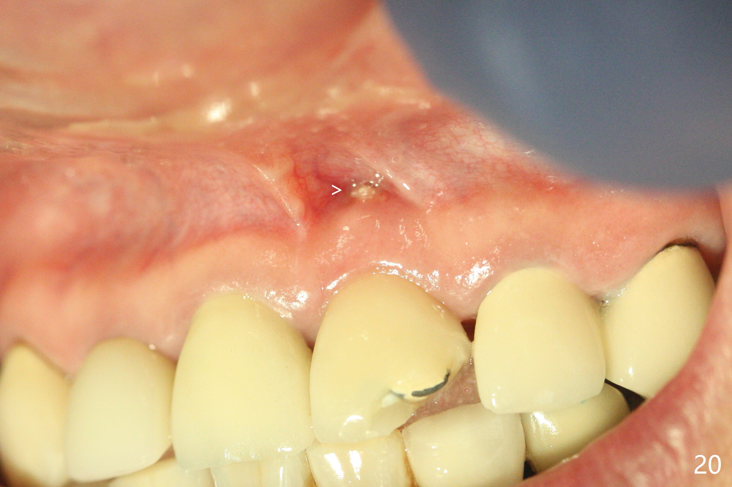 The buccal contour at #9 seems to be slightly concave preop (Fig.1,2 (*)). In fact the buccal plate is found to be lost when the tooth is extracted. Osteotomy is initiated as palatal as possible apical, but the occlusion dictates the coronal end of the osteotomy should be buccal, leaving the buccal gap ~ 2 mm for bone graft. The initial osteotomy (18 mm deep) appears to be close to the Incisive Foramen (Fig.3 blue dashed line). The nasal floor appears to be intact when the drill is removed. Subsequent osteotomy is adjusted so that the apical end of the osteotomy moves distal; when a 3.8x15 mm dummy implant is partially placed, there is clearance (Fig.4). It remains so when a definitive implant is seated (Fig.5); Vanilla graft is placed (Fig.5 *) before placement of a 4.5x5.5(3) mm abutment. More allograft is placed when an immediate provisional is fabricated (Fig.6 arrow and *). The gingiva remains to be recessive 1 month postop (Fig.7). It seems to be related to the bulky gingival margin of the provisional (Fig.8 *). After trimming the latter (Fig.9 *), the gingival margin immediately returns close to normal (Fig.10). The gingival margin is even between #8 and 9 two months postop, but the bone graft is exposed apically (Fig.11 ^). It may heals by itself. Otherwise debridement, regraft, PRF and suture are pending. The coronal portion of the socket heals 4 months postop (Fig.12). The gingival cuff forms by the immediate provisional (which is removed for impression) 4 months postop (Fig.13 *). While the full Zirconia crown at #7 remains intact (Fig.14), the PFM at #9 has porcelain chip (Fig.15). It is partially due to the occlusion; while the crown at #7 has clearance with the opposing dentition (Fig.16 *), the one at #9 has no. The access hole at #9 (Fig.17 *) seems to weaken the crown structure. There is no access hole at #7. No solid posterior support is another contributing factor for chip (Fig.18). The buccal plate has mild atrophy at #7 and 9 (Fig.19 *). A piece of bone graft is being expelled apically at #9 (Fig.20 >) and is removed subsequently (Fig.21). Before impression for repacking porcelain, the opposing incisal edge has been shortened (Fig.22 arrows, as compared to Fig.16). Since the ideal access hole is at the incisal edge (Fig.25 black circle), buccal to the existing one (Fig.24 A), the abutment is torqued before the repaired crown is recemented (Fig.23). Finally the crown has occlusal clearance (Fig.26). Porcelain chips again around the access hole of PFM 1.5 years post 2nd cementation. The dense bone at the crest (*) cannot explain why the abutment is not loose, since it remains incompletely seated (>). As it was trimmed short, an angled abutment is used (Fig.28). The coronal end is lingual, while #9/24 is edge to edge. The lingual aspect of the coronal end of the abutment is heavily trimmed to reduce bulkiness. To prevent chip, Zirconium crown will be fabricated in spite of the fact that it does not match the PFM of #8 (potential shade discrepancy). The patient is pleased with the new Zirconia crown (Fig.29).