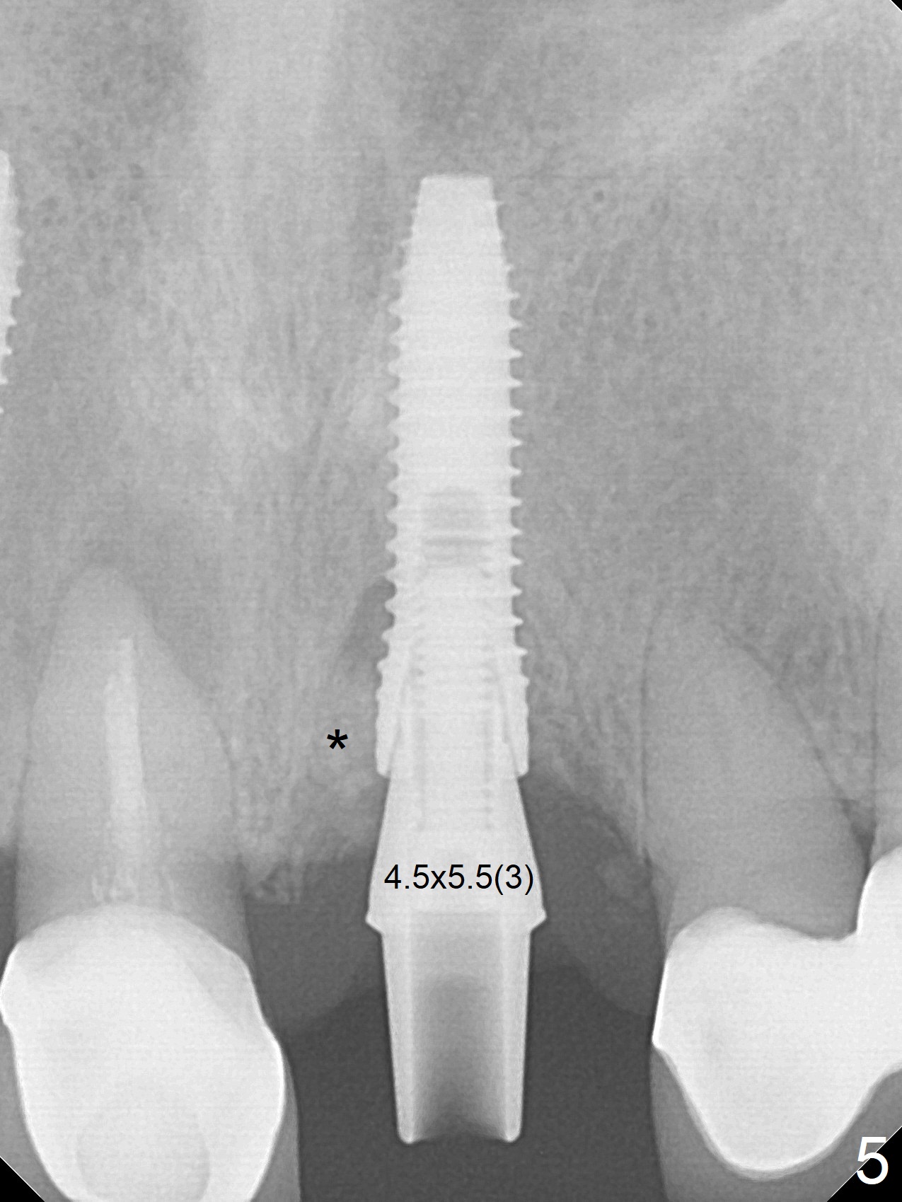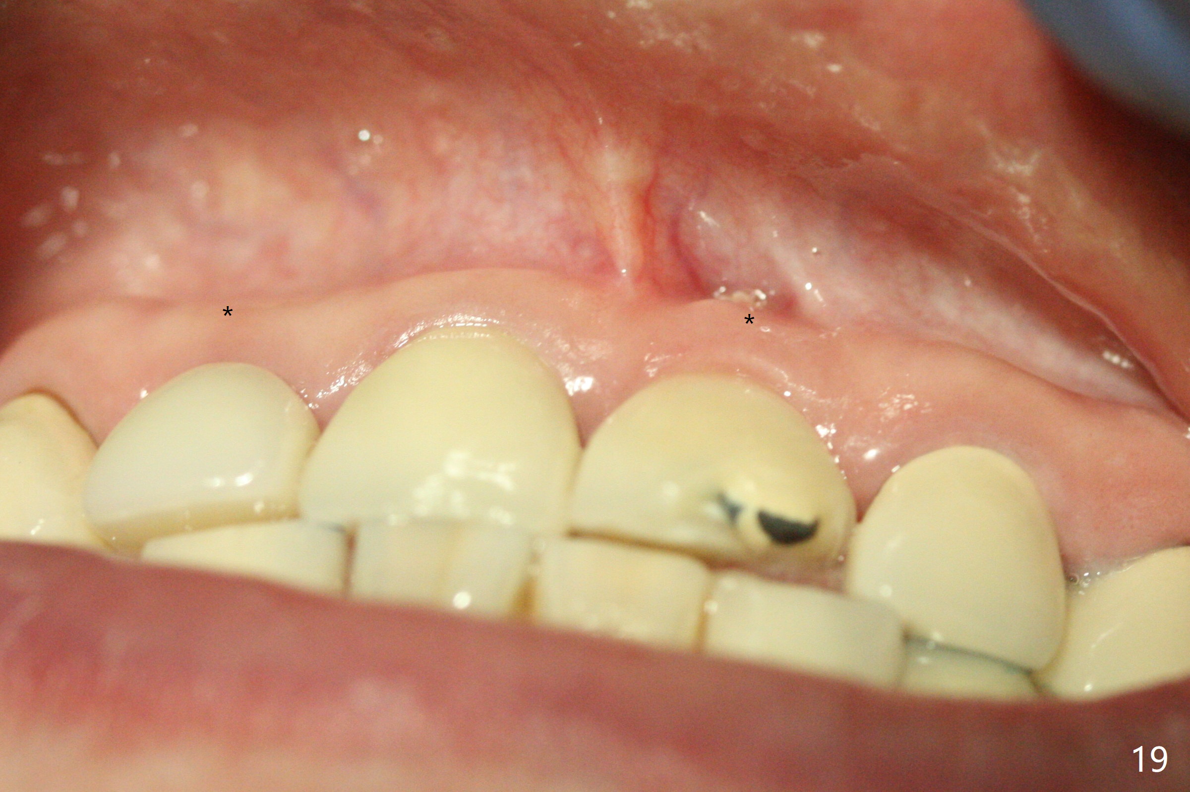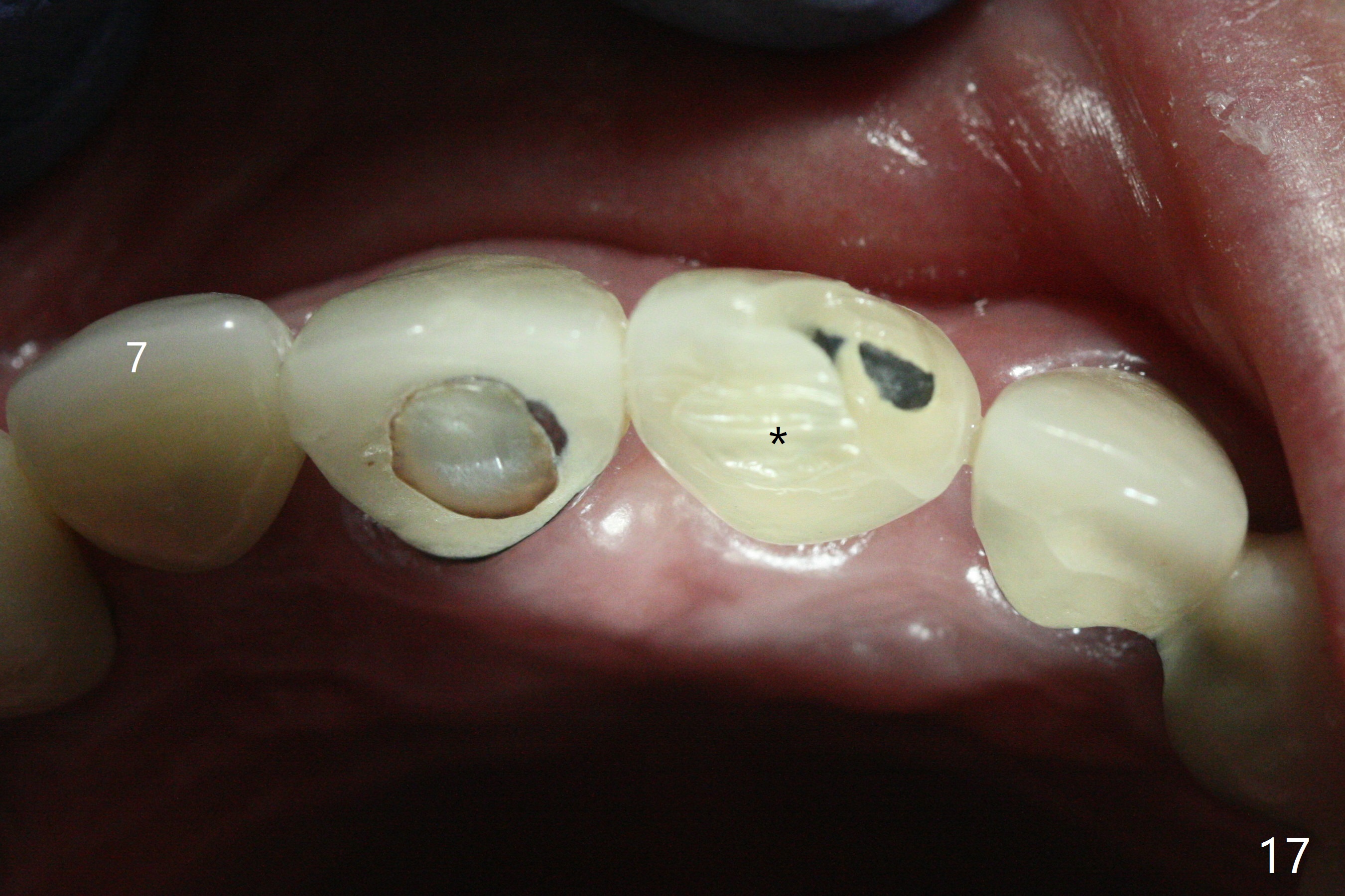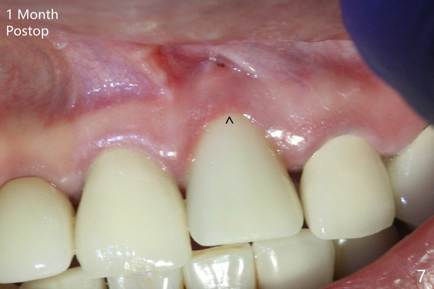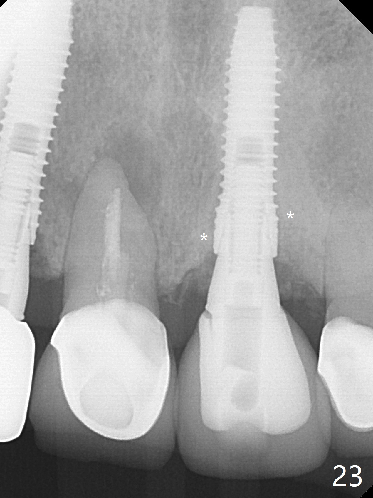 The buccal contour at #9 seems to be slightly concave preop (Fig.1,2 (*)). In fact the buccal plate is found to be lost when the tooth is extracted. Osteotomy is initiated as palatal as possible apical, but the occlusion dictates the coronal end of the osteotomy should be buccal, leaving the buccal gap ~ 2 mm for bone graft. The initial osteotomy (18 mm deep) appears to be close to the Incisive Foramen (Fig.3 blue dashed line). The nasal floor appears to be intact when the drill is removed. Subsequent osteotomy is adjusted so that the apical end of the osteotomy moves distal; when a 3.8x15 mm dummy implant is partially placed, there is clearance (Fig.4). It remains so when a definitive implant is seated (Fig.5); Vanilla graft is placed (Fig.5 *) before placement of a 4.5x5.5(3) mm abutment. More allograft is placed when an immediate provisional is fabricated (Fig.6 arrow and *). The gingiva remains to be recessive 1 month postop (Fig.7). It seems to be related to the bulky gingival margin of the provisional (Fig.8 *). After trimming the latter (Fig.9 *), the gingival margin immediately returns close to normal (Fig.10). The gingival margin is even between #8 and 9 two months postop, but the bone graft is exposed apically (Fig.11 ^). It may heals by itself. Otherwise debridement, regraft, PRF and suture are pending. The coronal portion of the socket heals 4 months postop (Fig.12). The gingival cuff forms by the immediate provisional (which is removed for impression) 4 months postop (Fig.13 *). While the full Zirconia crown at #7 remains intact (Fig.14), the PFM at #9 has porcelain chip (Fig.15). It is partially due to the occlusion; while the crown at #7 has clearance with the opposing dentition (Fig.16 *), the one at #9 has no. The access hole at #9 (Fig.17 *) seems to weaken the crown structure. There is no access hole at #7. No solid posterior support is another contributing factor for chip (Fig.18). The buccal plate has mild atrophy at #7 and 9 (Fig.19 *). A piece of bone graft is being expelled apically at #9 (Fig.20 >) and is removed subsequently (Fig.21). Before impression for repacking porcelain, the opposing incisal edge has been shortened (Fig.22 arrows, as compared to Fig.16). Since the ideal access hole is at the incisal edge (Fig.25 black circle), buccal to the existing one (Fig.24 A), the abutment is torqued before the repaired crown is recemented (Fig.23). Finally the crown has occlusal clearance (Fig.26). Porcelain chips again around the access hole of PFM 1.5 years post 2nd cementation. The dense bone at the crest (*) cannot explain why the abutment is not loose, since it remains incompletely seated (>). As it was trimmed short, an angled abutment is used (Fig.28). The coronal end is lingual, while #9/24 is edge to edge. The lingual aspect of the coronal end of the abutment is heavily trimmed to reduce bulkiness. To prevent chip, Zirconium crown will be fabricated in spite of the fact that it does not match the PFM of #8 (potential shade discrepancy). The patient is pleased with the new Zirconia crown (Fig.29).