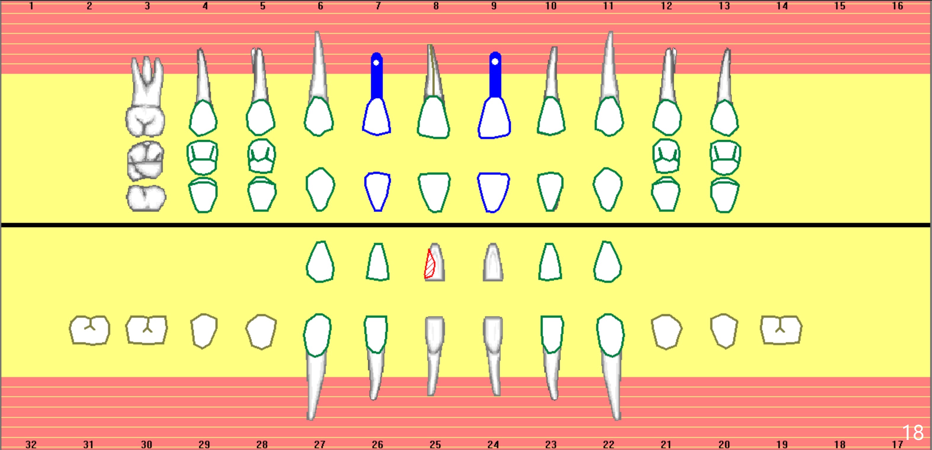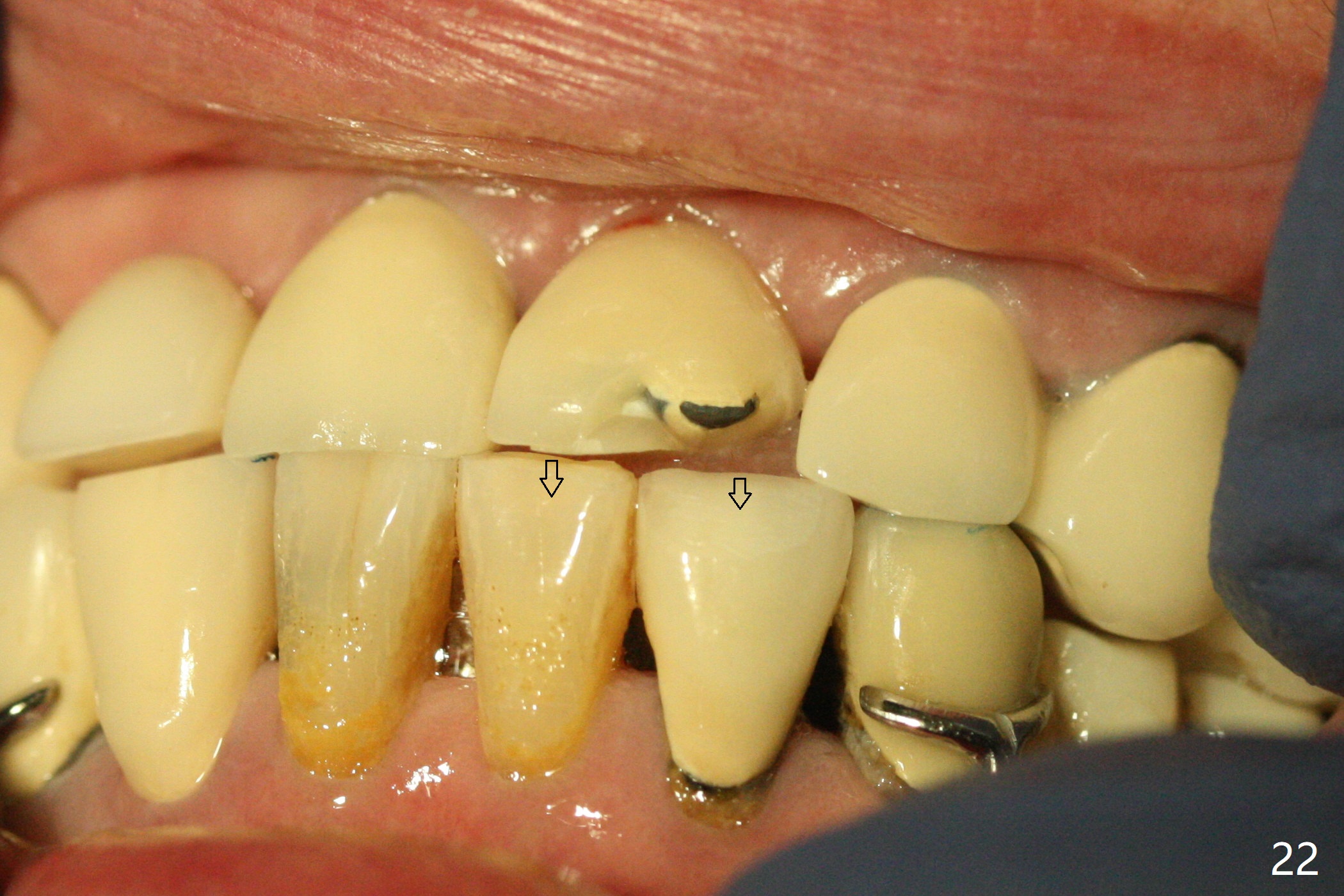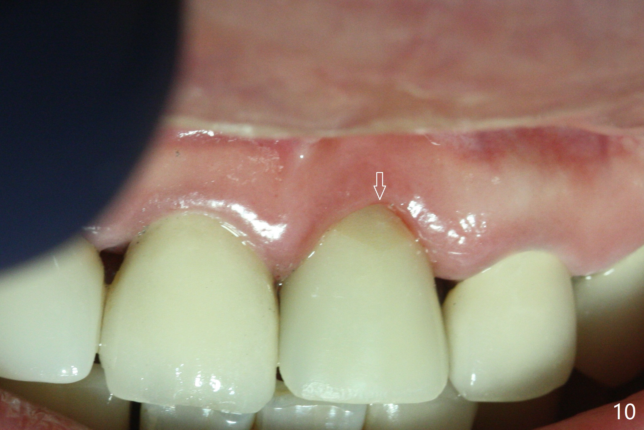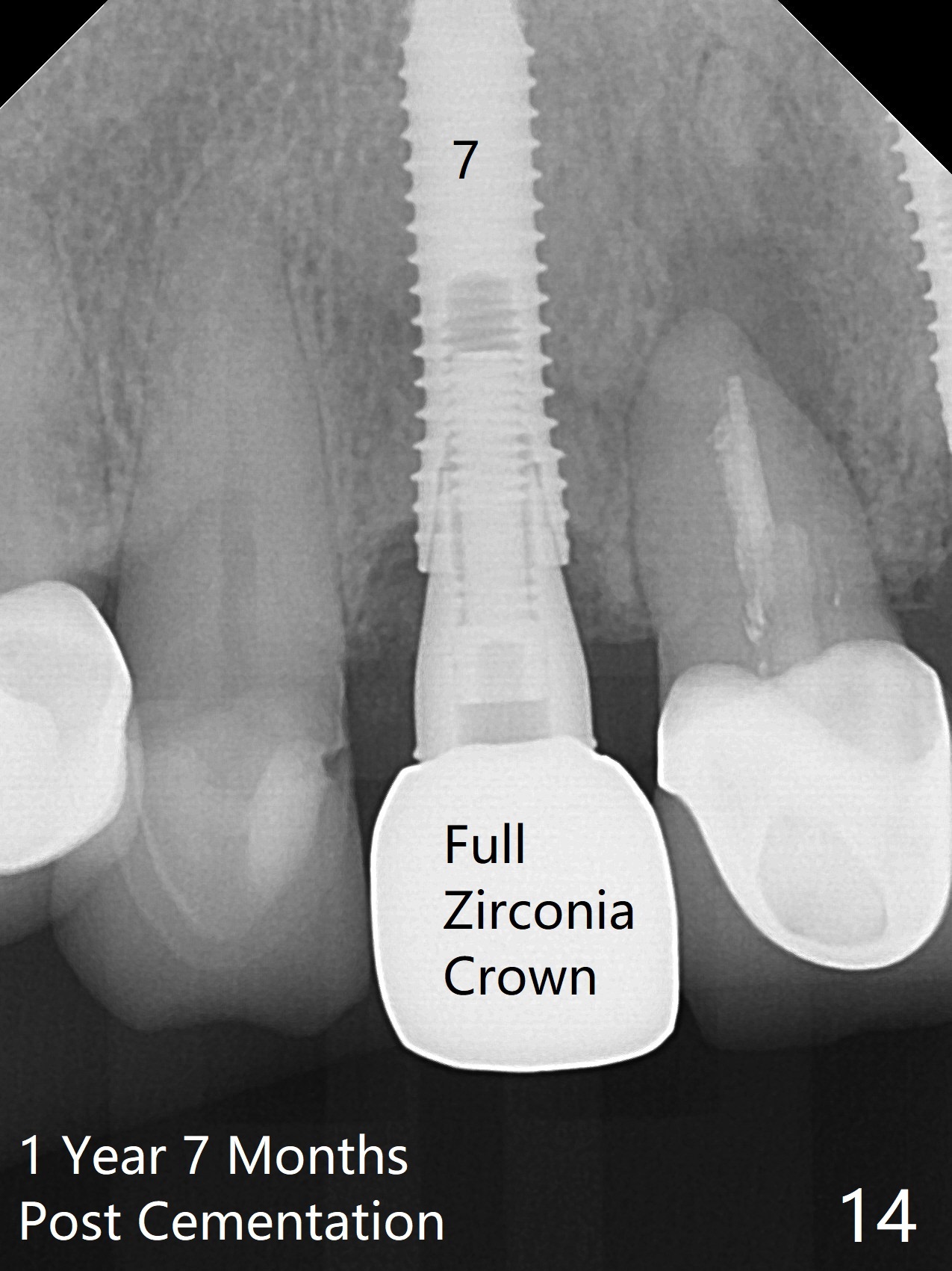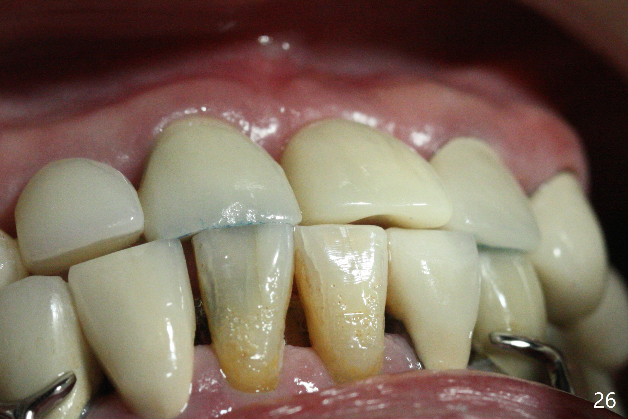 The buccal contour at #9 seems to be slightly concave preop (Fig.1,2 (*)). In fact the buccal plate is found to be lost when the tooth is extracted. Osteotomy is initiated as palatal as possible apical, but the occlusion dictates the coronal end of the osteotomy should be buccal, leaving the buccal gap ~ 2 mm for bone graft. The initial osteotomy (18 mm deep) appears to be close to the Incisive Foramen (Fig.3 blue dashed line). The nasal floor appears to be intact when the drill is removed. Subsequent osteotomy is adjusted so that the apical end of the osteotomy moves distal; when a 3.8x15 mm dummy implant is partially placed, there is clearance (Fig.4). It remains so when a definitive implant is seated (Fig.5); Vanilla graft is placed (Fig.5 *) before placement of a 4.5x5.5(3) mm abutment. More allograft is placed when an immediate provisional is fabricated (Fig.6 arrow and *). The gingiva remains to be recessive 1 month postop (Fig.7). It seems to be related to the bulky gingival margin of the provisional (Fig.8 *). After trimming the latter (Fig.9 *), the gingival margin immediately returns close to normal (Fig.10). The gingival margin is even between #8 and 9 two months postop, but the bone graft is exposed apically (Fig.11 ^). It may heals by itself. Otherwise debridement, regraft, PRF and suture are pending. The coronal portion of the socket heals 4 months postop (Fig.12). The gingival cuff forms by the immediate provisional (which is removed for impression) 4 months postop (Fig.13 *). While the full Zirconia crown at #7 remains intact (Fig.14), the PFM at #9 has porcelain chip (Fig.15). It is partially due to the occlusion; while the crown at #7 has clearance with the opposing dentition (Fig.16 *), the one at #9 has no. The access hole at #9 (Fig.17 *) seems to weaken the crown structure. There is no access hole at #7. No solid posterior support is another contributing factor for chip (Fig.18). The buccal plate has mild atrophy at #7 and 9 (Fig.19 *). A piece of bone graft is being expelled apically at #9 (Fig.20 >) and is removed subsequently (Fig.21). Before impression for repacking porcelain, the opposing incisal edge has been shortened (Fig.22 arrows, as compared to Fig.16). Since the ideal access hole is at the incisal edge (Fig.25 black circle), buccal to the existing one (Fig.24 A), the abutment is torqued before the repaired crown is recemented (Fig.23). Finally the crown has occlusal clearance (Fig.26). Porcelain chips again around the access hole of PFM 1.5 years post 2nd cementation. The dense bone at the crest (*) cannot explain why the abutment is not loose, since it remains incompletely seated (>). As it was trimmed short, an angled abutment is used (Fig.28). The coronal end is lingual, while #9/24 is edge to edge. The lingual aspect of the coronal end of the abutment is heavily trimmed to reduce bulkiness. To prevent chip, Zirconium crown will be fabricated in spite of the fact that it does not match the PFM of #8 (potential shade discrepancy). The patient is pleased with the new Zirconia crown (Fig.29).