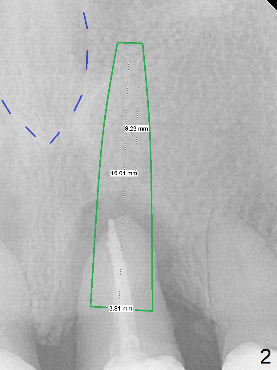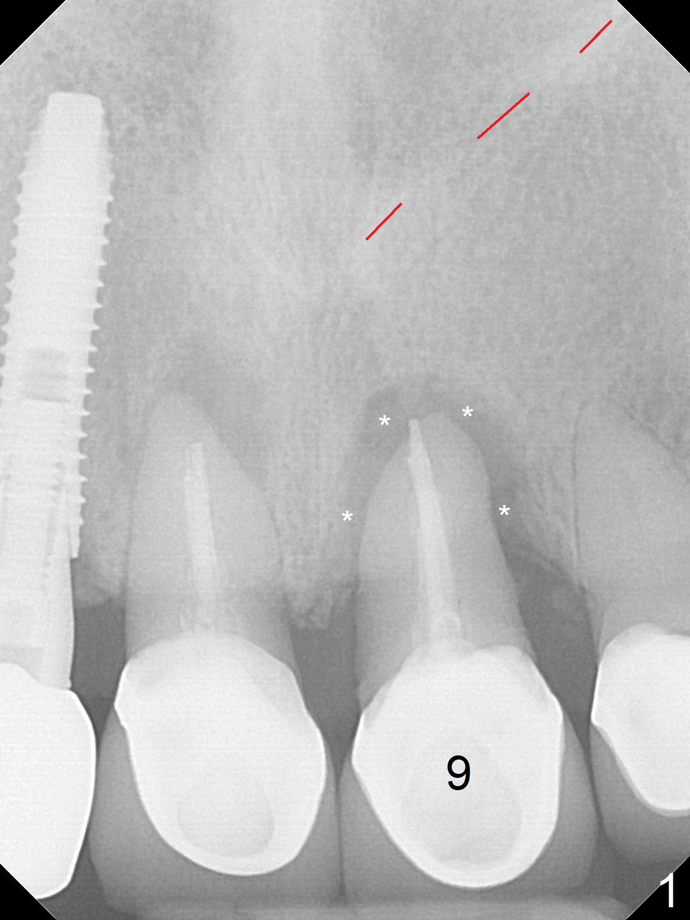 A 61-year-old woman returns with chief complaint of "loose tooth" at #9 nine month post cementation at #7 (Fig.1 (periradicular radiolucency (*)). Because of lack of posterior support, a long implant will be placed immediately post extraction (Fig.2). Be careful of the nasal floor, which is slanted (Fig.1 red dashed line). It seems that the implant at the central incisor would be shorter than that at the lateral one. The diameter should be the same. Take PA after 2 mm drill to avoid the Incisive Foramen (Fig.2 blue dashed line).