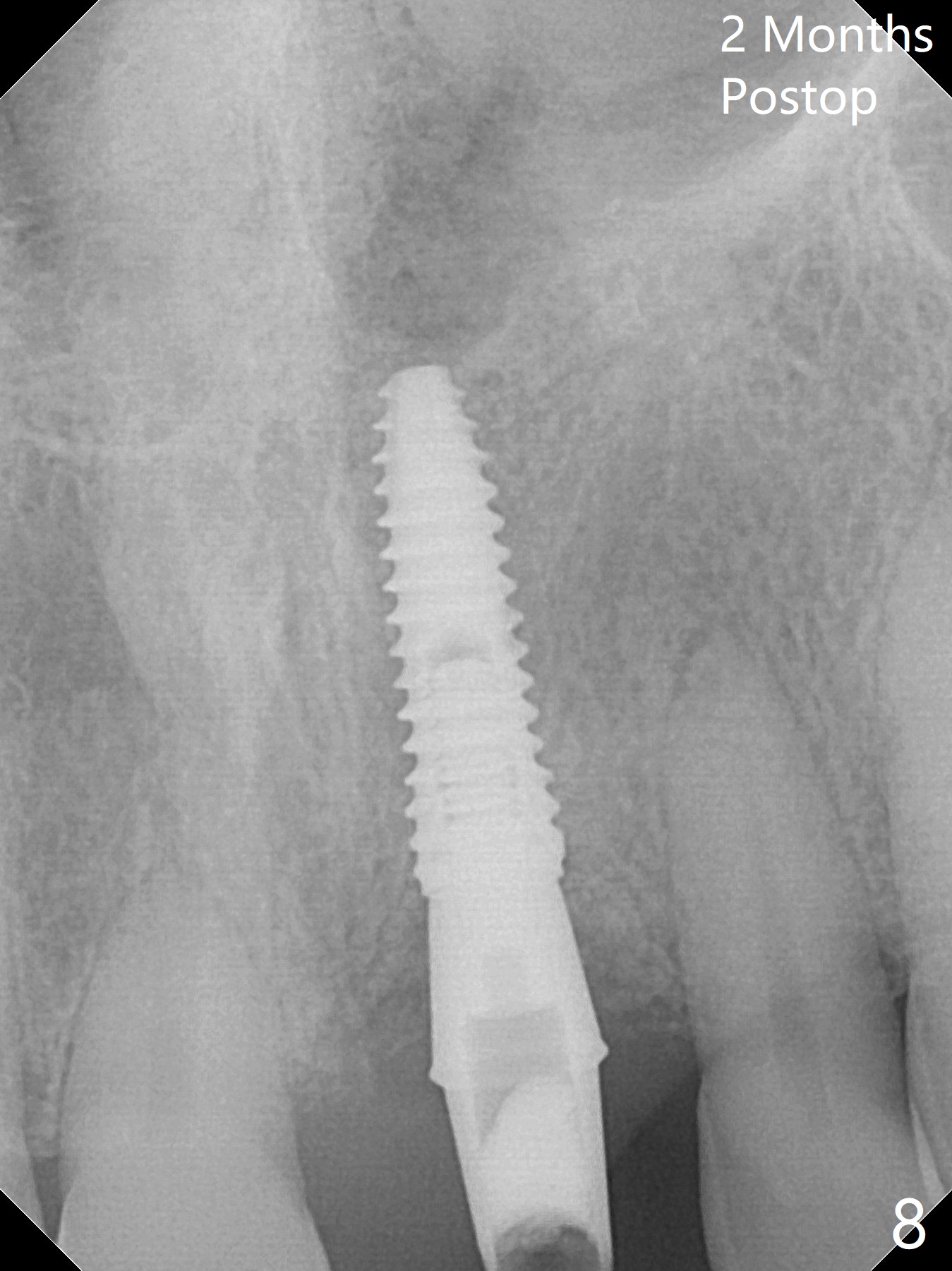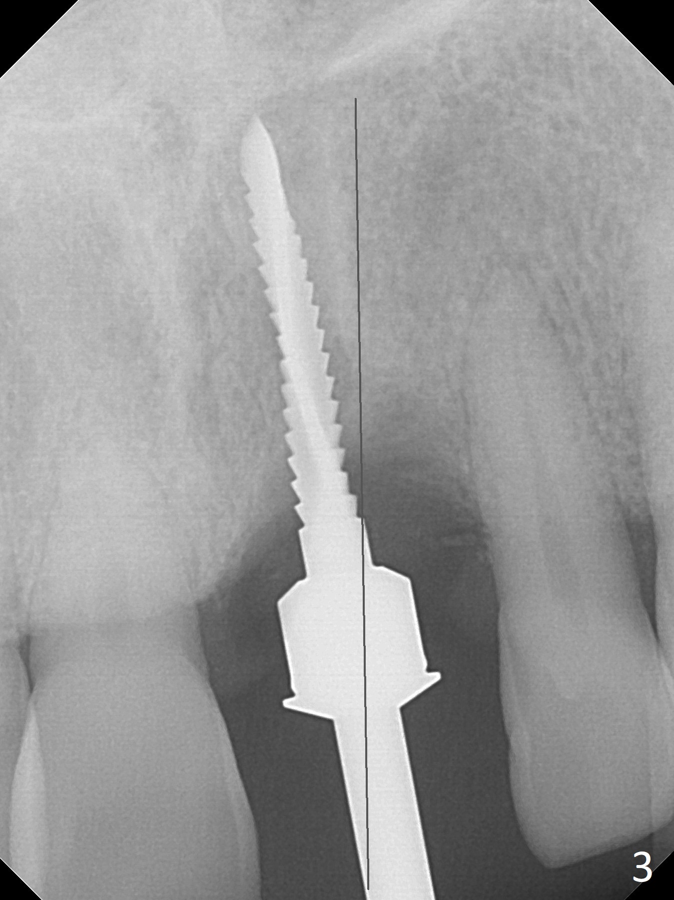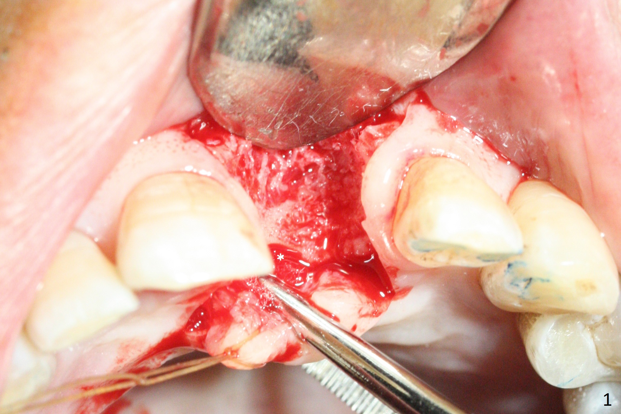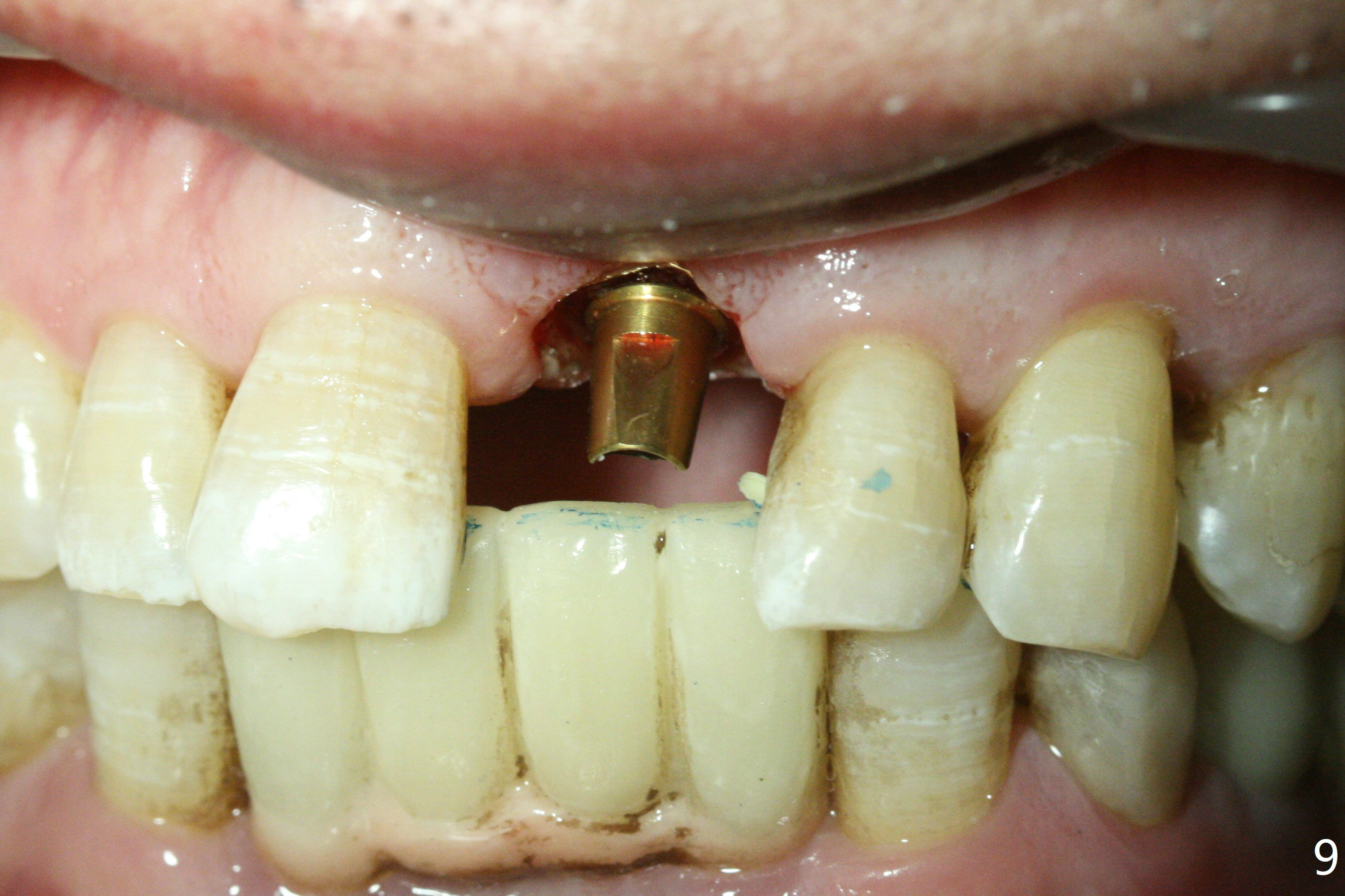 Preop examination shows mobility I of the teeth #8 and 10 and apparent occlusal trauma from #22-26 implant bridge. After occlusal equilibrium, incision reveals low, but moderate ridge at #9 (Fig.1). Fig.2a is a cross section of a normal upper incisor socket with thin buccal plate (B) and thick palatal one (P). It is difficult to initiate osteotomy in the oblique palatal wall when the buccal plate is resorbed (Fig.2b). In this case with horizontal buccal and palatal plate bone loss, the socket bottom is flat (Fig.2c), easy for osteotomy (Fig.2d green arrow, Fig.3). The initial osteotomy deviates mesial (Fig.3). To avoid perforation into the Incisive Canal, the trajectory is changed (Fig.4). After use of the final drill (3 mm), the coronal Incisive Canal is perforated. Following placement of a 3.5x13 mm implant and 4.5x5.5(4) mm abutment, Vanilla Graft is placed (Fig.5 *) to repair the perforation. Retrospectively, the coronal end of the Incisive Canal is revealed at incision (Fig.1 *). The initial osteotomy should be slightly more distal (Fig.3 black line). The buccal plate looks bulky due to placement of the abutment and bone graft 1 week postop (Fig.6,7 (crown dislodgement)). The bone graft appears to remain in place 2 months postop (Fig.8). Impression is taken because of instability of the immediate provisional (Fig.9 after Laser gingivectomy). The gingiva and buccal plate remain healthy 4.5 months postop (Fig.10). A permanent crown is cemented (Fig.11).