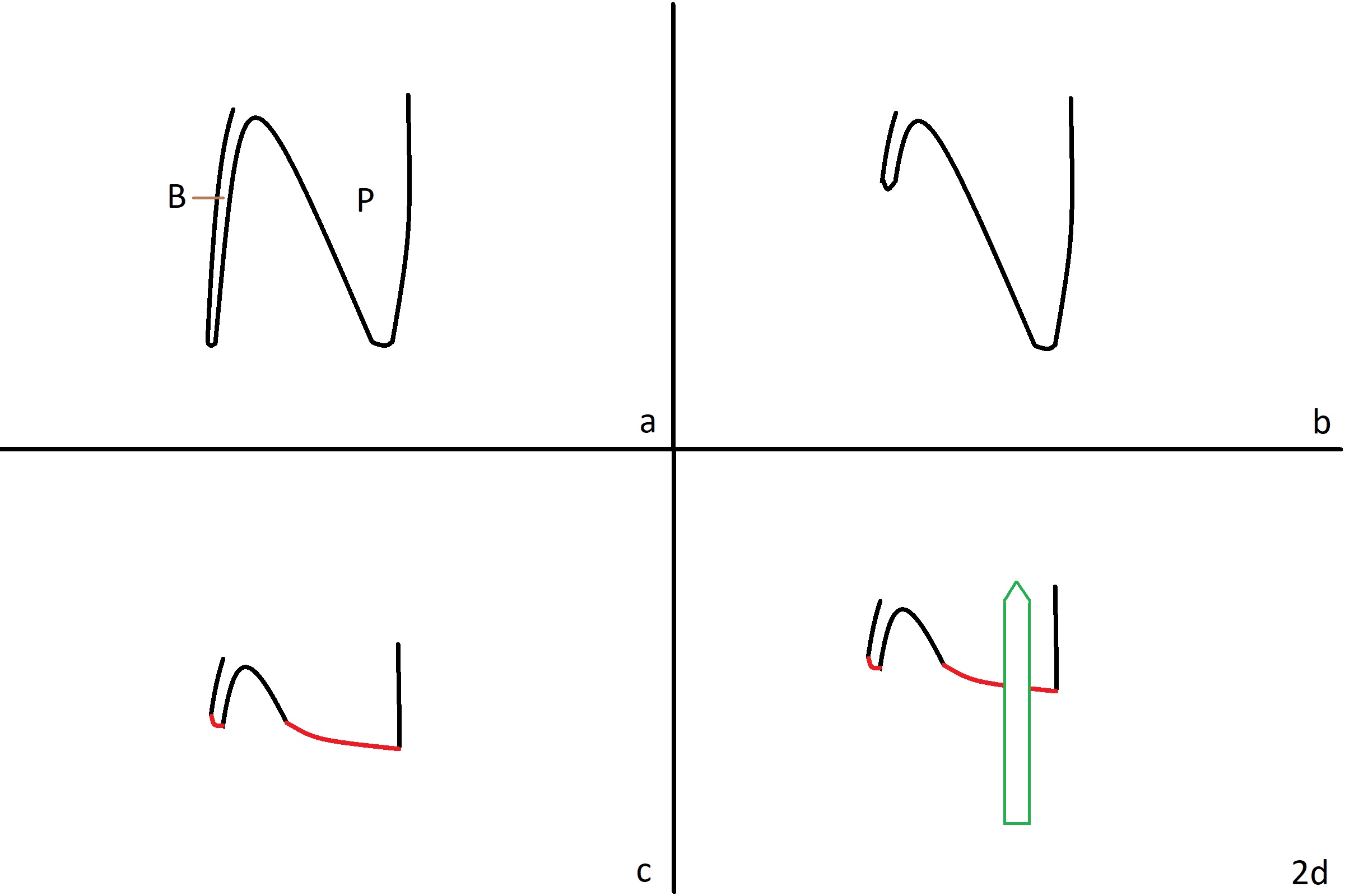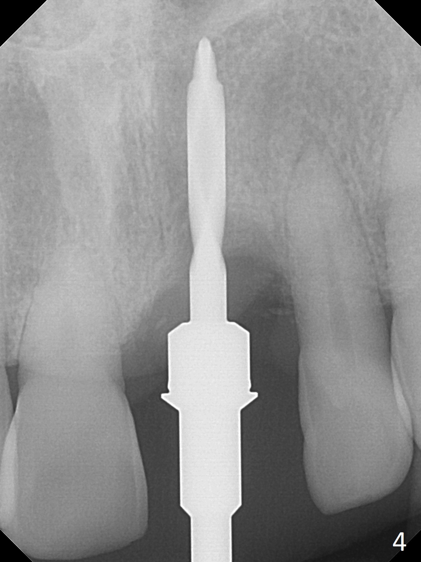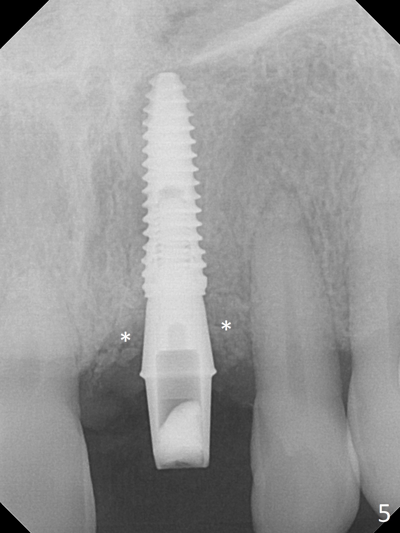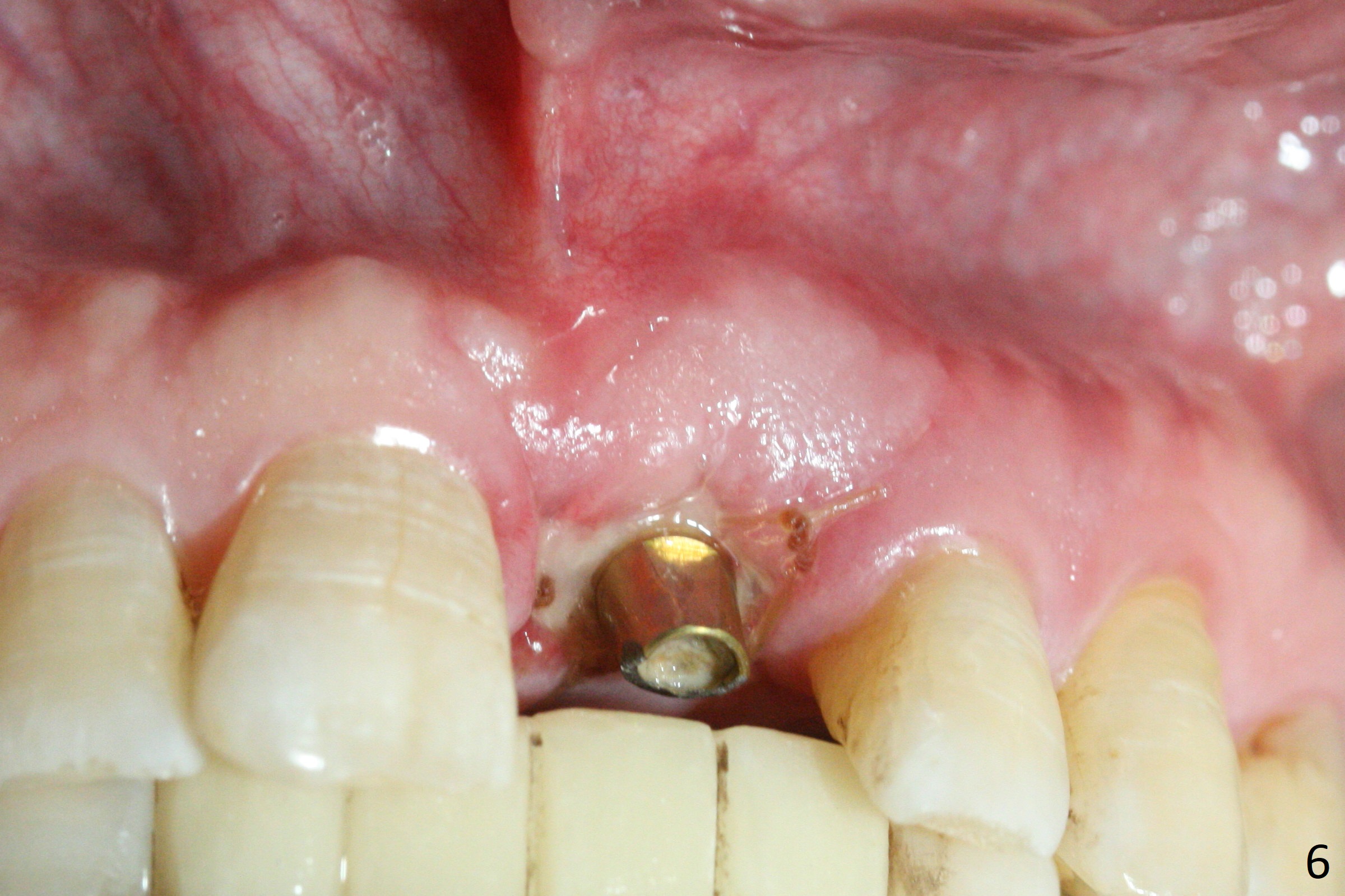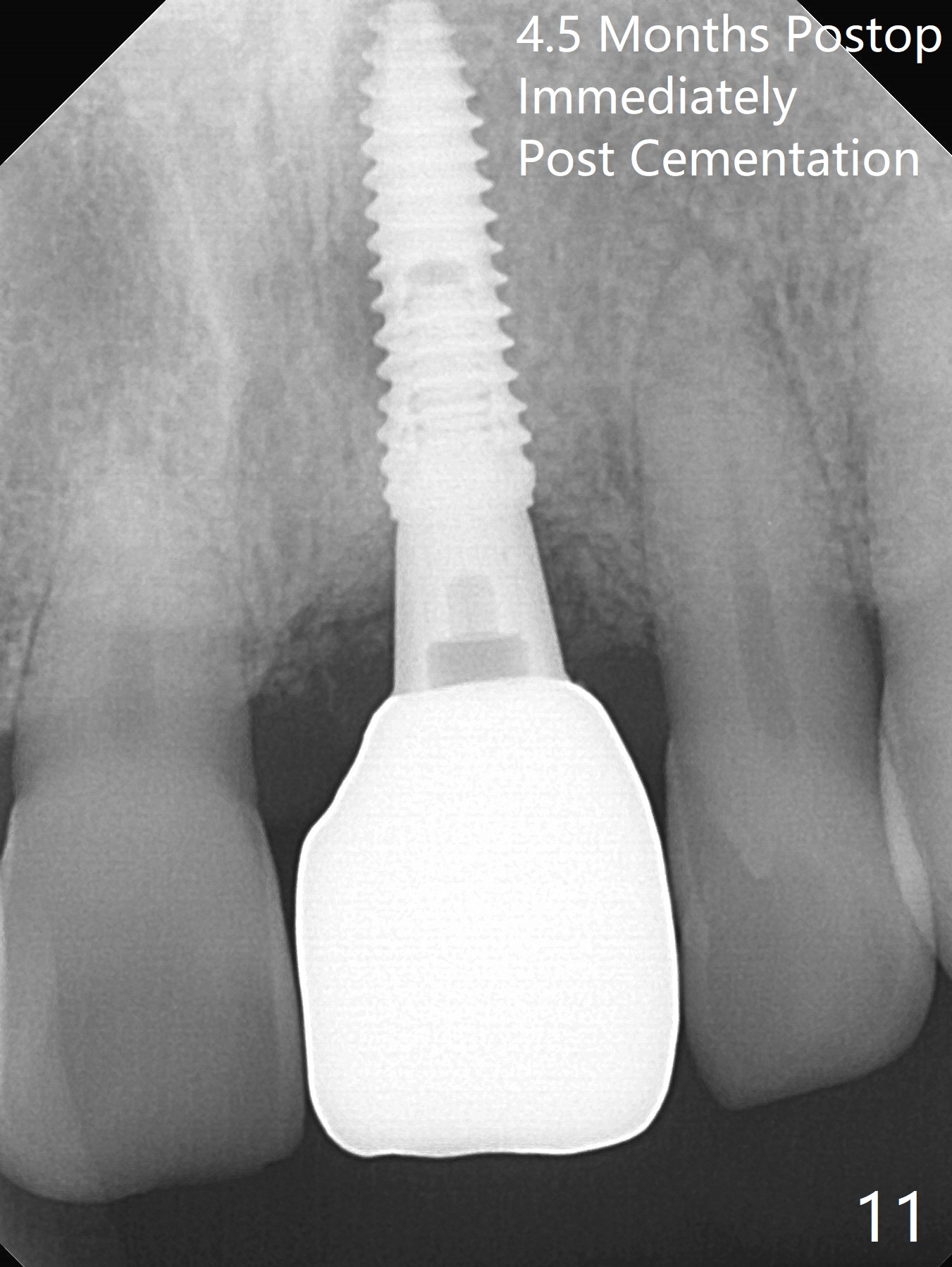 Preop examination shows mobility I of the teeth #8 and 10 and apparent occlusal trauma from #22-26 implant bridge. After occlusal equilibrium, incision reveals low, but moderate ridge at #9 (Fig.1). Fig.2a is a cross section of a normal upper incisor socket with thin buccal plate (B) and thick palatal one (P). It is difficult to initiate osteotomy in the oblique palatal wall when the buccal plate is resorbed (Fig.2b). In this case with horizontal buccal and palatal plate bone loss, the socket bottom is flat (Fig.2c), easy for osteotomy (Fig.2d green arrow, Fig.3). The initial osteotomy deviates mesial (Fig.3). To avoid perforation into the Incisive Canal, the trajectory is changed (Fig.4). After use of the final drill (3 mm), the coronal Incisive Canal is perforated. Following placement of a 3.5x13 mm implant and 4.5x5.5(4) mm abutment, Vanilla Graft is placed (Fig.5 *) to repair the perforation. Retrospectively, the coronal end of the Incisive Canal is revealed at incision (Fig.1 *). The initial osteotomy should be slightly more distal (Fig.3 black line). The buccal plate looks bulky due to placement of the abutment and bone graft 1 week postop (Fig.6,7 (crown dislodgement)). The bone graft appears to remain in place 2 months postop (Fig.8). Impression is taken because of instability of the immediate provisional (Fig.9 after Laser gingivectomy). The gingiva and buccal plate remain healthy 4.5 months postop (Fig.10). A permanent crown is cemented (Fig.11).