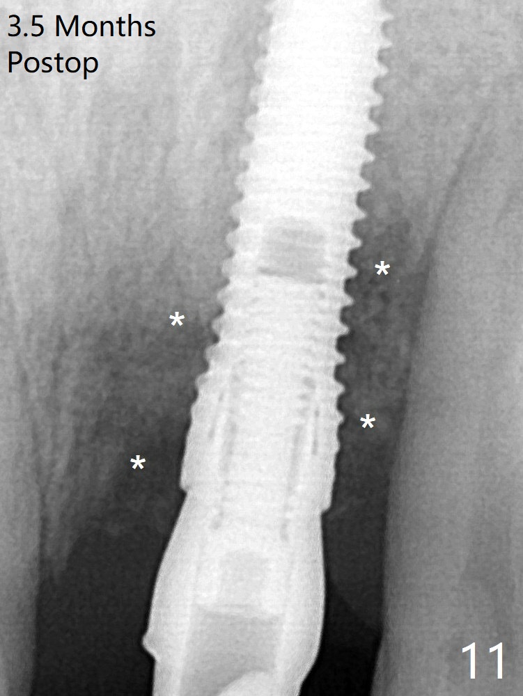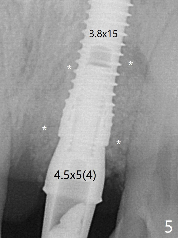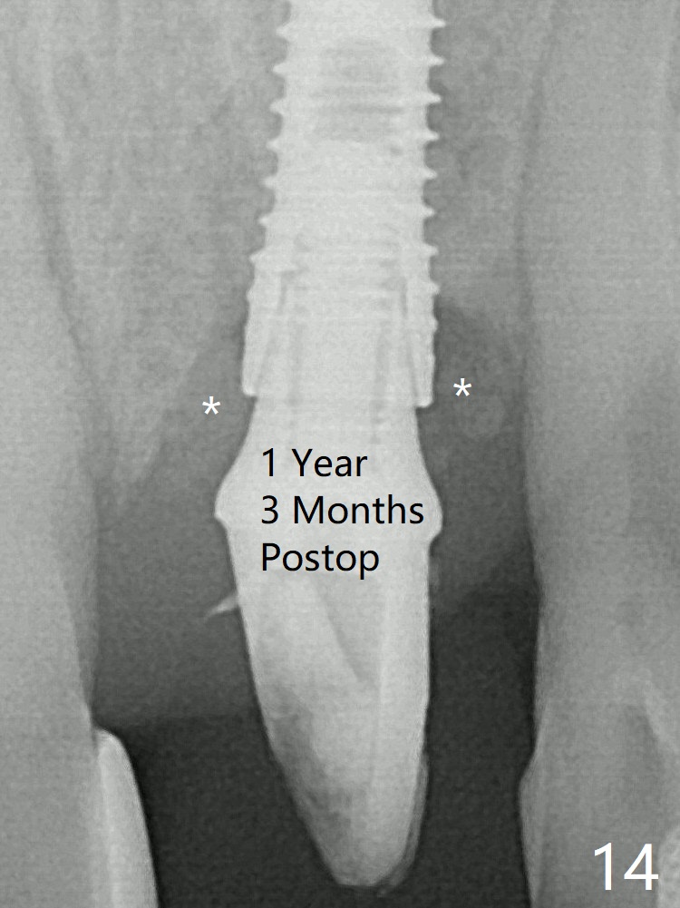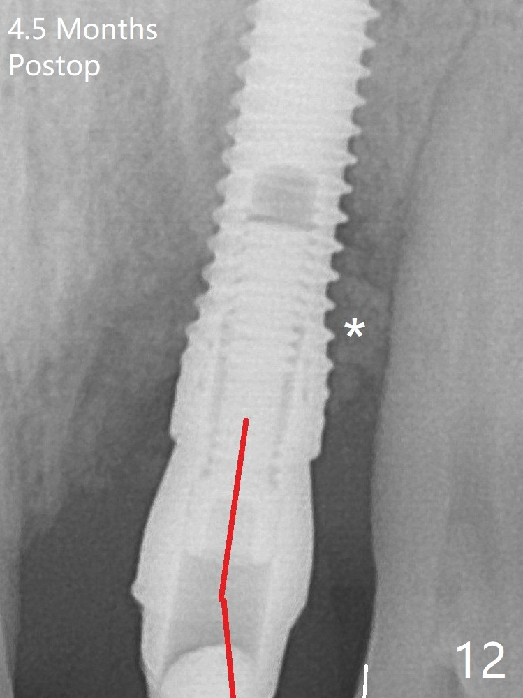 After placement of a 3.8x15 mm implant, PRF is laid against the inner surface of the buccal defect and allograft (Fig.5 *) is packed mainly in the buccal gap before and after insertion of a 4.5x5(4) mm abutment. The bone graft remains in place 3.5 and 4.5 months postop (Fig.11,12 *). Between 3 and 4 months postop, the mesial surface of the abutment has been trimmed (Fig.12 >). Since the mesial surface of the tooth #10 will be reduced (white curved line) to correct the upper dental midline, an angled abutment (red line) seems to be necessary to shift the provisional distal. The socket at UL1 seems to have healed except the most coronal 1 year 3 months postop (Fig.14 *).