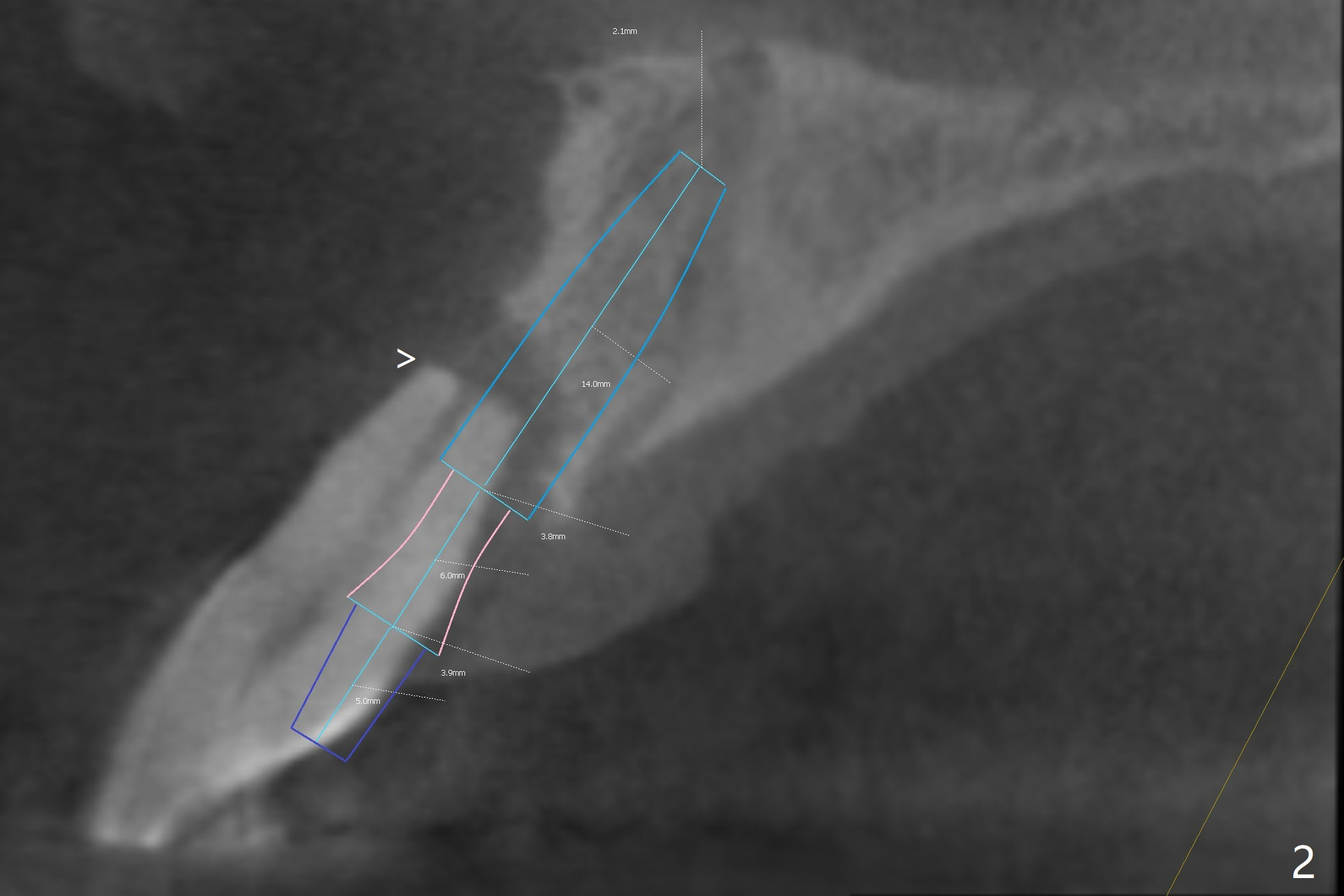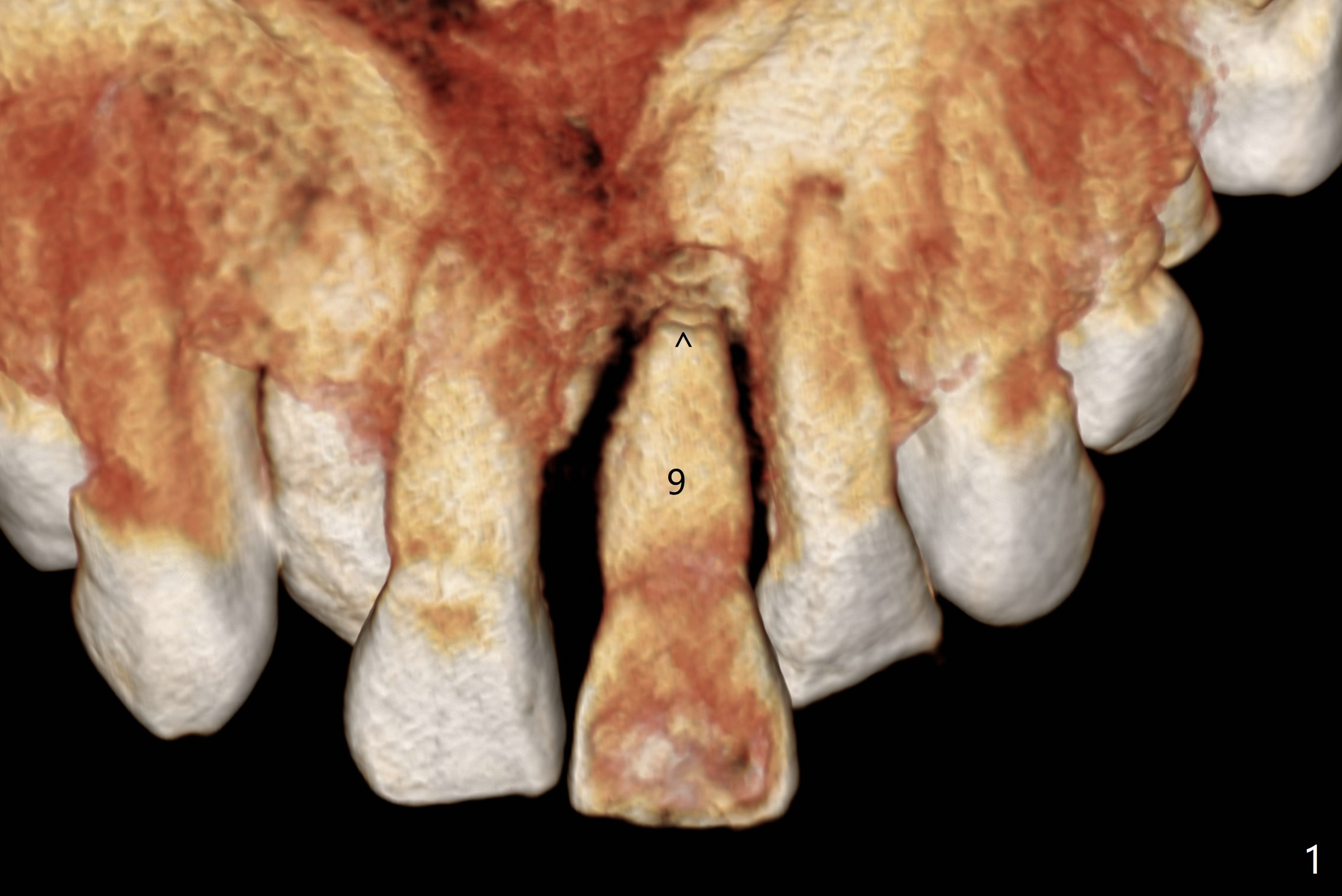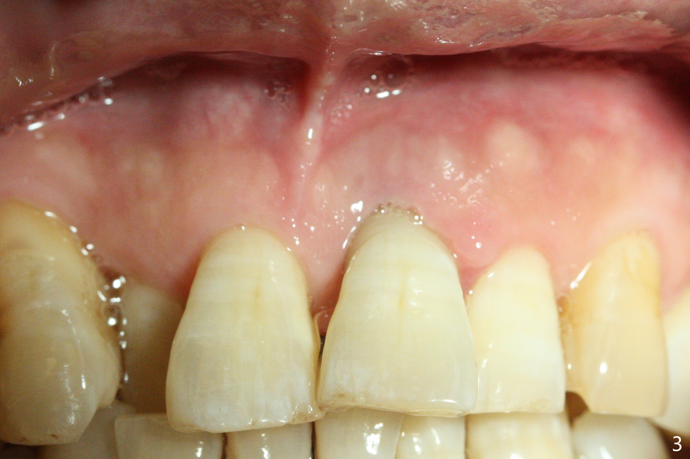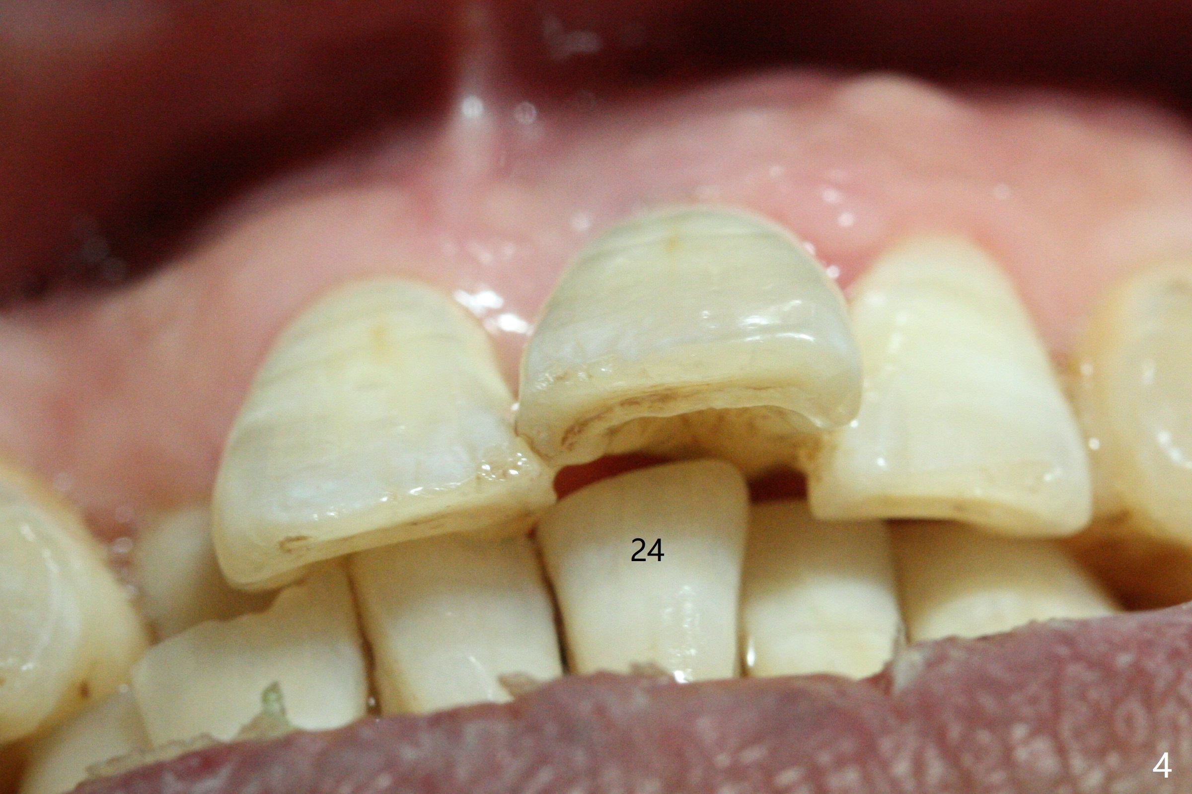 A 47-year-old man has a loose, displaced (Fig.4) central incisor with loss of the buccal plate (Fig.1,2,3) and Root tip resorption (Fig.1,2 arrowheads). Because of severe bone loss, a 6 mm cuff is expected (Fig.2 pink). The incisal edge of the tooth #24 (Fig.4) will be adjusted prior to immediate provisional using a temporary abutment and the natural tooth with access hole. PRF will be used to repair the buccal plate.