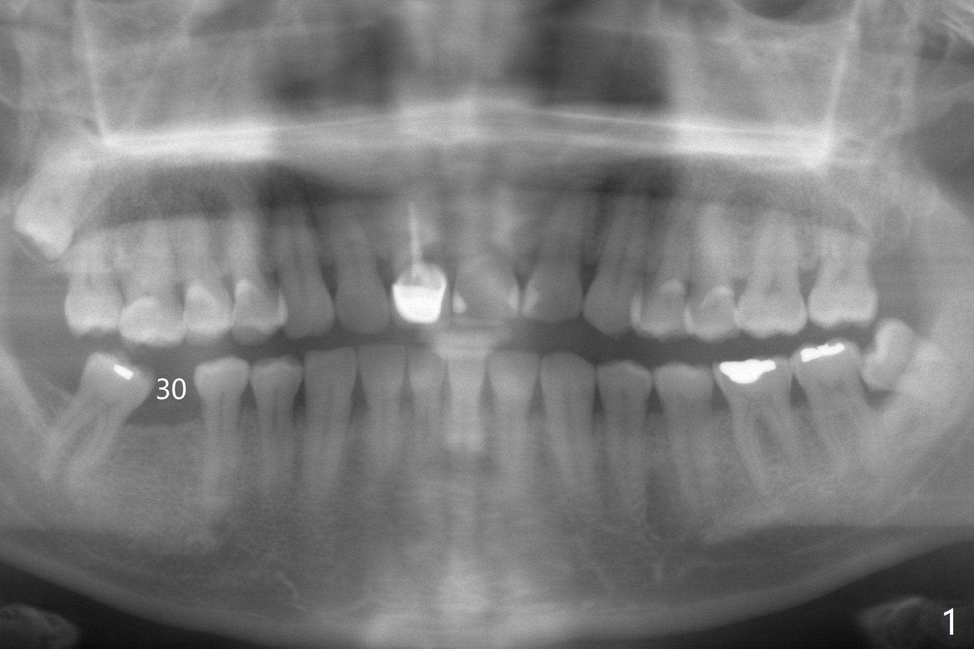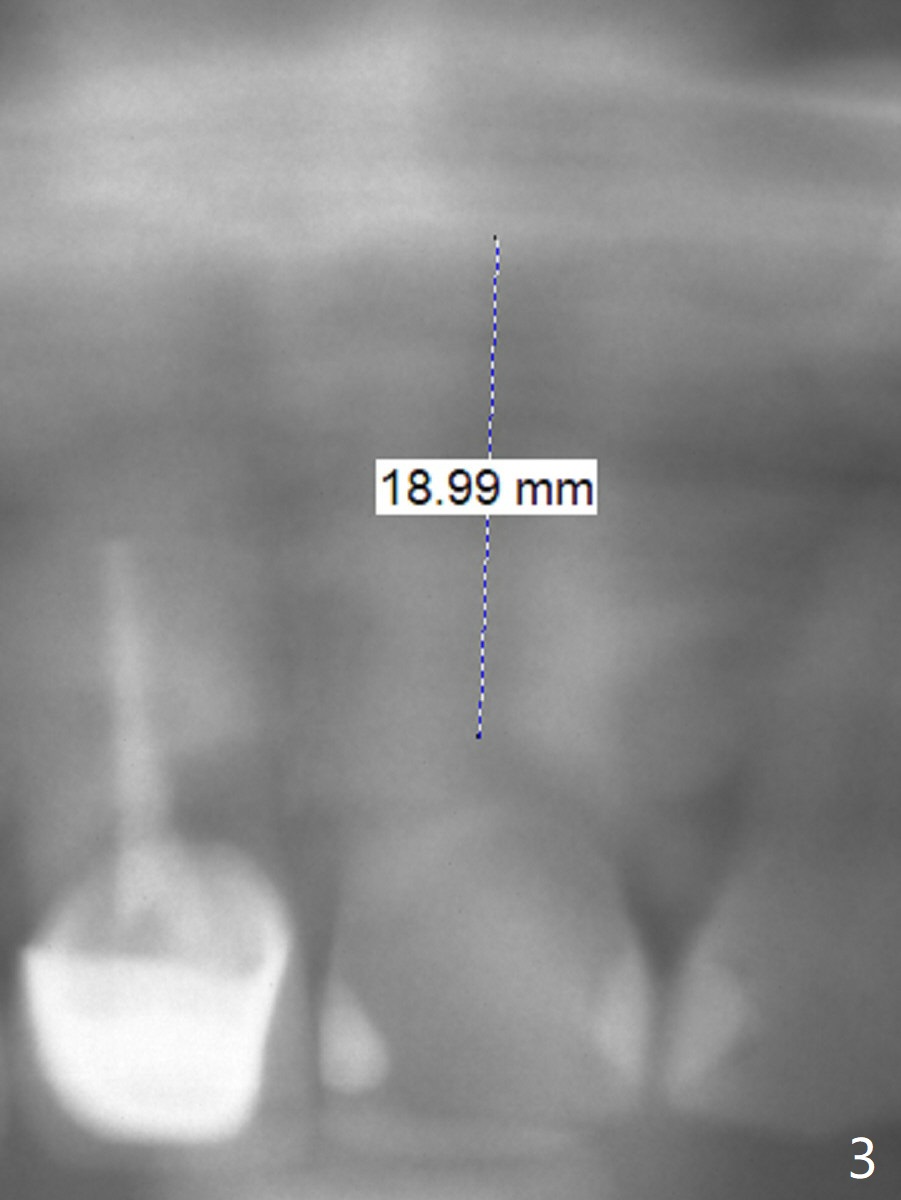 A 54-year-old man appears to be a unilateral masticator because of missing #30 (Fig.1). The left central incisor seems to have root fracture (Fig.2). To counter heavy occlusal force, a long implant will be placed (Fig.2,3).