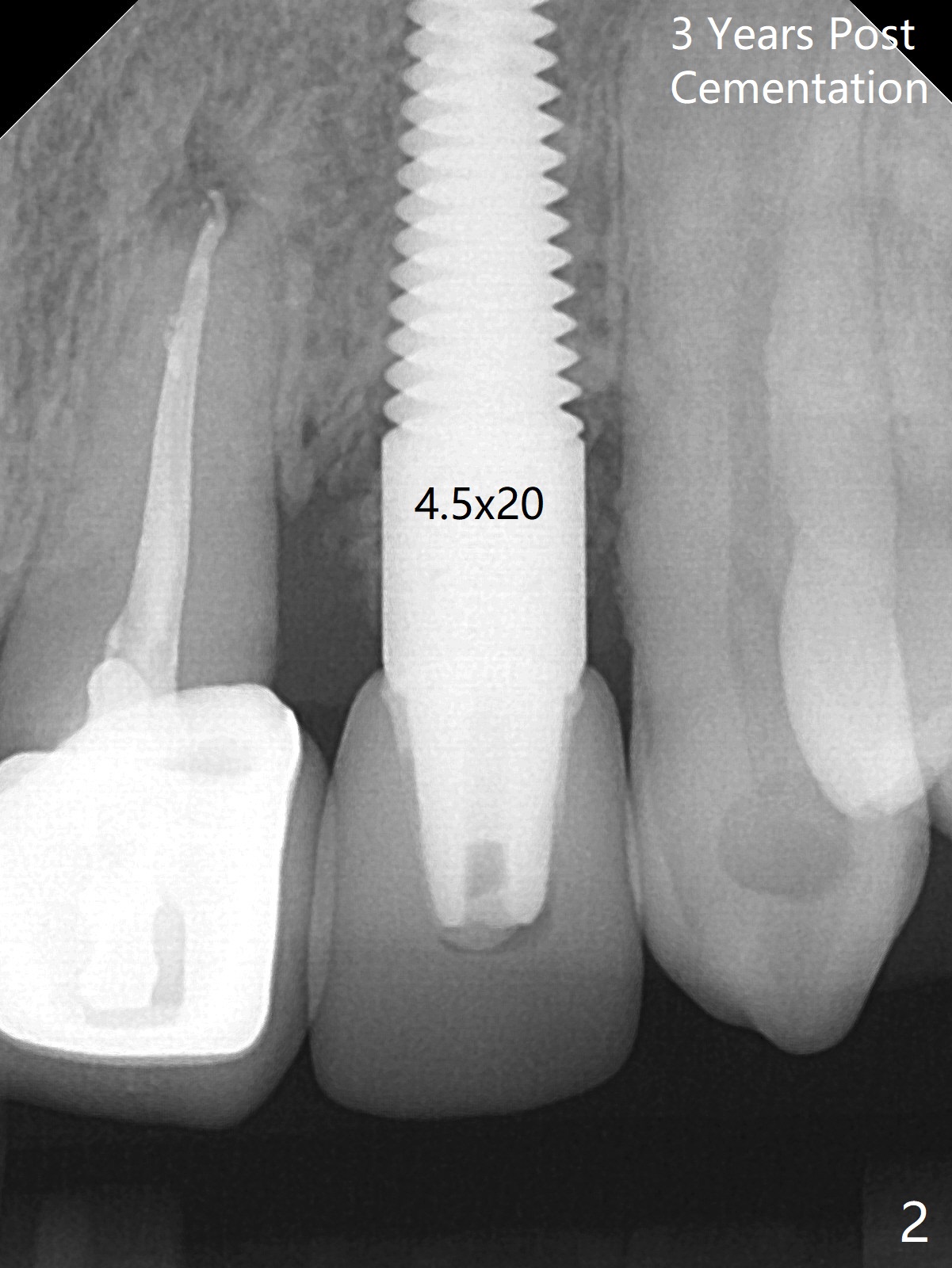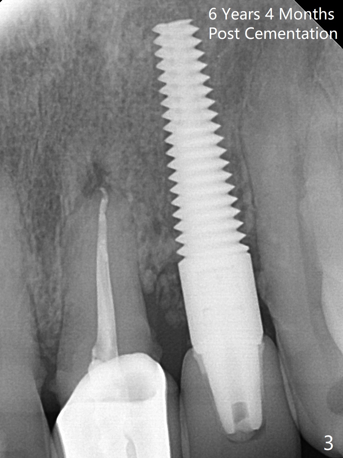 59岁女,口腔卫生差,害怕治疗,左上侧切牙即种牙冠粘固后6年4个月,同意深洗(图三)。虽然软硬组织没有特殊变化,再细点植体可能更好些(图一,二)。