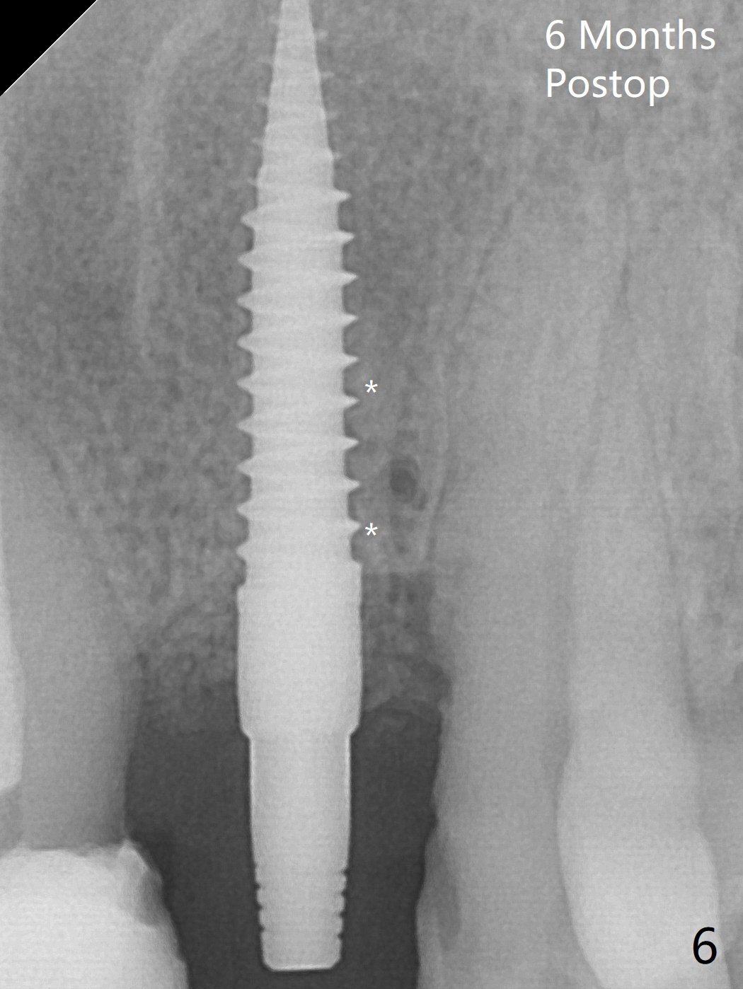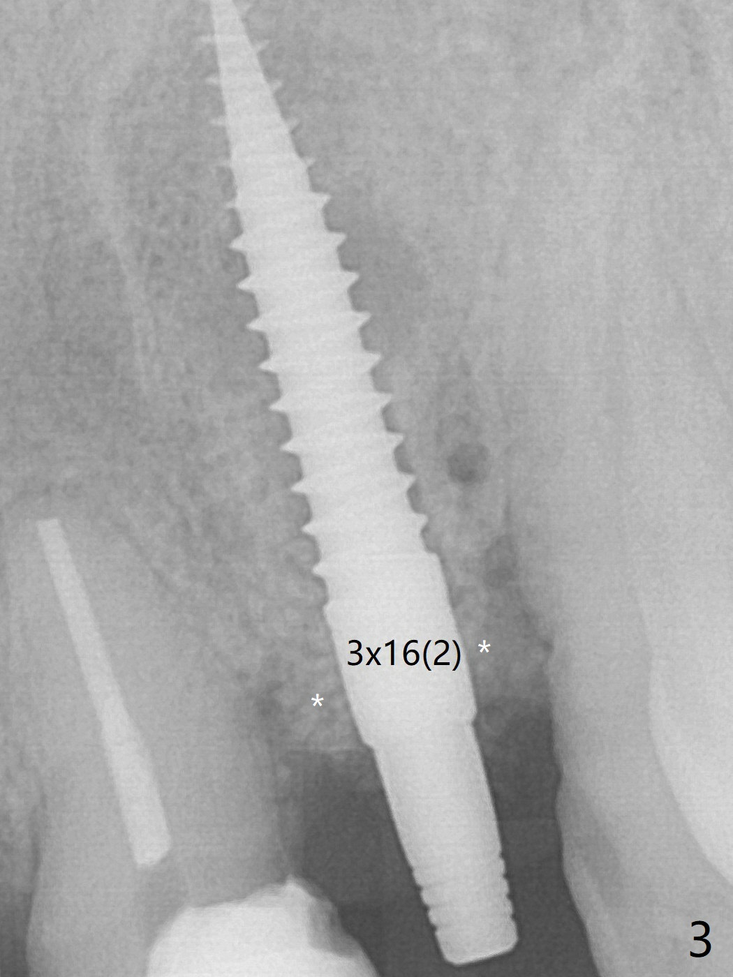 After curettage of the apical granulation tissue, a 3x16(2) mm 1-piece implant is placed with 20 Ncm because of slight overprep using 2 mm drill (Fig.3 (*: allograft)). The density of the bone immediately next to the implant threads increases 6 months postop (Fig.6 *).