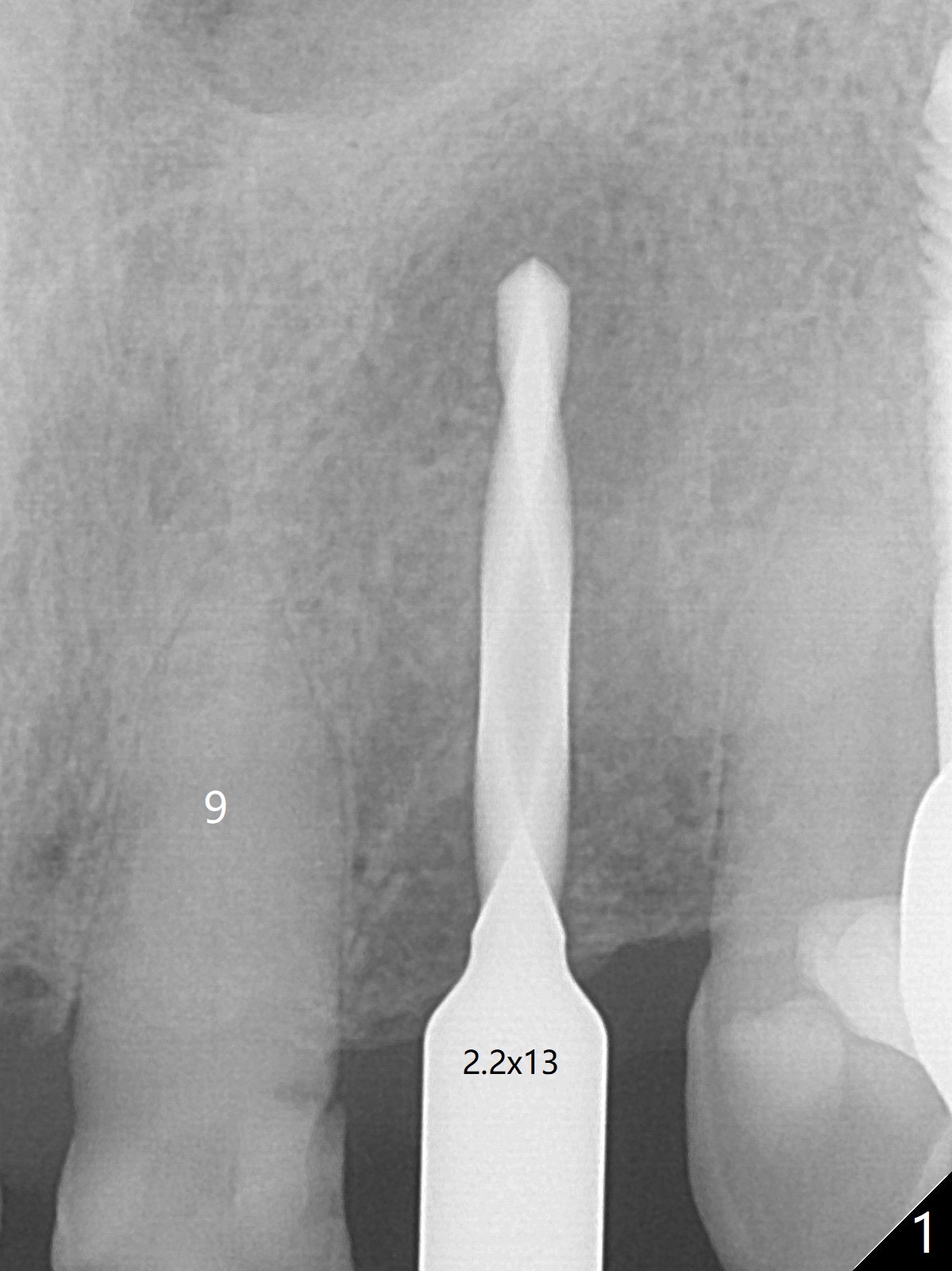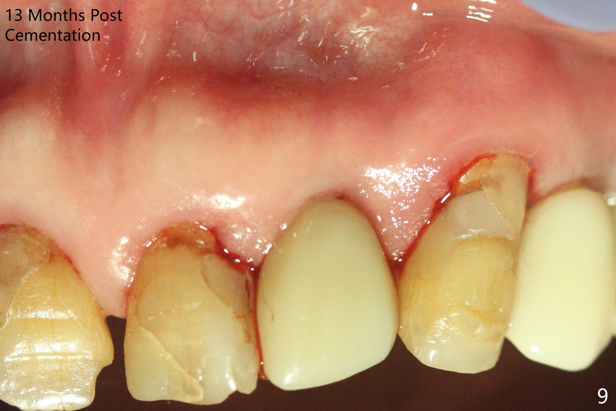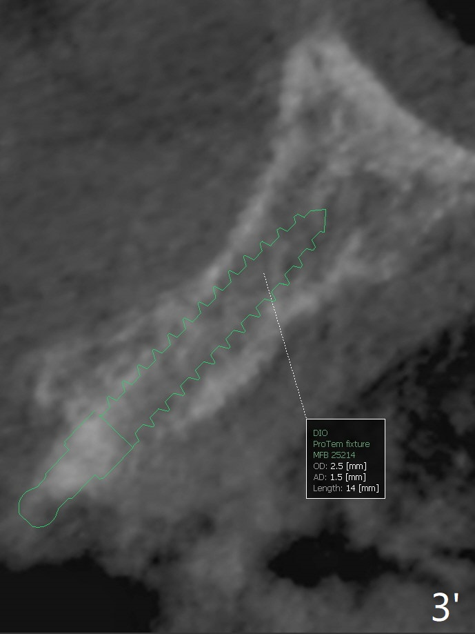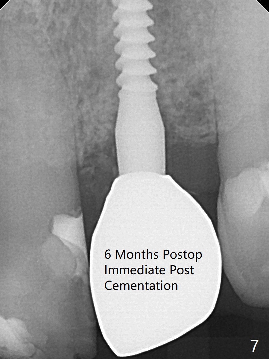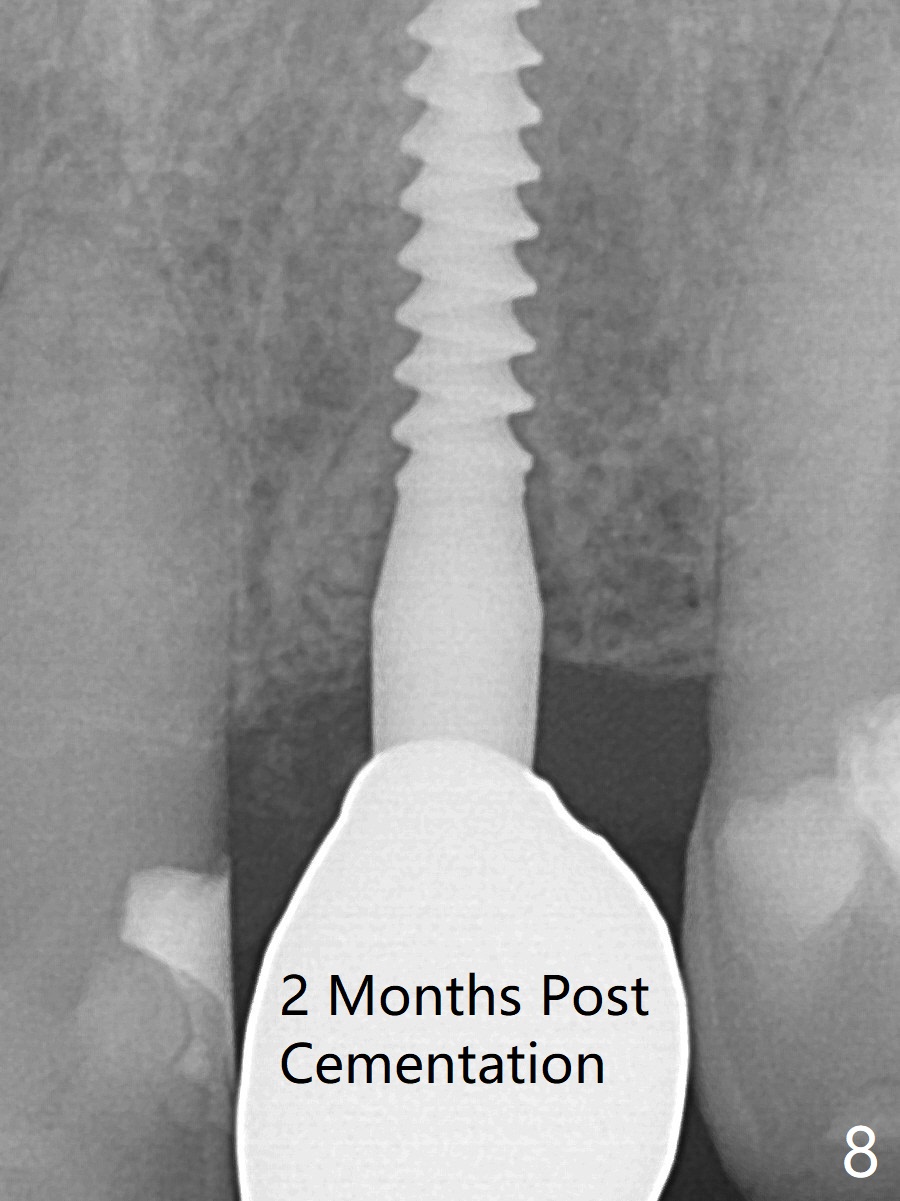 After undersized drilling in depth at #10 (2.2x13 mm (10.5 mm offset), Fig.1), a 2.5x13 mm 1-piece implant is placed (Fig.2,3), as compared to the design (Fig.3'). Following 3 more turns of the implant (~ 20 Ncm), bone graft and heavy buccal reduction of the coronal end of the abutment, an immediate provisional is bonded to the tooth #9 (Fig.4) and splinted to the tooth #11 with a twisted wire (Fig.5). To increase stability and reduce reduction, a 3 mm 1-piece implant could be used with 15 degree abutment. The implant remains stable 5 months postop (Fig.6). The implant seems to be flexible before heavy occlusal reduction; note the periimplant micro-space (Fig.7). The patient is a bruxer. The implant crown seems to be minimally mobile 2 months post cementation (Fig.8, without treatment). 牙冠粘固后1年1个月软硬组织正常(图九)。