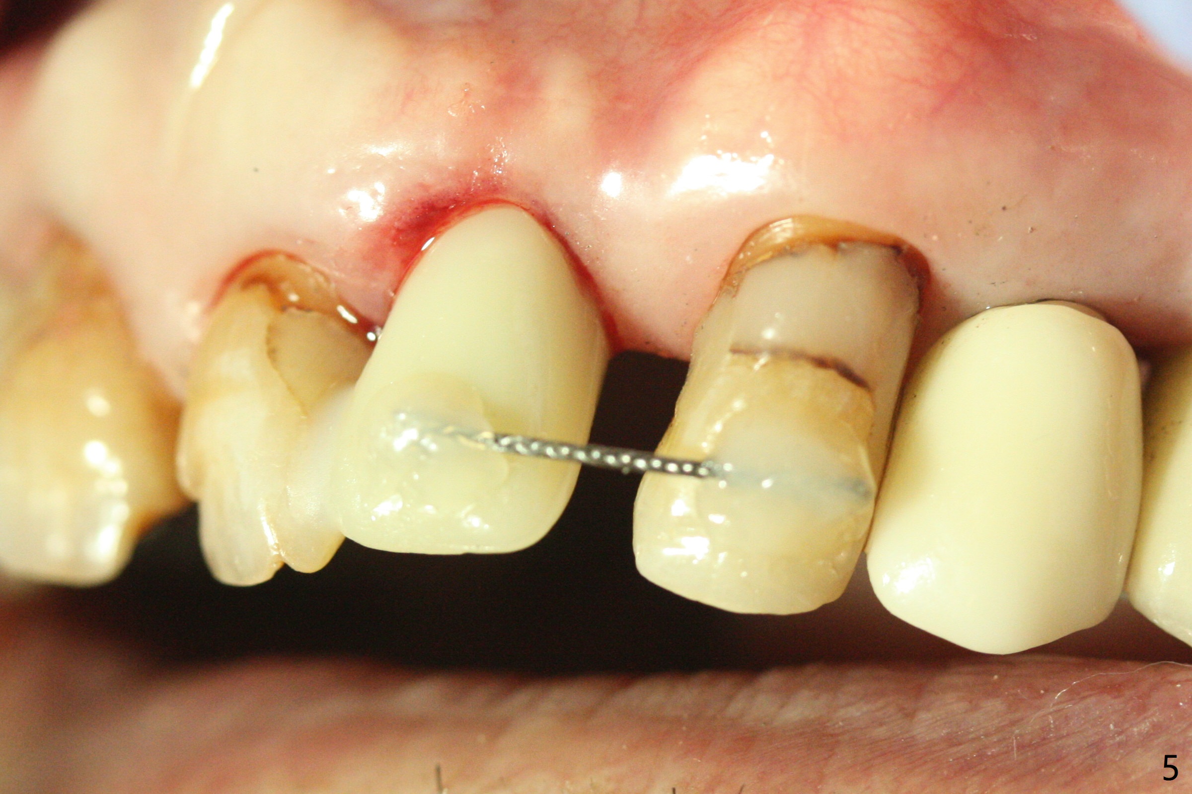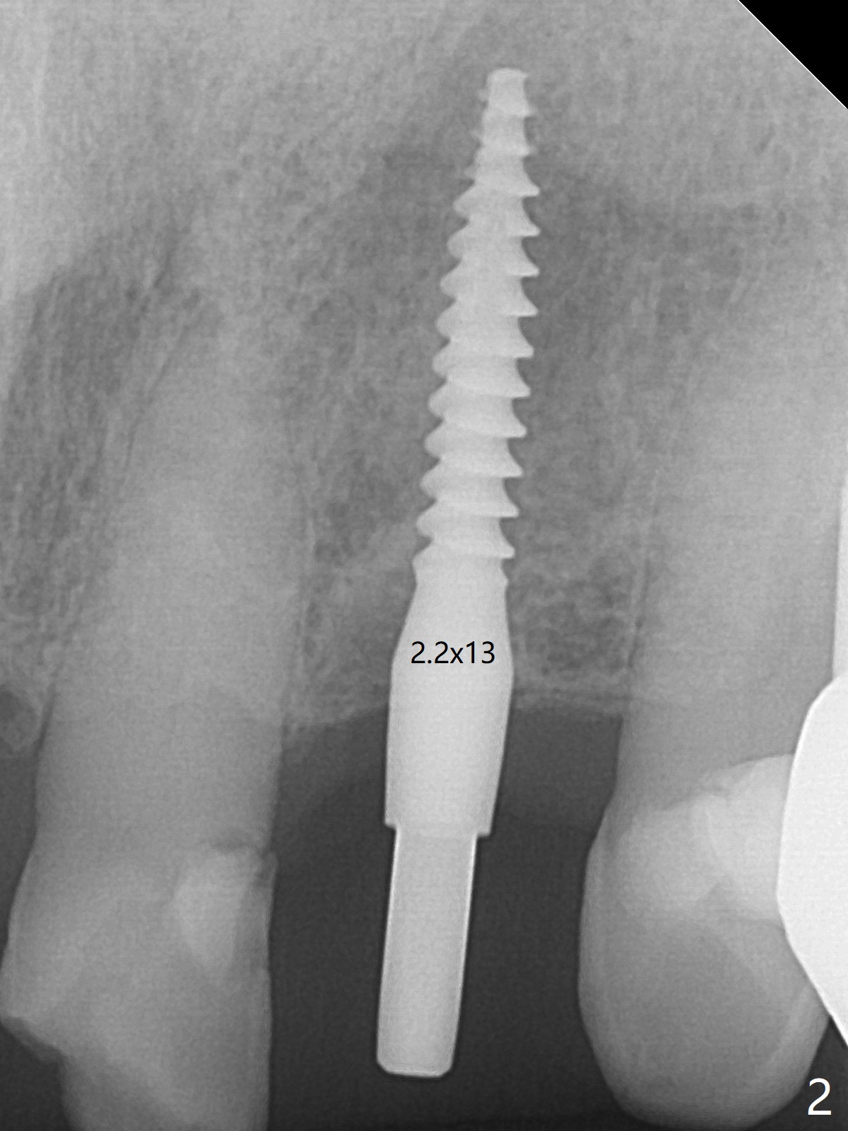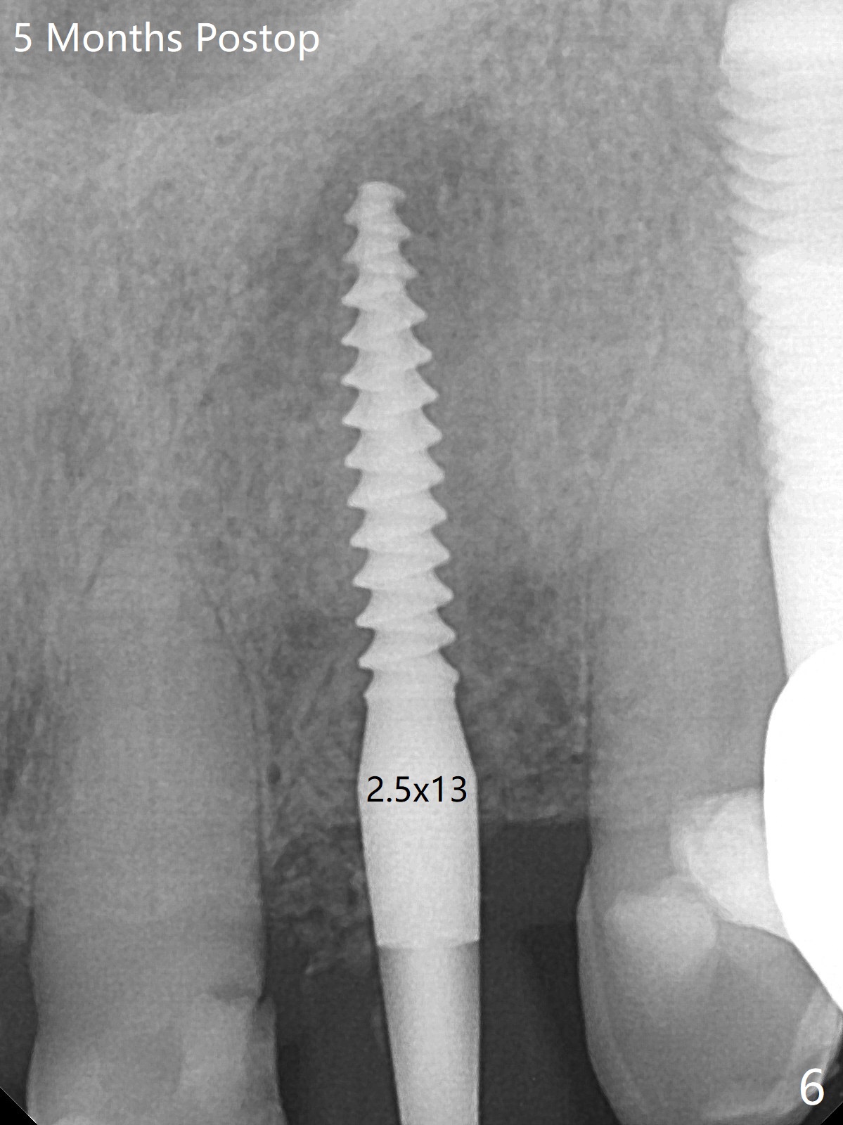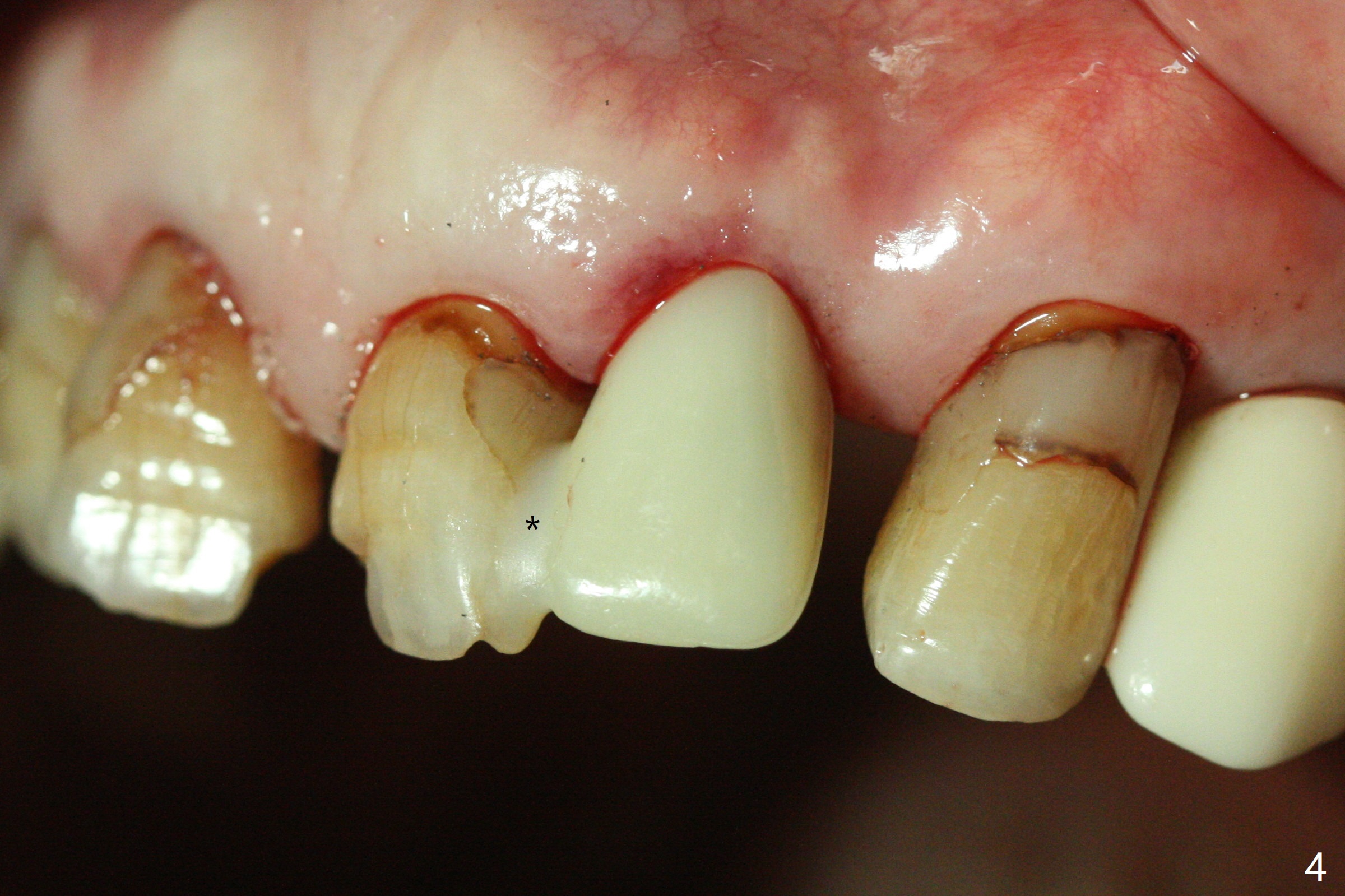 After undersized drilling in depth at #10 (2.2x13 mm (10.5 mm offset), Fig.1), a 2.5x13 mm 1-piece implant is placed (Fig.2,3), as compared to the design (Fig.3'). Following 3 more turns of the implant (~ 20 Ncm), bone graft and heavy buccal reduction of the coronal end of the abutment, an immediate provisional is bonded to the tooth #9 (Fig.4) and splinted to the tooth #11 with a twisted wire (Fig.5). To increase stability and reduce reduction, a 3 mm 1-piece implant could be used with 15 degree abutment. The implant remains stable 5 months postop (Fig.6). The implant seems to be flexible before heavy occlusal reduction; note the periimplant micro-space (Fig.7). The patient is a bruxer. The implant crown seems to be minimally mobile 2 months post cementation (Fig.8, without treatment). 牙冠粘固后1年1个月软硬组织正常(图九)。