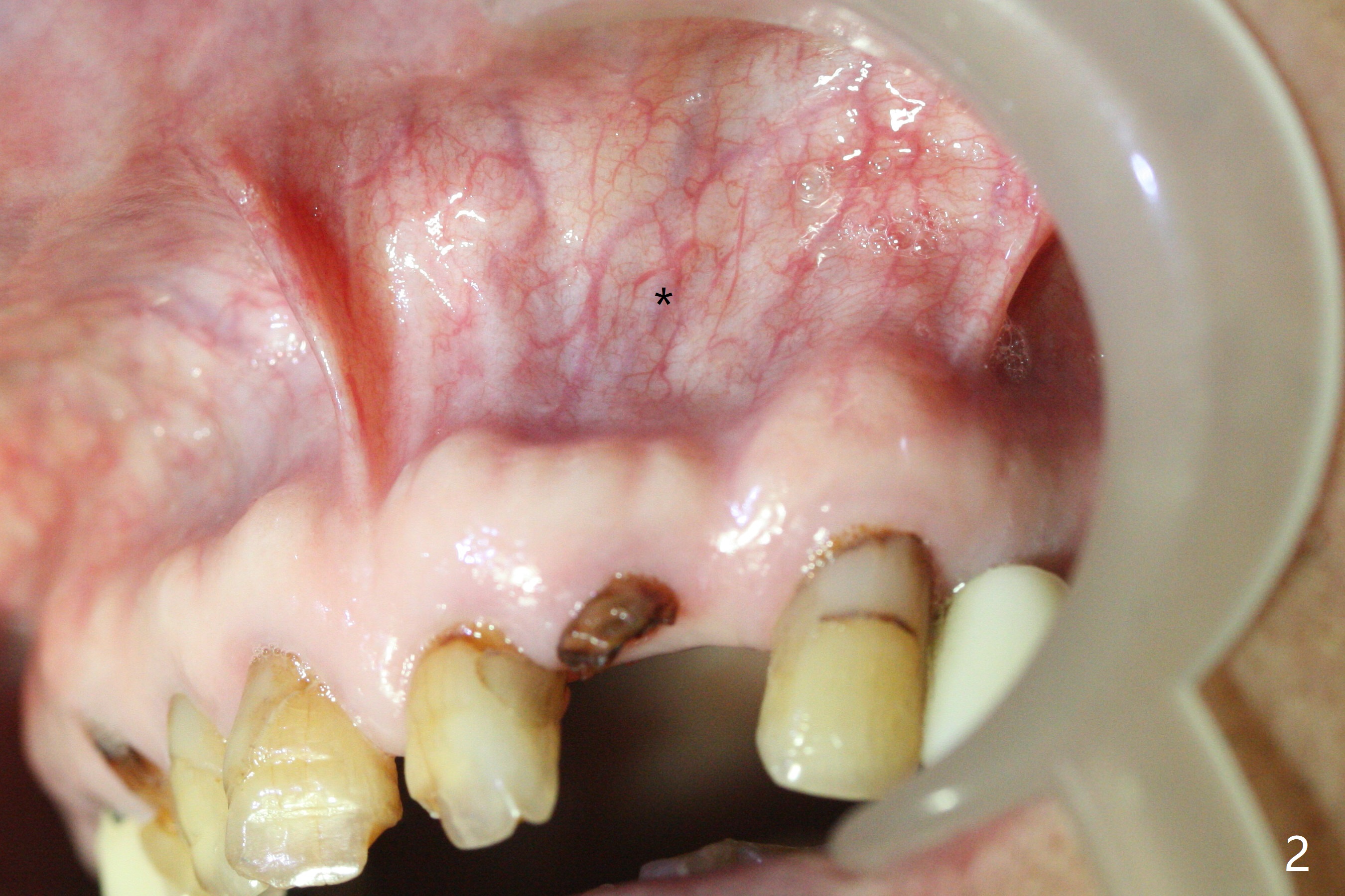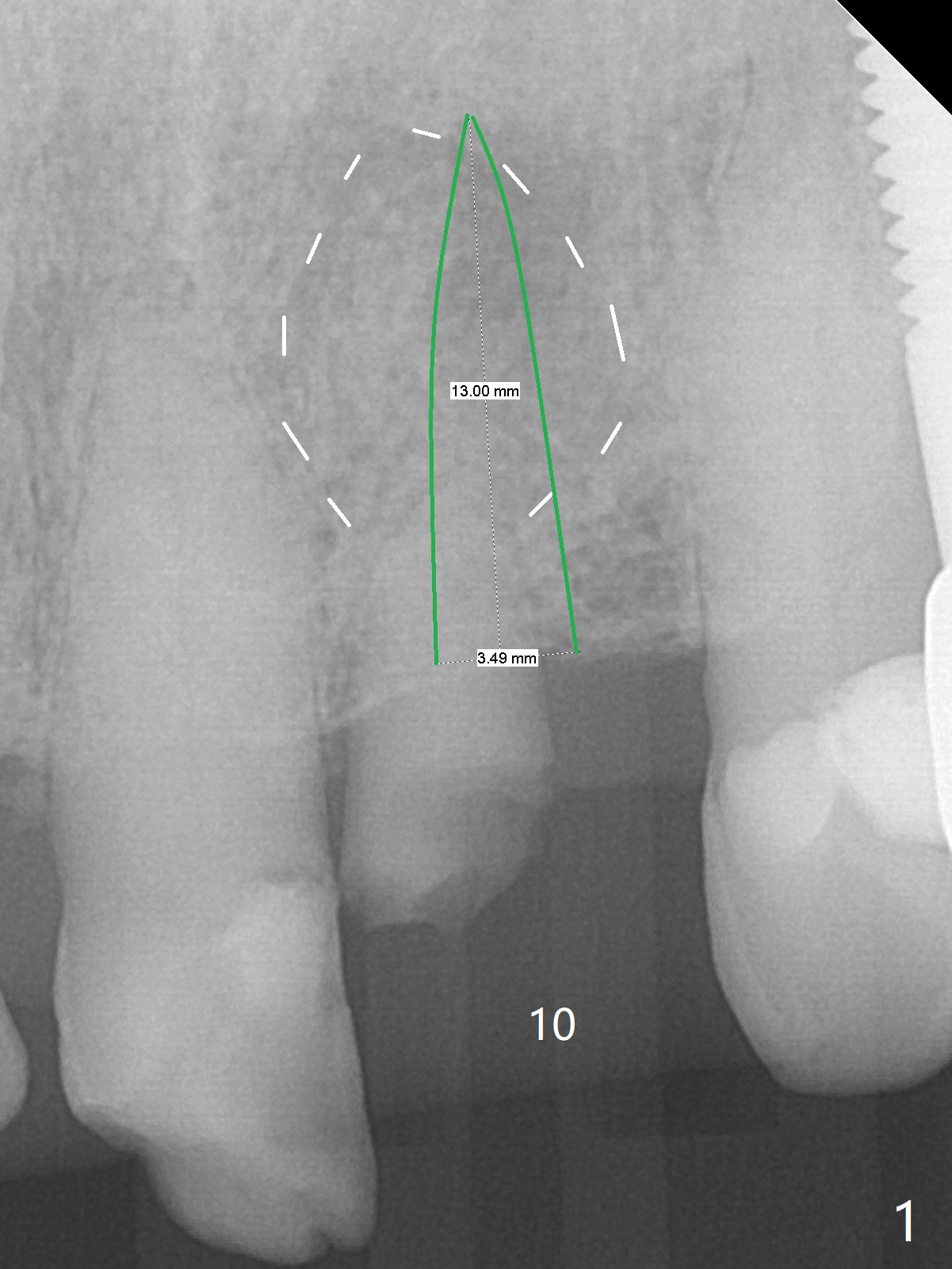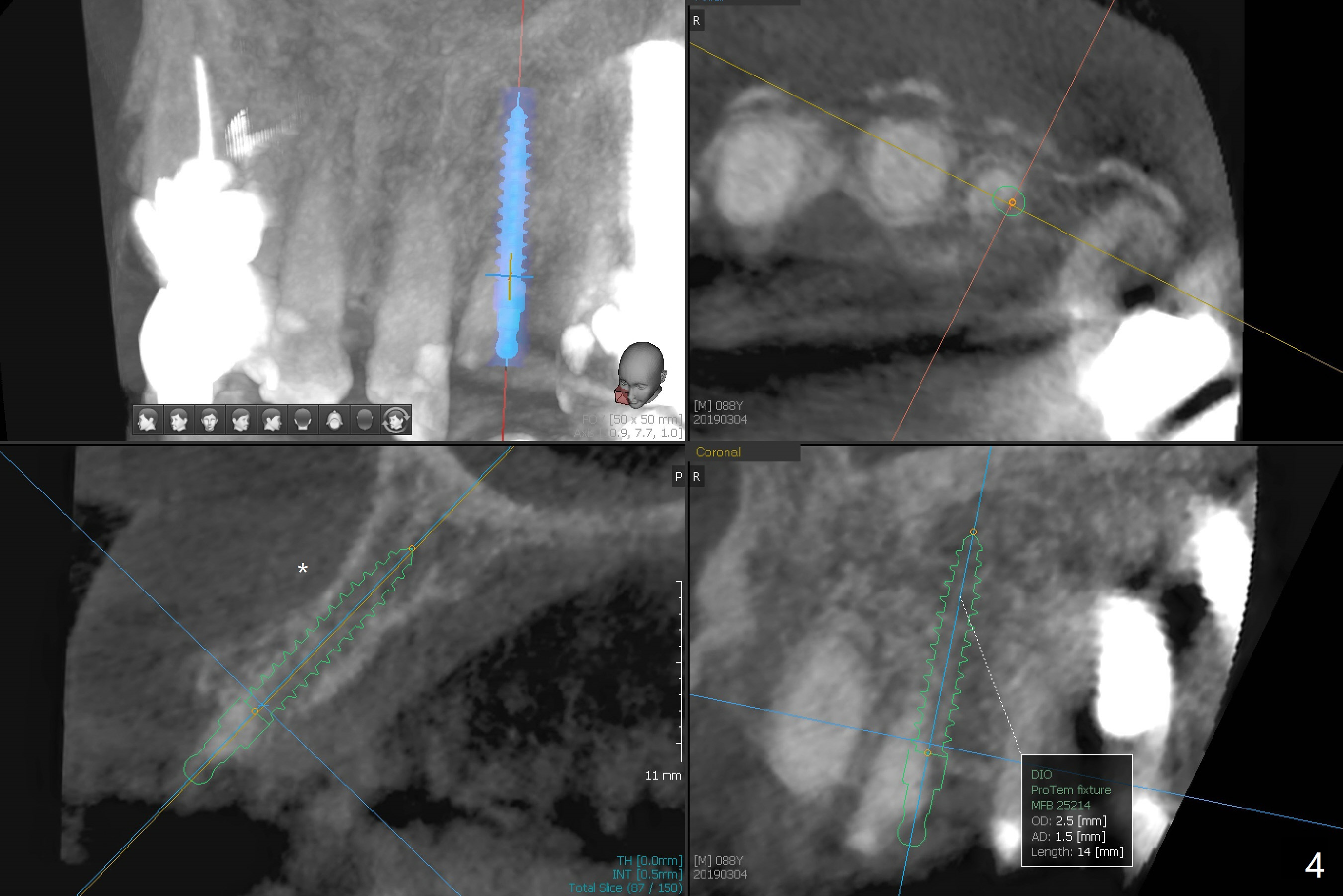 A 88-year-old man fractures the upper lateral incisor (microdontia) (Fig.1). Because of the labial concavity (white dashed line), it appears that an implant smaller than 3.5 mm is appropriate for the site. Clinical examination and CBCT confirm the concavity (Fig.2,4 *). Since the tooth deviates mesial, osteotomy should be initiated distopalatal (Fig.1,4).