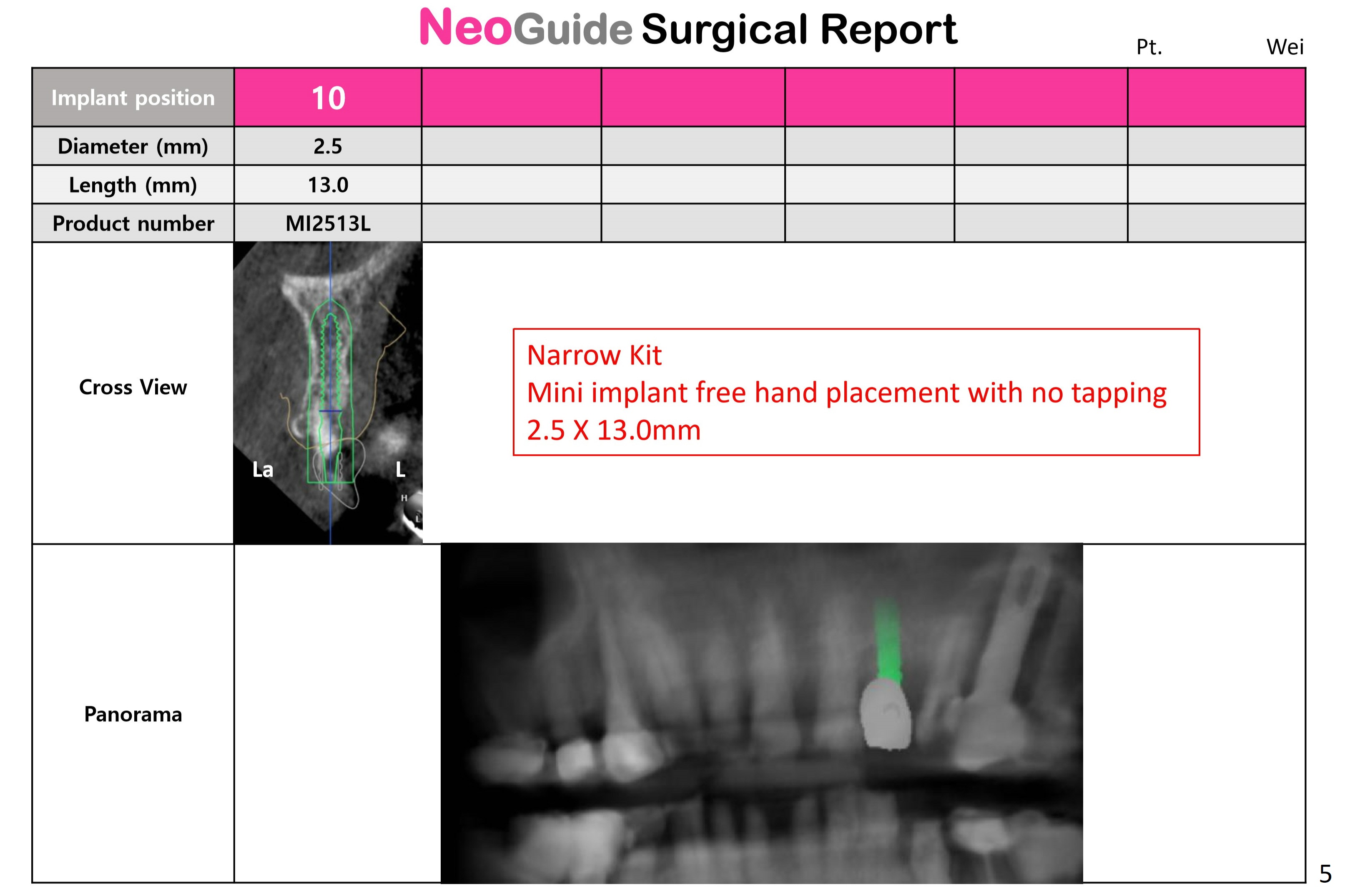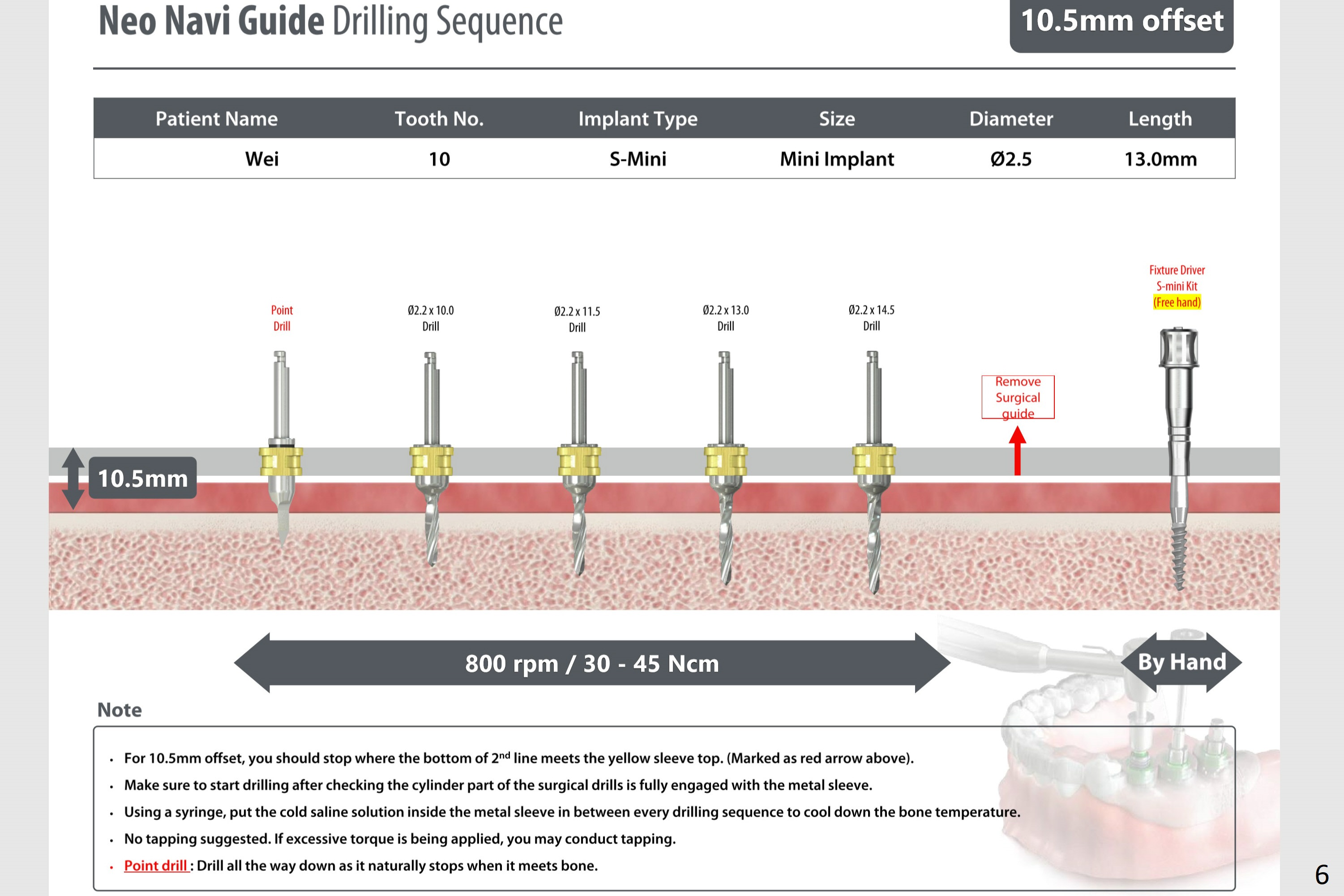 Since the 2.5x13 mm implant will be placed deep and palatal at #10, an IS mini implant with 10 mm abutment will be used. Check initial osteotomy with surgical guide to be remove and take PA if needed 3 mm short. If the 2.2x10 mm drill after point one does not engage to the cylinder, use the shorter one. Do not use the last drill for primary stability. Return to Upper Incisor Immediate Implant, Trajectory 位点保存/导板 Xin Wei, DDS, PhD, MS 1st edition 06/14/2019, last revision 11/07/2020