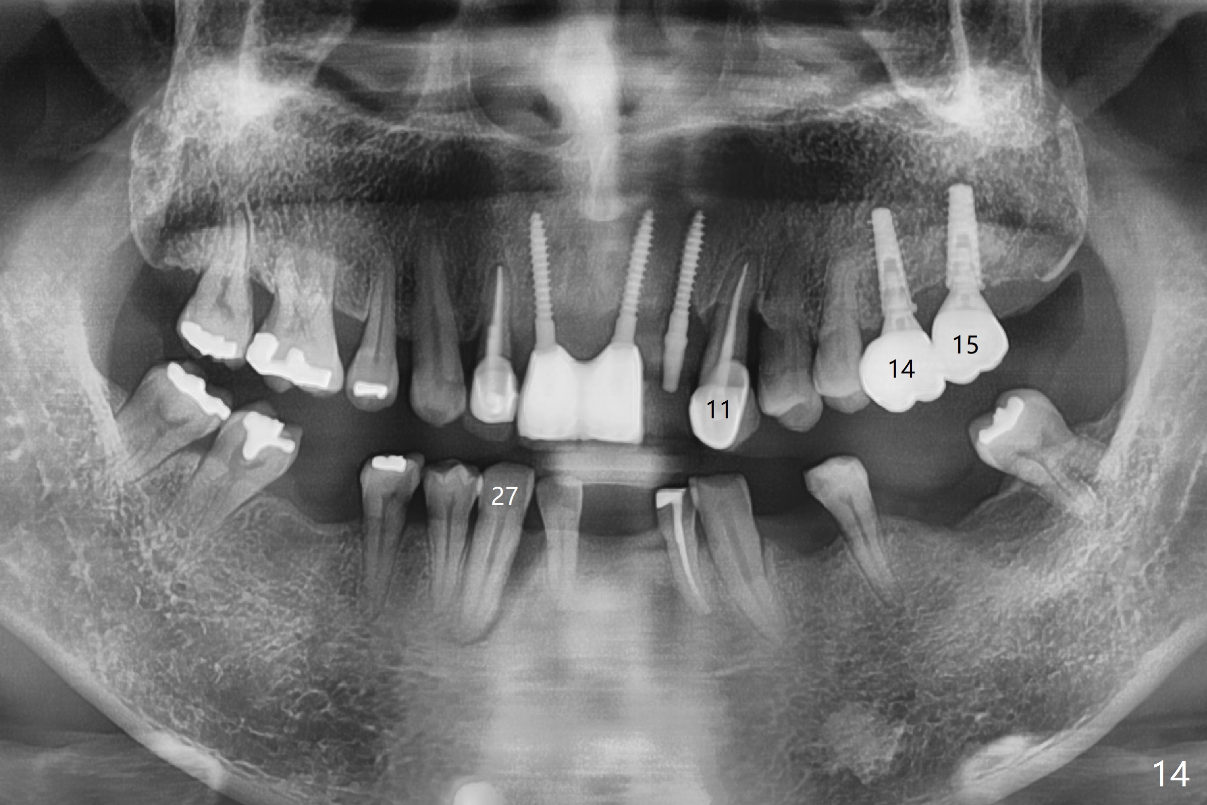 There is severe bone loss at #11 and 27. The implants at #14 and 15 were placed free hand (not parallel). Guided surgery should be done more often. Panoramic X-ray is taken 2 years 2 months post cementation.