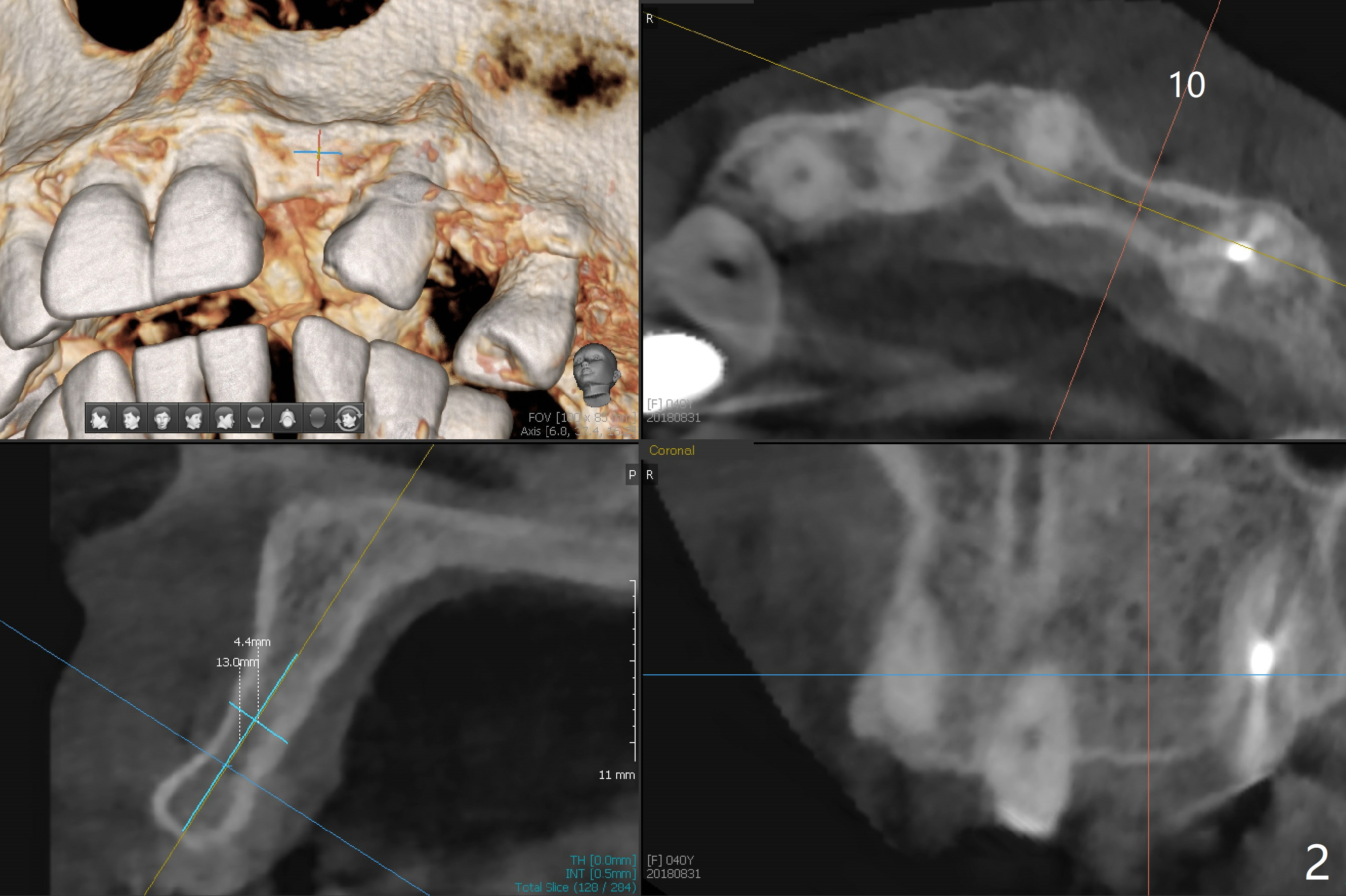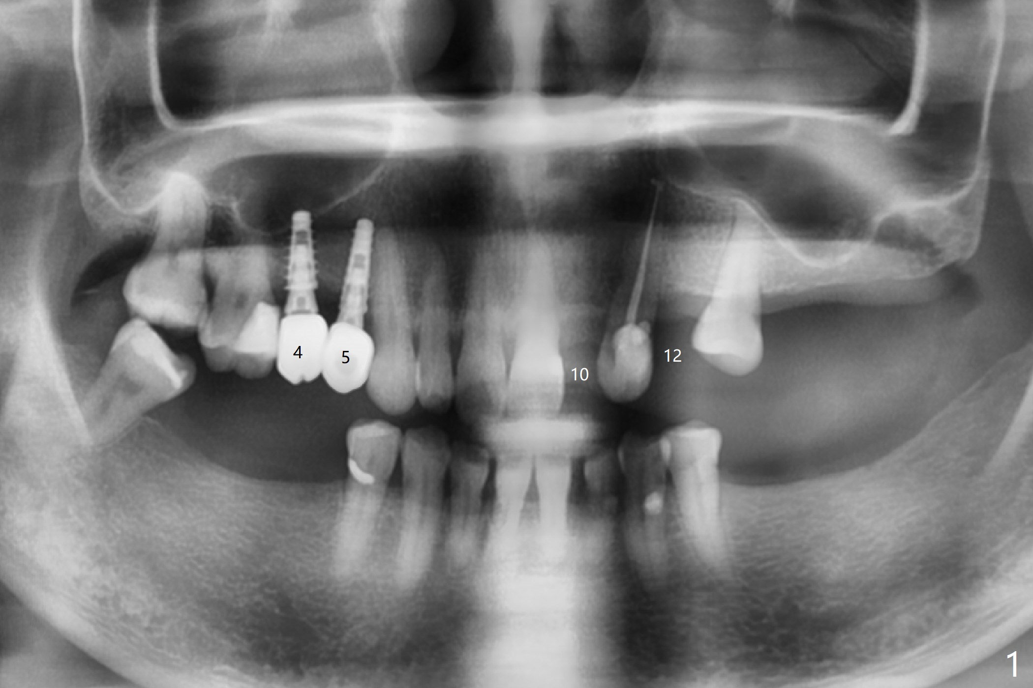 After cementation of implant crowns of #4 and 5, a 40-year-old skinny woman requests implants at #10 and 12 (Fig.1). Since the ridge is narrow (Fig.2,3), narrow implants are required (2x12 and 3x10 mm). As malpositioned implants at #4 and 5 were placed with free hand, guide is imminent for the new implants.
